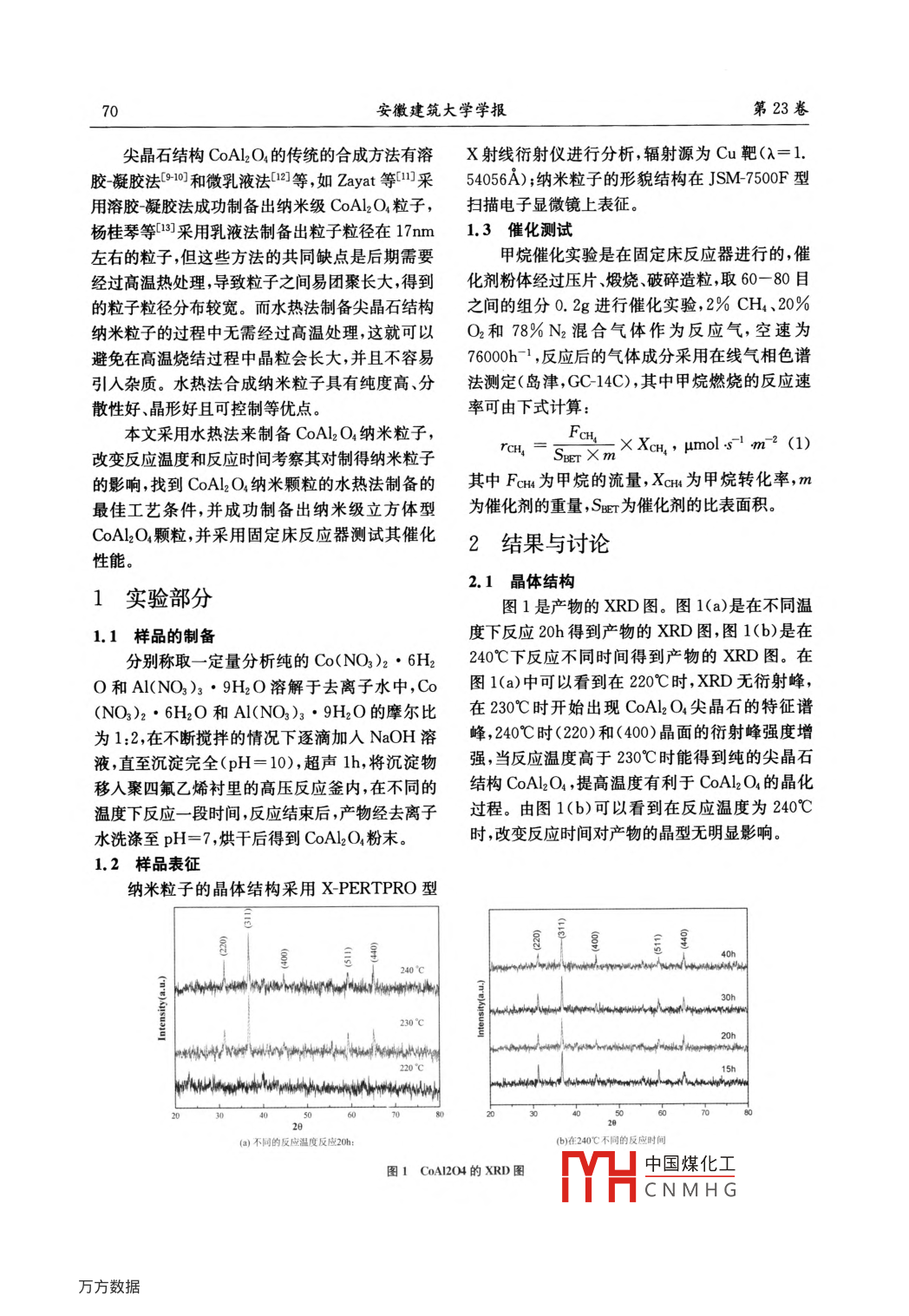 水熱法合成CoAl2O4納米粒子及其甲烷催化燃燒性能研究