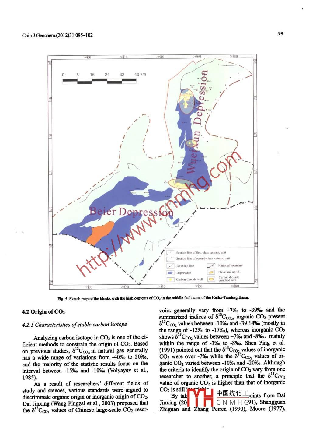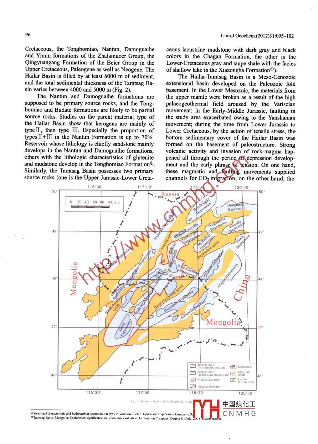 Chin J Geochem. 2012)31: 095-102DOI:10.1007/sll631-012-0554-6Origin of Co2 gas from the north depression of themiddle fault zone in the hailar- Tamtsag Basin andnatural gas in nearby depressionsZHANG Tonglei, CHEN Jianfa, ZHU Defeng", and ZHANG ChenState Key Laboratory of Petroleum Resource and Prospecting, China University of Petroleum, Beijing 102249, ChinaExploration and Development Research Institute, PetroChina Daqing Oilfield Company Limited, Daging 163712, China*CorrespondingauthorE-mail:327876823@qq.comReceived August 20, 2010; accepted September 25, 2010C Science Press and Institute of Geochemistry, CAS and Springer-Verlag Berlin Heidelberg 2012Abstract Natural gas pools with the high contents of CO2 were discovered during exploring the middle fault zoneof the Hailar-Tamtsag Basin. So far this kind of gas reservoir with COz with characteristics of carbon isotope is special. The stable carbon isotope of CO2 in the study area is relatively light with 8Cco, values ranging from -13.1%0to.2%. The Ar/Ar values of associated argon gas range from 916 to 996, with R/Ra of 1.20-1.26. Based oncomprehensive analysis, it is believed that the Co2 gas in this study area is of crust mantle sourceKey words Hailar-Tamtsag Basin; middle fault zone; CO2 gas; origin1 Introductionterritory of China), is located in Hulun Buir, InnerMongolia Autonomous Region (latitudes 4600n 1982, the fundamental work of petroleum ex-49040 north and longitude 11530 east). Inploration in the Hailar-Tamtsag Basin of the Daqing north-south direction, the northern end of the basin isOilfield started, since then a series of reservoirs have north of the Hailar River, and the southern margin isbeen found in the middle fault zone. In the process of beier Lake extending to the Tamtsag Basin in the Peoexploration, a lot of hydrocarbon reservoirs have been ple's Republic of Mongoliadiscovered with several non-hydrocarbon reservoirsThe Hailar-Tamtsag Basin which pobrought into focus. Figures due later 2006 showed that Inner Mongolia-Da Hinggan Ling Palaeozoic basefour CO2 reservoirs whose predicted OGIP was over ment, is a Mesozoic-Cenozoic basin with the charac-10 billion cubic meters(Wang Jiang et al., 2002)ex- teristics of multi-cyclicity, superimposition as wellisted in the middle fault zone of the Surennoer tecintersexuality of depression and rift basin The hailartonic zone in the Wuerxun Depression, coupled with Basin within the territory of China can be divided into11 CO2 gas wellsfive first-ordered tectonic units called the "three deNot only will gas reservoirs with the high con- pressions and two upheavals". More specifically, itof Co2 augment the risk and cost of exploration, has 20 second-ordered tectonic units including 16 de-also will it be of pivotal application importance. pressions covering an area of 25260 km and 4 heavesTherefore, the origin and accumulation characteristics Two pivotal depressions (Bayinbode-Sangbuer De-of CO2 in natural gas attract considerable attention. pression and Tamtsag Depression)in the Tamtsag Ba-This paper discusses the origin and chemical charac- sin actually refer to the extension of the Huhe Laketeristics of CO2 in the Hailar-Tamtsag Basin of the Depression and Chagannuoer Depression of the Hailarmiddle fault zone in order to provide scientific evi- Basin towards Mongolia. Therefore, accumulationdence for further exploration in this study areafactors such as cause of formation, tectonic pattern,evolutionary history, stratum growth and sedimentary2 Geological backgroundlithology are totally identical (Fig. 1)The Hailar-Tamtsag Basin overlies the basementThe Hailar-Tamtsag Basin which covers an area of Lower-Pa中國煤化工 ozoic triassic(Yimin river, to its western edge (the west coast of cap consistingntaryCN MHGaphic sequenceHulun Lake and Bayanhushu)(40550 km within the upward are the Hinggan Ling Group in the Lowerwww.gyig.accnwww.springerlink.comSpringerChin JGeochem. (2012)31: 095-102Cretaceous, the Tongbomiao, Nantun, Damoguaihe ceous lacustrine mudstone with dark gray and blackand Yimin formations of the Zhalainuoer Group, the colors in the Chagan Formation, the other is theQingyuangang Formation of the Beier Group in the Lower-Cretaceous gray and taupe shale with the faciespper Cretaceous, Paleogene as well as Neogene. The of shallow lake in the Xiazongba FormationHailar Basin is filled by at least 6000 m of sedimentThe Hailar-Tamtsag Basin is a Meso-Cenozoicand the total sedimental thickness of the Tamtsag Ba- extensional basin developed on the Paleozoic foldsin varies between 4000 and 5000 m(Fig. 2)basement. In the lower Mesozoic, the materials fromhe Nantun and Damoguaihe formations are the upper mantle were broken as a result of the highsupposed to be primary source rocks, and the Tong- palaeogeothermal field aroused by the Variscianbomiao and Budate formations are likely to be partial movement; in the Early-Middle Jurassic, faulting insource rocks. Studies on the parent material type of the study area exacerbated owing to the Yanshanianthe Hailar Basin show that kerogens are mainly of movement; during the time from Lower Jurassic totype ll, then type Ill. Especially the proportion of Lower Cretaceous, by the action of tensile stress, thetypes Il+ll in the Nantun Formation is up to 70%. bottom sedimentary cover of the Hailar Basin wasReservoir whose lithology is chiefly sandstone mainlyformed on the basement of paleostructure. Strongdevelops in the Nantun and Damoguaihe formations, volcanic activity and invasion of rock-magma hap.others with the lithologic characteristics of glutenite pened all through the period of depression develop-and mudstone develop in the Tongbomiao Formation. ment and the early phrase of tension On one hand,Similarly, the Tamtsag Basin possesses two primary these magmatic and faulting movements suppliedsource rocks(one is the Upper Jurassic-Lower Creta-channels for CO2 migration; on the other hand, the115°30117°00118°30120°00ussIa0204060801