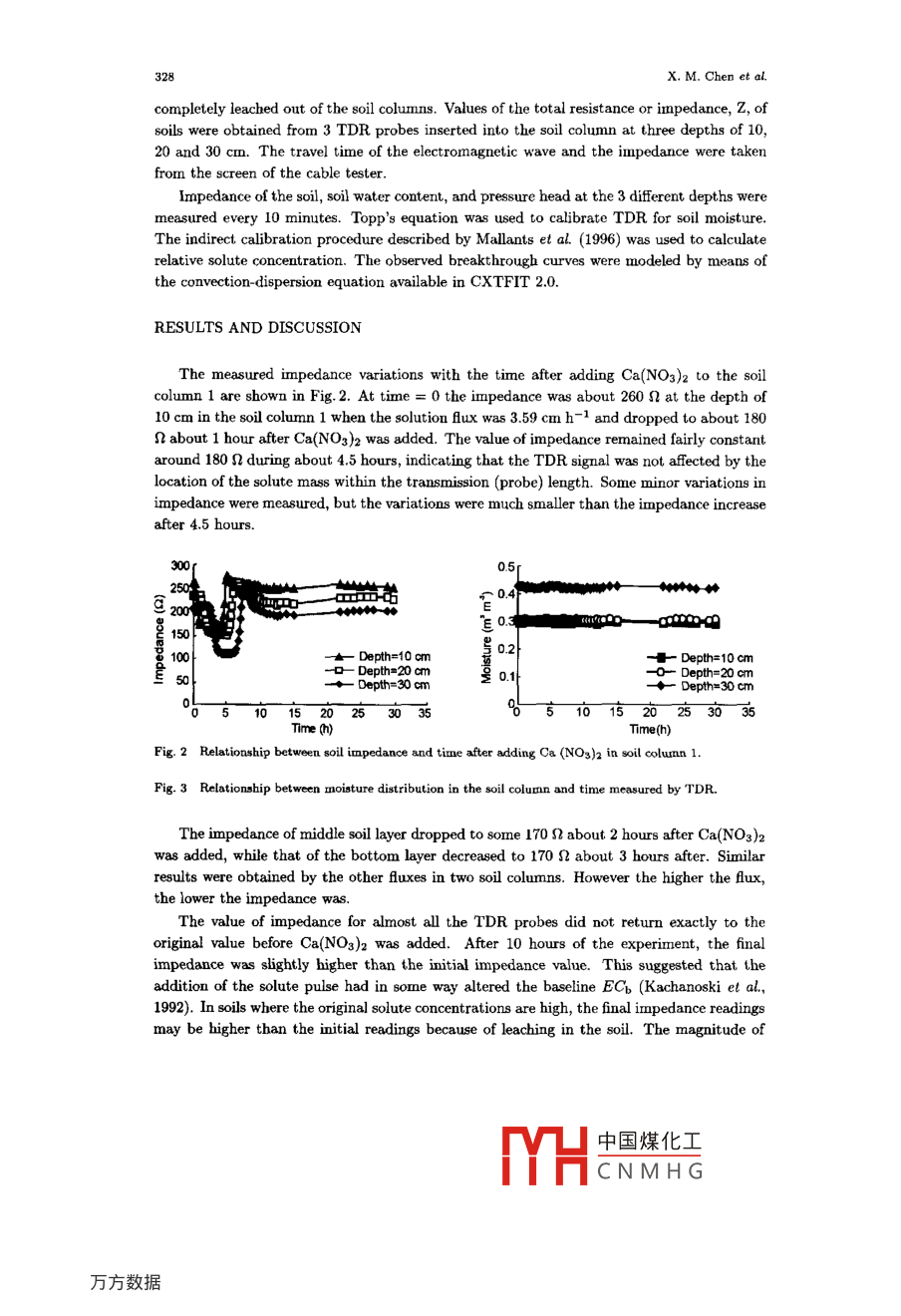 Pedosphere 10(4): 323~332, 2000323ISSN 1002-0160/CN 32-1315/P@ 2000 SCIENCE PRESS, BEIJINGImpact of Soil Water Flux on Vadose Zone SoluteTransport Parameters*1CHEN XIAOMINI, M. VANCLOOSTER2 and PAN GENXING11 College of Resources and Environmental Sciences, Nanjing Agricultural University, Nanjing 210095 (China)352 Department of Enrironmental Sciences and Land Use Planning, Universite Catholique de Louvain, B-1348Louuain-la-Neuue (Belgium)(Receive July 30, 2000; revised August 23,200)ABSTRACTThe transport proceses of solutes in two soil columns flled with undisturbed soil material collectedfrom an unsaturated sandy aquifer formation in Belgium ubjected to a variable upper boundary conditionwere identified from breakthrough curves measured by means of time domain relectometry (TDR). Solutebreakthrough was measured with 3 TDR probes inserted into each soil column at three different depths ata 10 minutes time interval. In addition, soil water content and pressure head were measured at 3 diferentdepths. Analytical solute transport models were used to estimate the solute dispersion coffcient and averngepore-water velocity from the obeerved breakthrough curves. The results showed that the analytical solutionswere suitable in ftting the observed solute transport. The dispersion coeficient was found to be a function ofthe soil depth and average pore water velocity, imposed by the soil water fux. The mobile moisture contenton the other band was not correlated with the average pore water velocity and the dispersion coeficient.Key Words: dispersion ceficient, pore water velocity, solute transport, time domain rflectometry (TDR)INTRODUCTIONAppropriate management of the soil and water resources requires a good knowledge ofthe transport processes and fate of dissolved chemicals in the soil water. Water fow imposesa convective movement on the dissolved chemicals, while local variations in the fow velocityinduce hydrodynamic dispersion. The process of difusion, induced by the difterences in thesolute concentration, enhances solute displacement. Dissolved chemicals in the soil waterare further subjected to chemical and physical interactions between the soil fuid phase andthe soil matrix, either enhancing or retarding the transfer of the substances dissolved in thewater phase ( Vanclooster et al, 1995). Therefore, the characterization of the chemical solutetransport in the soil has become an active feld of environmental research.Given the intrinsic variability of the soil physical parameters, the characterization ofsolute transport at the field scale is a complicated task. In recent years, the time domainrefectometry (TDR) has been widely used in soil physical research. It has been considered asan attractive tool with a wide range of applicability since it is nondestructive, high in accuracy*1Projcct supported by the European Economic Community Research Program STEP.中國煤化工MYHCNMHG324x. M. Chen et al.and lower in labor requirement compared with other methods (Kim et al, 1998; Wallach andSteenhuis, 1998). In addition, the TDR allows to measure two important soil physical statevariables: the soil moisture content and the total electrical conductivity, and this with ahigh spatio temporal resolution. The TDR technology allows therefore to measure the watertransport and solute breakthrough at the timne when the experiment is being conducted anddoes not require assumptions about the local fux density of water (Kachanoski et al, 1992).Use of TDR in estimation of the concentrations of conservative solutes was initiated byDalton et al. (1984), based on signal attenuation of a voltage pulse propagating along thetransmission line, which serves as a measure of electrical conductivity in a bulk soil. Van-clooster et al. (1993) and Mallants et al. (1994) used horizontally installed TDR probes inlaboratory-colunn experiments taken along a field transect. Horizontal positioning of theTDR probes enables the sampling of a larger area perpendicular to the mean direction ofAow. This is an advantage for estimating solute fuxes, especially in multilayered heteroge-neous soils where horizontal flow at the microscopic scale might inAuence longitudinal solutedispersion. In addition, the borizontal configuration allows measuring solute breakthroughat diferent depths, which is a prerequisite for identifying the governing solute transportmechanism {Jury and Roth, 1990). When solute velocities are independent of solute depthfull mixing of solutes in the complete pore water domain occurs. In this case the convectivedispersive transport model is appropriate, and solute dispersion remains constant with depthchanges. However, if solute velocities vary with the soil depth, a stream- tube concept willbe more appropriate for describing the transport. The identification of the governing solutetransport can be estimated from solute breakthrough curves measured at diferent depths,as presented by Vanclooster et al. (1995), Vanderborght et al. (1996, 1997) and other re-searchers. However, few studies have been reported in literature so far about the impact ofthe fow condition on the governing solute transport concept.The objective of the present study was to determine the governing transport processes assolute moves through undisturbed soil columns and to analyse the dependency of the solutetransport parameters upon water fAux density and soil moisture.THEORYMeasurement of solute brealkthrough by means of TDRAs shown by several researchers (e.g., Kachanoski et al, 1992; Reece, 1998), solute break-through curves may be established from TDR-based estimates of the bulk soil electrical con-ductivities (ECb) during steady state solute transport experiments with salty tracers. Alinear relationship is generally observed between the resident solute concentration of a saltytracer, Cr, and EC, for constant water contents ranging from relatively low to saturationand for salinity levels ranging from 0 to approximately 50 dS m-1 (Ward et al, 1994).C,=