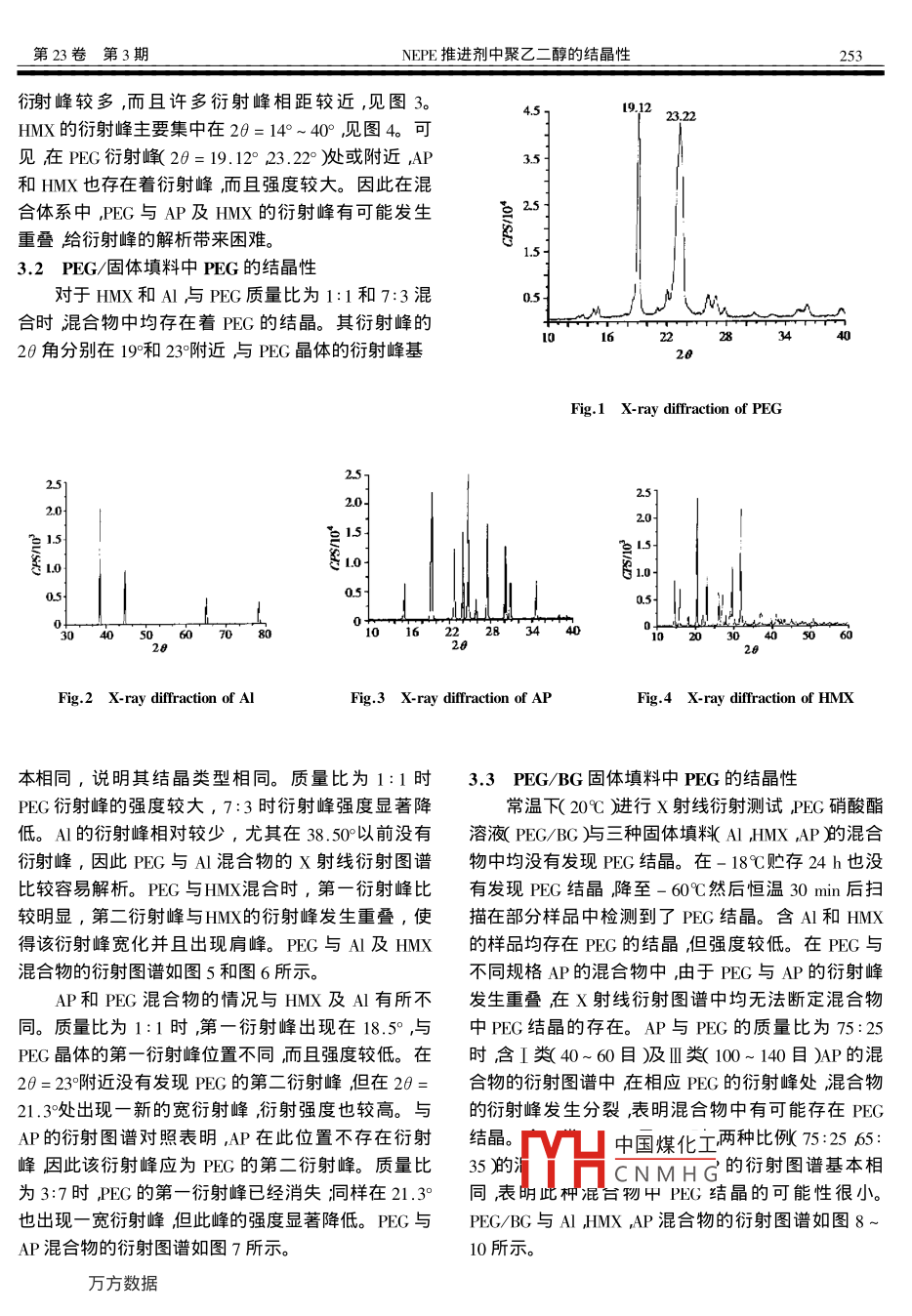 2002年6月推進(jìn)技術(shù)Jun.2002第23卷第3期JOURNAL OF PROPUISION TECHNOLOGYVol 23 No. 3NEPE推進(jìn)劑中聚乙二醇的結(jié)晶性趙孝彬,張小平1,鄭劍,杜磊21.湖北紅星化學(xué)研究所,湖北襄樊41003;2.上海航天技術(shù)研究院,上海200233)摘要∶利用ⅹ射線衍射技術(shù)研究了NE推進(jìn)劑中聚乙二醇的結(jié)晶特性。探討了填料、化學(xué)交聯(lián)和增塑劑對聚乙二醇結(jié)晶的影響,實驗結(jié)果表明上述幾種因素都會顯著降低聚乙二醇的結(jié)晶性關(guān)鍵詞:聚醚推進(jìn)劑;推進(jìn)劑粘合劑;聚乙二醇;ⅹ射線衍射分析;結(jié)晶度中圖分類號:V512.3文獻(xiàn)標(biāo)識碼:A文章編號:1001-4055(2002)03-0252-06Crystallization of polyethylene glycol in NEPE propellantsZHAO Xiao-bin', ZHANG Xiao-ping, ZHENG Jian, DU Lei2. Shanghai Academy of Spaceflight Technololgy 200233, ChinaAbstract: The crystallization of polyethylene glycol in the Nepe propellants was studied by means of X-ray diffraction tech-nique. The influence of fillers chemical crosslinking and plasticizers on crystallization of polyethylene glycol was discussed. Thesults indicated that several factors can decrease significantly the crystallinity of polyethylene glycolKey words: Polyether propellant; Propellant binder Polyethylene glycol X-ray diffraction analysis, Crystallinity2.2實驗樣品及制備1引言聚乙二醇:Mn=9400。聚乙二醇與固體填料的NEPE推進(jìn)劑一般采用聚乙二醇〔PEG)作為粘混合物將熔融的聚乙二醇與固體填料分別以質(zhì)量比合劑,其含量(6%~8%)雖然很低,但對推進(jìn)劑1:1和3:7均勻混合澆注到模具中冷卻成型。聚乙的力學(xué)性能卻起著至關(guān)重要的作用。由于聚乙二二醇硝酸酯溶液(PEG/BG增塑比P/Po=2.8)與固醇為半結(jié)晶的高分子聚合物,具有很高的結(jié)晶度體填料的混合物將溶液按照一定比例與不同的固體〔>80%),即使在大劑量硝酸酯增塑和固體填料填填料均勻混合澆注到樣品架中奧克托金(HMX)及充的NEPE推進(jìn)劑中,也有可能產(chǎn)生結(jié)晶,危及推鋁粉A)與聚乙二醇硝酸酯溶液的質(zhì)量比為75:25,進(jìn)劑的力學(xué)性能和安全性能。盡管對聚乙二醇及其高氯酸銨AP盧與聚乙二醇硝酸酯溶液的質(zhì)量比為75在硝酸酯溶液中的結(jié)晶性已進(jìn)行了系統(tǒng)研究2565:35。聚乙二醇膠片將熔融的聚乙二醇或聚但聚乙二醇在NEEE推進(jìn)劑中的結(jié)晶性還未見文獻(xiàn)乙二醇和增塑劑的溶液與多異氰酸酯固化劑按一定報道。本文利用廣角ⅹ射線衍射技術(shù)對NEPE推進(jìn)比例混合澆注到模具中真空除氣50℃固化7天。劑中聚乙二醇的結(jié)晶性及其影響進(jìn)行了初步研究。3實驗結(jié)果2實驗3.1NEPE推進(jìn)劑中主要組分的X射線衍射2.1儀器PEG的衍射圖譜中含有兩個強度很大的衍射峰MXPI8AHF型X射線衍射儀, MAC Science公司20角中國煤化工圖1。A在20=30°制造鬧靶;X射線波長為1.5406×10-8cm衍射角85°江CNMHG于20=38.50處的衍度20為10°~85°電壓為40kV電流為200mA。射峰強較大見圖2。AP在20=10°~40范圍內(nèi)的*收稿日期:2001-07-02;修訂日期:2001-09-26。作皆宿勢據(jù)趙孝彬(1973—),男,工程師,博士生,研究領(lǐng)域為復(fù)合固體推進(jìn)劑性能研究。第23卷第3期NEPE推進(jìn)劑中聚乙二醇的結(jié)晶性253彷射峰較多,而且許多衍射峰相距較近,見圖3。HMX的衍射峰主要集中在20=149~40°,見圖4??梢娫赑EG衍射峰(20=19.12°23.22)或附近,AP和HMX也存在著衍射峰而且強度較大。因此在混合體系中,PEG與AP及HMX的衍射峰有可能發(fā)生重疊給衍射峰的解析帶來困難。3.2PEG/固體填料中PEG的結(jié)晶性對于HMX和A與PEG質(zhì)量比為1:1和7:3混合時混合物中均存在著PEG的結(jié)晶。其衍射峰的282θ角分別在19和23附近與PEG晶體的衍射峰基Fig 1 X-ray diffraction of PEG20象叫4050Fig. 2 X-ray diffraction of AlFig. 3 X-ray diffraction of APX-ray diffraction of HMX本相同,說明其結(jié)晶類型相同。質(zhì)量比為1:1時3.3PEG/BG固體填料中PEG的結(jié)晶性PEG衍射峰的強度較大,7:3時衍射峰強度顯著降常溫下(20℃進(jìn)行ⅹ射線衍射測試PEG硝酸酯低。A的衍射峰相對較少,尤其在38.5σ°以前沒有溶液(PEG/BG盧與三種固體填料 Al HMX AP混合衍射峰,因此PEG與A混合物的ⅹ射線衍射圖譜物中均沒有發(fā)現(xiàn)PEG結(jié)晶。在-18℃貯存24h也沒比較容易解析。PEG與HMX混合時,第一衍射峰比有發(fā)現(xiàn)PEG結(jié)晶降至-60℃然后恒溫30min后掃較明顯,第二衍射峰與HX的衍射峰發(fā)生重疊,使描在部分樣品中檢測到了PEG結(jié)晶。含A和HMX得該衍射峰寬化并且出現(xiàn)肩峰。PEG與A及HMX的樣品均存在PEG的結(jié)晶但強度較低。在PEG與混合物的衍射圖譜如圖5和圖6所示。不同規(guī)格AP的混合物中由于PEG與AP的衍射峰AP和PEG混合物的情況與HMX及A有所不發(fā)生重疊在X射線衍射圖譜中均無法斷定混合物同。質(zhì)量比為1:1時,第一衍射峰出現(xiàn)在18.5°,與中PEG結(jié)晶的存在。AP與PEG的質(zhì)量比為75PEG晶體的第一衍射峰位置不同而且強度較低。在時含Ⅰ類(40~60目及Ⅲ類(100~140目)AP的混2θ=23附近沒有發(fā)現(xiàn)PEG的第二衍射峰但在2θ=合物的衍射圖譜中在相應(yīng)PEG的衍射峰處混合物21.3處出現(xiàn)一新的寬衍射峰衍射強度也較高。與的衍射峰發(fā)生分裂,表明混合物中有可能存在PEGAP的行射圖譜對照表明,A在此位置不存在衍射結(jié)晶。山中國煤化工兩種比做(752565峰因此該衍射峰應(yīng)為PEG的第