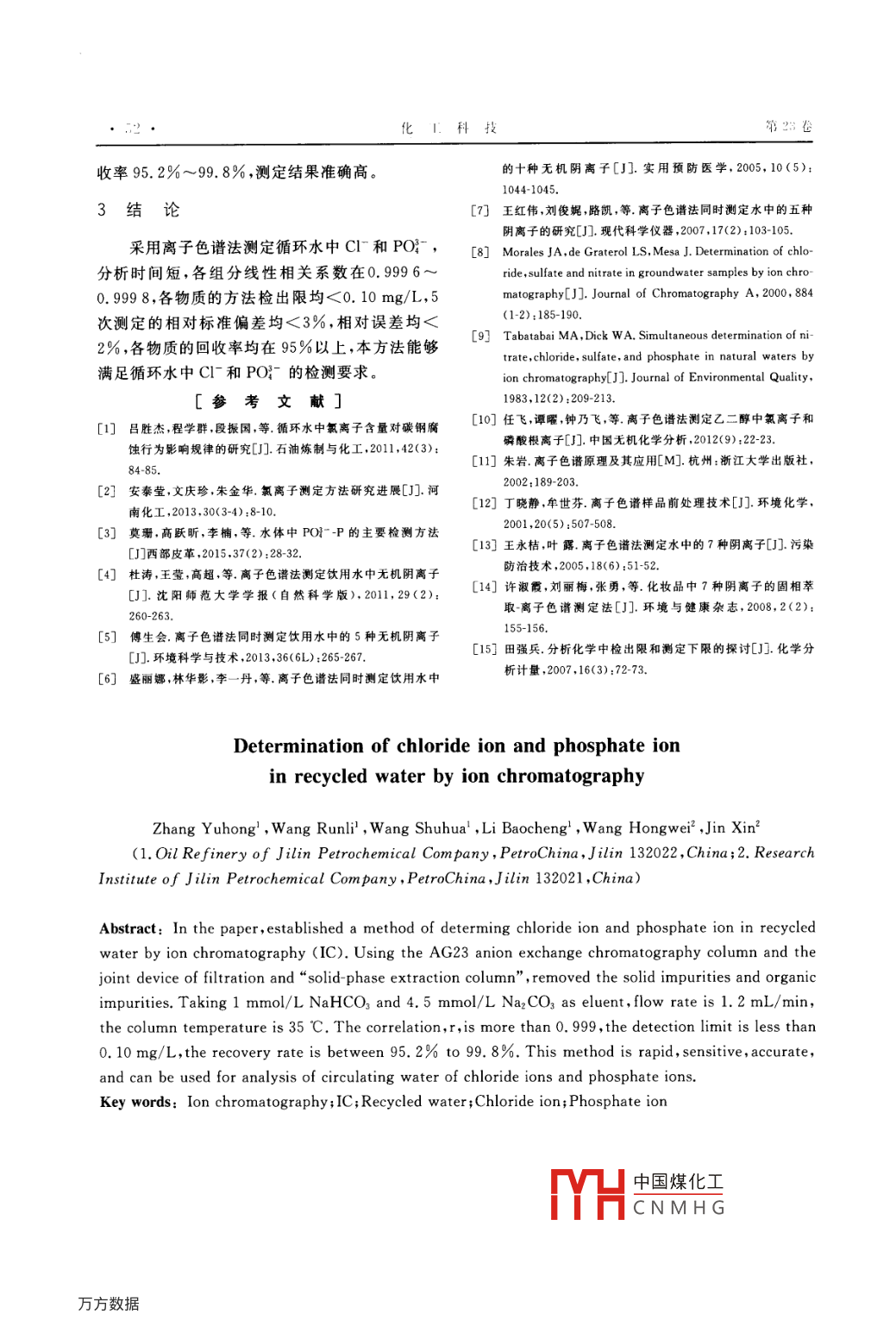 分析測(cè)試化工科技,2015,23(4):50science & TECHNOLOGY IN CHEMICAL INDUSTRY離子色譜法測(cè)定循環(huán)水中C和PO張玉紅1,王潤(rùn)禮,王淑華,李寶城,王宏偉2,金鑫2(1.中國(guó)石油吉林石化公司煉油廠,吉林吉林132022;2.中國(guó)石油吉林石化公司研究院,吉林吉林132021)摘要:建立了離子色譜法測(cè)定循環(huán)水中Clˉ和PO-的方法。采用AG23陰離子交換色譜柱,使用過濾頭和“固相萃取柱”組成的聯(lián)合裝置除去國(guó)體雜質(zhì)和有機(jī)雜質(zhì)。以1mmol/ L NaHco3和4.5mmol/LNa2CO3為淋洗液,流速為1.2mL/min,柱溫為35℃。各組分的相關(guān)性好(r>0.999),組分的檢出限均<0.10mg/L,各物質(zhì)的加標(biāo)回收率為95,2%~99.8%。該方法快速、靈敏、準(zhǔn)確,可用于循環(huán)水中Cl和PO的分析。關(guān)鍵詞:離子色譜;循環(huán)永;氯離子;磷酸根離子中圖分類號(hào):TQ085.4文獻(xiàn)標(biāo)識(shí)碼:A文章編號(hào):1008-0511(2015)04-0050-03循環(huán)水在運(yùn)行過程中不可避免地會(huì)引入各種體電導(dǎo)池抑制器、電導(dǎo)檢測(cè)器、自動(dòng)進(jìn)樣器、恒溫腐蝕性離子,從而引起管線特別是換熱器發(fā)生嚴(yán)重柱溫箱溶劑托盤、智能色譜工作站, Ion PacAG分離腐蝕。循環(huán)水中C含量大,對(duì)不銹鋼的腐蝕起到柱:D234mm×250mm,美國(guó)進(jìn)口, Ion PacAS保護(hù)柱加速作用,有機(jī)磷酸鹽緩蝕劑對(duì)高濃度Cl溶液中D234mm×50mm,均為北京歷元電子儀器有限公碳鋼的腐蝕有抑制作用,準(zhǔn)確測(cè)定循環(huán)水中司;超聲波振蕩器:中科儀儀器有限公司。p(C)和p(PO),對(duì)防止設(shè)備腐蝕和產(chǎn)品質(zhì)量的2實(shí)驗(yàn)方法監(jiān)控有著重要的意義。Cl測(cè)定方法2有滴定法淋洗液1mmol/ L NaHco3和4.5mmol/L電位滴定法離子色譜法、分光光度法、原子吸收法N2CO3,流速1.2mL/min,色譜柱溫度35℃,檢測(cè)和流動(dòng)注射法。PO的測(cè)定法有分光光度法、池溫度40℃,檢測(cè)器為化學(xué)抑制型電導(dǎo)檢測(cè)器。色譜法、電化學(xué)法和比色管法。離子色譜法作為樣品前處理包括采樣,凈化樣品,基體消除,稀釋4種公認(rèn)有效的微量離子分析技術(shù),已有報(bào)道應(yīng)用于個(gè)步驟1。所有水樣均應(yīng)經(jīng)0.45m濾膜過濾。飲用水47、地下水、天然水中的陰離子分析由于離子色譜不能進(jìn)入大量的有機(jī)雜質(zhì),也不可以取得了良好的效果。進(jìn)入固體雜質(zhì),上述2種雜質(zhì)均對(duì)色譜柱造成危作者采用1mmol/ L NaHcO3和4.5mmol/害,所以使用“過濾頭”和“固相萃取柱”組成的聯(lián)合Na2CO3為淋洗液,AG23陰離子交換色譜柱測(cè)定循環(huán)水中C|和PO。此法具有樣品用量少、簡(jiǎn)裝置除去固體雜質(zhì)和有機(jī)雜質(zhì)1首先打開“固相萃取柱”上下接頭,將“過濾便、快速、準(zhǔn)確的特點(diǎn)。頭”插入“固相萃取柱”上方口中,使用20mL注1實(shí)驗(yàn)部分射器吸取20mL超純水,注入聯(lián)合裝置,此步驟為活化萃取柱。使用20mL注射器吸取20mL1.1試劑與儀器NahcO3、Na2CO:優(yōu)級(jí)純,市售;配制淋洗液樣品,緩慢注入聯(lián)合裝置,在下方接口接取后面的和其它試劑用水,全部要使用優(yōu)質(zhì)超純水。水的電15mL樣品,舍棄前5mL樣品。接取的15mL阻率應(yīng)大于18M·cm(電導(dǎo)值小于0.056pS樣品即為除去固體和有機(jī)雜質(zhì)的干凈樣品,可以cm),并要求水中所含顆粒粒度應(yīng)小于0.2pm1直接在色譜裝置上使用。使用g(乙醇)=50%EP20型離子色譜儀配有全塑高壓恒流泵、的混合溶液,使用注射器緩慢將100mL混合溶液注入上述聯(lián)合裝置,除去固相萃取柱14中的有作者簡(jiǎn)介:張玉紅(1967-),女吉林市人中國(guó)石油吉林機(jī)雜質(zhì),使得固相萃取柱可以重復(fù)使用。因?yàn)楣淌緹捰蛷S分析車間任檢驗(yàn)工程師,從事環(huán)保、分析相萃取柱中國(guó)煤化工mL純水同收稿日期:2015-06-13樣步驟通過CNMHGE中的乙醇?xì)埖?期張玉紅,等,離子色譜法測(cè)定循環(huán)水中C和P(留,至此,固相萃取柱處理完畢,可以進(jìn)樣?;€20.0mL,加超純水定容至100mnL。制成20.0穩(wěn)定,進(jìn)樣,進(jìn)樣量10μL。由校準(zhǔn)曲線查相應(yīng)的mg/LPO標(biāo)準(zhǔn)溶液。再稀釋配成5種不同濃離子濃度,換算成mg/L。度的標(biāo)準(zhǔn)溶液,進(jìn)行色譜分析,數(shù)據(jù)見表1。將各p=A×F組分的峰面積和質(zhì)量濃度進(jìn)行線性擬合,各組分式中P為樣品中陰離子濃度,A為校準(zhǔn)曲線上讀的線性相關(guān)性見表2。出的濃度數(shù)值,F為稀釋倍數(shù)。表1C-和PO-標(biāo)樣質(zhì)量濃度和峰面積2結(jié)果與討論項(xiàng)目p/(mg:L")峰面積保留時(shí)間2.1色譜條件的選擇0.50000367.801935.2287.123循環(huán)水樣品的測(cè)試選用EX2000系統(tǒng),用2.500002826.973Ion PacAs23分離柱,并且使用氫化學(xué)抑制器6136.2607.132在色譜柱條件不變的情況下,影響色譜分離的主w10.000012272.527,132要因素是淋洗液的種類、濃度、配比和流速,色譜2.00000582.00914.475柱工作環(huán)境溫度,以及抑制器的性能。1716.70214.48510.0000014.484對(duì)本檢測(cè)方法而言,淋洗液一般為CO和20,000007317.30014.485HCO的混合液,借電解產(chǎn)生的H即可有效的抑制淋出液的背景電導(dǎo)值,通過調(diào)節(jié)v(HOO):表2方法的線性范圍和線性相關(guān)性V(CO-)=1:4.5,可改變淋洗液的pH值和選擇項(xiàng)目線性范圍mg:1.-1)線