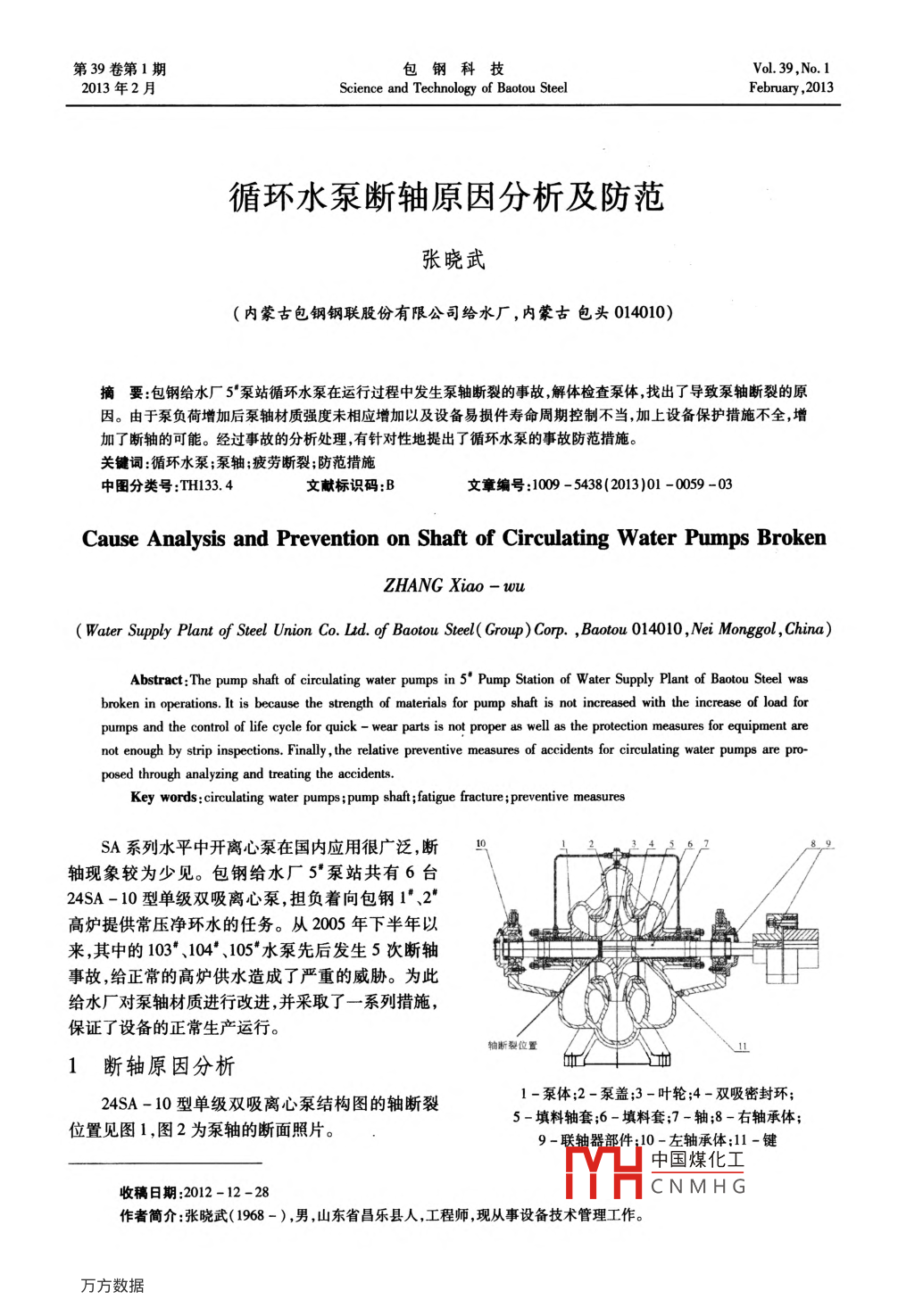 第39卷第1期包鋼科技Vol. 39,No. 12013年2月Science and Technology of Baotou SteelFebruary ,2013循環(huán)水泵斷軸原因分析及防范張曉武(內(nèi)蒙古包鋼鋼聯(lián)股份有限公司給水廠,內(nèi)蒙古包頭014010)摘要:包鋼給水廠5"泵站循環(huán)水泵在運(yùn)行過程中發(fā)生泵軸斷裂的事故,解體檢查泵體,找出了導(dǎo)致泵軸斷裂的原因。由于泵負(fù)荷增加后泵軸材質(zhì)強(qiáng)度未相應(yīng)增加以及設(shè)備易損件壽命周期控制不當(dāng),加上設(shè)備保護(hù)措施不全,增加了斷軸的可能。經(jīng)過事故的分析處理,有針對性地提出了循環(huán)水泵的事故防范措施。關(guān)鍵詞:循環(huán)水泵;泵軸;疲勞斷裂;防范措施中圖分類號:TH133.4文獻(xiàn)標(biāo)識碼:B文章編號:1009 - 5438(2013)01 -0059 -03Cause Analysis and Prevention on Shaft of Circulating Water Pumps BrokenZHANG Xiao - wu( Water Supply Plant of Steel Union Co. Lid. of Baotou Steel( Group) Corp. ,Baotou 014010 ,Nei Monggol , China)Abstract:The pump shaft of circulating water pumps in 5* Pump Station of Water Supply Plant of Baotou Steel wasbroken in operations. It is because the strength of materials for pump shaft is not increased with the increase of load forpumps and the control of life cycle for quick - wear parts is not proper as well as the protection measures for equipment arenot enough by strip inspections. Finally , the relative preventive measures of accidents for circulating water pumps are pro-posed through analyzing and treating the accidents.Key words:circulating water pumps ;pump shaft ; fatigue fracture ;preventive measuresSA系列水平中開離心泵在國內(nèi)應(yīng)用很廣泛,斷10軸現(xiàn)象較為少見。包鋼給水廠5*泵站共有6臺24SA - 10型單級雙吸離心泵,擔(dān)負(fù)著向包鋼1"、2* .高爐提供常壓凈環(huán)水的任務(wù)。從2005年下半年以來,其中的103*、104*、105*水泵先后發(fā)生5次斷軸事故,給正常的高爐供水造成了嚴(yán)重的威脅。為此給水廠對泵軸材質(zhì)進(jìn)行改進(jìn),并采取了一系列措施,保證了設(shè)備的正常生產(chǎn)運(yùn)行。軸斷裂位置1斷軸原因分析1-泵體;2-泵蓋;3 -葉輪;4 -雙吸密封環(huán);24SA-10型單級雙吸離心泵結(jié)構(gòu)圖的軸斷裂5-填料軸套;6 -填料套;7 -軸;8-右軸承體;位置見圖1,圖2為泵軸的斷面照片。9-聯(lián)軸器部件;10-左軸承體;11-鍵中國煤化工收稿日期:2012-12-28MHCNMH G作者簡介:張曉武( 1968 - ),男,山東省昌樂縣人,工程師,現(xiàn)從事設(shè)備技術(shù)管理工作。第1期循環(huán)水泵斷軸原因分析及防范51水不平衡,泵軸有輕微地振動,時間久了必然會產(chǎn)生和檢修更換。根據(jù)泵軸的材質(zhì)和加工工藝以及水泵鋼性疲勞,所以其斷裂也在所難免。轉(zhuǎn)子檢修次數(shù)等情況,以后對使用超過8000 h的泵該組水泵在2"高爐擴(kuò)容前曾經(jīng)考慮過更換為軸及易損件進(jìn)行更換,以保證水泵的安全穩(wěn)定運(yùn)行。更大供水能力的水泵,但由于費(fèi)用的原因未能與2*2.3改進(jìn)加工安裝工藝高爐擴(kuò)容改造同步實(shí)施。2' 高爐擴(kuò)容改造后,5*泵提高軸的加工質(zhì)量,做到臺肩處光滑過渡,以避站1組水泵的開動臺數(shù)明顯增加,由原來的開3臺免應(yīng)力集中;提高水泵轉(zhuǎn)子軸向、徑向的安裝精度,大泵1臺小泵到目前的最多時運(yùn)行5臺大泵1臺小在安裝時對轉(zhuǎn)子部件進(jìn)行測量,達(dá)到規(guī)定的標(biāo)準(zhǔn)值。泵,水泵嚴(yán)重超負(fù)荷運(yùn)行,檢修頻繁。2.4 加強(qiáng)循環(huán)水泵運(yùn)行點(diǎn)檢1.2水泵超期服役大大超 出其正常的使用壽命在運(yùn)行中加強(qiáng)對設(shè)備的點(diǎn)檢,做好電流、出口壓據(jù)現(xiàn)場查看, 103*和105水泵的生產(chǎn)日期是力、振動、軸承的溫度等參數(shù)的記錄,尤其注意各參1973年,至今已使用39年;其他泵的生產(chǎn)日期是數(shù)隨著運(yùn)行時間的加長所發(fā)生的變化情況。崗位操1993年,至今已使用19年。對于一般的水泵來說,作人員對循環(huán)水泵的上述參數(shù)定期進(jìn)行記錄,根據(jù)其正常的使用壽命在10年左右。如果使用時間太變化情況進(jìn)行分析。技術(shù)人員及時總結(jié)循環(huán)水泵故長,經(jīng)多次檢修之后,配合面必然存在磨損,泵的幾障處理的經(jīng)驗,完善處理措施。何尺寸就會變形,精度也會降低。由于精度的原因,2.5完善循環(huán)水泵保護(hù)功能造成泵軸在高速運(yùn)轉(zhuǎn)中產(chǎn)生振動,久而久之也會產(chǎn)根據(jù)現(xiàn)有循環(huán)水泵出口壓力和循環(huán)水主管壓力生微裂紋,從而造成其斷裂(2]。的報警、保護(hù)情況,對所有的保護(hù)定值進(jìn)行檢查。對為了節(jié)省檢修資金,給水廠大部分水泵軸都是循環(huán)水泵保護(hù)功能進(jìn)行完善,增加電流和泵出口壓本廠小機(jī)修自己生產(chǎn)的。由于沒有熱處理設(shè)備,對力的報警和保護(hù)。對水泵及電機(jī)軸承進(jìn)行定期加油泵軸無法進(jìn)行調(diào)質(zhì)處理,加之也沒有無損探傷設(shè)備,和換油,提高轉(zhuǎn)子的使用壽命。以及其他-些原因,所以每年都會發(fā)生一、二次斷軸3結(jié)束語事故。通過以上措施的實(shí)施,對循環(huán)水系統(tǒng)的安全穩(wěn)2防范措施定運(yùn)行起到了較大的作用,5泵站1組水泵軸最近2針對循環(huán)水泵斷軸的原因以及對機(jī)組運(yùn)行安全年沒有發(fā)生斷裂事故。對于循