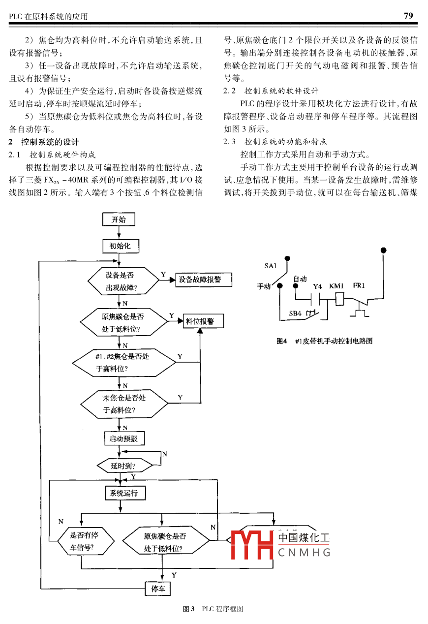 C在原料系統(tǒng)的應(yīng)用PLc在原料系統(tǒng)的應(yīng)用The application of plC in Material System黃崇莉(陜西理工學(xué)院機(jī)電系,漢中723003)摘要:闡述了硅鐵生產(chǎn)中焦碳生產(chǎn)輸送系統(tǒng)的工作原理和工藝要求,介紹了PLC在原料輸送系統(tǒng)中的應(yīng)用,給出了PLC的LO接線圖及程序框圖,提出了工業(yè)原料生產(chǎn)輸送控制系統(tǒng)的設(shè)計特點關(guān)鍵詞:原料輸送系統(tǒng)PLC程序框圖Abstract: This paper briefly introdues the working principle and technology requiration of cokeconduction system in generative silica rion, it introdues application of PlC in material conduction systemputs forward PLC I/O figure and procedure frame figure and plan hallmark of conduction control system inKey words: material conduction system PLC procedure frame figure0引言粒度為40~80mm,焦碳的粒度為5~13mm,而且隨著在硅鐵冶煉中,主要原料有硅石和還原劑,還原劑生產(chǎn)產(chǎn)品的不同,粒度也應(yīng)改變。因此為了滿足冶煉采用氣煤焦或石油焦,還原劑粒度的大小對硅鐵冶煉工藝的要求,提高原料輸送能力和適應(yīng)性,在原料輸送是一個至關(guān)重要的因素。從增加爐料比電阻,增加反系統(tǒng)中采用PLC控制器。應(yīng)接觸面和加速反應(yīng)速度來看,粒度要小,而且粒度上1工作原理及技術(shù)要求下限要小。但粒度過小,在破碎過程中產(chǎn)生的焦粉多,工作原理焦碳的利用率低,且過小的焦粒在爐口易燃燒,造成爐以在硅鐵冶煉中焦碳輸送系統(tǒng)控制為例,來說明內(nèi)缺碳,也不經(jīng)濟(jì)。一般,礦熱爐的容量越小,所用的PC在原料輸送自動生產(chǎn)線上的應(yīng)用。焦碳自動生產(chǎn)焦碳粒度也越小。如在5000kVA硅鐵電爐上,硅石的線工藝流程如圖1所示。焦碳倉皮帶機(jī)電磁分離器#1篩碳機(jī)#皮帶機(jī)6皮帶機(jī)#篩碳機(jī)末碳倉破碎機(jī)焦倉5皮帶機(jī)#1焦倉#4皮帶機(jī)中國煤化工CNMHG3皮帶機(jī)圖1工藝流程圖作者簡介:黃崇莉女,1965年生,陝西人,講師,在職研究生。主要從事機(jī)電傳動控制及檢測傳感技術(shù)的研究和教學(xué)工作。機(jī)電一體化 Mechatronics2005年第6期原焦碳倉的焦碳經(jīng)電磁分離器除雜,經(jīng)過一級分2控制技術(shù)要求篩,將焦碳分為粒度大于5mm的大焦和粒度小于5mm從工作原理可以看出,要使整個系統(tǒng)正常工作,必的小焦。其中,小焦送入末碳倉進(jìn)行回收,大焦送入須保證在輸送過程各設(shè)備不產(chǎn)生余料,在故障時各設(shè)級分篩,將焦碳分為粒度大于13mm的大焦和粒度小備不堆料,這就要求諸多設(shè)備動作應(yīng)準(zhǔn)確、協(xié)調(diào)。為了于13mm大于5mm的冶煉焦。將冶煉焦直接送入焦倉保證各設(shè)備動作的準(zhǔn)確性,必須設(shè)置反饋環(huán)節(jié),保證在貯存,為配料作準(zhǔn)備。粒度大于13mm的大焦,經(jīng)過破上一個動作完成后執(zhí)行下一個動作。其具體要求有碎和三級篩選,將其分為冶煉焦和粉末焦后,分別送入1)原焦碳倉為低料位時,不允許啟動輸送系統(tǒng)焦倉、末碳倉貯存。且設(shè)有報警信號故障報警YSAIHL2料位報警啟動預(yù)告5A3KM1#皮帶機(jī)Y1KM2#1篩煤機(jī)X13KM3#2皮帶機(jī)X14X15KM4#篩煤機(jī)KM5破碎機(jī)KM6#篩煤機(jī)STIX19Y10KM7#皮帶機(jī)ST3X21口一kwg皮帶機(jī)ST4YIST5Y12口一K和粘皮帶機(jī)X24KM1O#4皮帶機(jī)KMIY13KM2YV電磁分離器X26Y14YVI原焦倉門汽氣動電磁閥KM4KM5Y162末焦倉門氣動電磁YV3#焦倉氣動電磁閥KM7Y17YV4#焦倉門氣動電磁閥中國煤化工KMIOCNMHG圖2 PLC VO接線圖SBl:啟動按鈕;SB2:停車按鈕;SB3:急停按鈕;H、H:原焦碳倉高、低料位;H、H4:#焦倉高、低料位:#2焦倉高、低料位;H、H8:末碳倉高、低料位;STⅠ、ST2:原焦碳倉倉門開、閉限位;ST3、ST:#焦碳倉倉門開、閉限位;SI5、SI6焦碳倉倉門開、閉限位;S7、S8:末焦倉倉門開、閉限位;SA1-SA15:各設(shè)備旁的手動、自動轉(zhuǎn)換開關(guān)C在原料系統(tǒng)的應(yīng)用792)焦倉均為高料位時,不允許啟動輸送系統(tǒng),且號、原焦碳倉底門2個限位開關(guān)以及各設(shè)備的反饋信設(shè)有報警信號號。輸出端分別連接控制各設(shè)備電動機(jī)的接觸器、原3)任一設(shè)備出現(xiàn)故障時,不允許啟動輸送系統(tǒng),焦碳倉控制底門開關(guān)的氣動電磁閥和報警、預(yù)告信且設(shè)有報警信號號等。4)為保證生產(chǎn)安全運(yùn)行,啟動時各設(shè)備按逆煤流2.2控制系統(tǒng)的軟件設(shè)計延時啟動,停車時按順煤流延時停車PLC的程序設(shè)計采用模塊化方法進(jìn)行設(shè)計,有故5)當(dāng)原焦碳倉為低料位或焦倉為高料位時,各設(shè)障報警程序、設(shè)備啟動程序和停車程序等。其流程圖備自動停車。如圖3所示。2控制系統(tǒng)的設(shè)計2.3控制系統(tǒng)的功能和特點2.1控制系統(tǒng)硬件構(gòu)成控制工作方式采用自動和手動方式。根據(jù)控制要求以及可編程控制器的性能特點,選手動工作方式主要用于控制單臺設(shè)備的運(yùn)行或調(diào)擇了三菱FX2-40MR系列的可編程控制器,其LO接試、應(yīng)急情況下使用。當(dāng)某一設(shè)備發(fā)生故障時,需維修線圖如圖2所示。輸亼端有3個按鈕、6個料位檢測信調(diào)試,將開關(guān)撥到手動位,就可以在每臺輸送機(jī)、篩煤開始設(shè)備是否沒備故障報警自動出現(xiàn)故障Y4 KMI原焦碳倉是否位報警處于低料位?圖4#皮