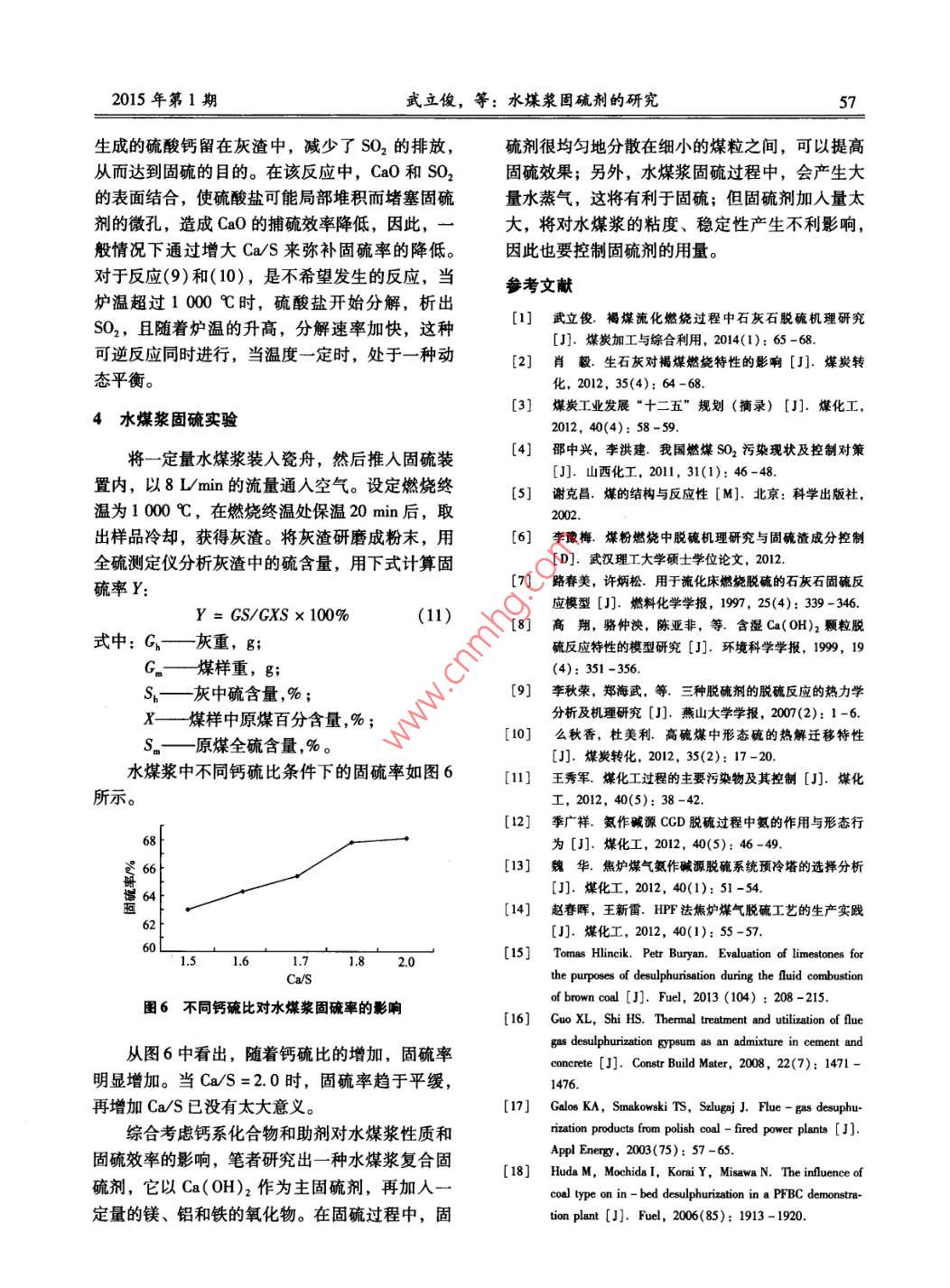 煤炭加工與綜合利用No.1,2015COAL PROCESSING COMPREHENSIVE UTILIZATION55水爆漿固硫劑的研咒武立俊,劉春華,李麗(山西工程技術學院,山西陽泉045000摘要:實驗分析了Ca(OH)2、Mg(OH)2、CaCO3的固硫特性,根據(jù)不同固碗劑的熱分解溫度確定釆用Ca(OH)2作主固硫劑用于環(huán)保固硫型水煤漿;分析了固硫劑的固硫機理,實驗表明,當Ca/S=2.0時,水煤漿固硫率可達68.1%,解決了高硫煤的加工利用難題。關鍵詞:高硫煤;水煤漿;固硫劑;固硫機理中圖分類號:TQ534.4文獻標識碼:A文章編號:10058397(2015)01005503我國是世界上最大的煤炭生產(chǎn)國和消費國在中速下攪拌10min。制成水煤漿的濃度一粘度預計到2015年我國煤炭需求將達到40億t以上曲線見圖1。水煤漿流變特性見圖2。隨著煤炭開采深度的加深,高硫煤的比例越來越大,如形成于晚石炭世一早二迭世(北方)和晚二82500迭世(南方)的煤炭硫分在2%~5%,而太原統(tǒng)2000煤中有一半煤硫分超過3%。高硫煤在燃燒過程中產(chǎn)生大量的SO2和煙塵,其中SO2的環(huán)境污染已引起社會廣泛關注。據(jù)統(tǒng)計,我國國土面積268.4濃度3以上已處于酸雨控制區(qū),該地區(qū)降水平均pH值降至4.5以下;2004年以來,我國每年因酸雨圖1水煤漿濃度一粘度曲線示意和二氧化硫污染對生態(tài)環(huán)境損害和人體健康影響造成的經(jīng)濟損失在1100億元以上,而且這種污染損失還在持續(xù)增加。因此,結(jié)合我國國情,研究一種固硫型水煤漿技術,可以將劣質(zhì)能源變?yōu)闈崈裟茉?解決我國高硫煤的加工利用難題,把SO2環(huán)境污染控制在最低水平。4060801001煤質(zhì)分析及制漿實驗剪切速率s1圖2水煤漿流變特性示意(煤漿濃度為672%)制漿用煤采用陽煤集團某礦篩末煤,煤質(zhì)指標為:全水分7%,灰分3775%,硫分21%,發(fā)熱量1875M/kg。該煤種屬于高硫煤,煤中硫大多呈2主固硫劑的選擇細粒嵌布,常規(guī)洗選只能脫除一小部分。有資料表明,水煤漿在燃燒過程中其硫分集在室溫下進行制漿試驗,按一定比例稱取中在300~600℃釋放。本次實驗主要研究在水定量的精煤、蒸餾水和添加劑,將添加劑和水混煤漿中加入合適的固硫劑,這種藥劑在低溫下即合,使其充分溶解,然后加入煤中,使用攪拌器有較好的固硫效果,使水煤漿燃燒時,硫被固定收稿日期:201407-30DOI:10.16200/jcnk11-2627/td201501019基金項目:山西工程技術學院科研項目(K20130705003)作者簡介:武立俊(1974-),男,山西孝義入,2003年畢業(yè)于中國礦業(yè)大學(北京)應用化學專業(yè),工學碩士,山西工程技術學院講師。引用格式:武立俊,劉春華,李廁.水煤漿固硫劑的研究[冂.煤炭加工與綜合利用,2015(1):55-57煤炭加工與綜合利用2015年第1期在灰渣中。主固硫劑的選擇圍繞CaO進行,常用10100的固硫劑有石灰石、白云石、消石灰、電石渣和1503mi白泥等,大多資源豐富,價格低廉。下面對幾種290326.85℃97.75%常用固硫劑的化學成分進行熱解試驗研究。93.20℃68.39%2.1Ca(OH)2的固硫特性水圖3所示為Ca(OH)2的熱重曲線,升溫速02004006008001000率30℃/min。從圖中可以看出,在400℃時溫度/℃Ca(OH)2開始分解,到470℃時分解速率達到最圖4Mg(OH)2的TCA曲線大值。到502℃時已分解84%,而第二次分解(563~693℃)只占16%。其分解反應式為30℃/min。從圖中可以看出,在658℃時CaCO3Ca(OH)2→CaO+H2O(1)開始分解,其反應式為Ca(OH)2分解反應產(chǎn)生高活性的CaO晶粒CaCO3→CaO+CO2和水蒸氣。CaO與SO2反應生成CaSO4(煤燃燒盡管分解產(chǎn)生的CaO具有固硫作用,但是其產(chǎn)物中SO3的含量只占SO2的1%~2%,因此不分解溫度較高,在需要低溫固硫的場合,其固硫考慮與SO3的作用)留在灰渣中;水蒸氣的存在作用受到限制??梢蕴岣唿S鐵礦的脫除率。由此可以得出,Ca(OH)2的第一次分解溫度與煤中SO2的釋放溫100度大部分重合(300~600℃),由于水煤漿的燃燒31.65min658.42℃溫度一般在1000℃左右,因此用Ca(OH)2作為99.67%固硫劑可以起到很好的固硫作用。56.58%自目冊米020040060080010001200401.92℃24.00min90+9998%50289℃圖5CaCO3的TGA曲線79.18%3鈣鎂系固硫劑的固硫機理020040060080010001200度/C關于鈣鎂系固硫劑的固硫機理,已有很多學圖3Ca(OH)2的TGA曲線者進行了深入、廣泛研究,一般認為,鈣系化合物能夠固硫的主要原因是其與煤中硫發(fā)生了以下22Mg(OH)2的固硫特性反應:圖4所示為Mg(OH)2的熱重曲線,升溫速第一步:率30℃/min。從圖中可以看出,在326℃時Coal(S)+O2→SO2↑(4)Mg(OH)2開始分解,其反應式為:CaCO3→CaO+CO2↑(5)Mg(OH)2→MgO+H2OCa(OH)2→Ca0+H2O↑(6)與Ca(OH)2相比,Mg(OH)2的分解溫度要第二步:低一些,但是分解產(chǎn)生的MgO與SO2的反應速CaO+SO2→CaS(7)率很低,故一般情況下可以認為是惰性的;而在煙氣脫硫中Mg(OH)2可以與SO2反應,是良好CaO+S02+0.5 02-+CaSO, (8)的脫硫劑,但其價格比Ca(OH)2貴得多,實際第三步CaSO4→Ca0+SO2↑(9)使用不多。CaSO3→CaO+SO2↑2.3CaCO3的固硫特性圖5所示為CaCO3的熱重曲線,升溫速率反應(8)是最有利的反應,而且是放熱反應。2015年第1期武立俊,等:水煤漿固硫劑的研究生成的硫酸鈣留在灰渣中,減少了SO2的排放,硫劑很均勻地分散在細小的煤粒之間,可以提高從而達到固硫的目的。在該反應中,Ca0和SO2固硫效果;另外,水煤漿固硫過程中,會產(chǎn)生大的表面結(jié)合,使硫酸鹽可能局部堆積而堵塞固硫量水蒸氣,這將有利于固硫;但固硫劑加人量太劑的微孔,造成CaO的捕硫效率降低,因此,大,將對水煤漿的粘度、穩(wěn)定性產(chǎn)生不利影響,般情