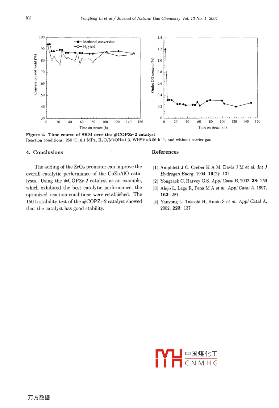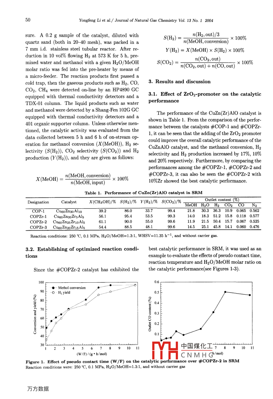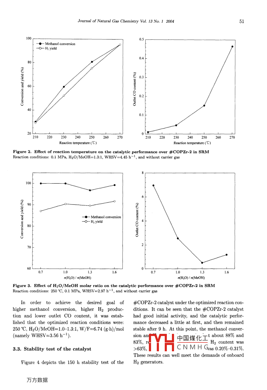 雪Jourmeal NaturlGas Che hletryJournal of Natural Gas Chemnistry 13(2004)49 -52SCIENCE PRESSMethanol Steam Reforming Reactions on CuZn(Zr)AlO CatalystYongfeng Li*,Xinfa Dong,Weiming LinSouth China University of Technology, Guangzhou 510640, China[Manuscript received December 02, 2003; revised December 15, 2003)Abstract; The catalytic performances of methanol steam reformning reactions on CuZn(Zr)AIO catalystswere studied. When the ZrOz promoter was added to a CuZnAIO catalyst, its methanol conversion,H2 production and H2 sletity improved greatly. By using the #COPZr-2 catalyst as an example,which exhibited the best catalytic performance, the optimized reaction conditions were established to be:250 °C, 0.1 MPa, H2O/MeOH=1.3, WHSV=3.56 h-', and without carrier gas. A 150 h stability test ofthe #COPZr-2 catalyst showed that the catalyst had good stability, as the methanol conversion and H2production could be kept at 88% and 83% respectively. Moreover, outlet H2 and CO contents were >63%and 0.20%-0.31%, respectively.Key words: ZrO2, methanol, steam reforming, CuZnAIO1. IntroductionCu-containing catalysts in onboard H2 generators. Inthis study, a series of CuZn(Zr)AlO catalysts wereScientifc evidence strongly suggests that theprepared by the coprecipitation method, which dis-rapid building up of greenhouse gases in the atmo-played good activities and stabilities in SRM.sphere is the cause of the earth's temperature-raising,which changes the earth's climate, and has many po-2. Experimentaltential consequences. Eforts are currently underwayto reduce the emissions of greenhouse gases such as2.1. Catalyst preparationCO2 from the transportation sector by the use of hy-drogen (H2) fueled fuel cells such as polymer elec-The CuZn(Zr)AIO catalysts were prepared by thetrolyte membrane fuel cell (PEMFC) for powering ve-coprecipitation method. An aqueous solution con-hicles. There are several routes for hydrogen produc-taining Cu, Zn, Zr, and Al nitrate was used for thetion from primary fuels. One of the promising routescoprecipitation at 343 K and pH=8.0 -9.0, with 1 Mis the steam reforming of methanol (SRM). The equi-Na2CO3 as the precipitating agent. After being agedlibrium conversion of SRM can reach around 100% atat 333 K for 3 h, the precipitate was filtered, washed423 K at atmospheric pressure [1]. Cu-containing cat-with distilled water, dried at 383 K for 12 h, and fi-alysts show particularly high activities and selectivi-nally calcined at 723 K for 6 h.ties for SRM at low temperatures (503- 573 K), andthey are regarded as the main catalysts for onboard2.2. Catalytic reactionH2 generators. However, the Clu-containing catalystshave the problem of low catalytic stability [2 4]. How中國煤化工wsing a fxc-bdto solve this problem is still the key for applying the fAow:MYHC N M H Gatmospheric pres-●Corresponding author.Tel; 086-020-87057751; Fax: 086-020-87057789; E-mail address: liyf@ms.giec.ac.cnThis work is supported by the National Science Foundation of Guangdong Province (000435), Research Foundation for theDoctoral Program of Higher Education of China (20010561003), Science and Technology Program of Guangzhou(2001J1-C0211).5(Yongfeng Li et al./ Journal of Natural Gas Chemistry Vol. 13 No. 1 2004sure. A 0.2 g sample of the catalyst, diluted withS(H2)=n(H2, out)/3x 100%quartz sand (both in 20-40 mesh), was packed in an(MeOH, conversion)7 mm i.d. stainless steel tubular reactor. After re-Y(H2) = X(MeOH) x S(H2) x 100%duction in 10 vol% flowing H2 at 573 K for 5 h, pre-n(CO2, out)mixed water and methanol with a given H2O/MeOHS(CO2)=n(CO2, out) + n(CO, out)x100%molar ratio was fed into the pre-heater by means ofa micro-eeder. The reaction products first passed acold trap, then the gaseous products such as H2, CO,3. Results and discussionCO2, CH4 were detected on-line by an HP4890 GCequipped with thermal conductivity detectors and a3.1. Efect of ZrO2-promoter on the catalyticTDX-01 column. The liquid products such as waterperformanceand methanol were detected by a Shang Fen 102G GCThe performance of the CuZn(Zr)AIO catalyst isshown in Table 1. From the comparison of the perfor-401 organic supporter column. Unless otherwise men-mance between the catalysts #COP-1 and #COPZr-tioned, the catalytic activity was evaluated from the1, it can be seen that the adding of the ZrO2 promoterdata collected between 5 h and 6 h of on-stream op-could improve the overall catalytic performance of theeration for methanol conversion (X(MeOH)), H2 se-CuZnAlO catalyst, and the methanol conversion, H2lectivity (S(H2)), CO2 seletivity (S(CO2)) and H2selectivity and H2 production increased by 17%, 10%production (Y(H2)), and they are given as follows:and 20% respectively. Furthermore, by comparing theperformances among the #COPZr-1, #COPZr-2 andX(MeOH) =! x 100%#COPZr-3, it can also be seen the #COPZr-2 withn(MeOH, input)10%Zr showed the best catalytic performance.Table 1. Performance of CuZn(Zr)AIO catalyst in SRMOutlet content (%)DesignationCatalystX(CH3OH)/% S(H2)/% Y(H2)/% S(CO2)/%MeOH H2O H2 CO2 CO N2COP-1Cue0Zn3oAl039.286.033.799.421.8 30.3 36.3~ 10.9 0.065 0.562COPZr-1 CueoZn3oZrsAls56.195.453.599.314.0 18.3 51.2 15.8 0.118 0.577COPZr-2CueoZn2sZr1oAls90.055.099.61.9 21.5 50.4 15.70.067 0.525COPZr-3_ CueoZn2oZr15Als54.448.199.6 .14.5 25.1 45.8 14.1 0.060 0.476Reaction conditions: 250 °C, 0.1 MPa, H2O/MeOH=1.3:1, WHSV=11.35 h-', and without carrier gas.3.2. Establishing of optimized reaction condi- best catalytic performance in SRM, it was used as antionsexample to evaluate the effects of pseudo contact time,reaction temperature and H2O/MeOH molar ratio onSince the #COPZr-2 catalyst has exhibited thethe catalytic performance(see Figures 1-3).10. Methol Iiversion)- H2 yield0.580 E0.4日o.3 EoE0t0 E/30上中國煤化工節(jié)811011(W/F)/(g* h/mol)HCNMHG/mo)Figure 1. Efect of pseudo contact time (W/F) on the catalytic performance over #COPZr-2 in SRMReaction conditions were: 250 °C, 0.1 MPa, H2O/MeOH=1.3:1, and wit