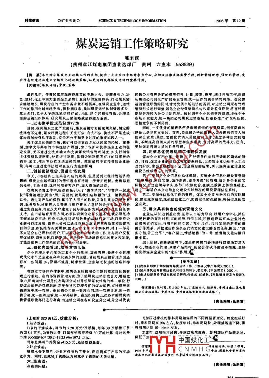 科技信息O礦業(yè)天地口SCIENCE & TECHNOLOGY INFORMATION2008年第19期煤炭運(yùn)銷工作策略研究張利國(貴州盤江煤電集團(tuán)盤北選煤廠貴州 六盤水553529)[擒要]本文結(jié)合煤炭企業(yè)運(yùn)銷工作的實(shí)際,提出了企業(yè)應(yīng)以市場需求為中心,應(yīng)加強(qiáng)法律法規(guī)監(jiān)管手段、創(chuàng)新營銷理念、強(qiáng)化內(nèi)管理、突出信息化建設(shè)和建立營銷文化的運(yùn)銷策略。以更好的發(fā)輝煤炭運(yùn)銪的重要作用。[關(guān)鍵詞]謀炭運(yùn)銷;管理;策略最近幾年,伴著國家宏觀調(diào)控政策的不斷出臺(tái).并隨著電力、冶運(yùn)銷公司管理各礦的煤炭銷佛 .計(jì)量.裝車調(diào)車、統(tǒng)計(jì)各項(xiàng)工作,形成:、建材、化工等四大主要煤炭消費(fèi)行業(yè)良好的發(fā)展勢頭,拉動(dòng)煤炭需 從集團(tuán)公司到生產(chǎn)礦的垂直管理,統(tǒng)一 運(yùn)作的聯(lián)合銷售網(wǎng)絡(luò)。在完善求繼續(xù)增長.煤炭行業(yè)的產(chǎn)址和需求量不斷提高。在煤炭企業(yè)中,運(yùn)銷運(yùn)銷管理職能的同時(shí),針對(duì)發(fā)展市場經(jīng)濟(jì)的需要,對(duì)運(yùn)銷公司原有管理工作的作用也越來越突出。但長期以來.我國煤炎運(yùn)銷體制管理多頭,組織形式進(jìn)行調(diào)整,強(qiáng)化企業(yè)經(jīng)營組織機(jī)構(gòu)和審計(jì)監(jiān)督職能.將直線職政出多門,競爭無序的現(xiàn)象仍然存在,因此.建立起積極有效、合理靈能制管理轉(zhuǎn)為分公司制管理。 通過調(diào)整企業(yè)運(yùn)銷管理組織,增強(qiáng)企業(yè)話的運(yùn)銷組織體系,研究煤炎運(yùn)銷策略就顯得越為重要。市場開發(fā)能力,統(tǒng)一集團(tuán)公司煤炭運(yùn)銷市場,杜絕各生產(chǎn)礦競相壓價(jià),-、以法律手段規(guī)范經(jīng)營行為目前,我同煤炭立法嚴(yán)電滯后,煤炭運(yùn)銷方面的法規(guī)欠缺,制定的同時(shí),-支優(yōu)秀的銷售隊(duì)伍是市場營銷的窄責(zé)財(cái)富,銷售隊(duì)伍的法律也不完善.煤炭經(jīng)營過程中無法可依、有法不依、執(zhí)法不嚴(yán)是造成建設(shè)也是非常重要的。首先,要選拔合格的銷售人員并提病銷售人員煤炭市場經(jīng)營秩序混亂.競爭不公平和競爭過度的取要原因之一。的綜合素質(zhì);其次,要強(qiáng)化背銷人員的培訓(xùn)工作,通過多種形式的培關(guān)于煤炭運(yùn)銷的立法,我們可以借鑒西方發(fā)達(dá)國家的經(jīng)驗(yàn)。在美訓(xùn), 不斷提高營銷人員的思想和業(yè)務(wù)素質(zhì).保持高昂的戰(zhàn)斗力;還有,1 .加拿大等典型的市場經(jīng)濟(jì)產(chǎn)煤國,為了保護(hù)和扶持媒炭工業(yè)的穩(wěn)要加強(qiáng)對(duì)營銷人員的日常管理。定發(fā)展.無不通過立法來確立和完善煤炭銷售管理制度.如實(shí)行銷售四、用信息化促進(jìn)運(yùn)銷工作較快發(fā)展主體資格認(rèn)證制度,經(jīng)營許可制度,供銷合同制度等有序的對(duì)煤炭的炭企業(yè)有產(chǎn)業(yè)集中度低、生產(chǎn)經(jīng)營條件差和所處地區(qū)偏遠(yuǎn)的特銷售.加工,使用等經(jīng)昔活動(dòng)加強(qiáng)管理。政府雖然不直接參加企業(yè)決點(diǎn)。 日前.煤炎企業(yè)的信息化程度普遍較低,大多數(shù)企業(yè)仍處于人工會(huì)策,卻可以通過法律法規(guī)對(duì)企業(yè)行為施加影響總的階段,常會(huì)造成數(shù)據(jù)不全、信息滯后的后果。所以煤炭企業(yè)信息化二、創(chuàng)新營銷理念,促進(jìn)市場發(fā)展建設(shè)已經(jīng)成為迫切的需要。今天,市場經(jīng)濟(jì)已經(jīng)具備相應(yīng)的規(guī)模.但是受到以往計(jì)劃經(jīng)濟(jì)的第一.要制定企業(yè)信息化總體規(guī)劃。實(shí)施企業(yè)信息化建沒要堅(jiān)持影響.煤炭企業(yè)運(yùn)銷部門的營銷理念有待進(jìn)一步開拓創(chuàng)新。走出思想“統(tǒng)籌規(guī)劃 、階段實(shí)施循序浙進(jìn)、逐步升級(jí)"的戰(zhàn)略,結(jié)合各企業(yè)的實(shí)的輊梏,主動(dòng)尋找.選擇和培養(yǎng)客戶群,加大市場的培育。際情況,由企業(yè)領(lǐng)導(dǎo)牽頭,各部門積極配合,在滿足數(shù)據(jù)上傳的基礎(chǔ)上,在煤發(fā)銷售工作中,應(yīng)該積極引入了“感情銷售”、“與客戶一起成建立一套適合 本企業(yè)信息化建設(shè)實(shí)際情況的煤炭管理信息系統(tǒng)。長"等營銷理念提出“用戶需要的.就是我們應(yīng)該做的"這一銷傳服務(wù)第二.要加強(qiáng)信息化工.作的管理。煤凝企業(yè)要根據(jù)各自的實(shí)際情口號(hào)。通過對(duì)產(chǎn)品的保值,贏得了大用戶的稱譽(yù),只有注重提高服務(wù)意況,建立規(guī)章制度,規(guī)范信息化工作,加強(qiáng)安全防范措施,確保信息的安識(shí)、服務(wù)質(zhì)址,使銷售人員普遍與用戶建立了良好的合作關(guān)系,特別是全有效。通過實(shí)踐服務(wù),與重點(diǎn)大戶建立了良好的業(yè)務(wù)關(guān)系,贏得了他們信任和五、建立具有特色的煤炭營銷文化支持。在市場培育開發(fā)方面,必須認(rèn)識(shí)到企業(yè)要長盛不衰,就必須堅(jiān)持企 業(yè)應(yīng)從長遠(yuǎn)利益出發(fā),堅(jiān)持以市場為導(dǎo)向,以用戶為中心,抓住不懈地培育市場,創(chuàng)造市場,保持足夠數(shù)最的戰(zhàn)略后備市場。