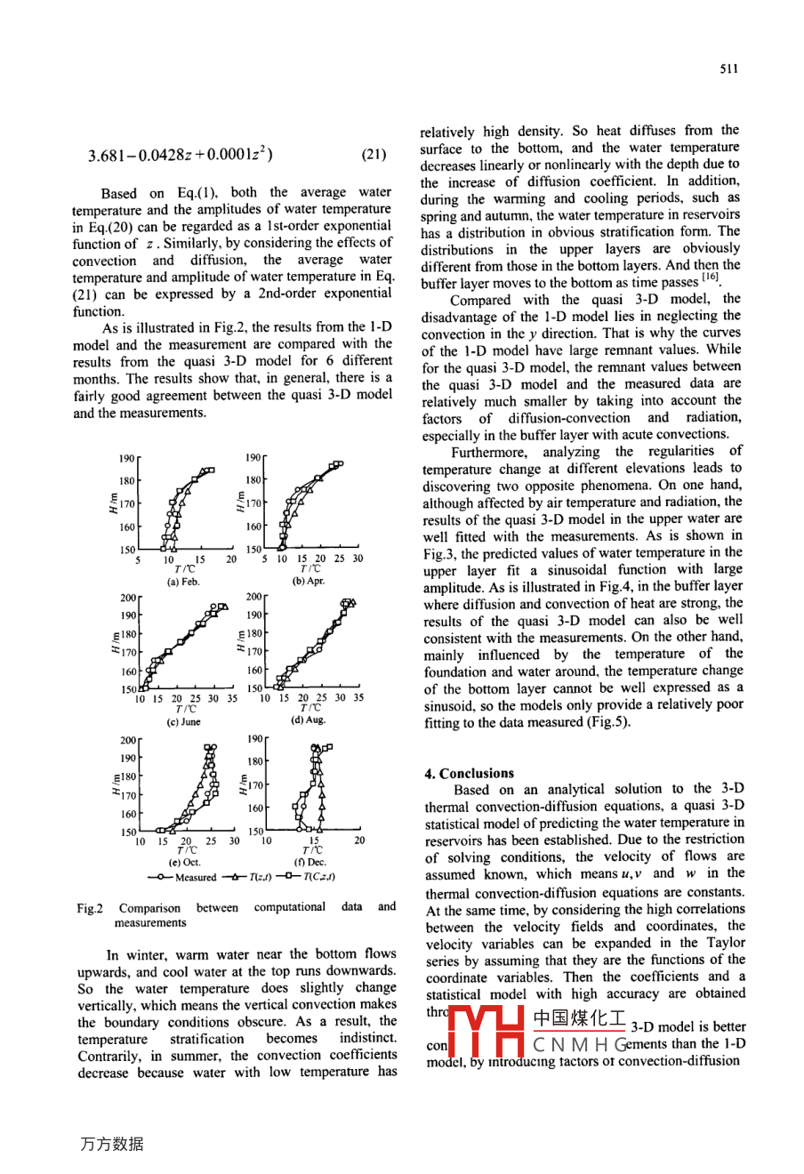 507Available online at www.sciencedirect.comScienceDirect' HHDJoumal of Hydrodynamicswww. sciencedirect com/EL SEVIER2008,20(4):507-513science/joumal/10016058FORECAST OF WATER TEMPERATURE IN RESERVOIR BASED ONANALYTICAL SOLUTION"JI Shun-wen, ZHU Yue-ming, QIANG ShengCollege of Water Conservancy and Hydroelecric Enginering, Hohai University, Nanjing 210098, China, E-mail:jishunwen@hhu.edu.cnZENG Deng-fengWater Power Plant of Sanhe Shangyoujiang, Ganzhou 341212, China(Received June 4, 2007, Revised August 20, 2007)Abstract: The water temperature in reservoirs is dificult to be predicted by numerical simulations. In this article, a statitical modelof forecasting the water temperature was proposed. In this model, the 3-D thermal conductiondiffusion equations were convertedinto a system consting of 2-D equations with the Fourier expansion and some hypotheses. Then the stistical model of forecasingthe water temperature was developed based on the analytical solution to the 2-D thermal equations. The simplified stistial modelcan elucidate the main physical mechanism of the temperature variation much more clearly than the nuimerical simulation with theNavier Stokes equations. Finally, with the presented statistical model, the distribution of water temperature in the Shangyoujiangreservoir was determined.Key words: water temperature, quasi 3-D statistical model, thermal conduction difusion equation, analytical solution, regressionanalysis, factor of radiation1. Introductionparameters into account, in the 1-D statistical modelThe major methods of forecasting the watersome different parameters were introduced for thetemperatures in reservoirs generally include empiricalempirical formulas, and the water temperature wasformulas, statistical models and numerical simulations.calculated with12].Under the assumption of periodical boundaryconditions and with the 1-D thermal equations inT(z,l)=Ce"+C2e" cos(ox-C-c2) (1)hydrodynamics, the empirical formulas presented inRef.[1] can be employed to forecast the distribution ofFurthermore, with the development of the FDMthe water temperature along the depth. However, theand FEM, numerical simulations have beenuse of the empirical formulas is limited to the flows inextensively used to calculate the distributions of thereservoirs and the method may introduce errors ofwater temperature by solving the vortex motionaliasing. In order to overcome the shortcomings ofequations of incompressible viscous fluid. Comparedempirical formulas, recently, some researchers tried towith empirical formulas and statistical models, thestudy and solve this problem from different aspects. Liamount for the numerical work is quite large. Inet al proposed a 1-D statistical model 4. Throughaddition, when there is numerical dispersion ortaking the influences of the flow pattern and the otheroscillation due to some improper treatments about theconvection terms, the prediction quality would b* Project Supported by the National Natural Sciencemuch中國煤化工- rical formulas andFoundation of China (Grant Nos. 50539010, 50539020, andstatist50579080).THCN MH Gcle, a quasi 3-DBiography: JI Shun-wen (1981- ), Malc, Ph. D. Candidatestatistican Houel IU1 uc waci temperature in508reservoirs is established, and some mathematicaldifusion equations could be converted into thedescriptions of the factors, such as the solar radiationfollowing combination of a 2-D thermal equation andand diffusivity, are given. In its second part, somea 1-D thermal equation which can be solvedtests are outlined to validate the model.individually I7:oT. JT_l 子2T。。子2T2. Governing equations+1=K-+h-+Sz(3)2.1 Thermal convectiondiffusiort equationdy)zay2)z2The 3-D thermal convection-diffusion equationswith a source term are defined as [B-6)OT+n,AT_, dT(4)ddz2aT.. T. aT . aT_n 子2TAtdx dy0zdx^2.3 Radiation factorAssume that the source term in Eq.(2) isindependent of time, and then the water temperatureaT. ,子2TJz2-+S,can be considered to reach the equilibrium state ofDy"heat exchange and satisfy Eq.(3). Based on Eq.(3), avertical 2-D numerical model for the solar radiation isT=T。+T。cosor, z=0, t20(2)established, and some mathematical descriptions ofhe factors, such as the source term and the termsrelated to the convection-diffusion, are obtained.where T is the water temperature, I is time, u,VMoreover, it is found that about 80% of theand W are respectively the components of velocityradiation could be absorbed by the superficial layer ofvectors, S denotes the source term, K=v,/σ, isthe water, and only about 5% could reach the depth ofthe thermal conductivity, v, stands for the ceofficientm, that is, the solar radiation decreasesexponentially with the depth of the water. So theof eddy viscosity, and σ, denotes the turbulentshort-wave radiation possesses the penetratingPrandtl number, T。 denotes the annual averagecapacity in water included in Eq.(3) and the sourcetemperature of the water, T is the annual variableterm can be defined as "amplitude of the temperature, 0 is the frequency.In general, the water temperature varies veryS(y,z)=e"g(y)(5)slightly along the dam axis, which meansaT/dx= 0.Firstly, for the bottom of the water, appropriateSo formeeting the requirements of predictionprecision in engineering, the 3-D thermnalconditions have to be applied to solve Eq.(3):conduction-diffusionequationscouldbeapproximately described with a system of 2-Dlim T(y,z)=0,lim S(y,z)=0(6)I→+∞.2- ++∞problems.where both of T(y,z) and S(y,z) are someSource tem:Sze* 'g(v)periodic functions in the y direction. Then, they業(yè)Boundary: T=T。+T。cosoutfollowing equations can be obtained by expandingg(y) and T(y,z) into the Fourier series in the ydirection:Reservoirg(y)=2+2.A, cos nTY+B, sinhty,F(xiàn)ig.1 Conventional diagram for 2-D thermal cquations2.2 Decomposition of the thermal convection-diffusionnty +T(y,z)=+ Z[C,(z)cosAs is shown in Fig.l, the water temperature ismainly influenced by solar radiation and air中國