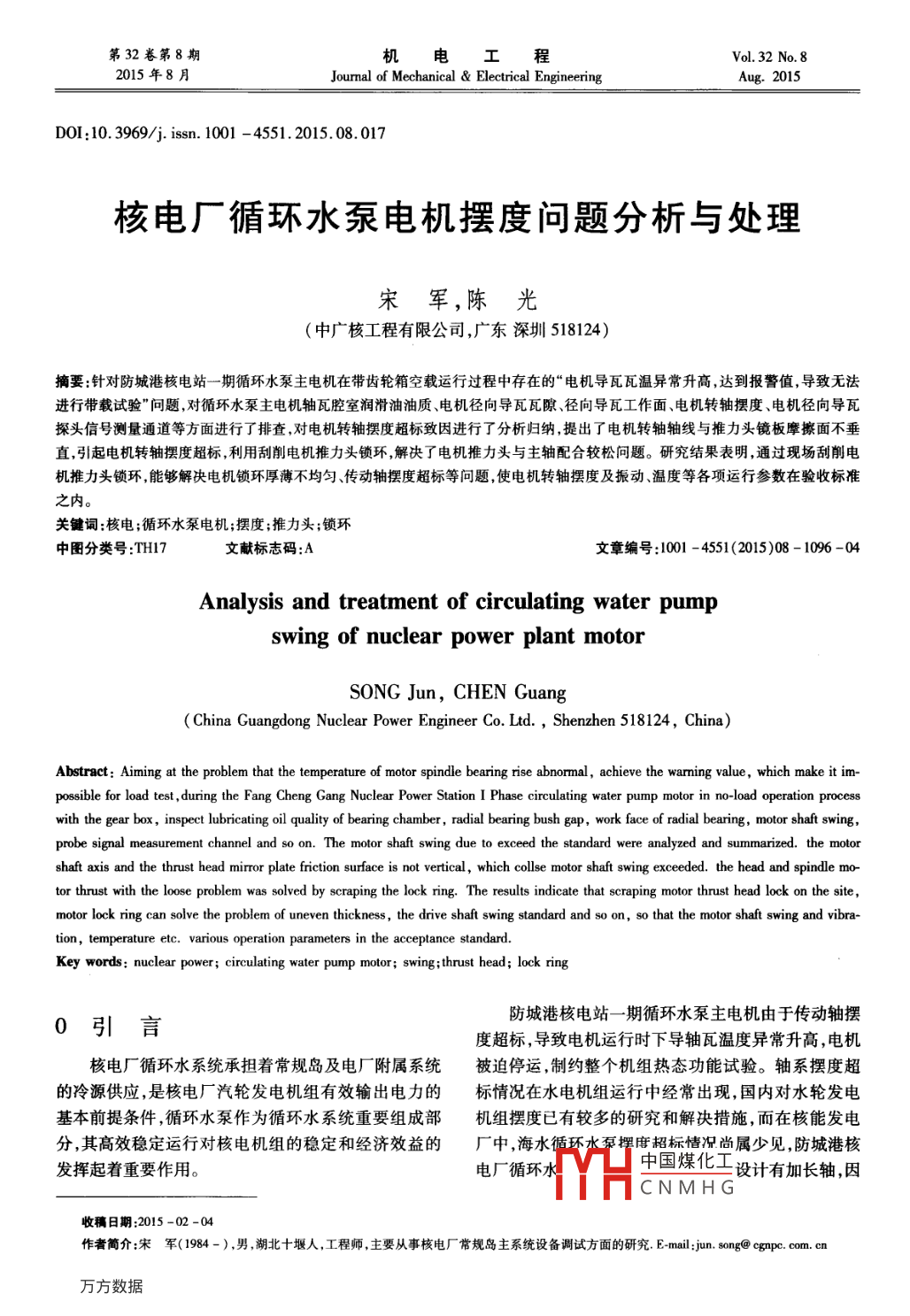 第32卷第8期機(jī)電工程Vol. 32 No.82015年8月Jourmal of Mechanical & Electrical EngineeringAug. 2015DOI: 10.3969/j. issn. 1001 -4551. 2015.08.017核電廠循環(huán)水泵電機(jī)擺度問(wèn)題分析與處理宋軍,陳光(中廣核工程有限公司,廣東深圳518124)摘要:針對(duì)防城港核電站-期循環(huán)水泵 主電機(jī)在帶齒輪箱空載運(yùn)行過(guò)程中存在的“電機(jī)導(dǎo)瓦瓦溫異常升高,達(dá)到報(bào)警值,導(dǎo)致無(wú)法進(jìn)行帶載試驗(yàn)”問(wèn)題,對(duì)循環(huán)水泵主電機(jī)軸瓦腔室潤(rùn)滑油油質(zhì)、電機(jī)徑向?qū)咄呦稄较驅(qū)吖ぷ髅?、電機(jī)轉(zhuǎn)軸擺度、電機(jī)徑向?qū)咛筋^信號(hào)測(cè)量通道等方面進(jìn)行了排查,對(duì)電機(jī)轉(zhuǎn)軸擺度超標(biāo)致因進(jìn)行了分析歸納,提出了電機(jī)轉(zhuǎn)軸軸線與推力頭鏡板摩擦面不垂直,引起電機(jī)轉(zhuǎn)軸擺度超標(biāo),利用刮削電機(jī)推力頭鎖環(huán),解決了電機(jī)推力頭與主軸配合較松問(wèn)題。研究結(jié)果表明,通過(guò)現(xiàn)場(chǎng)刮削電機(jī)推力頭鎖環(huán),能夠解決電機(jī)鎖環(huán)厚薄不均勻、傳動(dòng)軸擺度超標(biāo)等問(wèn)題,使電機(jī)轉(zhuǎn)軸擺度及振動(dòng)、溫度等各項(xiàng)運(yùn)行參數(shù)在驗(yàn)收標(biāo)準(zhǔn)之內(nèi)。關(guān)鍵詞:核電;循環(huán)水泵電機(jī);擺度;推力頭;鎖環(huán)中圖分類號(hào):TH17文獻(xiàn)標(biāo)志碼:A文章編號(hào):1001 -4551(2015)08 - 1096 -04Analysis and treatment of circulating water pumpswing of nuclear power plant motorSONG Jun, CHEN Guang( China Guangdong Nuclear Power Engineer Co. Ltd. , Shenzhen 518124, China)Abstract: Aiming at the problem that the temperature of motor spindle bearing rise abnormal, achieve the warming value, which make it im-possible for load test , during the Fang Cheng Gang Nuclear Power Station I Phase circulating water pump motor in no-load operation processwith the gear box , inspect lubricating oil quality of bearing chamber , radial bearing bush gap, work face of radial bearing, motor shaft swing,probe signal measurement channel and so on. The motor shaft swing due to exceed the standard were analyzed and summarized. the motorshaft axis and the thrust head miror plate friction surface is not vertical, which collse motor shaft swing exceeded. the head and spindle mo-tor thrust with the loose problem was solved by scraping the lock ring. The results indicate that scraping motor thrust head lock on the site,motor lock ring can solve the problem of uneven thickness, the drive shaft swing standard and so on, so that the motor shaft swing and vibra-tion, temperature etc. various operation parameters in the acceptance standard.Key words: nuclear power; circulating water pump motor; swing;thrust head; lock ring防城港核電站一期循環(huán)水泵主電機(jī)由于傳動(dòng)軸擺0引言度超標(biāo),導(dǎo)致電機(jī)運(yùn)行時(shí)下導(dǎo)軸瓦溫度異常升高,電機(jī)核電廠循環(huán)水系統(tǒng)承擔(dān)著常規(guī)島及電廠附屬系統(tǒng)被迫停運(yùn),制約整個(gè)機(jī)組熱態(tài)功能試驗(yàn)。軸系擺度超的冷源供應(yīng),是核電廠汽輪發(fā)電機(jī)組有效輸出電力的標(biāo)情況在水電機(jī)組運(yùn)行中經(jīng)常出現(xiàn),國(guó)內(nèi)對(duì)水輪發(fā)電基本前提條件,循環(huán)水泵作為循環(huán)水系統(tǒng)重要組成部機(jī)組擺度已有較多的研究和解決措施,而在核能發(fā)電分,其高效穩(wěn)定運(yùn)行對(duì)核電機(jī)組的穩(wěn)定和經(jīng)濟(jì)效益的廠中,海水循環(huán);水泵擺度超標(biāo)情況尚屬少見(jiàn),防城港核發(fā)揮起著重要作用。電廠循環(huán)水中國(guó)煤化工:設(shè)計(jì)有加長(zhǎng)軸,因iYHCNM HG收稿日期:2015 -02 -04作者簡(jiǎn)介:宋軍(1984-),男 ,湖北十堰人,工程師,主要從事核電廠常規(guī)島主系統(tǒng)設(shè)備調(diào)試方面的研究. E-mail:jun. song@ cgnpec. com. cn●1098 .第32卷線就會(huì)繞著旋轉(zhuǎn)中心線轉(zhuǎn)動(dòng),其數(shù)值為直徑方向?qū)?yīng)7 C。且在電機(jī)運(yùn)行過(guò)程中,電機(jī)與齒輪箱之間傳動(dòng)軸兩點(diǎn)的單側(cè)擺度值之差[2]。的滾動(dòng)軸承振幅偏大,反復(fù)波動(dòng),最大達(dá)到0.152 mm。造成泵組軸線擺度的原因有多種,大致可分為加電機(jī)停運(yùn)后,本研究從以下幾方面排查軸承溫度工制造、運(yùn)輸保管和安裝質(zhì)量等幾類。在以上因素或異常升高的原因:綜合因素作用下,使得泵組的擺度值過(guò)大超標(biāo)時(shí),電機(jī)(1)從電機(jī)下導(dǎo)軸承油箱內(nèi)取出油樣進(jìn)行化驗(yàn);或泵的主軸便與軸承產(chǎn)生摩擦,泵組在運(yùn)行中就會(huì)由(2)檢查電機(jī)導(dǎo)瓦瓦隙;于擺度影響而產(chǎn)生劇烈振動(dòng),加劇機(jī)械部件的磨損和(3)拆除電機(jī)下導(dǎo)瓦進(jìn)行檢查;疲勞損壞,降低泵組效率,縮短設(shè)備使用壽命,嚴(yán)重時(shí)(4)復(fù)測(cè)電機(jī)轉(zhuǎn)軸擺度;造成軸瓦燒毀3]。因此在制造、安裝、維修過(guò)程中需(5)對(duì)電機(jī).上導(dǎo)軸瓦探頭進(jìn)行重新檢查校驗(yàn),檢采用相關(guān)技術(shù)手段將泵組的擺度值控制在規(guī)范規(guī)定的查信號(hào)通道。合格范圍內(nèi)。經(jīng)過(guò)化驗(yàn),電機(jī)潤(rùn)滑油水分顆粒度、運(yùn)動(dòng)黏度等擺度示意圖如圖3所示。各項(xiàng)指標(biāo)在標(biāo)準(zhǔn)以內(nèi);電機(jī)下