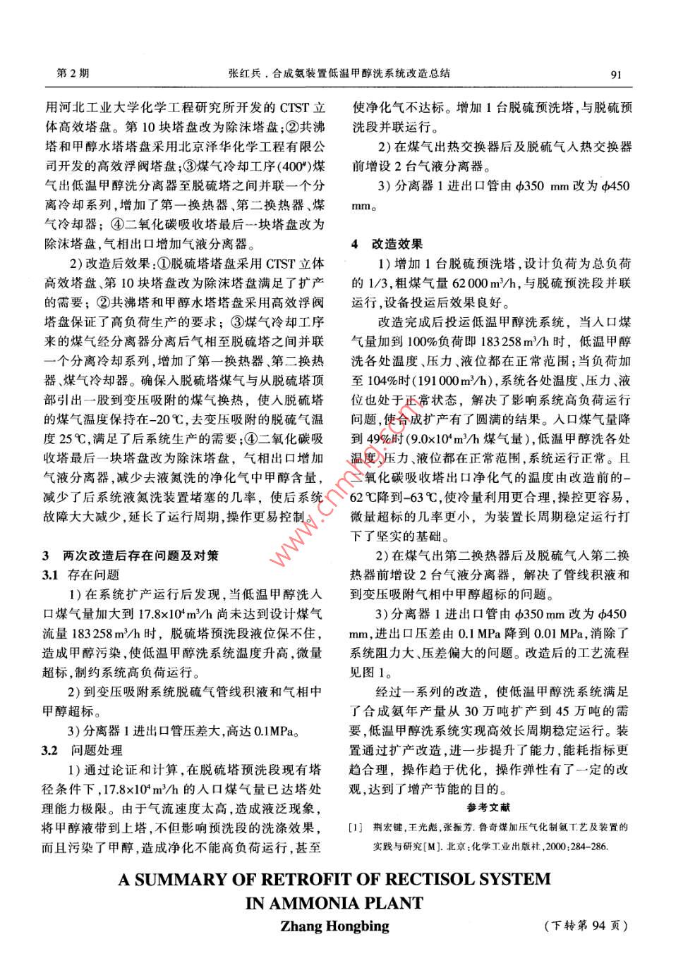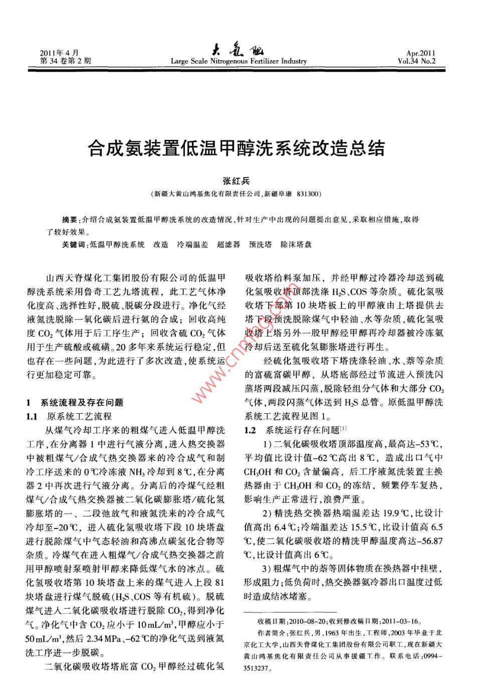 合成氨裝置低溫甲醇洗系統(tǒng)改造總結(jié)