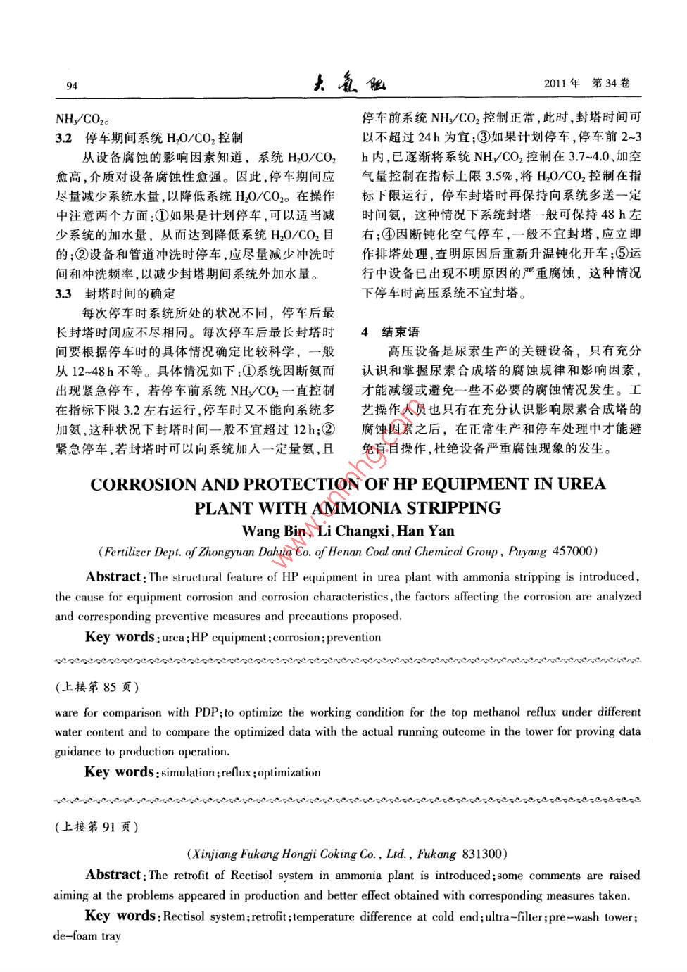2011年4月第34卷第2期Large Scale Nitrogenous Fertilizer IndustryVol 34 No. 2合成氨裝置低溫甲醇洗系統(tǒng)改造總結(jié)張紅兵(新疆大黃山鴻基焦化有限責(zé)任公司,新疆阜康831300)摘要:介紹合成氨裝置低溫甲醇洗系統(tǒng)的改造情況,針對(duì)生產(chǎn)中出現(xiàn)的問(wèn)題提出意見,采取相應(yīng)措施,取得了較好效果。關(guān)鍵詞:低溫甲醇洗系統(tǒng)改造冷端溫差超濾器預(yù)洗塔除沫塔盤山西天脊煤化工集團(tuán)股份有限公司的低溫甲吸收塔給料泵加壓,并經(jīng)甲醇過(guò)冷器冷卻送到硫醇洗系統(tǒng)釆用魯奇工藝九塔流程,此工藝氣體凈化氫吸收塔頂部洗滌HS、COS等雜質(zhì)。硫化氫吸化度高、選擇性好,脫硫、脫碳分段進(jìn)行。凈化氣經(jīng)收塔下部第10塊塔板上的甲醇液由上塔提供去液氮洗脫除一氧化碳后進(jìn)行氨的合成;回收高純塔下段預(yù)洗脫除煤氣中輕油、水等雜質(zhì)硫化氫吸度CO2氣體用于后工序生產(chǎn);回收含硫CO2氣體收塔上塔另外一股甲醇經(jīng)甲醇再冷卻器被冷凍氨用于生產(chǎn)硫酸或硫磺。20多年來(lái)系統(tǒng)運(yùn)行穩(wěn)定,但冷卻后送至硫化氫膨脹塔進(jìn)行再生。也存在一些問(wèn)題,為此進(jìn)行了多次改造,使系統(tǒng)運(yùn)經(jīng)硫化氫吸收塔下塔洗滌輕油、水、萘等雜質(zhì)行更加穩(wěn)定可靠。的富硫富碳甲醇,從塔底部經(jīng)過(guò)節(jié)流進(jìn)入預(yù)洗閃蒸塔兩段減壓閃蒸,脫除輕組分氣體和大部分CO21系統(tǒng)流程及存在問(wèn)題氣體,兩段閃蒸氣體送到HS總管。原低溫甲醇洗11原系統(tǒng)工藝流程系統(tǒng)工藝流程見圖1從煤氣冷卻工序來(lái)的粗煤氣進(jìn)入低溫甲醇洗1.2系統(tǒng)運(yùn)行存在問(wèn)題11工序,在分離器1中進(jìn)行氣液分離,進(jìn)入熱交換器1)二氧化碳吸收塔頂部溫度高,最高達(dá)-53℃中被粗煤氣/合成氣熱交換器來(lái)的冷合成氣和制平均值比設(shè)計(jì)值-62℃高出8℃,造成出口氣中冷工序送來(lái)的0℃冷凍液NH3冷卻到8℃,在分離CHOH和CO2含量偏高,后工序液氮洗裝置主換器2中再次進(jìn)行氣液分離。分離后的冷煤氣經(jīng)粗熱器由于CHOH和CO2的凍結(jié),頻繁停車復(fù)熱,煤氣/合成氣熱交換器被二氧化碳膨脹塔/硫化氫影響生產(chǎn)正常進(jìn)行,浪費(fèi)嚴(yán)重。膨脹塔的一、二段弛放氣和液氮洗來(lái)的冷合成氣2)精洗熱交換器熱端溫差達(dá)199℃,比設(shè)計(jì)冷卻至-20℃,進(jìn)入硫化氫吸收塔下段10塊塔盤值高出64℃;冷端溫差達(dá)155℃,比設(shè)計(jì)值高6.5進(jìn)行脫除煤氣中氣態(tài)輕油和高沸點(diǎn)碳?xì)浠衔锏取?使二氧化碳吸收塔的精洗甲醇溫度高達(dá)-56.87雜質(zhì)。冷煤氣在進(jìn)入粗煤氣/合成氣熱交換器之前℃,比設(shè)計(jì)值高出6℃。用甲醇噴射泵噴射甲醇來(lái)降低煤氣水的冰點(diǎn)。硫3)粗煤氣中的萘等固體物質(zhì)在換熱器中掛壁,化氫吸收塔第10塊塔盤上來(lái)的煤氣進(jìn)入上段81形成阻力;低負(fù)荷時(shí),熱交換器氨冷器出口溫度過(guò)低塊塔盤進(jìn)行煤氣脫硫(HS、COS等有機(jī)硫)。脫硫時(shí)造成結(jié)冰堵塞。煤氣進(jìn)入二氧化碳吸收塔進(jìn)行脫除CO2,得到凈化氣。凈化氣中含CO2應(yīng)小于10mL/m3,甲醇應(yīng)小于收稿日期:2010-08-20;收到修改稿日期:2011-03-1650mLm3,然后234MPa、-62℃的凈化氣送到液氮作者簡(jiǎn)介:張紅兵,男,1963年出生,T程師,2003年畢業(yè)于北洗工序進(jìn)一步脫碳。京化工大學(xué),山西天脊煤化工集團(tuán)股份有限公司職工,現(xiàn)在新疆大黃山鴻基焦化有限責(zé)任公司從事援疆工作。聯(lián)系電話:0994二氧化碳吸收塔塔底富CO2甲醇經(jīng)過(guò)硫化氫3513237大瓦做011年第34卷4)甲醇洗工號(hào)是用甲醇在低溫下吸收變換氣醇循環(huán)的阻力和泵的正常運(yùn)行,在塔盤上積存,影中的CO2、HS等,該系統(tǒng)由于設(shè)備腐蝕、前系統(tǒng)帶響傳質(zhì)效率,導(dǎo)致洗滌效率下降,減低了生產(chǎn)負(fù)入的催化劑粉塵等各種原因,常常產(chǎn)生許多細(xì)小荷。雜質(zhì)(腐蝕產(chǎn)物、硫化鐵、粉塵等),污染了甲醇溶每年大修檢查中,在換熱器抽芯檢查中發(fā)現(xiàn)液,這些雜質(zhì)沉積在換熱器管程、殼程,直接影響非常臟,部分塔內(nèi)降液管有堵塞現(xiàn)象,塔盤沉積了換熱器的傳熱效果和堵塞換熱器通道,增加甲物、再沸器堵塞現(xiàn)象也時(shí)有發(fā)生。二氧化碳吸收塔換熱器換熱器加醇變壓吸附分離器NH3過(guò)冷器預(yù)洗塔合成媒氣水處理氧化碳產(chǎn)品氣熱粗煤氣合燃料成氣換熱器燃料硫化氫塔¢液氨熱粗煤氣粗媒氣冷卻器合成氣過(guò)濾器熱交換器變換氣分離器合成氣離器2硫化氫膨脹二氧化碳膨脹過(guò)濾卩醇再水處理甲醇噴射泵閃蒸塔膨脹塔吸收塔圖1低溫甲醇洗系統(tǒng)改造前后工藝流程圖中虛線部分為改造后新增加的2改造情況時(shí)發(fā)現(xiàn),由于濾網(wǎng)兩面壓差過(guò)大致使濾芯被壓扁212005年以前改造無(wú)法使用。后經(jīng)廠家修復(fù)并將壓差表更換才正常1)2005年以前改造內(nèi)容:①增加3臺(tái)精洗熱投入運(yùn)行交換器,使換熱器由原來(lái)的11臺(tái)變成14臺(tái),滿足對(duì)脫硫甲醇和預(yù)洗甲醇增加超濾后,對(duì)低溫了生產(chǎn)需要;②增加熱交換器和分離器各1臺(tái),在甲醇洗