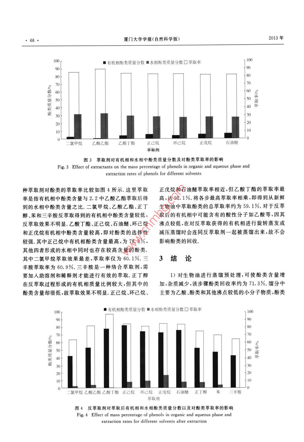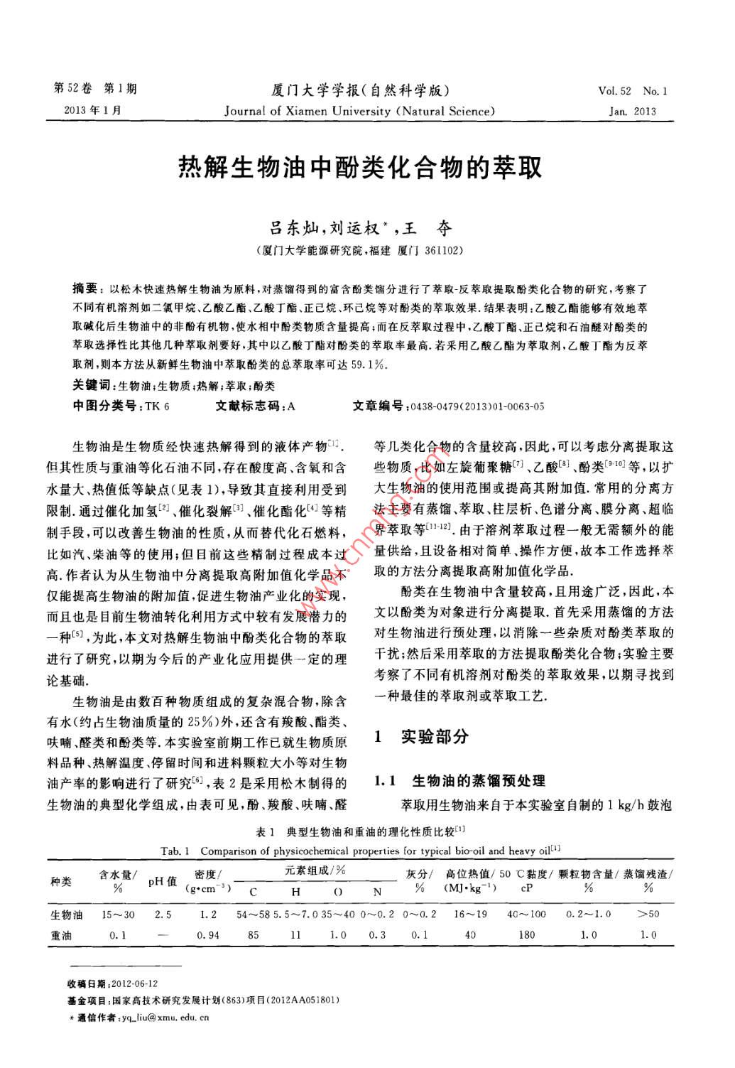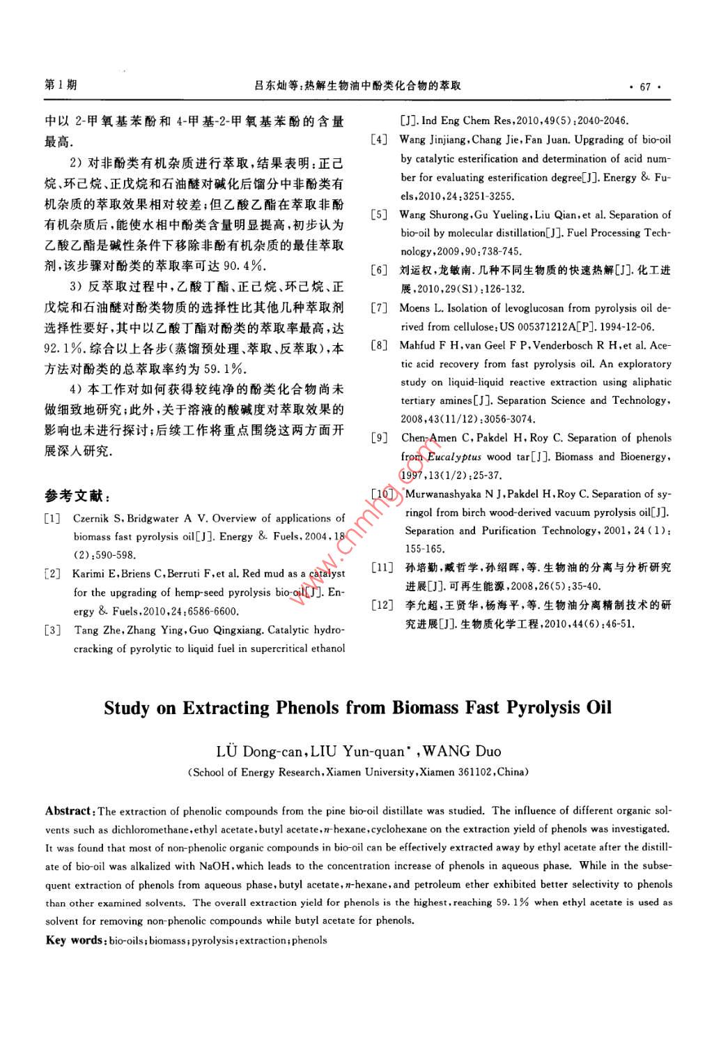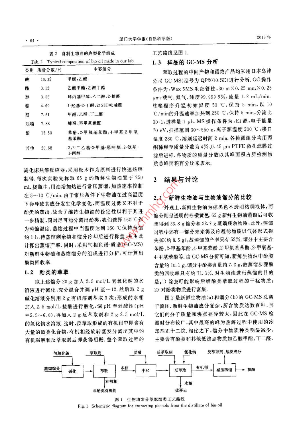 第52卷第1期廈門大學(xué)學(xué)報(bào)(自然科學(xué)版)Vol. 52 No. 12013年1月.Journal of Xiamen University (Natural Science)Jan. 2013熱解生物油中酚類化合物的萃取呂東燦,劉運(yùn)權(quán)”,王奪(廈門大學(xué)能源研究院,福建廈門361102) .摘要:以松木快速熱解生物油為原料,對(duì)蒸餾得到的富含酚類餾分進(jìn)行了萃取-反萃取提取酚類化合物的研究,考察了不同有機(jī)溶劑如二氯甲烷、乙酸乙酯、乙酸丁酯、正已烷、環(huán)已烷等對(duì)酚類的萃取效果.結(jié)果表明:乙酸乙酯能夠有效地萃取堿化后生物油中的非酚有機(jī)物,使水相中酚類物質(zhì)含量提高;而在反萃取過程中,乙酸丁酯、正已烷和石油醚對(duì)酚類的萃取選擇性比其他幾種萃取劑要好,其中以乙酸T酯對(duì)酚類的萃取率最高.若采用乙酸乙酯為萃取劑,乙酸丁酯為反萃取劑,則本方法從新鮮生物油中萃取酚類的總萃取率可達(dá)59.1%。關(guān)鍵詞:生物油;生物質(zhì);熱解;萃取;酚類中圖分類號(hào):TK6文獻(xiàn)標(biāo)志碼:A文章編號(hào):0438-0479(2013)01-0063-05生物油是生物質(zhì)經(jīng)快速熱解得到的液體產(chǎn)物,等幾類化合物的含量較高,因此,可以考慮分離提取這但其性質(zhì)與重油等化石油不同,存在酸度高、含氧和含些物質(zhì),比如左旋葡聚糖[]、乙酸[8]、酚類[910]等,以擴(kuò)水量大、熱值低等缺點(diǎn)(見表1),導(dǎo)致其直接利用受到大生 物油的使用范圍或提高其附加值.常用的分離方限制.通過催化加氫2、催化裂解[3]、催化酯化4等精法主要有蒸餾、萃取、柱層析、色譜分離、膜分離、超臨制手段,可以改善生物油的性質(zhì),從而替代化石燃料,界萃取等11121.由于溶劑萃取過程一般無需額外的能比如汽、柴油等的使用;但目前這些精制過程成本過量供給,且設(shè)備相對(duì)簡(jiǎn)單、操作方便,故本工作選擇萃高.作者認(rèn)為從生物油中分離提取高附加值化學(xué)品不取的方法分離提取高附加值化學(xué)品.僅能提高生物油的附加值,促進(jìn)生物油產(chǎn)業(yè)化的實(shí)現(xiàn),酚類在生物油中含量較高,且用途廣泛,因此,本而且也是目前生物油轉(zhuǎn)化利用方式中較有發(fā)展?jié)摿Φ奈囊苑宇悶閷?duì)象進(jìn)行分離提取.首先采用蒸餾的方法--.種[5],為此,本文對(duì)熱解生物油中酚類化合物的萃取對(duì)生物油進(jìn)行預(yù)處理,以消除一些雜質(zhì)對(duì)酚類萃取的進(jìn)行了研究,以期為今后的產(chǎn)業(yè)化應(yīng)用提供-定的理千擾;然后采用萃取的方法提取酚類化合物;實(shí)驗(yàn)主要考察了不同有機(jī)溶劑對(duì)酚類的萃取效果,以期尋找到論基礎(chǔ).生物油是由數(shù)百種物質(zhì)組成的復(fù)雜混合物,除含一種最佳的萃取劑或萃取工藝.有水(約占生物油質(zhì)量的25%)外,還含有羧酸、酯類、呋喃、醛類和酚類等.本實(shí)驗(yàn)室前期工作已就生物質(zhì)原1實(shí)驗(yàn)部分料品種、熱解溫度、停留時(shí)間和進(jìn)料顆粒大小等對(duì)生物油產(chǎn)率的影響進(jìn)行了研究6],表2是采用松木制得的1.1生物油的蒸餾預(yù)處理生物油的典型化學(xué)組成,由表可見,酚、羧酸、呋喃、醛萃取用生物油來自于本實(shí)驗(yàn)室自制的1 kg/h鼓泡表1典型生物油和重油的理化性質(zhì)比較[°]Tab. 1 Comparison of physicochemical properties for typical bio-oil and heavy oil含水量/密度!元素組成/%灰分/高位熱值/ 50 C黏度/顆粒物含量/蒸餾殘?jiān)?種類pH值(g.cm-HN(M].kg~')生物油15~30 2.5 1.2 54~585.5~7.035~40 0~0.2 0~0.2 16~19 40~100 0.2~1.0 > 50重油0.10.9481.0 0.3101801.0收稿日期:2012-06-12基金項(xiàng)目:國(guó)家高技術(shù)研究發(fā)展計(jì)劃(863)項(xiàng)目(2012AA051801)*通信作者:9q liu@ xmu. edu. cn64●廈門大學(xué)學(xué)報(bào)(自然科學(xué)版)2013年表2自制生物油的典型化學(xué)組成工藝路線見圖1.Tab.2 Typical composition of bio-oil made in our lab1.3 樣品的GC-MS分析類別質(zhì)量分?jǐn)?shù)/%主要組分萃取過程的中間產(chǎn)物和最終產(chǎn)品均采用日本島津酸10. 32甲酸,乙酸公司GC-MS(型號(hào)為QP2010 SE)進(jìn)行分析. GC操作脂3.12乙酸甲酯,乙酸丁酯條件為: Wax-5MS毛細(xì)管柱,30 mX0.25 mmX0. 253. 56環(huán)丙基甲醇,乙二醇.2-糠醛μm;載氣:氦氣,純度99.999 9%,流量1.2 mL/min.酮4.691-羥基-2-丁酮,2(5H)呋喃酮柱箱程序升溫初始溫度50 C,保持5 min,以10醛7.61甲醛,乙醛,丁二醛C /min的升溫速率加熱到250 C,保持5 min,分流比呋喃7.88楝醛,羥甲基糠醛30:1,進(jìn)樣量1 μL. MS操作條件為:EI源,電子能量酚15. 50苯酚,2-甲氧基苯酚,4-甲基-2-甲氧70eV ,掃描范圍30~550 u,離子源溫度200 C,接口基苯酚溫度280C,溶劑延遲時(shí)間2min.各檢測(cè)組分均用丙其他20. 682,2-二乙基-3-甲基惡唑烷,2-氨基-酮稀釋至質(zhì)量分?jǐn)?shù)為4% .0.45 μum PTFE微孔濾膜過1-丙醇濾后進(jìn)樣.各物質(zhì)的質(zhì)量分?jǐn)?shù)以其峰面積占所檢測(cè)物質(zhì)總峰面積百分比來表示.流化床熱解反應(yīng)器,采用松木作為原料進(jìn)行快速熱解制得.每次實(shí)驗(yàn)先稱取65 g的新鮮生物油置于2502結(jié)果與討論mL燒瓶中,用油浴加熱進(jìn)行常壓蒸餾,加熱速率控制在5~10C/min.由于常壓條件下生物油在過高溫度2.1 新鮮生物油與生物油餾分的比較下會(huì)導(dǎo)致其成分發(fā)生化學(xué)變化,而溫度過低又不利于外觀上,新鮮生物油為棕黑色不透明粘稠
