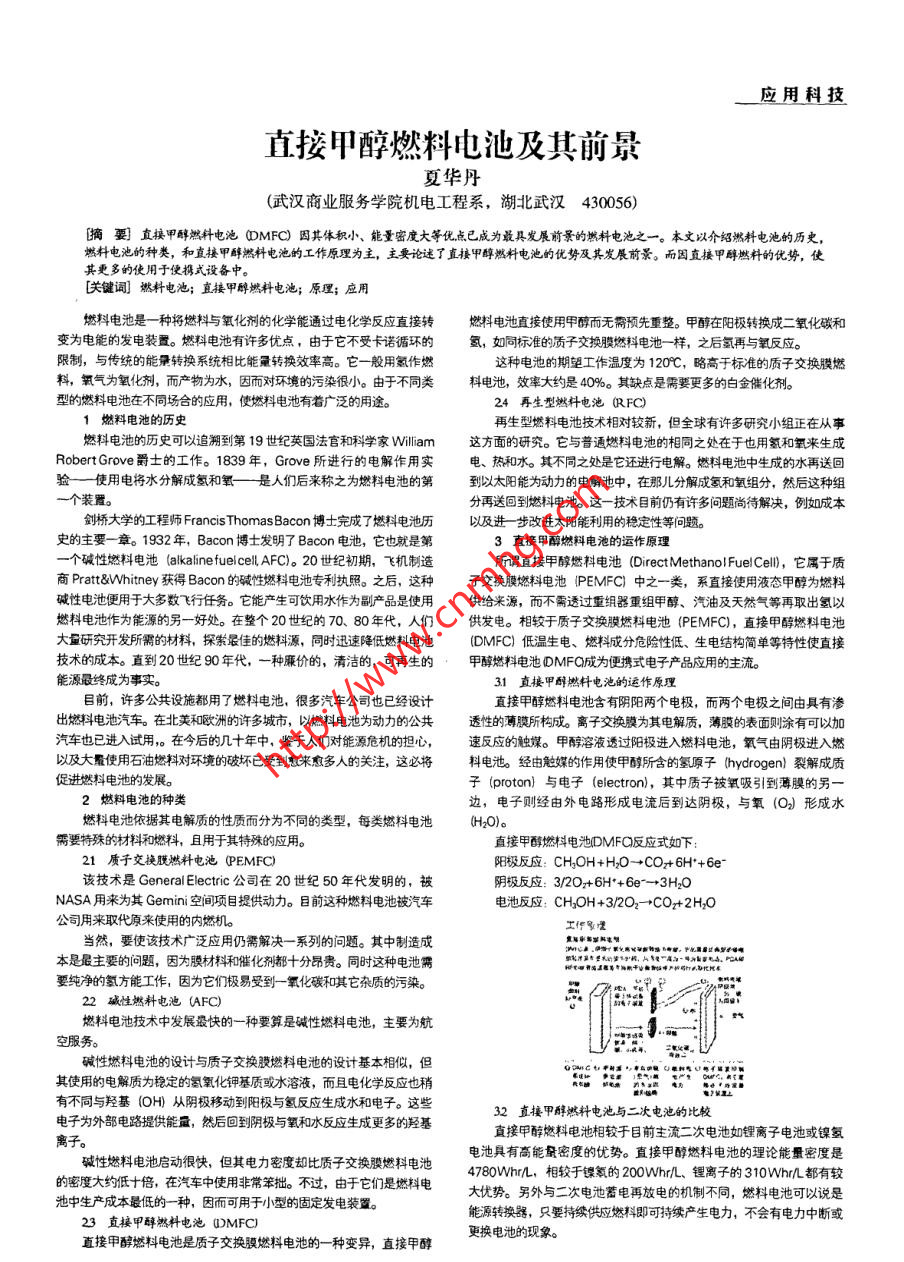 應(yīng)用科技直接甲醇燃料電池及其前景夏華丹(武漢商業(yè)服務(wù)學(xué)院機(jī)電工程系,湖北武漢430056)[摘要]直接甲醇燃料電池0MFC)因其體積小、能量密度大等優(yōu)點(diǎn)已成為最具發(fā)展前景的燃料電池之一。本文以介紹燃料電池的歷史,燃料電池的種類,和直接甲醇燃料電池的工作原理為主,主要論述了直接甲醇燃料電池的優(yōu)勢(shì)及其發(fā)展前景。而因直接甲醇燃料的優(yōu)勢(shì),使其更多的使用于便攜式設(shè)備中。[關(guān)鍵詞]燃料電池;直接甲醇燃料電池;原理;應(yīng)用燃料電池是一種將燃料與 氧化劑的化學(xué)能通過(guò)電化學(xué)反應(yīng)直接轉(zhuǎn)燃料電池直接使用甲醇而無(wú)需預(yù)先重整。甲醇在陽(yáng)極轉(zhuǎn)換成二氧化碳和變?yōu)殡娔艿陌l(fā)電裝置。燃料電池有許多優(yōu)點(diǎn),由于它不受卡諾循環(huán)的氫,如同標(biāo)準(zhǔn)的質(zhì)子交換膜燃料電池-樣,之后氫再與氧反應(yīng)。限制,與傳統(tǒng)的能量轉(zhuǎn)換系統(tǒng)相比能量轉(zhuǎn)換效率高。它一般用氯作燃這種電池的期望工作溫度為120C,略高于標(biāo)準(zhǔn)的質(zhì)子交換膜燃料,氧氣為氧化劑,而產(chǎn)物為水,因而對(duì)環(huán)境的污染很小。由于不同類料電池,效率大約是40%。其缺點(diǎn)是需要更多的白金催化劑。型的燃料電池在不同場(chǎng)合的應(yīng)用,使燃料電池有著廣泛的用途。24再生型燃料電池(RFC)燃料電池的歷史再生型燃料電池技術(shù)相對(duì)較新,但全球有許多研究小組正在從事燃料電池的歷史可以追溯到第19世紀(jì)英國(guó)法官和科學(xué)家William這方面的研究。它與普通燃料電池的相同之處在于也用氫和氧來(lái)生成RobertGrove 爵士的工作。1839 年,Grove所進(jìn)行的電解作用實(shí)電、熱和水。其不同之處是它還進(jìn)行電解。燃料電池中生成的水再送回驗(yàn)--使用電將水分解成氫和氧一 是人們后來(lái)稱之為燃料電池的第到以太陽(yáng)能為動(dòng)力的電解池中,在那兒分解成氫和氧組分,然后這種組-個(gè)裝置。分再送回到燃料電池。這-技術(shù)目前仍有許多問(wèn)題尚待解決, 例如成本劍橋大學(xué)的工程師Francis Thomas Bacon博士完成了燃料電池歷以及進(jìn)步改進(jìn)太陽(yáng)能利用的穩(wěn)定性等問(wèn)題。史的主要-章。1932年,Bacon 博士發(fā)明了Bacon電池,它也就是第3直接甲醇燃料電池的運(yùn)怍原理一個(gè)堿性燃料電池 (alkaline fuelcell AFC)。20世紀(jì)初期,飛機(jī)制造所謂直接甲醇燃料電池(DirectMethanolFuelCell, 它屬于質(zhì)商Pratt&Whitney獲得Bacon的堿性燃料電池專利執(zhí)照。之后,這種子交換膜燃料電池(PEMFCI 中之一類,系直接使用液態(tài)甲醇為燃料堿性電池便用于大多數(shù)飛行任務(wù)。它能產(chǎn)生可飲用水作為副產(chǎn)品是使用供給來(lái)源,而不需透過(guò)重組器重組甲醇、汽油及天然氣等再取出氫以燃料電池作為能源的另一好處。在整個(gè)20世紀(jì)的70、80年代,人們供發(fā)電。相較于質(zhì)子交換膜燃料電池(PEMFC),直接甲醇燃料電池大量研究開發(fā)所需的材料,探紫最佳的燃料源,同時(shí)迅速降低燃料電池(DMFC)低溫生電、燃料成分危險(xiǎn)性低、生電結(jié)構(gòu)簡(jiǎn)單等特性使直接技術(shù)的成本。直到20世紀(jì)90年代,一種廉價(jià)的,清潔的,可再生的甲醇燃料電池DMFQ成為便攜式電子產(chǎn)品應(yīng)用的主流。能源最終成為事實(shí)。31 直接甲 醇燃料電池的運(yùn)作原理目前,許多公共設(shè)施都用了燃料電池,很多汽車公司也已經(jīng)設(shè)計(jì)直接甲醇燃料電池含有陰陽(yáng)兩個(gè)電極,而兩個(gè)電極之間由具有滲出燃料電池汽車。在北美和歐洲的許多城市,以燃料電池為動(dòng)力的公共透性的薄膜所構(gòu)成。離子交換膜為其電解質(zhì),薄膜的表面則涂有可以加汽車也已進(jìn)入試用。在今后的幾十年中,鑒于人們對(duì)能源危機(jī)的擔(dān)心,速反應(yīng)的觸媒。甲醇溶液透過(guò)陽(yáng)極進(jìn)入燃料電池,氧氣由陰極進(jìn)入燃以及大量使用石油燃料對(duì)環(huán)境的破壞已受到愈來(lái)愈多人的關(guān)注,這必將料電池。經(jīng)由觸媒的作用使甲醇所含的氫原子(hydrogen) 裂解成質(zhì)促進(jìn)燃料電池的發(fā)展。子(proton) 與電子(electron), 其中質(zhì)子被氧吸引到薄膜的另-2燃料電池的種類邊,電子則經(jīng)由外電路形成電流后到達(dá)陰極,與氧(O2) 形成水燃料電池依據(jù)其電解質(zhì)的性質(zhì)而分為不同的類型,每類燃料電池(H20)。需要特殊的材料和燃料,且用于其特殊的應(yīng)用。直接甲醇燃料電池DMFQ反應(yīng)式如下:21質(zhì)子 交換膜燃料電池(PEMFC)陽(yáng)極反應(yīng): CH.OH+H.0→CO+ 6H+6e-該技術(shù)是General Electric公司在20世紀(jì)50年代發(fā)明的,被陰極反應(yīng): 3/20+ 6H'+ 6e~→3H2ONASA用來(lái)為其Gemini空間項(xiàng)目提供動(dòng)力。目前這種燃料電池被汽車電池反應(yīng): CH2OH+3/202-→CO2+2H2O公司用來(lái)取代原來(lái)使用的內(nèi)燃機(jī)。工作多理當(dāng)然,要使該技術(shù)廣泛應(yīng)用仍需解決一系列的問(wèn)題。 其中制造成本是最主要的問(wèn)題,因?yàn)槟げ牧虾痛呋瘎┒际职嘿F。同時(shí)這種電池需要純凈的氫方能工作,因?yàn)樗鼈儤O易受到一氧化碳和其它雜質(