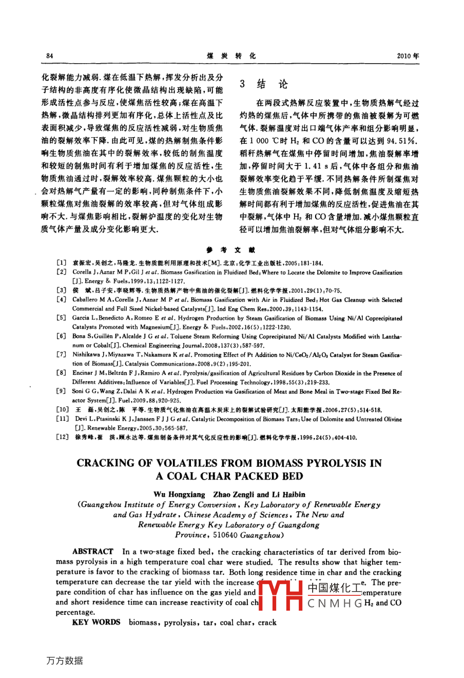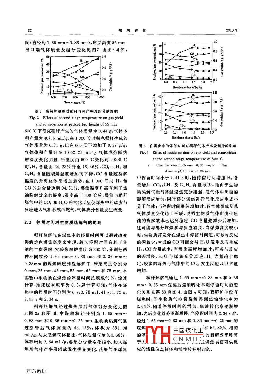 第33卷第2期煤炭轉(zhuǎn)化Vol 33 No. 22010年4月COAL CONVERSION生物質(zhì)熱解氣在高溫煤焦層中裂解特性研究武宏香1)趙增立3李海濱摘要在小型兩段式固定床反應(yīng)器中,對(duì)生物質(zhì)熱解氣在高溫煤焦層中的裂解反應(yīng)特性進(jìn)行了研究,重點(diǎn)考察了兩段式熱解中裂解溫度、停留時(shí)間及煤焦特性對(duì)焦油裂解率、氣體產(chǎn)率及成分的影響,結(jié)果表明,增加氣體停留時(shí)間及裂解溫度,都有利于促進(jìn)生物質(zhì)氣中焦油裂解和氣體產(chǎn)率提高.裂解溫度對(duì)氣體產(chǎn)率、組分及焦油裂解率影響更明顯,高溫促進(jìn)H2和CO的生威,1000℃時(shí)H2和CO的含量達(dá)到94.51%.當(dāng)生物質(zhì)熱解氣在煤焦中停留時(shí)間達(dá)到1.41s后,氣體中各組分變化趨于緩幔;不同熱解條件所制得的煤焦對(duì)生物質(zhì)氣中焦油裂解效果不同,較低制焦溫度和較短熱解時(shí)間都有利于增加煤焦的反應(yīng)活性,促進(jìn)焦油分解為可燃?xì)怏w關(guān)鍵詞生物質(zhì),熱解,焦油,煤焦,裂解中圖分類號(hào)TQ530.2,S2160引言源利用效率煤焦表面疏松多孔,含有一定量的堿/堿土金屬,具有一定的催化活性,生物質(zhì)煤氣經(jīng)過灼生物質(zhì)氣化技術(shù)是潔凈高效利用生物質(zhì)資源的熱的煤焦層時(shí),不僅可以催化裂解生物質(zhì)焦油煤焦主要途徑之一,但在利用過程中不可避免會(huì)產(chǎn)生焦也可與氣體中的水蒸氣和CO2等發(fā)生氣化反應(yīng)轉(zhuǎn)油,引起管道堵塞設(shè)備腐蝕等問題,降低了生物質(zhì)的化為可燃?xì)?本實(shí)驗(yàn)先在兩段式熱解爐中對(duì)生物質(zhì)利用效率.如何減少焦油成為解決生物質(zhì)氣化技術(shù)熱解氣在煤焦層中的裂解進(jìn)行了初步探索,從氣體的關(guān)鍵.焦油的處理方法主要有物理方法、熱裂解和成分、產(chǎn)量及焦油裂解率等方面考察了煤焦顆粒、裂催化裂解方式.物理方法主要有水洗、過濾及靜電捕解溫度、停留時(shí)間及制焦條件對(duì)裂解效率的影響集等,存在凈化系統(tǒng)成本和運(yùn)行費(fèi)用較高及二次處理的問題.催化裂解主要用礦物質(zhì)類堿金屬類和1實(shí)驗(yàn)部分鎳基催化劑,焦油去除率較高,然而都存在失活及回實(shí)驗(yàn)選取稻稈與霍林河褐煤作為原料,其工業(yè)收再生困難的問題.28熱裂解是減少焦油最簡(jiǎn)單的分析和元素分析特性見第81頁表1.元素分析采用方法,在高溫下焦油受熱可裂解為小分子氣體 Soni Elementar元素分析儀(型號(hào) Vario EL chnos)進(jìn)等在兩段式氣化爐中用石英砂對(duì)動(dòng)物肉骨的氣化行測(cè)定,工業(yè)分析和發(fā)熱量按ASTM有關(guān)行業(yè)標(biāo)準(zhǔn)氣進(jìn)行熱裂解研究,指出熱裂解有利于氣體質(zhì)量及測(cè)定H2含量增加,增加裂解溫度與砂子床層高度會(huì)減少氣體中焦油產(chǎn)率.王磊等把生物質(zhì)氣化氣通人到1.1煤焦的制備及表面結(jié)構(gòu)分析木炭床的實(shí)驗(yàn)表明,增加裂解爐溫度可提高焦油裂把不同粒徑的煤顆粒(10目~20目、20目~解率增加氣體中H2和CO的含量Dev等在鼓40目、40目~60目及80目以下)放人已升溫至泡流化床固定床實(shí)驗(yàn)中指出第二段裂解爐溫度為800℃的石英管中,在N2氣氛中停留1h后取出,900℃時(shí),填充石英砂可使生物質(zhì)焦油中的多環(huán)芳N2保護(hù)冷卻至室溫.同樣,把10目~20目的煤分烴減少48%石英砂中加入17%的橄欖石和未煅燒別在700℃和900℃停留1h制焦,或在800℃分白云石后,可使多環(huán)芳烴減少71%和90%生物質(zhì)別停留0.5h和1.5h制焦.所制煤焦用“熱解溫氣化與煤氣化聯(lián)用的兩段式氣化方式能有效提高能度-制焦時(shí)間-煤焦粒徑”的方式表示,實(shí)驗(yàn)利用N2國(guó)家高技術(shù)研究發(fā)展計(jì)劃(863)項(xiàng)目(2007AA052324)TH中國(guó)煤化工CNMHG1)碩土生;2)研究員,中國(guó)科學(xué)院廣州能源研究所,中國(guó)科學(xué)院可再生能源與a=原和可再生能源研究開發(fā)與應(yīng)用重點(diǎn)實(shí)驗(yàn)室,510640廣州收稿日期:20091116;修回日期:20091218第2期武宏香等生物質(zhì)熱解氣在高溫煤焦層中裂解特性研究吸脫附方法測(cè)得煤焦比表面積孔容積及平均孔徑,微孔較發(fā)達(dá).熱解溫度高時(shí)煤焦的比表面積減小,微結(jié)果見表2由表2可知,煤焦表面疏松多孔,其中孔及大中孔體積都減小,高溫及延長(zhǎng)停留時(shí)間有利衰1實(shí)驗(yàn)樣品工業(yè)分析和元囊分析Table 1 Proximate analysis and ultimate analysis of samplesProximate analysis/%Ultimate analysis/%·HHV/Rice straw(RS) 5.416.3215.3840.045.3737,850.300.1215.461638.9829.34310.450.93w Percent of weight表2不同熱解條件下煤焦的表面結(jié)構(gòu)Table 2 Structural characteristics of different coal charsTotal surface area/ Micropore area/ External surface area1)(×10-2cm3·g-1)sie/nm700℃-1h-1.65mm~0.83mm68.15123.8744.27800℃1h1.65mm~0.83mm150.13122.1927.949.622.5633.900℃-1h1.65mm~0.83mm132.116.334.207800℃-0.5h1.65mm~0.83mm168.28128.455.800℃-1.5h1.65mm~0.83138.36106.993].36800℃-1h0.83mm~0.36mm135.18102.4817.800℃-1h0.36mm~0.25mm177.5645.962.500800℃-1h<0.18m15972119.8011于煤焦結(jié)構(gòu)的有序化,而引起比表面積減小,反N2流量為120mL/min,把2g左右的稻稈迅速推應(yīng)活性降低.相同熱解條件下粒徑不同的煤焦比表熱解爐中,停留12min,同時(shí)用排水法收集全部氣面積不同在0.83mm~0.36m