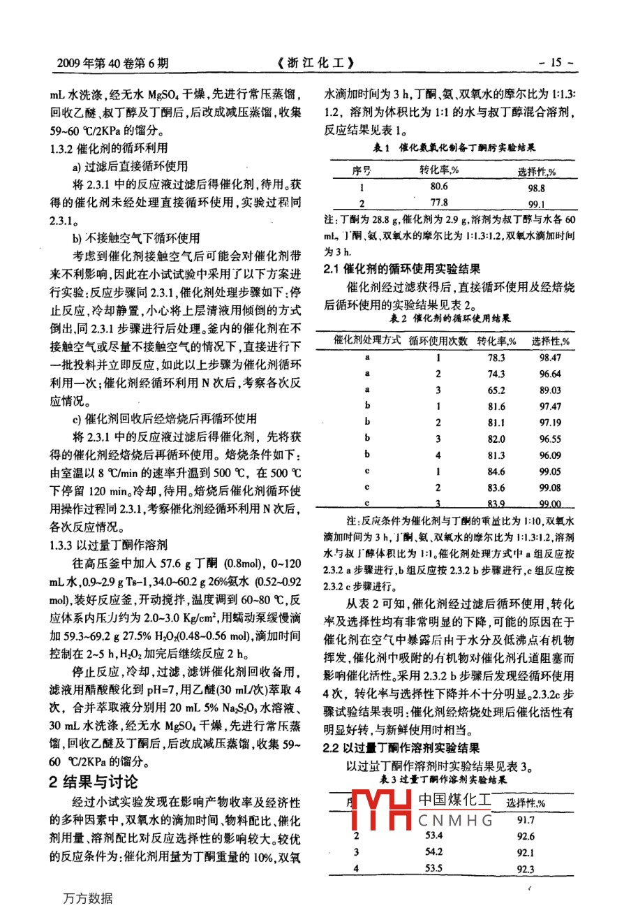 ZHEJIANG CHEMICAL INDUSTRYvol.40No.6(200)文章編號(hào):1064184(200001403催化氨氧化制備丁酮肟催化劑循環(huán)利用及溶劑選擇的探討張堅(jiān)國(guó),姜雨土(浙江衢化集團(tuán)錦綸廠淅江衢州324004)摘要:以鈦硅分子篩(TS-1作催化劑,丁酮為原料,經(jīng)催化氨氧化一步合成了丁酮肟。小試實(shí)驗(yàn)考察了形響反應(yīng)結(jié)果的因素,特別是對(duì)催化劑循環(huán)利用及溶劑選擇問(wèn)題進(jìn)行了探討。試驗(yàn)表明:在不接觸空氣或盡量不接觸空氣的情況下,催化劑循環(huán)利用4次,丁酮肟轉(zhuǎn)化率及選擇性未有明顯下降;催化劑經(jīng)焙燒后再循環(huán)使用,經(jīng)試驗(yàn)3次,來(lái)發(fā)現(xiàn)明顯失活??紤]到工業(yè)化應(yīng)用的優(yōu)勢(shì),試驗(yàn)以過(guò)量丁酮為溶劑代替叔丁醇,結(jié)果喪明與叔丁醇作溶劑時(shí)相比,丁酮肟選擇性有較明顯降低。關(guān)鍵詞:丁酮肟;肟化反應(yīng);催化氨氧化;循環(huán)利用丁酮肟又稱甲乙酮肟,為無(wú)色或淡黃色油狀透1實(shí)驗(yàn)部分明液體,是一種重要的有機(jī)合成中間體和高活性試11試劑劑,用途廣泛。丁酮肟分子結(jié)構(gòu)中含有十分活潑丁酮分析純,99%;T-1,工業(yè)品(中國(guó)石油化的-C=NOH基團(tuán),其能與鹵化物醇等物質(zhì)反應(yīng)生工集團(tuán);過(guò)氧化氫分析純275%;氨水,分析純,2成一系具有很高附加值的化合物是醫(yī)藥、農(nóng)藥、6%;叔丁醇分析純9%酸分析純,98%;乙醚染料及有機(jī)硅偶聯(lián)劑的原料丁酮肟作為新型除氧分析純,9%劑廣泛用于鍋爐水的除氧鈍化、停爐保護(hù)劑,作為12儀器防結(jié)皮劑廣泛應(yīng)用于涂料、油漆、油墨中,可作為有WHF型025L高壓反應(yīng)釜(威???;Yz1515機(jī)合成中間體如硅橡膠固化劑的原料也可以用于型蘭格蠕動(dòng)保定蘭格);GC-14B型氣相色譜分析分析試劑鑒定鎳、鈷等。儀,催化氨氧化法是近年來(lái)開(kāi)發(fā)的丁酮肟生產(chǎn)13實(shí)驗(yàn)步驟工藝路線具有原料易得、條件溫和環(huán)境友好產(chǎn)1.31以叔丁醇水混合體系作溶劑物選擇性高等優(yōu)點(diǎn),在工業(yè)化生產(chǎn)中與傳統(tǒng)路線相往高壓釜中加入288g丁酮(04mo,0-60mL比具有較大的優(yōu)勢(shì)。叔丁醇,60-120m水,09-28gTs-1,340-60.2g小試實(shí)驗(yàn)內(nèi)容主要以鈦硅分子篩(TS-1作催化26%氨水(052-092mo,裝好反應(yīng)釜,開(kāi)動(dòng)攪拌溫劑,以丁酮為原料經(jīng)催化氫氧化合成丁酮肟本度調(diào)到6:0℃,反應(yīng)休系內(nèi)壓力約為2030K從工業(yè)化生產(chǎn)中節(jié)約成本簡(jiǎn)化工藝的角度,對(duì)催cm,用蠕動(dòng)泵緩慢滴加593-692g275%H04048化劑的循環(huán)利用和以過(guò)量丁酮代替叔丁醇作溶劑0葉問(wèn)在進(jìn)行了實(shí)驗(yàn)考察。反應(yīng)中國(guó)煤化工H0加完后繼續(xù)CNMH(崔化劑回收備用,修回日期:2008-1205作者簡(jiǎn)介:張堅(jiān)國(guó)(19657-)男,學(xué)士,多年從事化工生產(chǎn)管理濾液用酸酸化到pH=7,用乙醚(30mL/次)米取4工作次,合并米取液分別用20mL5%NaSO3水溶液、302009年第40卷第6期《浙江化工15mL水洗滌經(jīng)無(wú)水MgSO4干燥,先進(jìn)行常壓蒸餾,水滴加時(shí)間為3h,丁酮氨雙氧水的摩爾比為l13:回收乙醚叔丁醇及丁酮后,后改成減壓蒸餾收集1.2,溶劑為體積比為11的水與叔丁醇混合溶劑59~60℃/2KPa的餾分反應(yīng)結(jié)果見(jiàn)表1。132催化劑的循環(huán)利用表1催化氨氧化制備丁酮肟實(shí)驗(yàn)結(jié)果a)過(guò)濾后直接循環(huán)使用轉(zhuǎn)化率,%選擇怍,%將231中的反應(yīng)液過(guò)濾后得催化劑,待用。獲得的催化劑未經(jīng)處理直接循環(huán)使用,實(shí)驗(yàn)過(guò)程同2注:丁酮為288g催化劑為29g,溶劑為叔丁醇與水各60b)不接觸空氣下循環(huán)使用ml丁酮氨雙氧水的摩爾比為1:13:12,雙氧水滴加時(shí)間考慮到催化劑接觸空氣后可能會(huì)對(duì)催化劑帶為3h來(lái)不利影響因此在小試試驗(yàn)中采用了以下方案進(jìn)21催化劑的循環(huán)使用實(shí)驗(yàn)結(jié)果行實(shí)驗(yàn):反應(yīng)步驟同2.3.1,催化劑處理步驟如下:停催化劑經(jīng)過(guò)濾獲得后,直接循環(huán)使用及經(jīng)焙燒止反應(yīng)冷卻靜置小心將上層清液用傾倒的方式后循環(huán)使用的實(shí)驗(yàn)結(jié)果見(jiàn)去/表2催化劑的循倒出,同23.1步驟進(jìn)行后處理。釜內(nèi)的催化劑在不接觸空氣或盡量不接觸空氣的情況下,直接進(jìn)行下催化劑處理方式循環(huán)使用次數(shù)轉(zhuǎn)化率%選擇性%批投料并立即反應(yīng),如此以上步驟為催化劑循環(huán)984774.39664利用一次;催化劑經(jīng)循環(huán)利用N次后,考察各次反65.28903應(yīng)情況。8169747e)催化劑回收后經(jīng)焙燒后再循環(huán)使用9719將231中的反應(yīng)液過(guò)濾后得催化劑,先將獲96.55得的催化劑經(jīng)焙燒后再循環(huán)使用。焙燒條件如下bcc8139609由室溫以8℃/min的速率升溫到500℃,在500℃9905下停留120min。冷卻,待用。焙燒后催化劑循環(huán)使83.69908用操作過(guò)程同231,考察催化劑經(jīng)循環(huán)利用N次后,9900各次反應(yīng)情況注:反應(yīng)條件為催化劑與丁酮的重量比為1:0,雙氧水133以過(guò)量丁酮作溶劑滴加時(shí)間為3h,J酬氨、雙氧水的摩爾比為1:13:1.2,溶劑水與叔J醇體積比為1:1。催化劑處理方式中a組反應(yīng)按往高壓釜中加入576g丁酮0