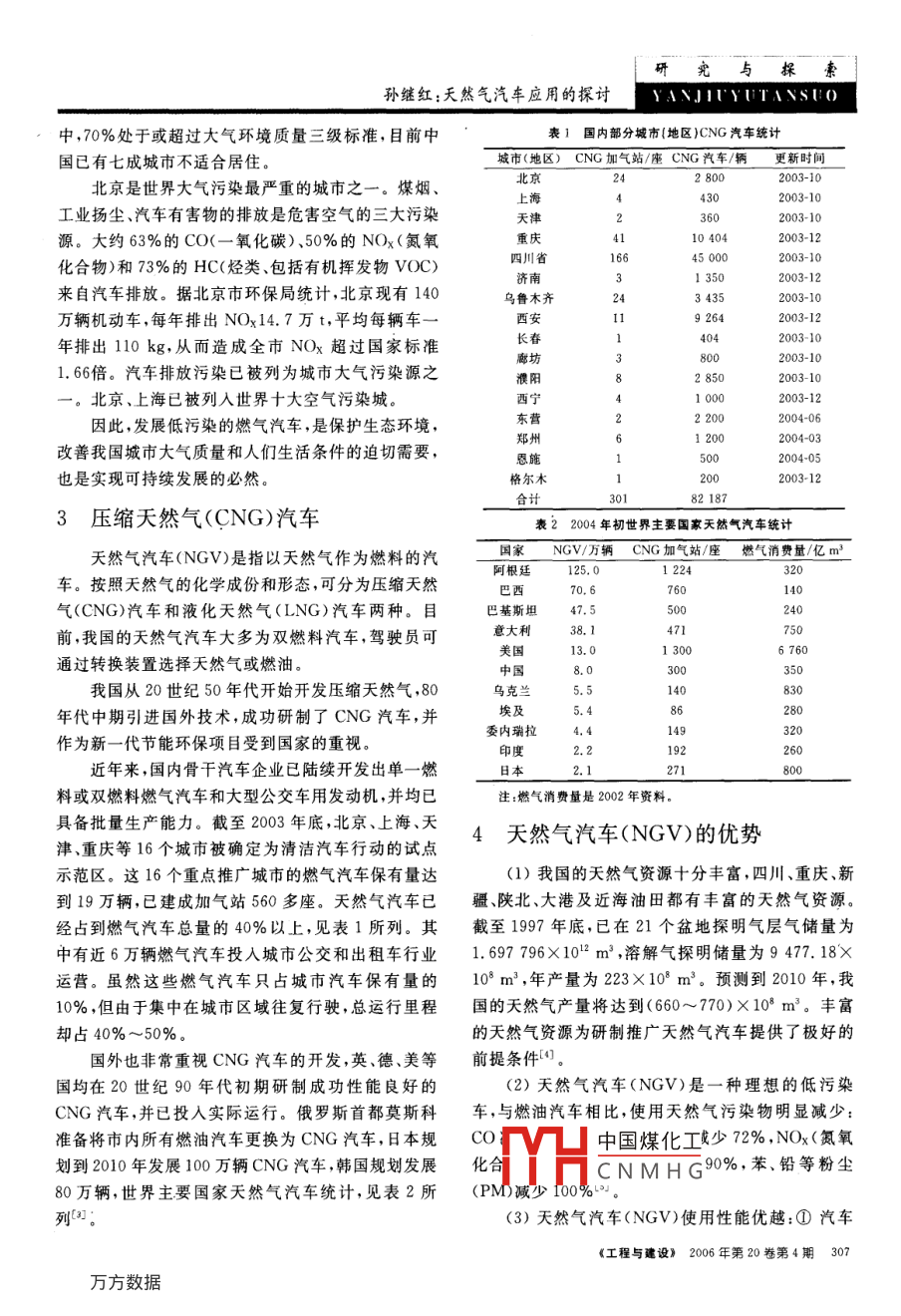 究與探親A』 UYUTANSU(孫繼紅:天然氣汽車應(yīng)用的探討天然氣汽車應(yīng)用的探討孫繼紅(合肥燃?xì)饧瘓F(tuán)有限公司,安徽合肥230041)摘要:由于汽車尾氣排放對環(huán)境造成的污染日益嚴(yán)重,以及對石油資源日漸減少的擔(dān)憂,世界各國都在尋求開發(fā)新的能源如電池天然氣、液化石油氣、甲醇等替代汽油。而其中天然氣以其使用清潔、分布廣泛、價格低廉等優(yōu)點得到廣泛的應(yīng)用關(guān)鍵詞:環(huán)境;能源;天然氣汽車;石油汽車中圖分類號:U473.24;U469.79文獻(xiàn)標(biāo)識碼:A文章編號:1673-5781(2006)04-0306-030引言求的43%,屆時我國的石油資源短缺會更加嚴(yán)重到2000年底,我國石油累計探明可采儲量為61億t能源和環(huán)境是人類最關(guān)心的兩個問題,也是21到2020年,預(yù)計會達(dá)到85~94億t。按照最高年產(chǎn)世紀(jì)世界各國堅持走可持續(xù)發(fā)展道路的重要戰(zhàn)略問油2億t測算,我國石油可采資源僅可延續(xù)到2040題,高速發(fā)展的汽車保有量,給人類帶來了經(jīng)濟(jì)繁榮年,因此石油資源的短缺會制約我國汽車工業(yè)和經(jīng)濟(jì)和物質(zhì)文明,同時也給城市帶來了汽車能源的緊張和的發(fā)展??梢钥闯?尋找替代能源,開發(fā)和發(fā)展替代嚴(yán)重的大氣污染。石油的氣體燃料汽車對全世界尤其是對我國都是關(guān)1石油汽車原料將會嚴(yán)重不足系到社會經(jīng)濟(jì),尤其是支柱產(chǎn)業(yè)—汽車工業(yè)發(fā)展的重大戰(zhàn)略問題。隨著世界經(jīng)濟(jì)的發(fā)展,全世界的汽車產(chǎn)量和汽車保有量都在不斷增加;目前全世界的汽車產(chǎn)量已超過石油汽車嚴(yán)重污染環(huán)境5000萬輛,汽車保有量已達(dá)8億輛,汽車運(yùn)行消耗石汽車保有量增多的另一嚴(yán)重問題是排放帶來的油量占全世界石油產(chǎn)量的一半以上;依據(jù)國外研究報大氣環(huán)境污染。以石油為燃料的汽車排放的污染物告及世界上石油的蘊(yùn)藏資源和消耗量的預(yù)測,全世界達(dá)140多種,占大氣環(huán)境污染的60%~70%;燃油汽的石油資源僅能夠供人類使用約50年;即到21世紀(jì)車排出的一氧化碳可使人缺氧中毒,乃至窒息死亡;中葉,汽車以石油作燃料的時代將會結(jié)束碳?xì)浠衔飳θ梭w有麻醉作用同時與氮氧化物發(fā)生隨著我國經(jīng)濟(jì)的快速發(fā)展,我國的汽車產(chǎn)量和保化學(xué)反應(yīng),導(dǎo)致化學(xué)煙霧污染;氮氧化物對人體呼吸有量也在迅速增加;2003年我國汽車保有量為百人系統(tǒng)具有強(qiáng)烈的刺激作用,侵害肺部,使生命陷入危1.8輛,2000~2004年,我國汽車保有量呈加速增長險狀態(tài);同時汽車排出的碳?xì)浠衔铩⒁谎趸歼€危態(tài)勢,分別為:10.73%、12%、13.94%、16%和及人類生存的地球上空的臭氧層;燃油汽車的排放污17.5%,2005年和2004年增速基本持平。國家信息染已成為世界上的主要公害之一;是造成酸雨,光化中心發(fā)布預(yù)測稱,我國從2005年起汽車保有量年均學(xué)反應(yīng),臭氧層破壞,溫室效應(yīng)以及使人類致癌、心血增長將達(dá)到16%以上,并由此預(yù)測,到2010年我國管、神經(jīng)性等疾病的嚴(yán)重污染源2汽車保有量將在5600萬輛以上。2000年,我國機(jī)動根據(jù)世界衛(wèi)生組織2005年公布的報告,在全球車消耗的石油為6560萬t,約占全國總石油消費的空氣污染最嚴(yán)重的10個城市排名中,中國有包括北1/3。2004年我國進(jìn)口原油1.23億t,加上國產(chǎn)1.7京在內(nèi)的7個,太原市名列第一,是世界上空氣污染億t,總消費近3億t。有關(guān)部門預(yù)測,2010年我國機(jī)最重的城市。中國已成為世界上大氣污染最為嚴(yán)重動車的燃油需求將達(dá)1.38億t,為當(dāng)年全國石油總需的中國煤化工300個中國城市當(dāng)CNMHG收稿日期:2006-04-29;修改日期:2006-06-20作者簡介:孫繼紅(1970—),女,安徽安慶人,合肥燃?xì)饧瘓F(tuán)有限公司工程師306《工程與建設(shè)》2006年第20卷第4期孫繼紅:天然氣汽車應(yīng)用的探討丶 IITYUTANSI0中,70%處于或超過大氣環(huán)境質(zhì)量三級標(biāo)準(zhǔn),目前中表1國內(nèi)部分城市(地區(qū))CNG汽車統(tǒng)計國已有七成城市不適合居住。城市(地區(qū))CNG加氣站/座CNG汽車/輛更新時間北京是世界大氣污染最嚴(yán)重的城市之一。煤煙北京上海工業(yè)揚(yáng)塵、汽車有害物的排放是危害空氣的三大污染源。大約63%的CO(一氧化碳)、50%的NOx(氮氧重慶104042003-12化合物)和73%的HC(烴類、包括有機(jī)揮發(fā)物VOC)四川省濟(jì)南1350來自汽車排放。據(jù)北京市環(huán)保局統(tǒng)計,北京現(xiàn)有140烏魯木齊2003-10萬輛機(jī)動車,每年排出NOx14.7萬t,平均每輛車西安2003-12年排出110kg,從而造成全市NOx超過國家標(biāo)準(zhǔn)長春404廊坊1.66倍。汽車排放污染已被列為城市大氣污染源之濮陽2850。北京、上海已被列入世界十大空氣污染城。2003-12因此,發(fā)展低污染的燃?xì)馄?是保護(hù)生態(tài)環(huán)境東營200406改善我國城市大氣質(zhì)量和人們生活條件的迫切需要鄭州12002004-03恩施也是實現(xiàn)可持續(xù)發(fā)展的必然。格爾木2003-123壓縮天然氣(CNG)汽車表22004年初世界主要國家天然氣汽車統(tǒng)計天然氣汽車(NGV)是指以天然氣作為燃料的汽國家NGv/萬輛CNG加氣站/座燃?xì)庀M量/億m3阿根廷1224車。按照天然氣的化學(xué)成份和