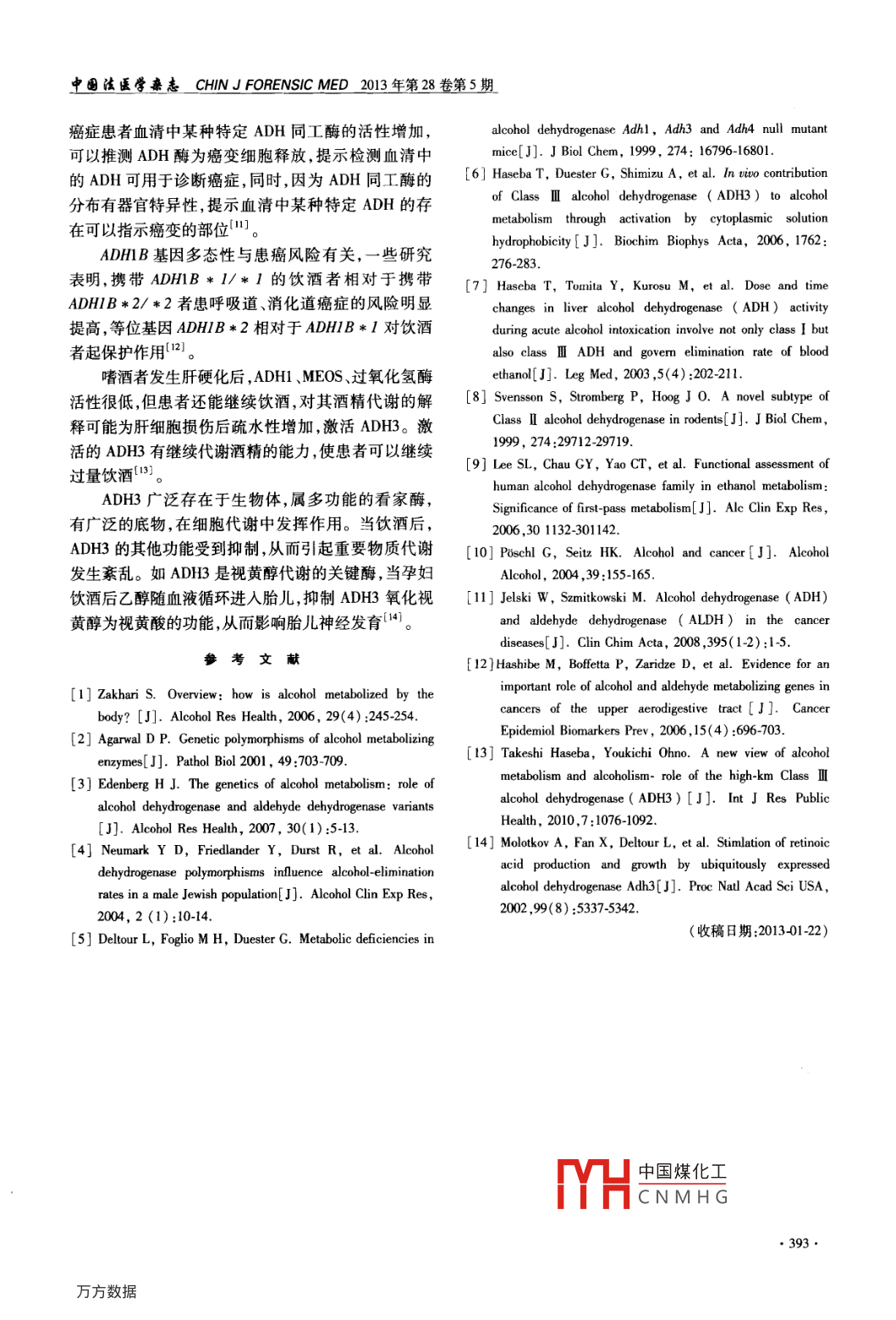 中園法匪學(xué)雜志 CHIN J FORENS/CMED2013年第28卷第5期乙醇脫氫酶在酒精代謝中的作用張幼芳(浙江警察學(xué)院刑事科學(xué)技術(shù)系,浙江杭州310053)【摘要】酒與人類社會(huì)生活密切相關(guān),與酒相關(guān)的醫(yī)學(xué)問題和法律問題已受到人們廣泛關(guān)注。乙醇脫氫酶(ADH)為乙醇氧化分解的主要酶本文就ADH的性質(zhì)ADH遺傳多態(tài)性與乙醇代謝的關(guān)系、ADH不同家系在乙醇代謝中的作用以及ADH與乙醇代謝相關(guān)性疾病的關(guān)系進(jìn)行綜述,旨在為法庭科學(xué)和醫(yī)學(xué)中的應(yīng)用和研究提供參考?!娟P(guān)鍵詞】法醫(yī)毒理學(xué);乙醇脫氫酶;酒精代謝【中圖分類號(hào)】DF795.1【文獻(xiàn)標(biāo)識(shí)碼】A【文章編號(hào)】1001-5728(2013)05-0391-03The effect of alcohol dehydrogenase ADh on alcohol metabolism( Zhang Youfang /Department of forensicscience, Zhejiang Police College, Hangzhou, 310053, China)I Abstract] Alcohol is closely related to human social activities, and alcohol-related medical problemsand legal issues have received widespread attention. Alcohol dehydrogenase( ADH) is the main enzyme ofethanol,s oxidative decomposition. This paper summarizes the nature of ADH, the relationship between ADHgenetic polymorphism and alcohol metabolism, and the effects of different ADH families on ethanol metabolismas well as the relationship between ADH and diseases related to alcohol metabolism, aimed to providereference for the application and research in forensic science and medical science.I Key words] forensic toxicology; alcohol dehydrogenase; alcohol metabolism酒與人類社會(huì)生活密切相關(guān),與酒相關(guān)的醫(yī)學(xué)問醇存在時(shí),ADH對(duì)其他物質(zhì)的代謝受到抑制。題和法律問題已受到人們廣泛關(guān)注,如過量飲酒可引目前,已發(fā)現(xiàn)ADH有7種不同的編碼基因,它們起消化系統(tǒng)疾病癌癥、精神障礙以及飲酒后發(fā)生違分布于染色體4q21-25,其名稱以往按基因的發(fā)現(xiàn)順法犯罪行為等。人飲酒后,攝入體內(nèi)的乙醇少量通過序進(jìn)行命名新的方式是根據(jù)氨基酸序列催化動(dòng)力學(xué)呼吸、尿液、汗液以原形排出體外,極少量通過非氧化性能以及在特定組織中的表達(dá)來命名。人類ADH途徑代謝為脂質(zhì);大部分乙醇被氧化分解為乙醛,蛋白質(zhì)共有5個(gè)家系(las-v)見表1。其中AD5再經(jīng)過乙醛脫氫酶(ALDH)轉(zhuǎn)化為乙酸并與輔酶基因雖然在大腸桿菌中得到表達(dá),獲得有活性的酶,反應(yīng)生成乙酰輔酶A,最后經(jīng)三羧酸循環(huán)被氧化成二但在人類組織中其蛋白質(zhì)表達(dá)產(chǎn)物還沒有明確。氧化碳和水。參與乙醇氧化分解的酶主要有乙醇脫表1人類ADH基因和酶的命名氫酶(ADH)、微粒體乙醇酶氧化系統(tǒng)(MEOS)和過氧ADH家系新的舊的化氫酶,其中乙醇氧化分解主要通過ADH途徑。本(蛋白質(zhì)名稱)基因命名基因命名亞單位分布組織文就ADH在乙醇代謝中的作用作一綜述。ADHIA ADHI肝1ADH及其遺傳學(xué)特性ADHIB *I ADh2*IADH于1937年從釀酒酵母中發(fā)現(xiàn)并得已分離aADH)4D120n22B2肝肺腎純化,隨后在人、馬、小鼠等動(dòng)物中發(fā)現(xiàn)。人類ADHADHIB*3 ADH2*3位于細(xì)胞質(zhì),是由兩個(gè)分子質(zhì)量為40KD(千道爾頓)ADHIC *1 ADR3*1 y1的亞單位組成的二聚體蛋白質(zhì),能夠催化外源和內(nèi)源肝、胃ADHIC*2 ADR3*2 y2的乙醇為乙醛。除乙醇以外,ADH還參與視黃醇、脂Classi(adh2)ADH2ADH4肝族醇、羥類固醇、脂質(zhì)過氧化產(chǎn)物等的代謝。當(dāng)乙Class II( ADHB) ADH3 ADH5所有組織【基金項(xiàng)目】浙江警察學(xué)院重點(diǎn)課題(201206021)Class IV(ADH4)中國(guó)煤化工胃【作者簡(jiǎn)介張幼芳女,教授,主要從事法醫(yī)學(xué)教學(xué)和法醫(yī)遺asVCNMHG傳學(xué)研究工作。E-mail;zhangy69@126.com391中園法醫(yī)學(xué)雜志 CHIN J FORENSIC MED2013年第28卷第5期在ADH中現(xiàn)已發(fā)現(xiàn)ADH1存在基因多態(tài)性,還ADH3。ADH3對(duì)乙醇有很高的Km(10moL),因未見其他ADH家系的多態(tài)性報(bào)道。ADHl( Class)此,當(dāng)時(shí)很多研究人員認(rèn)為ADH3在乙醇代謝中的作含a,B,y三個(gè)亞組,分別由ADHA,ADHB,ADHC用可以忽略。然而,當(dāng)小鼠肝臟ADH3與其它ADH三個(gè)基因編碼,其中ADHB和ADHC存在變異,這同工酶分離后,發(fā)現(xiàn)ADH3占全肝ADH活性些變異與酶的活性有關(guān)。ADHB有三個(gè)等位基因的13%7。ADHB*1、ADHB*2和ADHB*3,ADHB*1在ADH3分布于全身器官,是唯一分布于腦組織中白種人和美洲土著人中常見,ADHB*2在中國(guó)、日的ADH。 Haseba等6用野生小鼠和Ah3-/-小鼠本等東亞人群中常見頻率高于85%1,而在白種人進(jìn)行實(shí)驗(yàn)給予小鼠1.0~4.5g/kg劑量的乙醇,觀察和黑人中的頻率分別低于10%和15%,ADHB*3僅小鼠的乙醇代謝率,結(jié)果顯示,隨著乙醇劑量的增加,見于黑人和美洲土著人。研究發(fā)現(xiàn)攜帶ADHB*2Adh3-/-小鼠相對(duì)于野生型小鼠乙醇代謝率明顯降的個(gè)體比僅有ADHB*1的個(gè)體有較高的血乙醇清低,在劑量為45g/kg時(shí),Ah3-/-小鼠乙醇代謝率除率“。ADHC有兩個(gè)等位基因ADHC*l和是野生小鼠的66%,這表明ADH3參與乙醇代謝的作ADHC*2,在白人中兩個(gè)等位基因的頻率大致相同,用是劑量依賴的,隨著劑量增加而增加,在大劑量乙在亞洲人中ADHC*2等位基因的頻率很低,中國(guó)人醇時(shí),其作用超過30%。群中為0.091。ADHC的多態(tài)性對