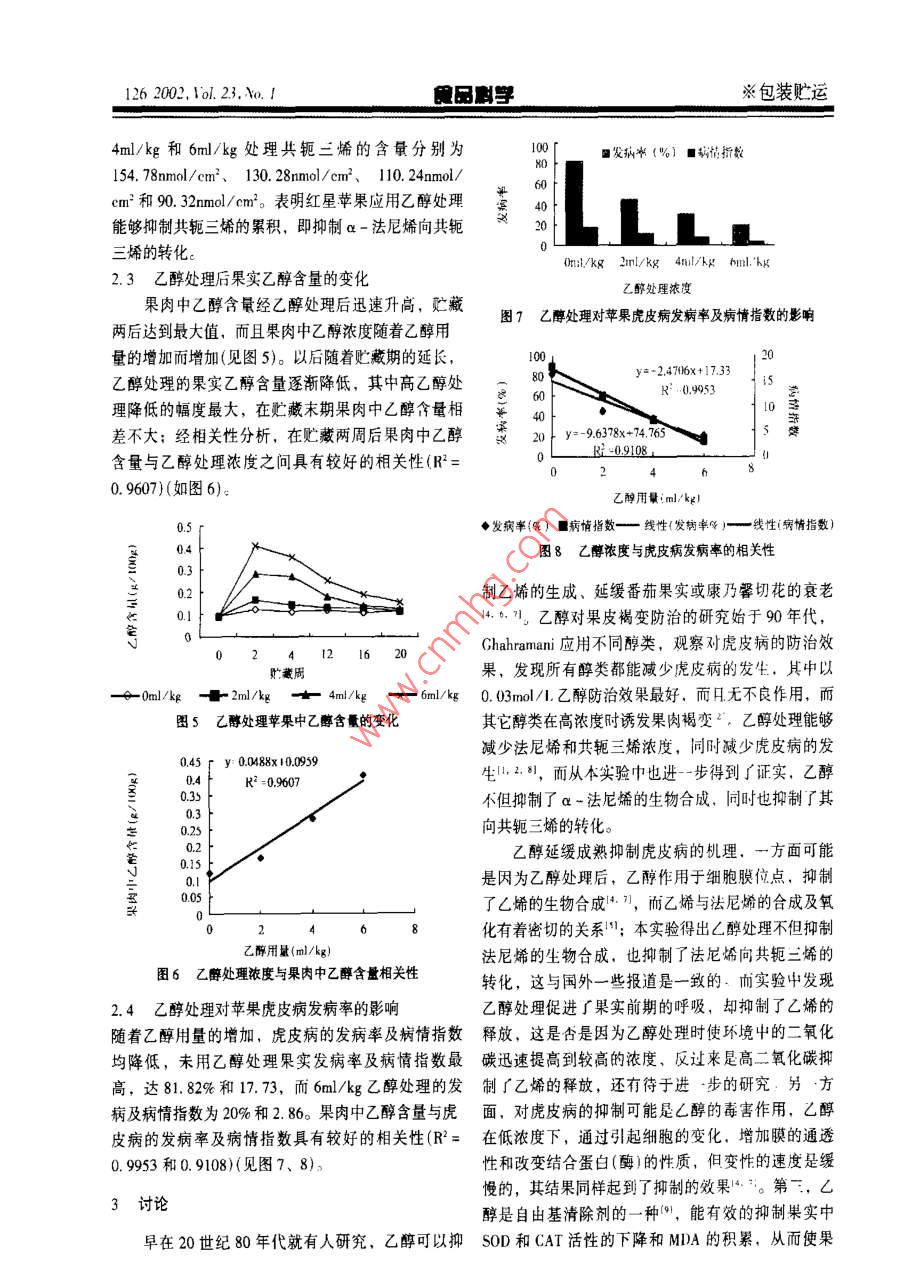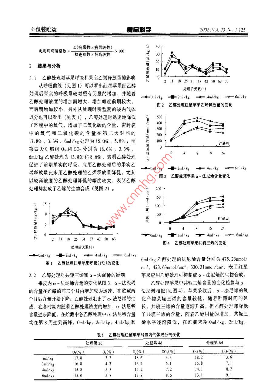 1242)2,vd.23,Vo.JE獸※包裝貯運(yùn)乙醇處理對(duì)貯藏蘋(píng)果虎皮病的影響佟世生趙玉梅馮雙慶中國(guó)農(nóng)業(yè)大學(xué)食品科學(xué)院10004摘要乙醇處理紅星蘋(píng)果,降低了a-法尼稀的生成并阻止其氧化為共軛三烯,由此抑制了虎皮病的發(fā)生,18℃下每千克蘋(píng)果經(jīng)2ml4l,6ml乙醇處理,密封于聚乙烯薄膜袋中(0.03mm),一周后于1℃冷庫(kù)中貯藏,隨著乙醇用量的增加果實(shí)內(nèi)的乙醇含量也增加抑制乙烯生物合成的防治虎皮病的作用加大高濃度乙醇處理(4ml/kg或6m/kg)降低了虎皮病的發(fā)生率和發(fā)病指數(shù)關(guān)健詞蘋(píng)果乙醇a-法尼稀共軛三烯虎皮病Abstract Studies on Red Star apples suggested that ethanol vapor ireatment could controls superficial sacld by re-ducing the production of a-famesene and preventing its breakdown to conjugated trienes. Ethanol at the concentrationof0,2.4.6 ml/kg apples was placed in dishes in polyethylene bags for apples. The bags were sealed and stored at 18Tfor a week. then the apples were stored at IC. There were close and highly significant inverse relationships between theconcentration of ethanol in the juice, etylene production and scald. Higher ethanol concentration(4ml/kg or 6ml/kg)decreased the scald rate and incidenceKey words Apple Ethanol a-farmesene Conjugated trienes Superficial scald虎皮病是蘋(píng)果和梨貯藏中后期發(fā)生的主要生理1.2處理:本實(shí)驗(yàn)設(shè)置4個(gè)處理,次重復(fù)挑選病害:其癥狀為果皮呈褐色或黑褐色斑紋,嚴(yán)重時(shí)大小均勻40個(gè)果裝入鈣塑箱中,外套聚乙烯薄膜連結(jié)成不規(guī)則的片狀和帶狀,皮下果肉組織不褐(0.03mm),內(nèi)部放置三個(gè)裝有少量蛭石的小杯變:發(fā)病初期病斑面積較小,隨著貯藏時(shí)間的延按每公斤果實(shí)分別加人0m,2m,4m,6ml乙醇于小長(zhǎng),發(fā)病面積不斷擴(kuò)大,可波及整個(gè)果實(shí)。往往在杯中,立即扎緊袋口。于18℃下處理一周后取出小貨架期大量出現(xiàn),大大降低了果實(shí)的商品價(jià)值。杯,進(jìn)入1℃冷庫(kù)中貯藏。目前二苯胺處理果實(shí)是公認(rèn)的防治虎皮病最為1.3實(shí)驗(yàn)方法有效的措施-s,已經(jīng)應(yīng)用了30多年,然而由于對(duì)1.3.1乙烯釋放量:氣譜法;呼吸強(qiáng)度:酸堿滴定化學(xué)藥劑的抵觸,西方許多國(guó)家越來(lái)越限制了它的法;乙醇:重鉻酸鉀氧化法:a-法尼稀及其氧化使用,因此迫切需要可替代化學(xué)藥劑處理的防治果產(chǎn)物的測(cè)定2.:果實(shí)削皮,用打孔器(直徑皮褐變的方法。而利用乙醇防治蘋(píng)果虎皮病的研0.8cm)打成小圓片,取20片(約10m2).放入究,已經(jīng)受到國(guó)內(nèi)外研究者的重視。乙醇是植物中20ml大試管中,加入10ml正己烷密封,振蕩,提取的天然產(chǎn)物,安全,價(jià)格低廉,無(wú)毒,使用方便,2h,再加10ml正已烷,該溶液為a-法尼烯、共軛國(guó)外報(bào)道乙醇能夠有效的抑制蘋(píng)果的虎皮病12"。三烯的提取液。取2ml萃取液過(guò)Foil柱(硅鎂型我國(guó)目前還很少有人對(duì)果蔬采后應(yīng)用乙醇處理進(jìn)行吸附劑),再加3~4ml正已烷洗脫,合并濾液和洗研究、果蔬采后立即用乙醇處理對(duì)果實(shí)究竟起到什脫液,并定容至5ml容量瓶中密封,及時(shí)用752紫么樣的作用,尤其對(duì)果實(shí)的生理病害是否能夠起到外可見(jiàn)分光光度計(jì)于232mn比色,為α-法尼稀的預(yù)防作用,有必要進(jìn)行深入的研究。本研究應(yīng)用乙測(cè)定結(jié)果,以nmol/cm2表示。取萃取液2ml,加醇處理紅星蘋(píng)果,旨在探討乙醇對(duì)蘋(píng)果虎皮病的防2ml正己烷于28m及290nm處比色,為共軛三烯治效果及對(duì)果實(shí)生理生化的影響。的測(cè)定結(jié)果,以mol/cm2表示1.3.2虎皮病的發(fā)病率及病情指數(shù)(正常果為01實(shí)驗(yàn)材料與方法級(jí),<1/3為2級(jí),<1/2為3級(jí),>1/2為4級(jí))1.1實(shí)驗(yàn)材料:紅星蘋(píng)果,于2000年9月15日采病果數(shù)虎皮病的發(fā)病率100%調(diào)查總果數(shù)※包裝貯運(yùn)E獸202.Vu.3,.J125虎皮病病情指數(shù)=x(病果數(shù)x病果數(shù))x10查總數(shù)x最高級(jí)數(shù)2結(jié)果與分析2.1乙醇處理對(duì)草果呼吸和果實(shí)乙烯釋放量的影響如211182513742506370從呼吸曲線(見(jiàn)圖1)可以看出紅星蘋(píng)果經(jīng)乙醇處理后天數(shù)(d)處理后果實(shí)的呼吸量較對(duì)照有明顯的增加,并隨著2ml/kg4ml/kg6ml/kg乙醇處理濃度的增加而增大。增加幅度前期較大圖2乙醇處理紅星蘋(píng)果乙烯釋放量的變化而后期增加較小。另外從處理時(shí)所監(jiān)測(cè)的袋內(nèi)氣體成分也可以看出(見(jiàn)表1),乙醇處理時(shí)迅速地降低500了環(huán)境中的氧氣,增加了二氧化碳的含量,密封袋中的氧氣和二氧化碳的含量在第二天對(duì)照的17.8%、3.3%,6ml/kg處理為15.0%、5.8%;而廣藏財(cái)?shù)谒奶鞂?duì)照組O2和CO2分別為18.6%、3.3%,6m/kg乙醇處理為13.8%和8.6%,表明乙醇處理促進(jìn)∫前期果實(shí)的呼吸。應(yīng)用乙醇處理后的果實(shí)乙oml/kg·2ml/kguml/kg烯釋放量比未用乙醇處理的乙烯釋放量降低,尤其以較高濃度的乙醇處理降低的幅度較大,表明乙醇圖3乙醇處理蘋(píng)果a-法尼烯含量變化處理抑制成了乙烯的生物合成(見(jiàn)圖2)。15EE5Uml/kg21118253}37圖4乙醇處理蘋(píng)果共軛三烯的變化處理后天數(shù){d)Oml/k-+-2ml/ke -+4ml/kg --6ml/kk6ml/kg乙醇處理的法