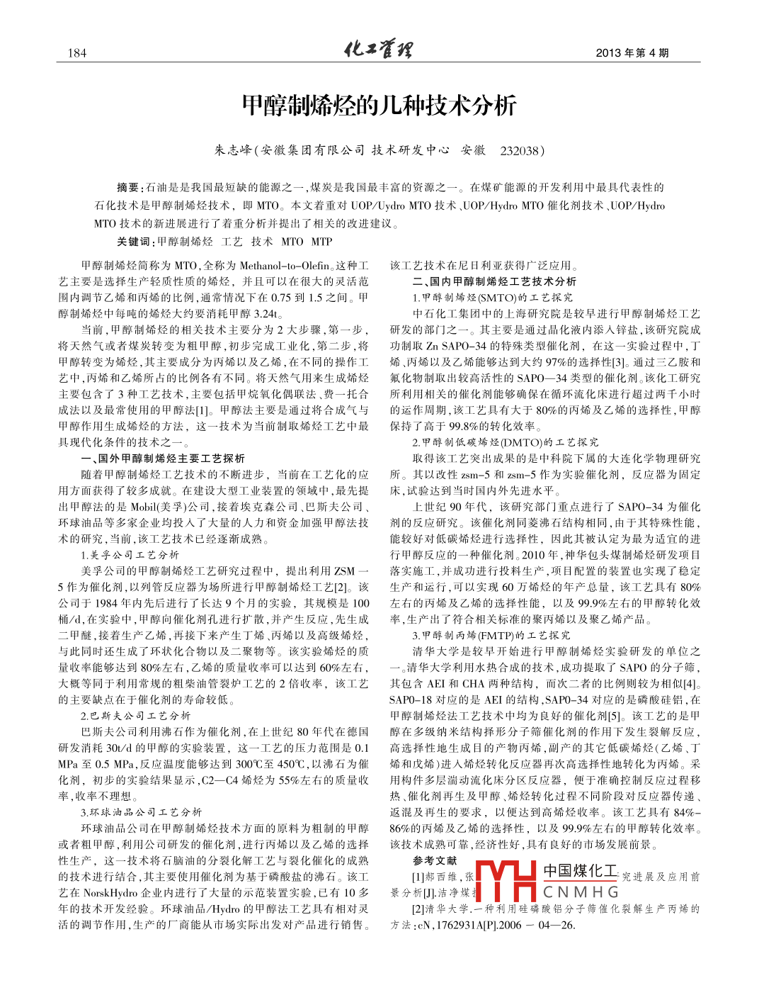 化x2013年第4期甲醇制烯烴的幾種技術(shù)分析朱志峰(安徽集團(tuán)有限公司技術(shù)研發(fā)中心安徽232038)摘要:石油是是我國最短缺的能源之一,煤炭是我國最豐富的資源之一。在煤礦能源的開發(fā)利用中最具代表性的石化技術(shù)是甲醇制烯烴技術(shù),即MTO。本文著重對UOP/ Uydro MTO技術(shù)、UOP/ Hydro MTO催化劑技術(shù)、UOP/ HydroMTO技術(shù)的新進(jìn)展進(jìn)行了著重分析并提出了相關(guān)的改進(jìn)建議關(guān)鍵詞:甲醇制烯烴工藝技術(shù) MTO MTP甲醇制烯烴簡稱為MTO,全稱為 Methanol-to- Olefin。這種工該工藝技術(shù)在尼日利亞獲得廣泛應(yīng)用藝主要是選擇生產(chǎn)輕質(zhì)性質(zhì)的烯烴,并且可以在很大的靈活范國內(nèi)甲醇制烯烴工藝技術(shù)分析圍內(nèi)調(diào)節(jié)乙烯和丙烯的比例,通常情況下在0.75到1.5之間。甲1.甲醇制烯烴(SMTO的工藝探究醇制烯烴中每噸的烯烴大約要消耗甲醇3.24t中石化工集團(tuán)中的上海研究院是較早進(jìn)行甲醇制烯烴工藝當(dāng)前,甲醇制烯烴的相關(guān)技術(shù)主要分為2大步驟,第一步,研發(fā)的部門之一。其主要是通過晶化液內(nèi)添λ鋅鹽,該硏究院成將天然氣或者煤炭轉(zhuǎn)變?yōu)榇旨状?初步完成工業(yè)化,第二步,將功制取 Zn Sapo-34的特殊類型催化劑,在這一實(shí)驗(yàn)過程中,丁醇轉(zhuǎn)變?yōu)橄N,其主要成分為丙烯以及乙烯,在不同的操作工烯、丙烯以及乙烯能夠達(dá)到大約97%的選擇性[3]。通過三乙胺和藝中,丙烯和乙烯所占的比例各有不同。將天然氣用來生成烯烴氟化物制取出較高活性的SAPO-34類型的催化劑。該化工研究主要包含了3種工藝技術(shù),主要包括甲烷氧化偶聯(lián)法、費(fèi)一托合所利用相關(guān)的催化劑能夠確保在循環(huán)流化床進(jìn)行超過兩千小時(shí)成法以及最常使用的甲醇法[l甲醇法主要是通過將合成氣與的運(yùn)作周期,該工藝具有大于80%的丙烯及乙烯的選擇性,甲醇甲醇作用生成烯烴的方法,這一技術(shù)為當(dāng)前制取烯烴工藝中最保持了高于99.8%的轉(zhuǎn)化效率。具現(xiàn)代化條件的技術(shù)之2.甲醇制低碳烯烴①DMTO)的工藝探究國外甲醇制烯烴主要工藝探析取得該工藝突出成果的是中科院下屬的大連化學(xué)物理研究隨著甲醇制烯烴工藝技術(shù)的不斷進(jìn)步,當(dāng)前在工藝化的應(yīng)所。其以改性zsm-5和zm-5作為實(shí)驗(yàn)催化劑,反應(yīng)器為固定用方面獲得了較多成就。在建設(shè)大型工業(yè)裝置的領(lǐng)域中,最先提床,試驗(yàn)達(dá)到當(dāng)時(shí)國內(nèi)外先進(jìn)水平。出甲醇法的是 Mobil(美孚)公司,接著??松?、巴斯夫公司上世紀(jì)90年代,該研究部門重點(diǎn)進(jìn)行了SAPO-34為催化環(huán)球油品等多家企業(yè)均投入了大量的人力和資金加強(qiáng)甲醇法技劑的反應(yīng)研究。該催化劑同菱沸石結(jié)構(gòu)相同,由于其特殊性能,術(shù)的研究,當(dāng)前,該工藝技術(shù)已經(jīng)逐漸成熟。能較好對低碳烯烴進(jìn)行選擇性,因此其被認(rèn)定為最為適宜的進(jìn)1.美孚公司工藝分析行甲醇反應(yīng)的一種催化劑。2010年,神華包頭煤制烯烴研發(fā)項(xiàng)目美孚公司的甲醇制烯烴工藝研究過程中,提出利用ZSM落實(shí)施工,并成功進(jìn)行投料生產(chǎn),項(xiàng)目配置的裝置也實(shí)現(xiàn)了穩(wěn)定5作為催化劑,以列管反應(yīng)器為場所進(jìn)行甲醇制烯烴工藝[2]。該生產(chǎn)和運(yùn)行,可以實(shí)現(xiàn)60萬烯烴的年產(chǎn)總量,該工藝具有80%公司于1984年內(nèi)先后進(jìn)行了長達(dá)9個(gè)月的實(shí)驗(yàn),其規(guī)模是l00左右的丙烯及乙烯的選擇性能,以及99,9%左右的甲醇轉(zhuǎn)化效桶/d,在實(shí)驗(yàn)中,甲醇向催化劑孔進(jìn)行擴(kuò)散,并產(chǎn)生反應(yīng),先生成率,生產(chǎn)出了符合相關(guān)標(biāo)準(zhǔn)的聚丙烯以及聚乙烯產(chǎn)品。甲醚,接著生產(chǎn)乙烯,再接下來產(chǎn)生丁烯、丙烯以及高級烯烴,3.甲醇制丙烯(FMTP)的工藝探究與此同時(shí)還生成了環(huán)狀化合物以及二聚物等。該實(shí)驗(yàn)烯烴的質(zhì)清華大學(xué)是較早開始進(jìn)行甲醇制烯烴實(shí)驗(yàn)研發(fā)的單位之量收率能夠達(dá)到80%左右,乙烯的質(zhì)量收率可以達(dá)到60%左右清華大學(xué)利用水熱合成的技術(shù),成功提取了SAPO的分子篩大概等同于利用常規(guī)的粗柴油管裂爐工藝的2倍收率,該工藝其包含AEI和CHA兩種結(jié)構(gòu),而次二者的比例則較為相似[41。的主要缺點(diǎn)在于催化劑的壽命較低。SAPO-18對應(yīng)的是AEI的結(jié)構(gòu),SAPO-34對應(yīng)的是磷酸硅鋁,在2.巴斯夫公司工藝分析甲醇制烯烴法工藝技術(shù)中均為良好的催化劑⑤5]。該工藝的是甲巴斯夫公司利用沸石作為催化劑,在上世紀(jì)80年代在德國醇在多級納米結(jié)構(gòu)擇形分子篩催化劑的作用下發(fā)生裂解反應(yīng)研發(fā)消耗3/d的甲醇的實(shí)驗(yàn)裝置,這一工藝的壓力范圍是0.Ⅰ髙選擇性地生成目的產(chǎn)物丙烯,副產(chǎn)的其它低碳烯烴(乙烯、丁MPa至0.5MPa,反應(yīng)溫度能夠達(dá)到300℃至450℃,以沸石為催烯和戊烯)進(jìn)入烯烴轉(zhuǎn)化反應(yīng)器再次高選擇性地轉(zhuǎn)化為丙烯。采化劑,初步的實(shí)驗(yàn)結(jié)果顯示,C2—C4烯烴為55%左右的質(zhì)量收