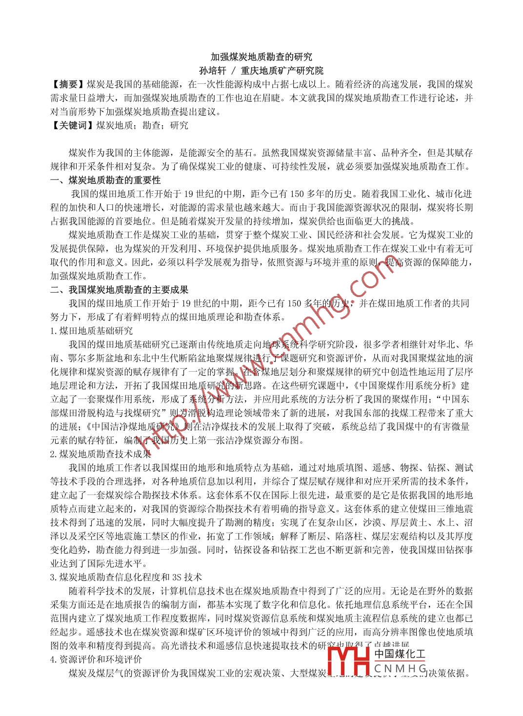 加強(qiáng)煤炭地質(zhì)勘查的研究孫培軒/重慶地質(zhì)礦產(chǎn)研究院[摘要]煤炭是我國的基礎(chǔ)能源,在一次性能源構(gòu)成中占據(jù)七成以上。隨著經(jīng)濟(jì)的高速發(fā)展,我國的煤炭需求量日益增大,而加強(qiáng)煤炭地質(zhì)勘查的工作也迫在眉睫。本文就我國的煤炭地質(zhì)勘查工作進(jìn)行論述,并對當(dāng)前形勢下加強(qiáng)煤炭地質(zhì)勘查提出建議。[關(guān)鍵詞]煤炭地質(zhì);勘查;研究煤炭作為我國的主體能源,是能源安全的基石。雖然我國煤炭資源儲量豐富、品種齊全,但是其賦存規(guī)律和開采條件相對復(fù)雜。為了確保煤炭工業(yè)的健康、可持續(xù)性發(fā)展,就必須要加強(qiáng)煤炭地質(zhì)勘查工作。一、 煤炭地質(zhì)勘查的重要性我國的煤田地質(zhì)工作開始于19世紀(jì)的中期,距今已有150多年的歷史。隨著我國工業(yè)化、城市化進(jìn)程的加快和人口的快速增長,對能源的需求量也越來越大。而由于我國能源資源狀況的限制,煤炭將長期占據(jù)我國能源的首要地位。但是隨著煤炭開發(fā)量的持續(xù)增加,煤炭供給也面臨更大的挑戰(zhàn)。煤炭地質(zhì)勘查工作是煤炭工業(yè)的基礎(chǔ),貫穿于整個煤炭工業(yè)、國民經(jīng)濟(jì)和社會發(fā)展。它為煤炭工業(yè)的發(fā)展提供保障,也為煤炭的開發(fā)利用、環(huán)境保護(hù)提供地質(zhì)服務(wù)。煤炭地質(zhì)勘查工作在煤炭工業(yè)中有著無可取代的作用和意義。因此,必須以科學(xué)發(fā)展觀為指導(dǎo),依照資源與環(huán)境并重的原則,提高資源的保障能力,加強(qiáng)煤炭地質(zhì)勘查工作。二、我國煤炭地質(zhì)勘查的主要成果我國的煤田地質(zhì)工作開始于19世紀(jì)的中期,距今已有150多年的歷史,并在煤田地質(zhì)工作者的共同努力下,形成了有著鮮明特點的煤田地質(zhì)理論和勘查體系。1.煤田地質(zhì)基礎(chǔ)研究我國的煤田地質(zhì)基礎(chǔ)研究已逐漸由傳統(tǒng)地質(zhì)走向地球系統(tǒng)科學(xué)研究階段,很多學(xué)者相繼針對華北、華南、鄂爾多斯盆地和東北中生代斷陷盆地聚煤規(guī)律進(jìn)行了課題研究和資源評價,從而對我國聚煤盆地的演化規(guī)律和煤炭資源的賦存規(guī)律有了- -定的掌握。在含煤地層劃分和聚煤規(guī)律的研究中創(chuàng)造性地運用了層序地層理論和方法,開拓了我國煤田地質(zhì)研究的新思路。在這些研究課題中,《中國聚煤作用系統(tǒng)分析》建立起了-套聚煤作用系統(tǒng),形成了系統(tǒng)分析方法,并應(yīng)用此系統(tǒng)的方法分析了我國的聚煤作用;“中國東.部煤田滑脫構(gòu)造與找煤研究”則為滑脫構(gòu)造理論領(lǐng)域帶來了新的進(jìn)展,對我國東部的找煤工程帶來了重大的進(jìn)展;《中國潔凈煤地質(zhì)研究》則在潔凈煤技術(shù)的發(fā)展上取得了突破,系統(tǒng)總結(jié)了我國煤中的有害微量元素的賦存特征,編制了我國歷史上第一-張潔凈煤資源分布圖。2.煤炭地質(zhì)勘查技術(shù)成果我國的地質(zhì)工作者以我國煤田的地形和地質(zhì)特點為基礎(chǔ),通過對地質(zhì)填圖、遙感、物探、鉆探、測試等技術(shù)手段的合理選擇,對各種地質(zhì)信息加以利用,并綜合了煤層賦存規(guī)律和對應(yīng)開采所需的技術(shù)條件,建立起了-套煤炭綜合勘探技術(shù)體系。這套體系不僅在國際上很先進(jìn),最重要的是它是依據(jù)我國的地形地質(zhì)特點而建立起來的,對我國的資源綜合勘探技術(shù)有著明確的指導(dǎo)意義。這套體系的建立使煤田三維地震技術(shù)得到了迅速的發(fā)展,同時大幅度提升了勘測的精度;實現(xiàn)了在復(fù)雜山區(qū),沙漠、厚層黃土、水上、沼澤以及采空區(qū)等地震施工禁區(qū)的作業(yè),拓寬了工作領(lǐng)域;解釋了斷層、陷落柱、煤層宏觀結(jié)構(gòu)以及其厚度變化趨勢,勘查能力得到進(jìn)一-步加強(qiáng)。同時,鉆探設(shè)備和鉆探工藝也不斷更新和完善,使我國煤田鉆探事業(yè)達(dá)到了國際先進(jìn)水平。3.煤炭地質(zhì)勘查信息化程度和3S技術(shù)隨著科學(xué)技術(shù)的發(fā)展,計算機(jī)信息技術(shù)也在煤炭地質(zhì)勘查中得到了廣泛的應(yīng)用。無論是在野外的數(shù)據(jù)采集方面還是在地質(zhì)報告的編制方面,都基本實現(xiàn)了數(shù)字化和信息化。依托地理信息系統(tǒng)平臺,還在全國范圍內(nèi)建立了煤炭地質(zhì)工作程度數(shù)據(jù)庫,同時煤炭資源信息系統(tǒng)和煤炭地質(zhì)主流程信息系統(tǒng)的建立也都已經(jīng)起步。遙感技術(shù)也在煤炭資源和煤礦區(qū)環(huán)境評價的領(lǐng)域中得到廣泛的應(yīng)用,而高分辨率圖像也使地質(zhì)填圖的效率和精度得到提高。高光譜技術(shù)和遙感信息快速提取技術(shù)的研空也和得了點越進(jìn)屈中國煤化工4.資源評價和環(huán)境評價煤炭及煤層氣的資源評價為我國煤炭工業(yè)的宏觀決策、大型煤炭CNMH G決策依據(jù)。而運用3S技術(shù)和地面地質(zhì)調(diào)查,可以分析出礦區(qū)土地沙化、水土流失和植被現(xiàn)狀以及生態(tài)環(huán)境的變化規(guī)律,從而為煤礦區(qū)的環(huán)境調(diào)查和評價提供范例,也必將為煤炭開發(fā)和生態(tài)環(huán)境保護(hù)的協(xié)調(diào)發(