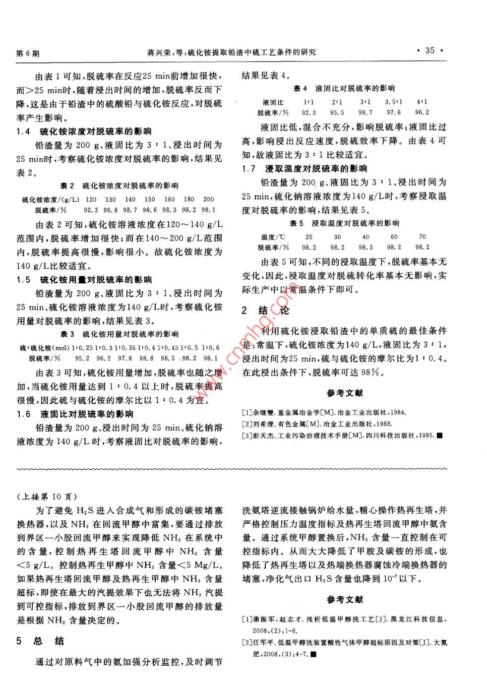 第35卷第6期Vol 35, No 62012年6月HEBEI HUAGONGJune 2012低溫甲醇洗循環(huán)甲醇氨含量高的原因及預(yù)防措施劉文兵,王占江,張志新(河南煤化鶴煤公司化工分公司甲醇廠,河南鶴壁458000)摘要:分析了低溫甲醇洗氨含量高的原因,采取了相應(yīng)措施,使系統(tǒng)甲醇中氨含量降至可控范圍內(nèi)關(guān)鍵詞:甲醇;氨含量;超標(biāo)中圖分類號(hào):TQ223.12+1文獻(xiàn)標(biāo)識(shí)碼:B文章編號(hào):1003-5095(2012)06-000903Cause Analysis and Prevention Measures of High Ammonia's Contentin Low-temperature Methanol Washing SystemLIU Wen-bing, WANG Zhanjiang, ZHANG Zhi-zin(Henan Coal & Chemical Hebi Coal Group Corporation Chemical Branch Methanol Plant, Hebi 458000, China)Abstract: To analyze the causes of the ammonias content in low-temperature methanol washing system, and takemeasures to make ammonia content in methanol be reduced to the controllable rangeKey words: methanol; ammonias content; exceeding the standard1工藝原理置進(jìn)行回收凈化裝置的作用是去除變換氣中的酸性氣體成2循環(huán)甲醇氨含量高的原因分析分,其中低溫甲醇洗工藝是用低溫甲醇作為洗液(吸河南煤化鶴煤公司化工分公司甲醇廠在2010收劑),屬于典型的物理凈化工藝。其吸收過(guò)程遵循年6月發(fā)現(xiàn)低溫甲醇系統(tǒng)運(yùn)行3個(gè)月后操作工況嚴(yán)亨利定律在溫度為-56℃時(shí),甲醇對(duì) HCN NH3、重惡化,經(jīng)分析氨含量超標(biāo)。對(duì)循環(huán)甲醇中氨含量H2S、COS、CO2和H2S具有較高的可溶性。在物高的原因進(jìn)行了分析,并采取了相應(yīng)措施,將系統(tǒng)甲理吸收過(guò)程中,控制因素是溫度、壓力和濃度,含有醇中氨的含量降低到了可控范圍內(nèi)。經(jīng)討論、論證任何成分的液體負(fù)載均與成分的分壓成比例。得出系統(tǒng)甲醇氨含量高的原因富甲醇通過(guò)再沸器中產(chǎn)生的蒸氣進(jìn)行閃蒸和汽2.1系統(tǒng)富集因素提再生,其中閃蒸為該過(guò)程提供額外的冷卻,閃蒸氣原料氣中所含氨在吸收塔的預(yù)洗段被吸收,預(yù)通過(guò)循環(huán)壓縮,然后再循環(huán)到吸收塔,其損耗量最洗甲醇先在預(yù)洗甲醇加熱器中被預(yù)熱,再在預(yù)洗閃低。甲醇水分離塔保持甲醇循環(huán)中的水平衡。尾氣蒸槽內(nèi)被閃蒸,閃蒸后甲醇經(jīng)過(guò)加熱送入熱再生塔。洗滌塔使隨尾氣的甲醇損耗降低到最大限度。變換其中一部分氨被其提出來(lái),而后有一部分在熱再生氣冷卻段的氨洗滌塔使變換氣中的氨含量保持在甲塔中頂部的冷凝系統(tǒng)再次被甲醇吸收,冷凝下來(lái)的醇放氣量最小的液位。酸性氣體通到克勞斯氣體裝甲醇經(jīng)熱再生塔回流又送回?zé)嵩偕_@樣,氨就收稿日期:2012-03-29作者簡(jiǎn)介:劉文兵(1975-),男,大專,2003年7月畢業(yè)于河南省黨校經(jīng)濟(jì)管理專業(yè),現(xiàn)在從事煤化工生產(chǎn)工作, E-mail:10河北化工 Hebei Chemical Industry第35卷會(huì)在甲醇系統(tǒng)中富集,且一部分以弱物理鍵,另一部常生產(chǎn)。分以強(qiáng)化學(xué)鍵方式溶解于甲醇中。氨的富集在達(dá)到一定含量后,會(huì)導(dǎo)致熱再生塔4預(yù)防措施中段用于氣提H2S的甲醇蒸汽不足以氣提氨,氨最4.1原料氣冷卻及氨的脫除終會(huì)在熱再生塔中段與H2S相結(jié)合形成(NH4)2S冷卻原料氣,使氨在原料氣中的含量降低,以防存在于熱再生甲醇中,當(dāng)將再生甲醇送入吸收塔時(shí)止氨在熱再生塔系統(tǒng)中富集,同時(shí)減少甲醇的排放。再生甲醇中(NH4)2S會(huì)受到吸收塔頂段凈化氣的原料氣在合成氣換熱器內(nèi)被合成氣冷卻,氨制冷劑分壓作用,使(NH4)2S分解再次釋放出H2S,使凈在深冷器殼側(cè)被加壓蒸發(fā)(溫度為5℃),其出口溫化氣H2S含量超標(biāo)。度和蒸發(fā)壓力控制器串級(jí)調(diào)節(jié),以避免溫度過(guò)低而2.2洗氨塔因素導(dǎo)致管程結(jié)冰堵塞換熱器。變換氣經(jīng)過(guò)洗氨塔的一股鍋爐水冷卻器換熱至原料氣攜帶的大部分氨將在氨再洗塔內(nèi)被逆流40℃后,進(jìn)入洗氨塔。經(jīng)過(guò)3層塔盤來(lái)吸收原料氣接觸的40℃鍋爐給水吸收脫除,若原料氣流量或其中的大部分氨,減少進(jìn)入吸收塔的氨含量。中的氨含量增加,需通過(guò)鍋爐給水流量控制器來(lái)提2.2.1鍋爐水器換熱因素髙鍋爐給水流量以確保大部分氨被脫除。在日常生產(chǎn)中,由于鍋爐水冷卻器換熱效率問(wèn)題4.2吸收塔的預(yù)洗段氨的脫除造成鍋爐水溫度達(dá)不到設(shè)計(jì)要求時(shí),會(huì)影響到對(duì)原料為了避免原料氣中一些微量的氨、氫氰酸及其氣中氨的洗滌吸收效果。此外,進(jìn)入洗氨塔的原料氣它物質(zhì)對(duì)整個(gè)甲醇循環(huán)系統(tǒng)的污染,在吸收塔預(yù)洗溫度控制過(guò)高也會(huì)使系統(tǒng)中甲醇氨含量升高。段應(yīng)將其脫除。由于這些成分溶解度高,不需要大2.2.2流量因素量的甲醇溶劑,因此,預(yù)洗甲醇流量應(yīng)由流量控制器鍋爐給水與入地溫甲醇洗的流量不相匹配,使控制。通過(guò)吸收塔的預(yù)洗段分析點(diǎn)來(lái)分析HCN、原料氣中氨沒有被完全在洗氨塔洗下來(lái),從而使原NH3含量,再通過(guò)流量調(diào)整把出自預(yù)洗段氣體中的料氣中的氨超標(biāo)進(jìn)入原料氣洗滌塔。因而,氨在洗HCN、NH3控制在指標(biāo)內(nèi)(NH3為5mg)。滌甲醇不斷吸收下而不斷積累,致使系統(