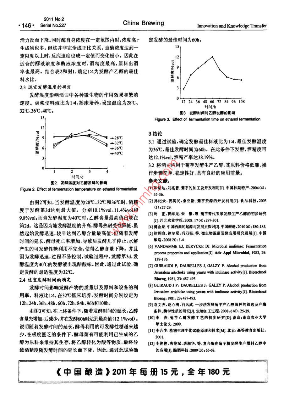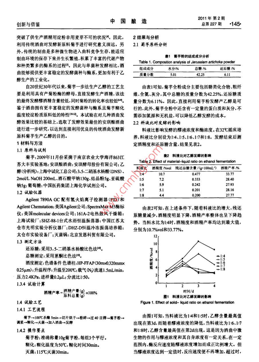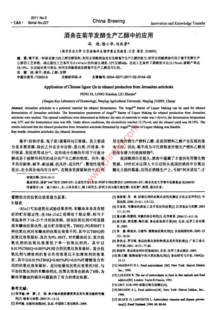 2011No2144· Senial No.227China BrewingInnovation and Knowledge Transfer酒曲在菊芋發(fā)酵生產(chǎn)乙醇中的應(yīng)用馮迪,隆小華,劉兆普(南京農(nóng)業(yè)大學(xué)江蘇省海洋生物學(xué)重點實驗室,江蘇南京210095)摘要:菊芋是一種極具潛力的乙醇發(fā)酵原料,利用安琪釀酒曲具有發(fā)酵菊芋生產(chǎn)乙醇的能力研究安琪酸酒曲應(yīng)用于菊芋發(fā)酵生產(chǎn)乙醇的工藝參數(shù)。確定最佳工藝條件為以14(w)的料液比調(diào)漿,32℃發(fā)酵60h。在此工藝條件下酒精度可達(dá)121%v,酒精產(chǎn)率達(dá)3819%.從試驗結(jié)果可推論,利用安琪酸酒曲發(fā)酵菊芋生產(chǎn)乙醇是可行的。關(guān)鍵詞:菊芋;酒曲;乙醇:發(fā)酵中圖分類號:TQ9206文獻(xiàn)標(biāo)識碼:A文章編號:0254-5071(2011)02-014403Application of Chinese liguor Qu in ethanol production from Jerusalem artichokeFENG Di, LONG Xiaohua, LIU Zhaopu*Jiangsu Key Laboratory of Oceanology, Nanjing Agricultural University, Nanjing 210095, China)Abstract: Jerusalem artichoke is a potential material for ethanol fermentation. The Angel M Starter of Liquor Making can be used for ethanolfermentation of Jerusalem artichoke. The fermentation parameters of Angel Starter of Liquor Making for ethanol production from Jerusalemartichoke were studied. The optimal conditions were determined as follows: the ratio of materials to water was 1: 4(w/v), the fermentation temperatureresults indicated that the ethanol production from Jerusalem artichoke fermented by Angel M Starter of Liquor Making was feasible vas38.19%.Thewas 32 C and the fermentation time was 60h. Under above conditions, the alcoholicity reached 12. 1%vol, and the ethanol yieldKey words: Jerusalem artichoke; Qu; ethanol; fermention菊芋(俗稱洋姜、鬼子姜)屬菊科向日葵屬。其主要成用非糧作物生產(chǎn)燃料乙醇,是我國燃料乙醇產(chǎn)業(yè)發(fā)展的基分是多聚果糖除此之外還含有淀粉、蛋白質(zhì)、纖維素、半本方向。因此,菊芋成為可代替糧食作物生產(chǎn)燃料乙醇用纖維素、果膠質(zhì)等成分。這些成分在酶的作用下可被分的很有潛力的能源植物解成易于被酵母利用的成分而產(chǎn)生乙醇的物質(zhì)。另外,菊我國釀酒歷史悠久,酒曲中蘊藏了豐富的有用微生物芋具有耐寒、耐旱、耐鹽堿、抗風(fēng)沙、適應(yīng)性廣、繁殖性強(qiáng)等資源。19世紀(jì)末法國人卡爾邁特從我國的酒藥中分離出優(yōu)點在全國各地均有分布。在糧食資源緊缺的今天,利糖化力強(qiáng)的莓菌應(yīng)用在酒精生產(chǎn)上,號稱阿米諾法”才收稿日期:201010-13基金項目:國家“948~項目Q2009-29):公益性行業(yè)(農(nóng)業(yè))科研專項經(jīng)費項目200903001405);南京農(nóng)業(yè)大學(xué)青年創(chuàng)新基金(K80I0作者簡介:馮迪(1983-),女,山東東營人,碩士研究生,研究方向為微生物發(fā)酵:劉兆普·教授,通訊作者檬酸組合的抗氧化效果最為顯著[3]菊新楚吳侯抗氧化劑的抗氧化活性的測定方法及其評價中3結(jié)論國油脂,2000,25(6):119122.(63±1)℃加速氧化試驗結(jié)果表明,米糠油本身具有較[4]汪家銘米糠油的深加工及開發(fā)應(yīng)用前景江蘇食品與發(fā)酵,2003(1):31-34.好的貯存穩(wěn)定性,在18d-21d之前都處于穩(wěn)定期,相當(dāng)于5]重永鵬圖蒙剛,米攀的綜合利用[化學(xué)教育,2006(1):45,16常溫條件下18-21個月的保質(zhì)期。添加抗氧化劑可明顯提凌關(guān)庭唐述潮陶民強(qiáng)食品添加劑手冊北京:化學(xué)工業(yè)出版高米糠油抗氧化性延長貯存穩(wěn)定性。TBHQ、PG和BHT3杜,200種抗氧化劑對米糠油的抗氧化效果不同,其中以TBHQ的四李嘉陳波水,方建華植物油抗氧化劑幾合成潤滑材料,20032抗氧化效果最好,其次為PG、BHT對米糠油而言,復(fù)合抗():1824.氧化劑的抗氧化效果優(yōu)于單一抗氧化劑的,其中以黃池寶羅宗銘食品抗氧化劑的種類及其作用機(jī)理門廣東工業(yè)大0015%TBHQ+0005%PG組合的抗氧化效果最好。復(fù)合抗氧化劑與增效劑的復(fù)合作用效果比不加增效劑的效果10陳文植物油脂中的天然抗氧化劑門食品研究與開發(fā),18好,其中以0.015%TBHQ+0005%PG001%檸檬酸復(fù)合作用的抗氧化效果最好,是同組最低抗氧化效果的3倍,與[ MADHAV D L Food antioxidants [M] New Yor: Marcel Dekker不加抗氧化劑的米糠油相比,抗氧化效果也提高了8倍,為解決米糠油的儲存問題提供了有力的理論依據(jù)。[2]LOLIGER R. The use of antioxidants in food in free radicals and fooddditiveIM]. London: Tayler& Francis, 1991參考文獻(xiàn):[3]GBT55381995油脂過氧化值測定S][14]BRANEN A L. Food additives[M ] New York: Marcel Dekker, Inc.[張偉敏鐘耕,王煒單不飽和脂肪酸營養(yǎng)及其生理功能研究概況糧食與油脂2005(3):1315[5 BLOCK G, LANGSETH L Antioxidant vitamins and discase preve[2]吳時敏功能性油脂M北京:中國輕工業(yè)出版社2004tion[]. Food Technol, 1994, 48: 80-84.2011年第2期創(chuàng)新與借鑒中國釀造總第227期·145突破了供生產(chǎn)酒精用淀粉非用麥芽不可的狀況。因此,2結(jié)果與分析利用傳統(tǒng)酒曲對發(fā)酵新原料菊芋進(jìn)行研究意義深遠(yuǎn)。另2.1菊芋原料分析外,傳統(tǒng)的制曲是多種微生物進(jìn)入曲料競爭生存,能適應(yīng)制曲環(huán)境的保存下來并生長繁殖積累了豐富的代謝產(chǎn)物豪1菊芋粉的組成成分分析和種類繁多的酶系的過程。因此與單菌種發(fā)酵相比,酒Table 1. Composition analysis of Jerusalem artichoke powder組成成分水分%總糖%還原糖%曲能