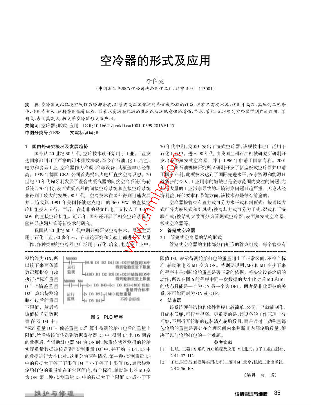 空冷器的形式及應(yīng)用李伯龍(中國石油撫順石化公司洗滌劑化工廠,遼寧撫順113001)摘要:空冷器是以環(huán)境空氣作為冷卻介質(zhì)對管內(nèi)高溫流體進(jìn)行冷卻或冷凝的設(shè)備,具有不需要水源,適用于髙溫、髙壓的工藝條件,使用壽命長,運(yùn)轉(zhuǎn)費(fèi)用低等優(yōu)點(diǎn)。隨著水資源和能源的匱乏以及環(huán)保意識的増強(qiáng),節(jié)水、節(jié)能、無污染的空冷器得到廣泛應(yīng)用。管翅式、表面蒸發(fā)式、板式等空冷器形式及應(yīng)用關(guān)鍵詞:空冷器;形式;應(yīng)用DOl:10.662l/ j cnki. issn1001-0599.2016.S1.17中圖分類號:TE98文獻(xiàn)標(biāo)識碼1國內(nèi)外研究概況及發(fā)展趨勢70年代中期,我國開發(fā)出了濕式空冷器,該項(xiàng)技術(shù)已廣泛用于國外從20世紀(jì)30年代,空冷技術(shù)就開始用于工業(yè),工業(yè)發(fā)石化工業(yè)中。進(jìn)入90年代,由我國蘭州石油機(jī)械研究所研制開達(dá)國家都制訂了嚴(yán)格的污水排放法規(guī),至今在石油、化工、冶金、發(fā)出表面蒸發(fā)式空冷器,并于1996年申請了國家專利。2001電力和食品工業(yè),空冷器作為冷凝、冷卻設(shè)備,其覆蓋率已經(jīng)很年,蘭州石油機(jī)械研究所又研制開發(fā)了新型板式空冷器并申請高。1939年德國CEA公司首先提出火電廠直接空冷設(shè)想。20了國家專利,此項(xiàng)技術(shù)達(dá)到了國際先進(jìn)水平。在水資源和能源日世紀(jì)50年代匈牙利發(fā)展了混合式凝汽器的間接空冷系統(tǒng)(海勒益緊張的今天,工業(yè)用水的短缺已是全球范圍內(nèi)關(guān)注的問題,尤系統(tǒng))、70年代,表面式凝汽器的間接空冷系統(tǒng)和直接空冷系統(tǒng)其是大量的工業(yè)污水導(dǎo)致的環(huán)境污染問題日趨嚴(yán)重,無論從經(jīng)業(yè)得到了較大的發(fā)展,90年代,空冷技術(shù)在國外得到迅速發(fā)展?jié)妗h(huán)保要求和節(jié)能方面,該技術(shù)都是很有前途的并日趨成熟,1991年美國懷俄達(dá)克電廠的360MW的直接空空冷器按管束布置方式可分為水平式和斜頂式;按通風(fēng)方冷機(jī)組投入運(yùn)行,而后,在南非的馬尤巴電廠又投入了3×675式可分為鼓風(fēng)式和引風(fēng)式;按冷卻方式可分為干式濕式和干濕ⅥW的直接空冷機(jī)組。近幾年,國外還開展了相變空冷系統(tǒng)與聯(lián)合式;按結(jié)構(gòu)大致可分為管翅式空冷器、表面蒸發(fā)式空冷器塑料導(dǎo)熱翅片管等新技術(shù)的研究。板式空冷器等。我國從20世紀(jì)60年代中期開始研制空冷技術(shù),最初主要2管翅式空冷器用于石化工業(yè),30多年來,在理論研究和實(shí)驗(yàn)上都進(jìn)行了大量2.1管翅式空冷器的結(jié)構(gòu)形式工作,各種類型的空冷器也廣泛用于石化、冶金、電力等工業(yè)中。管翅式空冷器的主體部分由矩形的管束組成,每個管束有視始終為ON,所|M00限值D4,表示待測輪胎打包的重量超出了正常區(qū)間,不符合標(biāo)以接下來兩條算BD起準(zhǔn),輔助繼電器M變?yōu)镺N。特別要說明,M0和M在接下來數(shù)運(yùn)算指令自動 HAnD It In Is ni,m值到s中的程序中是判斷輪胎重量是香正常的依據(jù),將決定設(shè)備之后的執(zhí)行:“標(biāo)準(zhǔn)重量得到輪胎重量上膽值動作,所以在圖6的程序中同一次數(shù)據(jù)的大小比對后MO和MID1”“偏差重量mHe0)輪的狀態(tài)只能是一個為0N另一個為OFF,兩者是非此即彼的關(guān)D2”算出待測輪H D I MI輪重系,不可能同時為ON或OFF。胎打包后的重量不符合標(biāo)準(zhǔn)4結(jié)束語下限值,然后將該系統(tǒng)硬件結(jié)構(gòu)和軟件程序比較簡單,公司自己就能制作該值傳送到數(shù)據(jù)圖5PLC程序且成本低廉,可行性很高。更重要的是,該設(shè)備的工作原理十分寄存器D4中巧妙,不用拆開輪胎的包裝清點(diǎn)輪胎數(shù)目,而是通過自動稱量每標(biāo)準(zhǔn)重量DI”+¨偏差重量D2”算出待測輪胎打包后的重量上包輪胎的重量是否處在合理區(qū)間內(nèi)來判斷其內(nèi)部輪胎數(shù)量,解限值,然后將該值傳送到數(shù)據(jù)寄存器D5中。得到D4和D5兩者決了以前輪胎打包的一個難題。的數(shù)據(jù)后,當(dāng)輔助繼電器M4為ON時,稱重傳感器測得的輪胎參考文獻(xiàn)實(shí)際重量數(shù)據(jù)被傳送到“實(shí)測重量D3”中,并開始與D4、D5中[1]初航.三菱FX系列PLC編程及應(yīng)用[M]北京:電子工業(yè)出版社的數(shù)據(jù)進(jìn)行大小比對。這里分為兩種情況,第一種:實(shí)測重量D320l1:37-112中的數(shù)據(jù)大于等于下限值D4且小于等于上限值D5,表示待測2]王建宋勇昌觸摸屏實(shí)用技術(shù)(三菱M]北京:機(jī)械工業(yè)出版社輪胎打包的重量處在正常區(qū)間內(nèi),符合標(biāo)準(zhǔn),輔助繼電器M0變?yōu)镺N;第二種:實(shí)測重量D3中的數(shù)據(jù)大于上限值D5或小于下〔編輯凌瑞〕雛護(hù)與修理設(shè)管理與維修35若干排三角形排列的管子,該管子一般是翅片管,也可以是光的進(jìn)風(fēng)口,且其四周均為進(jìn)風(fēng)口;同時構(gòu)架又作為風(fēng)機(jī)、除霧器管。介質(zhì)的流向通常是逆流,熱流體從管東頂端流,從底部流噴淋水分配器及光管管朿的支撐體。在管東下部四周設(shè)置了擋出,空氣由下向上流動,冷卻熱的工藝介質(zhì)。另外還有風(fēng)機(jī)、百葉水板,在水箱