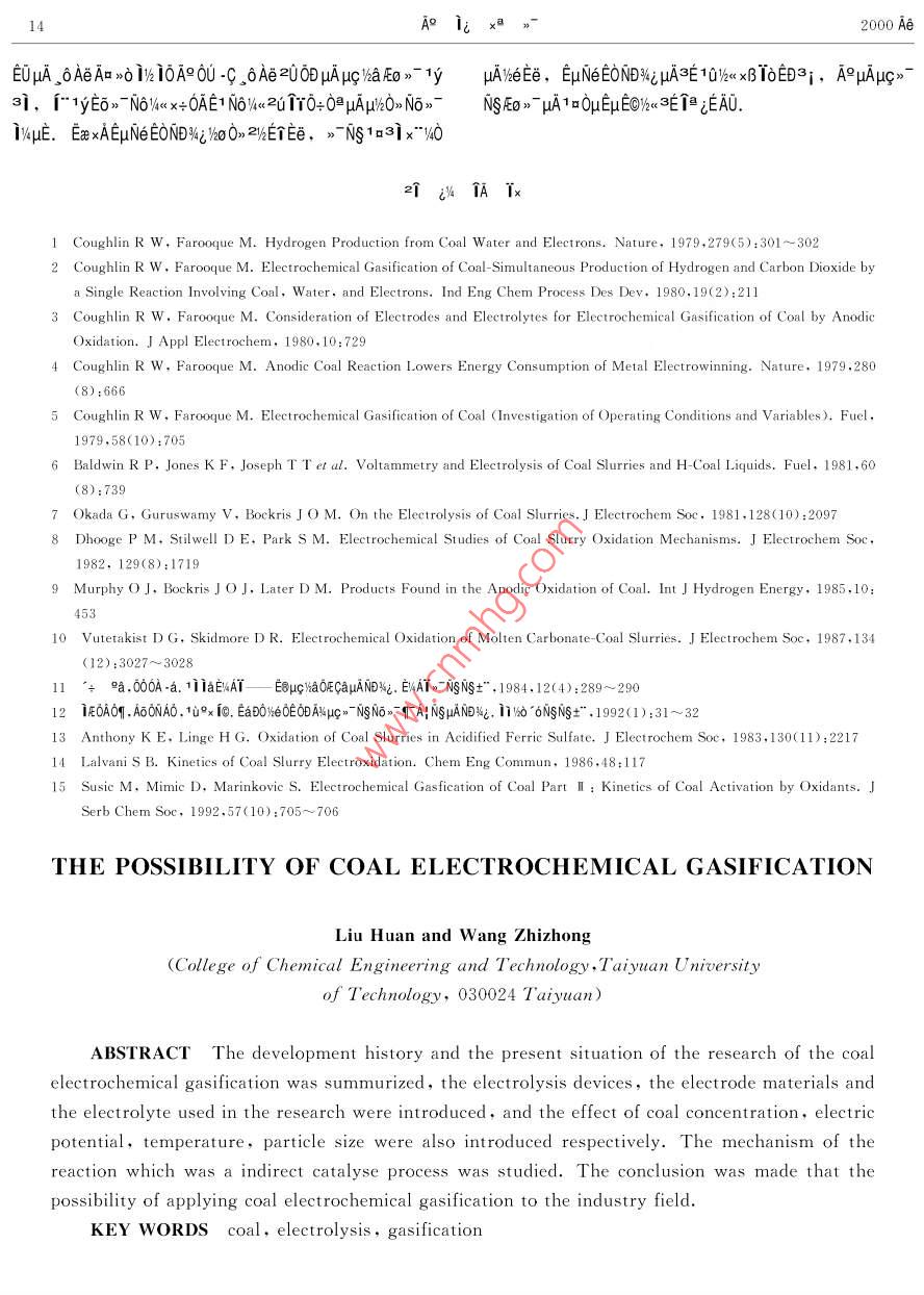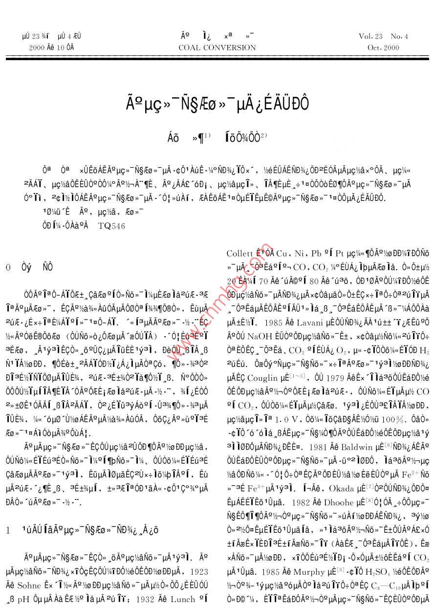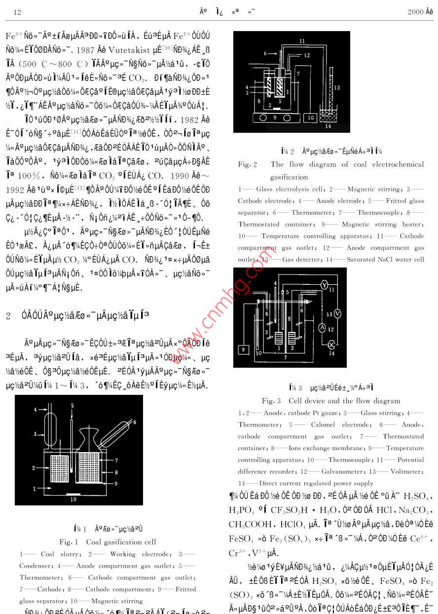 μ023%i μ04 印A9.i;x3>~Vol.23 No.42000 Ae 10 0ACOAL CONVERSIONOct. 2000A9u》~ NgEo》μAjEAUDOA6 >9) 160%002)δ 0@ x0E6AEA9μc》 NSEo》uA -c01 AUE -I%°NDNi 10x",/keEOAENDNi 002E0AμAμc%ax°0A、ug/u2AAT、μuglhaOEE00900%° AO/-A"作、A iAA 6Di、μg%aμc1、 TAEμE .+1000δE0q0A9μc> 7NSEO》~ μA601i,2c1%10AEA9μc》 NSE0》~ μA--0! >UAr, EAE6AE 1o0μETEμ∈OA∈μc》NSEo >- 1a00μAjEAUD0.10%40“E A, μg/ba,Eo》>~0D [1 -0Aa2A TQ546Collett E10ACu, Ni, Pb 9[ Pt μ%u q10A9/%o DVTDONO00y NO》μA,-0≈Ea9j9-CO, CO2 V°EUAi ipμAEo ia.0>0+μk20 EANT 70 Ae uAO9i 80 Ae“136, 0D10A90U/TDO%e0E00A e0-AT0E士。CaEo91O,No》- W%uEFo ia2uE .3E0Dμζ/aNo>←μAND%εμAxc0aμa0→δ←ECx+ 0:0≌uημATeA9μAEo>-,ECA93a%》 AOAμA000O [360@0》,EuμA。δ≈EaμAEOAE9[A01> Ia B。δ≈EaEOAEμA“B> VA0OAaZUE-jEx+個≌EMAY2[>-10-AT.”< j3μA9Eo》~ .lh-*ECμAtE)&T. 1985 Ae Lavani μEOUNDWi AA1土TjEE09δWu APOeE@O6FO (0UNo>ogδRoμA a0UTA) -0|Eu3EY A900 NaOH EU0e 0Dμc/haNo》-E土, xc0aμl6Nδ1< 2u110+3EEo,。A1y3iECO》. ,δUG;uATeE1ysi, e00 βTA_B 0≌E0EC。 03Ea、CO2 °1EUA: O2, μ< -c0060%ETOD H2N1 TA/NoDD,qOEe+。 2AATODwjAi1μA0≌C6,0>》-33022dEu. 0aOy°Nμc》 7NSNon- x+ 1aA E0》1y3j%oDDND%iDiSEyTNT00μATUE%,2uE- 3E1402Taq0kT B. NO000》μAEC Couglin uE01~5, 60 1979 AeEx Tias80UEaDO%e000%21μ11AETA 0A9OEEjEo iaZUE-pA-/-",%ijE0OOE0Dμc%aA9/nOOEEj AEo 1ia2E-,0UN6/4< EμAμk CO2>t0E10AA1 BTA2AAT, 02 ;EI0ayAo2i -03.10 -x3μA .2[ CO, 06/<< ETμAμhGaEo.1y3i iEOU32TAIA%oDD ,10E%,y<- 6μ0 U)o AEA9μuANa%>A00A,0δCiA9 >心3EμG/aμc1> 1.0 V, 061/4<< 16CaDsAE%O%u 100%. 0a0》壓o》> 1aAi 0oμA%90uA|.-c10^6 61a .BAEμc>~NS4OqOA9OUEaDOxeOE0Dμg/a1yA μAμc》~ NSEo”EC0U∪μg}a 200D 90A )bo Dμgha,31 10DOμANEWiDEEx. 1981 Ae Baldwin μE 6INB4jAEA90U6% 1yai, EuμA iσμaEc2Ux+ 16/pTA91,EiaON6e<.- 0! 0+0日ECAPODE0/a/%o EeE009 μA Fe2+ NiμA2GE- i昨, B、3E%μi,+》3E1@D1日A《 -c01C°%°μA>-3E Fe3+ μA1y3i. I-Ae, Okada μEIJ020UNDWεδD0aDAO》“UA9E0》- -/k-*.EμAEETEo10μa. 1982 Ae Dhoohe μE[8]6: 0A。+00μc》NsEOqi 10Ax/-0°μc》~ NSNo>- >UAi IboDDAEND4E,aybo11uAU1aA9ug》 ^NSEO》^ND%i Aiδ0> 2/20EμET∈610μala,>1 1a36A9)-N6> E在0UA9AEx0士AxEx TIEDT3E1iAeN6>個r (AaE ,03EaμATr0E), EaeA°uAμc》- NSEO》~ ECO》. δA9μg/haNo>~ uA1y3i. AxANo- uA160D, xT00Eu3E%TDi -0x0μA土WδEEa°i CO2μAμghaNo,- ND%AE xTOqECOUyTD0weOEoB%hoDDμA,1923μA10μa. 1985 Ae Murphy μE[9] -cT0 H2SO, VheOEODARAe Sohne Ex' 1%< A ho Dμg)haNo》μAμu%0》 00 ;E00U/n09%-1yμqa°6μA0e ia21π0+0≈EC C。- CrgμAip°iβ pH 0μμAAa EEV%° iaμA2u1r; 1932 Ae Lunch 9i0>01A,ETTEaDOA9%-09uAμc> NSNG》- ECE00°ODμA12A1;x@>2000 AeFe2+ Nox- AR+iAaμAA3DC>TDO>uIA, Eu3EμA Fe2+ 0U0011N6/<- .1987 Ae Vutetakist μE10] NDNzAE, βTA (500 C~800 C) TAAμc》~ NSNo》μA/a10,-c10ADDμAD>u IV4A01> ieE" 3E CO2. Di TaND%i0D>1qOA≌%-0qμq}$a06l4OECa9i EOμGlsaOFCaμA1y3ioDDEw1,IT" AEA9μg%aN6 m6%EGaOBX_IAEIuANPOuA!.10100D10A9μg)}aEo > μANDVWi Ea2WvTfi, 1982 Ael 10E-01 6NS +a1I00ADEaEDOeweOE, 002- io≌μctyue A9pμζ%aOEζaμANDNi , FaODEOAAE 1010μAO>0ON1A、1W2 A°μhbaEo>° °EμNeA=3iI%Ta0o0A,1y31006%o iaf≌caFo,2uCaμcA+DSAEFig.2 .The flow diagram of coal electrochemical自100%,No610- qo.Thermostated container;Magnetic strring heater;μkhAεC°↑≌01,A9μc>~NSEo 》uANNiEO' 0UEμNe10Temperature controlling apparatus; 11-- CathodeE01aAs,AiμA °61WEC0=0目0U06/xmμACaEo,i-E士compartment gas outlet; 12一Anode compartment gas0UN)%< EIμAμ% CO2 y。EUAiμA CO. ND42 10 x≠μA∞0μaoutlet; 13- Gas detecter; 14-- Saturated NaCl water cell0∪μqha Iμ i3μAN;0n、1=00 io4pμAxT0A》-、uqhaNo》-μA>UA1W°qTAINSμE.020A0UA9ug/baEo 》~ μAμg/haIμf3130A9μAμc》NgEo》- EC0U+> 3F e μg%a20μAx°OAODieLg3EμA,3yμgl/a201a, xe3∈EμζhaTμi3μA》1ODu%《、 ue)bakeOE、0s30μ}%al}∈O∈μE. 2E0A "yμuAA9μ》NSEo》-μG)a20/404 1~ 143,^6W4EC. ,0AeE%21Eyu/ E/%μA.143 uqha2UEe土 , V0A:3iFig.3 Cell device and the flow diagram- Anode, cathode Pt gauze; 3- Glass string; 4-Thermometer;|Calomel electrode; 6一Anode.cathode compartment gas outlet;Thermostated動|container; 8lons exchange membrane;-Temperaturecontrolling apparatus; 10一Thermocouple; 11: Potentialdifference recorder; 12: Galvanometer; 13. Voltmeter;14--- Direet current regulated power supply10U Ea BOvhe OE 0 I% , 2E 06AμAV%e OE 0A" H2SO,HJPO, 9[ CFSO.H●H2O, 02 0B 0A HCI, Na2COs,CH,COOH, HCIO, μA. 8 °0o AμAμgha, DeOaNOEe[%41 AEo》- μc%a20FeSO, >心Fer (SO,)s x+Ta B》IyA, 02040Ee Ce+,F(xiàn)ig. 1 Coal gsification cell1一Coal slurry; 2一Working electrode; 3-Cr2+ ,Vs+ uA.Condenser; 4一Anode compartment gas outlet; 5-hel4o 1yE¥μANDNε版a10,ijkACμlk1a0μETμA|OAεEThermometer; 6-Cathode compartment gas outlet;A0,EOBETTβ2EOA H2SO, xOWhe0E、 FeSO, Fez. Cathode; 8-- - Cathode compartment; 9: Fritted(SO)。xδ "B>~VAEWTEμOA.06/4<< 2E0ACH、N8/2E06AE-glass separator; 10一Magnetic stirringA< μADg 1002>a909A, 00 1CH 0UAδEa0D iE+E30TET" ,Eμ0 4UA0 μE Agμc=- Ns壓o》° uA;EAUDO33.0000δ∈0q0A9μc》- NSAEO》" μA0°Ea0D°A" CO2,Ea- 0|E%目4Fe3+ +2H2O+C-→4Fe++CO2十4H+ + AaEuZUE-A9uAμc》←NSEo》- 1yaiE00個1o0000E0μAO°i,0aAT Fe3+ y%< A9N6>- 3∈AaEu2UE . EC0i 3Eμg/kaNo°AA~性、ARiAAE "6Di、μgaμcT>、TAYEμE.WxucA+ T-30/6°3σ∈士XaμA0-0o. A9μg}%aNo>- 1y3iEC ,δ(1) A9%-A" qEμAO°1i. OU%TDjμAA" E -91SAU,A9A“B》No>-1y3i. 01μ i3001%0.0°AμA "B>~- yAEC%-A- E1A40》11a ,BA9uchaNo>" EUqE. u<μtA°A" ECe+ej V5+ μEBA+T0ia .B B》”EE , 06%0No>° ugA+.06%0μh6O>T"3iqE96, q0No>- E作EμAO°∩ita2》1° EμxEECO》1oA9A"作E1y 6Et,-10/μμTA9μg%aN6>-EUqE. 3%jEa6δ%axc0μc}wa1y3i, . 0; EUTEμAN6q"2hOeECAR iAALti0-06EC0E0U1<. ,βμAA9%k-A- EIPOAEKA°eTμ isuAvA.eAaETμA140e Fe+ 0@waμA-' 0| , μgma09μANo》→ug1>ECDSAE,0OEOWAEuμg TNs -0! 1y3i0DuA %q.°0. LavaniTe, 0A90eμξha09°jμ\<1fAeμA%0¥1Ae ,01ixA-0!EUE.ug%aNo》1y3i0D. AEC0011aDi si iAAS ao0U0Oμg)halDi A9 iAAE;E08%0-*0!EUAE, μ AE qEμμA3-1y0O0D