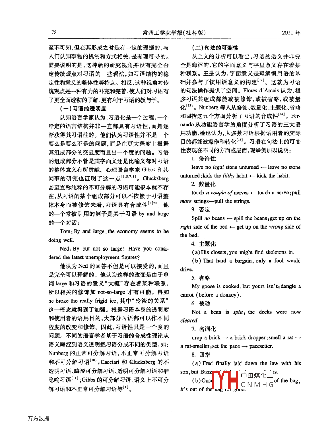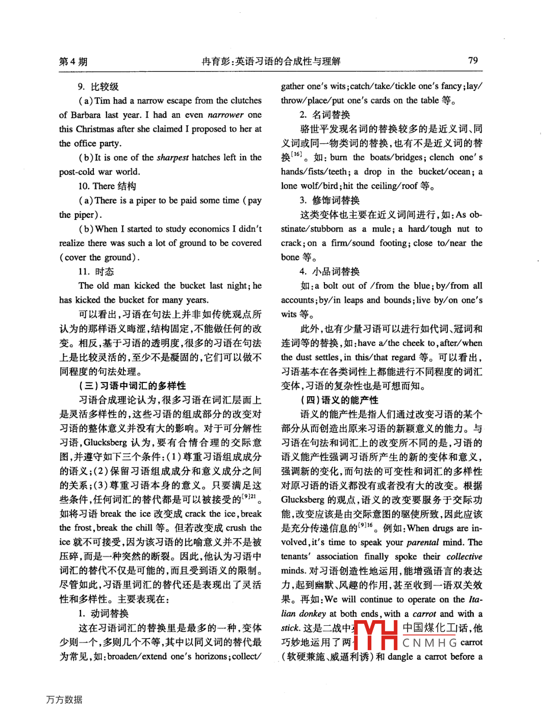 第29卷第4期常州工學(xué)院學(xué)報(bào)(社科版)Vol.29 No.42011年8月Joumal of Changzhou Institute of Technology( Social Science Bdition)Aug.2011英語習(xí)語的合成性與理解.冉育彭(常州工學(xué)院,江蘇常州21302)摘要:傳統(tǒng)上,習(xí)語被當(dāng)作一個長詞看待,對習(xí)語的學(xué)習(xí)和理解就像理解單個的詞一樣,在詞典里查找合適的意義并加以記憶。對于EFL( English as a foreign language)或ESL( English as a se-cond language)學(xué)習(xí)者來說,這種觀點(diǎn)對他們學(xué)習(xí)和理解習(xí)語并無大的幫助。而習(xí)語合成性觀點(diǎn)對這一問題的解決要有效得多。文章從習(xí)語的透明度、句法、詞法和語義等四個方面分析探討習(xí)語的合成性,并概括總結(jié)了一些學(xué)習(xí)和理解習(xí)語的策略。關(guān)鍵詞:英語;習(xí)語;合成性;理解策略中圖分類號:H313.3文獻(xiàn)標(biāo)志碼:A文章編號:1673 -0887 (2011)04 -0077 -05英語習(xí)語- -直以來都受到語言學(xué)者的關(guān)注,角對英語習(xí)語做進(jìn)- -步分析和探討。但因?yàn)槠涮厥庑院蛷?fù)雜性,正如心理語言學(xué)家-、習(xí)語的合成性Gibbs所言,僅靠一種理論或模式是不可能解釋各種各樣的習(xí)語和話語情景的1]75。Cacciari 利從不同的角度對某-事物進(jìn)行觀察和研究有Tabossi也指出,只靠- -種方 法或模式要完全理解助于加深對該事物本質(zhì)的認(rèn)識。英語習(xí)語的合成習(xí)語的復(fù)雜性事實(shí)上是不可能的口。習(xí)語傳統(tǒng)上性研究是近年來習(xí)語研究的一種新的視角和探被看成是語義晦澀、句法僵化、詞法固定的多詞結(jié)討,得到了越來越多的語言學(xué)者的認(rèn)可。其中取構(gòu),其意義是約定俗成的,人們不能從習(xí)語的組成得成果的是由Cacciari 和Tabossi提出的構(gòu)形假部分得出其整體的意思。習(xí)語的整體意義和其各說[4]和由心理語言學(xué)家Gibbs和其同事Nayak提組成部分是--種任意的關(guān)系。因此,對習(xí)語的學(xué)出的分解假說'5] ,兩種假說的共同點(diǎn)是認(rèn)為習(xí)語習(xí)和理解是以假定習(xí)語是一個包含多個詞語的固的結(jié)構(gòu)不完全是凝固的,習(xí)語可以被分成不同的定結(jié)構(gòu)為前提,就像理解單個的詞一樣,在詞典里類型,大部分的習(xí)語都是可以被分解和分析的,其查找合適的意義就行了。然而,隨著認(rèn)知語言學(xué)組成成分在習(xí)語整體意義的理解中發(fā)揮著重要的的興起,對語言的研究更加廣泛和深入,人們發(fā)現(xiàn)作用,習(xí)語的組成成分應(yīng)當(dāng)受到重視。Gibbs和語言和認(rèn)知有著密切聯(lián)系,人們的認(rèn)知能力和方其同事 在以后的研究中進(jìn)-步從認(rèn)知心理和概念式反映在其語言之中。Lalkoff 和Johnson發(fā)現(xiàn),上對習(xí)語的理據(jù)做了探討,為習(xí)語的合成性提供人們平常賴以思維和行動的概念系統(tǒng)在本質(zhì)上是了有力的支持。Kovecses 和Szabo也從認(rèn)知語義比喻性的“3。近年來對隱喻、象似性和介詞等的學(xué)的角度對習(xí)語進(jìn)行了研究,認(rèn)為習(xí)語的本質(zhì)是深人研究都取得了豐富的成果,為此提供了強(qiáng)有認(rèn)知的,是概念的,其組成成分與整體意義之間并力的支持。語言學(xué)者對習(xí)語的研究也從規(guī)范、描寫非是一-種任意的關(guān)系f6]。組成成分的意義是理解到解釋步步深人,從社會文化、語用和認(rèn)知等不同習(xí)語意義的基礎(chǔ),它們參與了習(xí)語整體意義的構(gòu)的視角對其進(jìn)行了研究,因此對習(xí)語的認(rèn)識更加全建。筆者認(rèn)為這樣的解釋是比較中肯和合理的,面和深刻。文章借鑒合成性理論,擬從一個新的視雖然有少部分習(xí)語在藝分T中國燎化藝糊甚收稿日期:2010-09-25TYHCNMHG作者簡介:冉育彭(1975- ),男 ,講師。.78常州工學(xué)院學(xué)報(bào)(社科版)2011年至不可知,但在其形成之時是有- -定的理據(jù)的,與(二)句法的可變性人們認(rèn)知事物的機(jī)制和方式相關(guān),是有理可尋的。從上文的分析可以看出,習(xí)語的語義并非完需要說明的是,這種新的研究視角并沒有完全否全是晦澀的, 它的字面意義與字里意義存在著某定傳統(tǒng)觀點(diǎn)對習(xí)語的一些看法,如習(xí)語結(jié)構(gòu)的穩(wěn)種聯(lián)系。王進(jìn)認(rèn)為,字面意義是理解慣用語的基定性和意義的整體性等特點(diǎn)。相反,這種視角對傳礎(chǔ)并參與了慣用語意義的構(gòu)建[”2]。這就為習(xí)語統(tǒng)觀點(diǎn)是- -種有力的補(bǔ)充和完善,使人們對習(xí)語有的句法操作提供了空間。Flores d'Arcais認(rèn)為,很了更全面透徹的了解,更有利于習(xí)語的教與學(xué)。多習(xí)語其組成都能或被修飾,或被省略,或被量(一)習(xí)語的透明度化[13]。Nunberg等人從修飾、數(shù)量化、主題化、省略認(rèn)知語言學(xué)家認(rèn)為,習(xí)語化是-個過程,- -個和回指這五個方面分析了習(xí)語的合成性‘4。Fer-給定的語言結(jié)構(gòu)并非一直都具有習(xí)語性,而是逐nando從功能語言學(xué)的角度分析了習(xí)語的三大語漸獲得其習(xí)語性的。他們認(rèn)為習(xí)語性并不是一個用功能,她也認(rèn)為,大多數(shù)習(xí)語根據(jù)語用者的交際要么是要么不是的問題,而是在更大程度上根據(jù)目的都能被操作和轉(zhuǎn)
