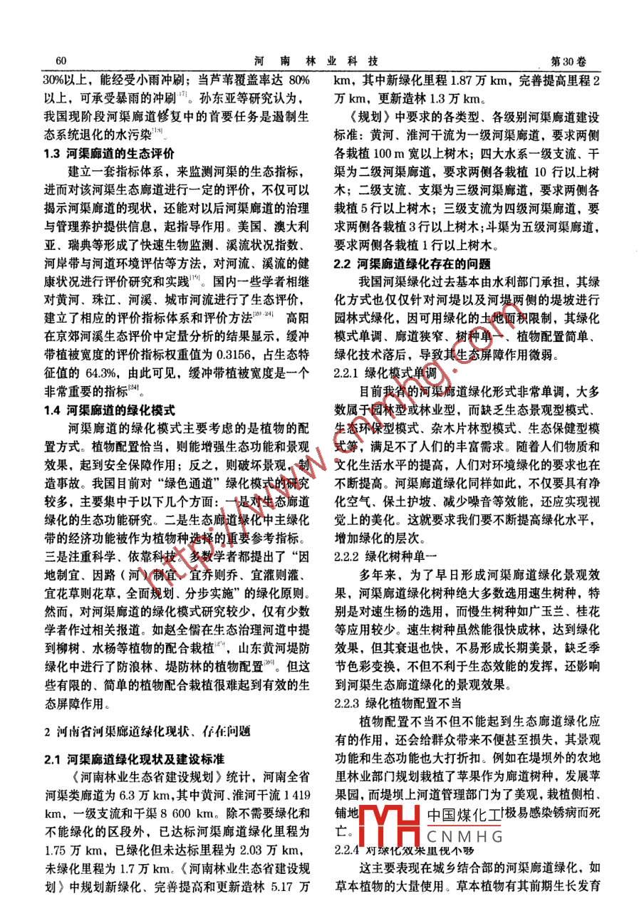 第30卷第3期河南林業(yè)科技Vo!. :30 No.22010年9月.Journal of Henan Forestry Science and TechnologySep. 2010河南省河渠廊道綠化現(xiàn)狀李福英',汪澤軍”,平凡, 郭倍倍'. (1.新鄉(xiāng)市林業(yè)技術(shù)推廣站,河南453003; 2.河南省林業(yè)技術(shù)推廣站,鄭州450008;3.河南省野生動(dòng)物救護(hù)中心,鄭州450044 )摘要:闡述了目前河渠廊道研究及河南省河渠廊道綠化的現(xiàn)狀及存在的問(wèn)題,對(duì)今后河南河渠廊道綠化提出關(guān)鍵詞:廊道;河渠廊道;現(xiàn)狀中圖分類號(hào): S731.52文獻(xiàn)標(biāo)識(shí)碼: B文章編號(hào): 1003- 2630 ( 2010 ) 01-0059網(wǎng)絡(luò)的構(gòu)建,終將改變景觀生態(tài)破碎的現(xiàn)狀,形成1國(guó)內(nèi)外河渠廊道研究概況宏偉壯觀的大地景觀生態(tài)系統(tǒng)。1.1廊道與河渠廊道基本概念河渠廊道的研究源于人們對(duì)于“河流近自然的在景觀生態(tài)學(xué)中,廊道是指主要由植被、水體治理”觀念,這種觀念在于進(jìn)行河道治理時(shí)要維護(hù)等生態(tài)性結(jié)構(gòu)要素構(gòu)成的,具有保護(hù)生物多樣性.或創(chuàng)造河流的生態(tài)多樣性”與國(guó)外 “自然型河道”過(guò)濾污染物、防止水土流失.防風(fēng)固沙、調(diào)控洪水不同的是,我國(guó)學(xué)者提出要減輕人為活動(dòng)對(duì)河流的等生態(tài)服務(wù)功能,不同于周圍景觀基質(zhì)的帶狀或線影響,維持河流環(huán)境多樣性、物種多樣性,水利工狀景觀要素".后來(lái),綠色通道"、遺產(chǎn)廊道'等概程建設(shè)要注意保護(hù)和恢復(fù)河流生物多樣性,構(gòu)建健念的出現(xiàn),豐富了廊道的內(nèi)涵??档摹吧鷳B(tài)河流”系統(tǒng)”。最近,一些學(xué)者開(kāi)始將生態(tài)廊道,是具有一定寬度的條帶狀區(qū)域,該河流作為“生態(tài)廊道”進(jìn)行研究,Bennet認(rèn)為: 岸區(qū)域具有重要的生態(tài)功能,對(duì)水和礦質(zhì)養(yǎng)分的徑流邊帶生態(tài)系統(tǒng)具有廊道功能";朱寶光等學(xué)者通過(guò)起著調(diào)節(jié)作用,可抵御洪水,減少淤積和土壤肥力對(duì)三江平原濃江河濕地生態(tài)廊道周邊春季鳥(niǎo)類多損失,并能促進(jìn)廊道內(nèi)動(dòng)植物沿廊道遷徙,生態(tài)廊樣性進(jìn)行調(diào)查,發(fā)現(xiàn)生態(tài)廊道的面積對(duì)于保護(hù)廊道道理論目前已經(jīng)被廣泛應(yīng)用在生態(tài)恢復(fù).應(yīng)用生態(tài)的功能具有重要意義”;姜明等以三江平原濃江河學(xué)及生物保護(hù)領(lǐng)域之中1.習(xí)。它和“綠色廊道”表示濕地生態(tài)廊道為例研究了濕地生態(tài)廊道設(shè)計(jì)的理的是同一個(gè)概念,美國(guó)保護(hù)管理協(xié)會(huì)從生物保護(hù)的論、模式,并做了實(shí)踐性檢驗(yàn)角度出發(fā),將生態(tài)廊道定義為“供野生動(dòng)物使用的1.2河渠廊道的生態(tài)修復(fù)狹帶狀植被,通常能促進(jìn)兩地間生物因素的運(yùn)動(dòng)”國(guó)外最早的河渠廊道生態(tài)修復(fù)起源于對(duì)河流河渠廊道是生態(tài)廊道的一個(gè)部分,是指對(duì)河使用綜合方法進(jìn)行治理,以期兼顧到人類與自然環(huán)流、水渠進(jìn)行合理帶狀或線狀綠化,將湖泊、森林境兩方面利益",其后,開(kāi)始了河渠廊道生態(tài)系統(tǒng)等不同的斑塊連接起來(lái),達(dá)到生物遷徙所需植物、修復(fù)的系統(tǒng)研究”。學(xué)者們普遍認(rèn)為生態(tài)廊道能夠水體要求,符合景觀生態(tài)標(biāo)準(zhǔn),具備廊道生態(tài)服務(wù)控制水體污染物質(zhì)的進(jìn)出,為水生生物提供一一個(gè)良功能的生態(tài)廊道。河渠廊道綠化建設(shè)是河南林業(yè)生好的生息場(chǎng)所,能夠提高水體的凈化能力”同。我態(tài)省建設(shè)的重要組成部分,是整個(gè)生態(tài)防護(hù)體系的國(guó)河渠廊道生態(tài)系統(tǒng)建立意識(shí)較早,早在隋朝時(shí)期骨架和動(dòng)脈,是農(nóng)田防護(hù)林體系的骨架和組成部就在大運(yùn)河兩岸大堤.上種植柳樹(shù),既穩(wěn)固了河堤,分,是聯(lián)系“兩區(qū)”,“兩點(diǎn)” 的重要生態(tài)通道”。又美化了景觀。近代,我國(guó)掀起了河渠廊道生態(tài)修與“綠色通道”中的河渠綠化相比,生態(tài)廊道的概復(fù)的研究熱潮。在護(hù)坡中,一般是采用活體植物的念更科學(xué)、更合理、更適合于時(shí)代的需要,更符合根.莖成姑選你斗古增材料汝到固土護(hù)堤的作用?,F(xiàn)代林業(yè)的發(fā)展方向和要求,它克服了“綠色通道”研究YH中國(guó)煤化工響到巖土層";植景觀效果差、生態(tài)功能殘缺不全的缺點(diǎn)。河渠廊道被覆CNMHG,如蘆葦覆蓋率達(dá)收稿日期: 209-05-1860河南林業(yè)科技第30卷30%以上,能經(jīng)受小雨沖刷;當(dāng)蘆葦覆蓋率達(dá)80% km, 其中新綠化里程1.87萬(wàn)km,完善提高里程2以上,可承受暴雨的沖刷"。孫東亞等研究認(rèn)為,萬(wàn)km,更新造林1.3萬(wàn)km。我國(guó)現(xiàn)階段河渠廊道修復(fù)中的首要任務(wù)是遏制生《規(guī)劃》中要求的各類型、各級(jí)別河渠廊道建設(shè)態(tài)系統(tǒng)退化的水污染"”。標(biāo)準(zhǔn):黃河、淮河千流為一級(jí)河渠廊道,要求兩側(cè)1.3河渠廊道的生態(tài)評(píng)價(jià)各栽植100m寬以上樹(shù)木;四大水系一級(jí)支流、干建立一套指標(bi