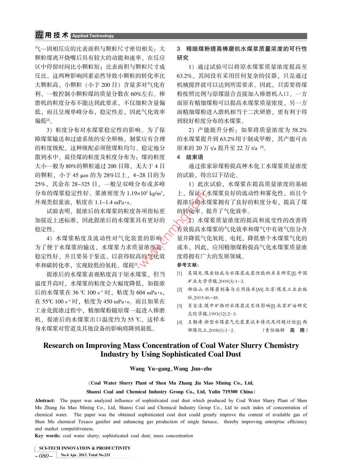 Applied Technology應用技術文章編號:1674-9146(2013)04-0079-02精煤粉提高化z用水湛漿質量度酚研究王渝崗,王俊哲陜煤集團神木張家峁礦業(yè)有限公司水煤漿廠,陜西榆林71930)摘要:分析了陜煤集團神木張家峁礦業(yè)公司水煤漿廠生產的精細煤粉對神木化工水煤漿提濃后的各項指標影響,得出應用張家峁礦業(yè)公司的精細煤粉可大大提高神木化工 Texaco氣化爐的有效氣體成分的含量,提升單爐產氣量的結論,從而提高企業(yè)效益及市場競爭力關鍵詞:水煤漿;精細煤粉;質量濃度中圖分類號:TQ536文獻標志碼:ADol:10.3969/is.1674-9146.2013.04079神華集團神木化學工業(yè)有限公司采用的是車間生產的水煤漿,其主要數據分析為:質量濃度Texaco氣化爐,其氣化原理是通過特殊噴嘴將氣化為58.2%、粘度為230.8mPa·s、粒度分布為D14=劑混合夾帶煤漿,送人氣化爐膛內,然后在高溫條10μm;D50=64.65μm;D54=74.5μm;D100件下原料迅速燃燒,此過程會產生大量熱量。產生420.6m。的煤焦被氣化同時干餾產物迅速分解,最終產物為試驗用煤粉為張家峁礦業(yè)公司水煤漿廠生產的含一氧化碳和氫氣的煤氣及熔渣,然后運用最終產精細煤粉。物合成甲醇。通過現場采樣化驗測得神木化學工業(yè)2)試驗儀器。激光粒度分布儀BT-2001、紅生產的水煤漿特點為:粘度低,便于泵送霧化,但外水分測定儀DNS16、天平FA2004、電子天平其質量濃度較低,從理論上講,水煤漿含水質量分TP-5200、水煤漿粘度計NXS-4C、電動攪拌器AN數大于10%,氣化和燃燒時吸收熱量,尤其是相尼昂變熱的增加,會造成熱量浪費。所以,針對其水煤3)試驗方法。用水煤漿廠生產的精細煤粉作漿特點,對其進行了提濃試驗。并且系統(tǒng)地闡述了為提濃介質,對神木化學工業(yè)有限公司水煤漿進行水煤漿提濃對 Texaco氣化爐的影響提濃,應用化驗設備對水煤漿的變化進行分析,從1試驗部分而得出最佳質量濃度、粘度及粒度分布的水煤漿。1)試驗材料。神木化學工業(yè)有限公司水煤漿通過試驗得到最佳的試驗數據,見表1。表1水煤漿提濃前后數據水煤漿質量濃度粘度粒度分布流動性原水煤漿D14=10,D50=6465,D54=74.5,D100=420.6提濃后水煤漿720D20=10,D50=35.15,D76=74.5,D100=3902試驗結果分析降低,有效氣體成分含量減少,嚴重影響了單爐1)水煤漿質量濃度對氣化的影響。據了解,氣量及系統(tǒng)的生產負荷棒磨機的出漿質量分數只能維持在58%-61%。通過提濃試驗將水煤漿質量濃度從58.2%提升運行一段時間后,棒磨機岀漿質量分數最低降至至63.2%,如果使用精細煤粉提濃,將提髙水煤漿57%(出現棒磨機斷裂現象導致)。由于煤漿質量的質量濃度,更有利于提高氣化效率和有效氣量分數波動較大且穩(wěn)定性差,就會出現水煤漿質量分2)水煤漿粒度分布對氣化效率的影響。煤的數低至57%的情況。這樣就會使氣化爐的發(fā)氣強度粒度對碳的轉化率影響很大,因為煤粒停留時間、收稿日期:2013-02-17;修回日期:2013-03-19作者簡介:王渝崗(1986-),男,陜西榆林人,助理工程師,主要從事干法制備水煤漿項目研究,E-mail:dove四u@126.comd科技創(chuàng)新與生產力13年4月總第231期」-079應用技術 Applied Technology氣—固相反應的比表面積與顆粒尺寸密切相關:大3精細煤粉提高棒磨機水煤漿質量濃度的可行性顆粒煤離開燒嘴后具有較大的動能和速率,在反應研究區(qū)中停留時間比小顆粒短;比表面積與顆粒尺寸成1)通過試驗可以將原水煤漿質量濃度提高至反比。這兩種影響因素必然導致小顆粒的轉化率比63.2%,其間沒有采用任何復雜的儀器,只是通過大顆粒高,小顆粒(小于200日)含量多對氣化有機械攪拌就可以達到所需要求。因此,只需要將煤利,一般控制小顆粒煤的質量分數在60%左右。棒粉按照比例與原煤混合直接加入棒磨機入口,一方磨機的粒度分布不能達到此要求,不僅細粒含量偏面原有精細煤粉可以提高水煤漿質量濃度,另一方低,而且呈現單峰分布,穩(wěn)定性差,因此氣化效率面精細煤粉進入磨機相當于二次硏磨,更有利于得偏低2。到較好粒度分布的水煤漿。3)粒度分布對水煤漿穩(wěn)定性的影響。為了保2)產能提升分析:如果將質量濃度為582%障煤漿輸送和過濾系統(tǒng)的安全順暢,制漿應有合理的水煤漿提升到63.2%用于制成甲醇,其產能可由的粒度級配,這種級配必須使煤粒均勻、穩(wěn)定地分原來的20萬ta提升至22萬taH散到水中。最佳煤的粒度及粒度分布為:煤的粒度4結束語大小一般為80%的顆粒通過200目篩,無大于4目通過張家峁煤粉提高神木化工水煤漿質量濃度的顆粒,小于45μm的為28%以上,4~28目的為的試驗,得出以下結論25%,其余在28~325目,一般呈雙峰分布或多峰1)此次試驗,水煤漿在提高質量濃度的基礎分布的煤漿穩(wěn)定性好。漿液密度為1.19×103kg/m3,上,保證了水煤漿良好的流動性和霧化性,而且令外觀類似重油,粘度在1.1~1.4mPas提濃后的水煤漿擁有了良好的粒度分布,提高了煤試驗表明,提濃后的水煤漿的粒度各項指標更的轉化率、提升了氣化效率加接近上述標準,因此提濃后的水煤漿具有更好的2)水煤漿質量濃度的提高和流變性的改善將穩(wěn)定性有效提高水煤漿的氣化效率和煤氣中有效氣組分含4)水煤漿粘度及流動性對氣化裝置的影響。量并降低氣化氧耗、電耗,降低整個水煤漿氣化的為了便于水煤漿的輸送,水煤漿力求質量濃度高、成本,因此,應用精細煤粉提高氣化水煤漿質量濃穩(wěn)定