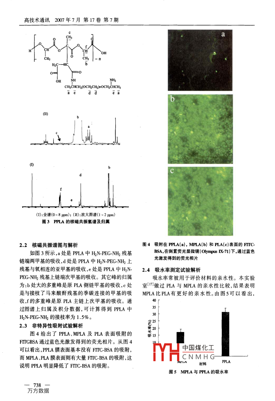 高技術(shù)通訊2007年7月 第17卷第7期新型聚乙二醇接枝聚乳酸及其降解特性研究T趙明媚②潘君③吳楊蘭劉穎李永剛王遠(yuǎn)亮(重慶大學(xué)生物工程學(xué)院重慶 4004)滴要通過直接酰胺化反應(yīng),以馬來酸酐本體改性聚乳酸(MPLA)和氨基封端聚乙二醇(H2N-PEG-NH2)為原料,合成了聚乙二醇本體改性聚乳酸(PPLA)。通過紅外、核磁共振技術(shù)對改性聚合物的結(jié)構(gòu)進(jìn)行了表征;采用FTC標(biāo)記牛血清白蛋白(FTTC-BSA)為模型蛋白質(zhì),測試了聚合物對蛋白質(zhì)的非特異性吸附;利用吸水率表征了聚合物的親水性;利用聚合物在12周降解過程中pH值、失重率的變化評價(jià)了它們的降解特性。結(jié)果表明:HN-PEG-NH2已成功接枝到MPLA上;與聚乳酸(PLA)、MPLA相比,PPLA明顯降低了對FTTC-BSA的吸附;其親水性和降解性增加。預(yù)計(jì)該材料將是一種更適合組織工程和藥物緩釋應(yīng)用的聚乳酸類可降解材料。關(guān)鍵詞聚乙二醇, 聚乳酸,接枝,親水性,降解性循環(huán)時(shí)間也增加[5)。聚乳酸與PEG的三嵌段共聚0引言物( PLA-PEG-PLA)可提高材料的親水性降解速率聚乳酸(PLA)是研究最早的聚酯類生物可降解和生物相容性[16]。材料之一。早在1966年, Kulkarmi等[1]就指出PLA本實(shí)驗(yàn)室1[7,18]采用馬來酸酐(MA)、乙二胺對在體內(nèi)降解生成的最終產(chǎn)物是CO2和H20,其中間PLA進(jìn)行了本體接枝改性,在PLA側(cè)鏈上引入了羧代謝產(chǎn)物乳酸是體內(nèi)正常代謝產(chǎn)物,不會在體內(nèi)蓄基和氨基,維持了聚乳酸的主鏈結(jié)構(gòu),親水性明顯增積,在藥物控釋體系[2]和組織再生3]等方面已有大加,降解過程不出現(xiàn)pH值陡降現(xiàn)象。本研究在此量應(yīng)用?;A(chǔ)上,通過聚乙二醇( PEG)對PLA進(jìn)行本體接枝研究顯示,親水性的表面有利于細(xì)胞黏附生改性,旨在維持降低PLA對蛋白質(zhì)的非特異性吸長[4.5) ,材料的親水性好,對細(xì)胞的親和性則好[6.7]。附,提高其親水性,從而提高它在藥物緩釋及組織工在藥物緩釋領(lǐng)域,需要藥物載體在血液中有足夠的程中的應(yīng)用性能。經(jīng)文獻(xiàn)檢索,采用本體接枝的方停留時(shí)間,以充分地釋放和利用藥物[8]。而在靶向法引人PEG的研究未見報(bào)道。藥物緩釋中,需要幾個(gè)基本的條件才能實(shí)現(xiàn),其中就1實(shí)驗(yàn)部分包括降低非特異性的相互作用[9]。隨著組織工程的發(fā)展,需要支架通過特異性的受體介導(dǎo)支架材料和1.1材料的制備細(xì)胞之間的相互作用,以調(diào)節(jié)細(xì)胞的生長,而要實(shí)現(xiàn)馬來酸酐接枝聚乳酸(MPLA):根據(jù)文獻(xiàn)[14]自.這種調(diào)節(jié)作用,首先就需要控制細(xì)胞和支架材料間制,馬來酸酐的接枝率為2.36% , Mw = 44960。分別的非特異性相互作用10.1]。由于PLA親水性差,缺取1.000g MPLA和0. 587g氨基封端聚乙二醇(H2N-少抗非特異性蛋白吸附的能力,導(dǎo)致其對細(xì)胞的黏PEG-NH2 ,Sigma, Mw = 600)用四氫呋喃溶解(THF:重附力弱,也導(dǎo)致其微球在體內(nèi)的循環(huán)時(shí)間短[12]。慶試劑公司,分析純)溶解。將HN-PEG-NH2溶液研究表明,聚乳酸與聚乙二醇(PEG)的兩嵌段置圓底燒瓶中,水浴50~ 55C攪拌條件將MPLA溶共聚物(PLA-PEG)可以提高材料的親水性、降解速液滴加到圓底燒瓶中。滴加完畢后保溫2h,反應(yīng)產(chǎn)率及藥物在材料內(nèi)的分布情況[13] ,延長其微球的在物通過THF-水體系純化,提純直至溶液中無H2N-體循環(huán)時(shí)間[4);隨著表面PEG濃度的增加,其在體PEG-中國煤化工上分析,-般進(jìn)行3YHCNMHG0國家自然科學(xué)基金300084)和國家“111 計(jì)劃一生 物力學(xué)與組織修復(fù)工程"資助項(xiàng)目。女,1978年生,碩士;研究方向:生物材料; E-mail: chaoningmei@ 163. com河作E:iligaorj@ cqu. edu.cn- 736.. -趙明媚等:新型聚乙二醇接枝聚乳酸及其降解特性研究遍。收集沉淀,將沉淀物在室溫下真空干燥48h,得重率% weight loss,計(jì)算公式為:到H2N-PEG-NH2本體改性聚乳酸(PPLA)產(chǎn)品。% weight loss =W1- W2x 100%1.2 儀器與方法W1- Wo .1.2.1 紅外光譜以THF為溶劑,在KBr晶體上通過溶劑揮發(fā)鑄2結(jié)果與討論膜法制膜,用紅外光譜儀( Perkin- Elmer Spectrum GX2.1 紅外譜圖與解析model)記錄聚合物在400 ~ 400em的吸收光譜。圖1給出了PPLA 的合成機(jī)理。如圖1所示,H2N-PEG-NH2通過與MPLA發(fā)生N-?;磻?yīng),生成1.2.2核磁共振譜以氘代氯仿(CDC])為溶劑,四甲基硅烷(TMS).了PPLA。 圖2給出了MPLA與PPLA的紅外圖譜。為內(nèi)標(biāo),用核磁共振波譜儀( Bruker AV 400 0 model )從中看出,與MPLA的紅外圖譜相比, PPLA在測定PPLA的'H-NMR譜圖。.1634cm~'和1577cm~l出現(xiàn)了酰胺鍵的特征-N-H-彎1.2.3 FITC標(biāo)記牛血清白蛋白(FTC-BSA)在聚合曲振動吸收新峰,3100 ~ 3700 cm-1的峰比MPLA的物材料表面的非特異性吸附強(qiáng)度大大提高,這是PPLA中-0H、-NH2 -CONH伸縮分別稱取0. 1g PPLA、MPLA和PLA,用5mL THF振動峰重疊的結(jié)果。圖2結(jié)果顯示,MPLA經(jīng)反應(yīng).溶解,在直徑為9cm的培養(yǎng)皿內(nèi)通過溶劑揮發(fā)48h后已經(jīng)生成PPLA。.成膜,室溫真空干燥至恒重。將10mL、濃度為0.02mg/mL的FTC BSA(Sigma)水溶液加入含聚合物膜的培養(yǎng)皿中,379C靜態(tài)孵育30min,倒掉上清液,CHOH用蒸餾水洗去未吸附的FITC BSA,通過熒光分光光CHsCH3度計(jì)檢測,直至水洗液中檢測不到熒光為止。在倒置熒光顯微鏡(Olympus IX-71
