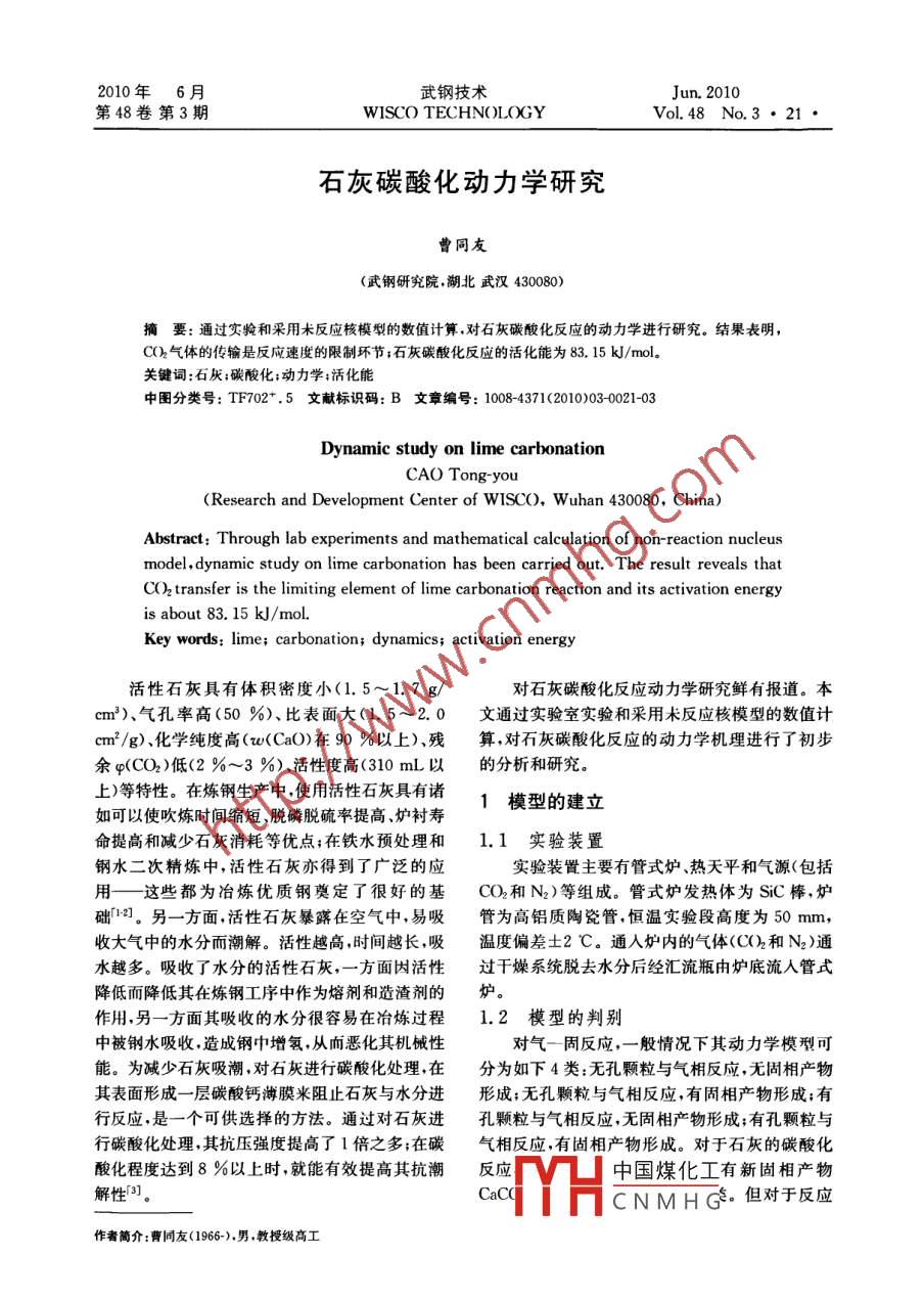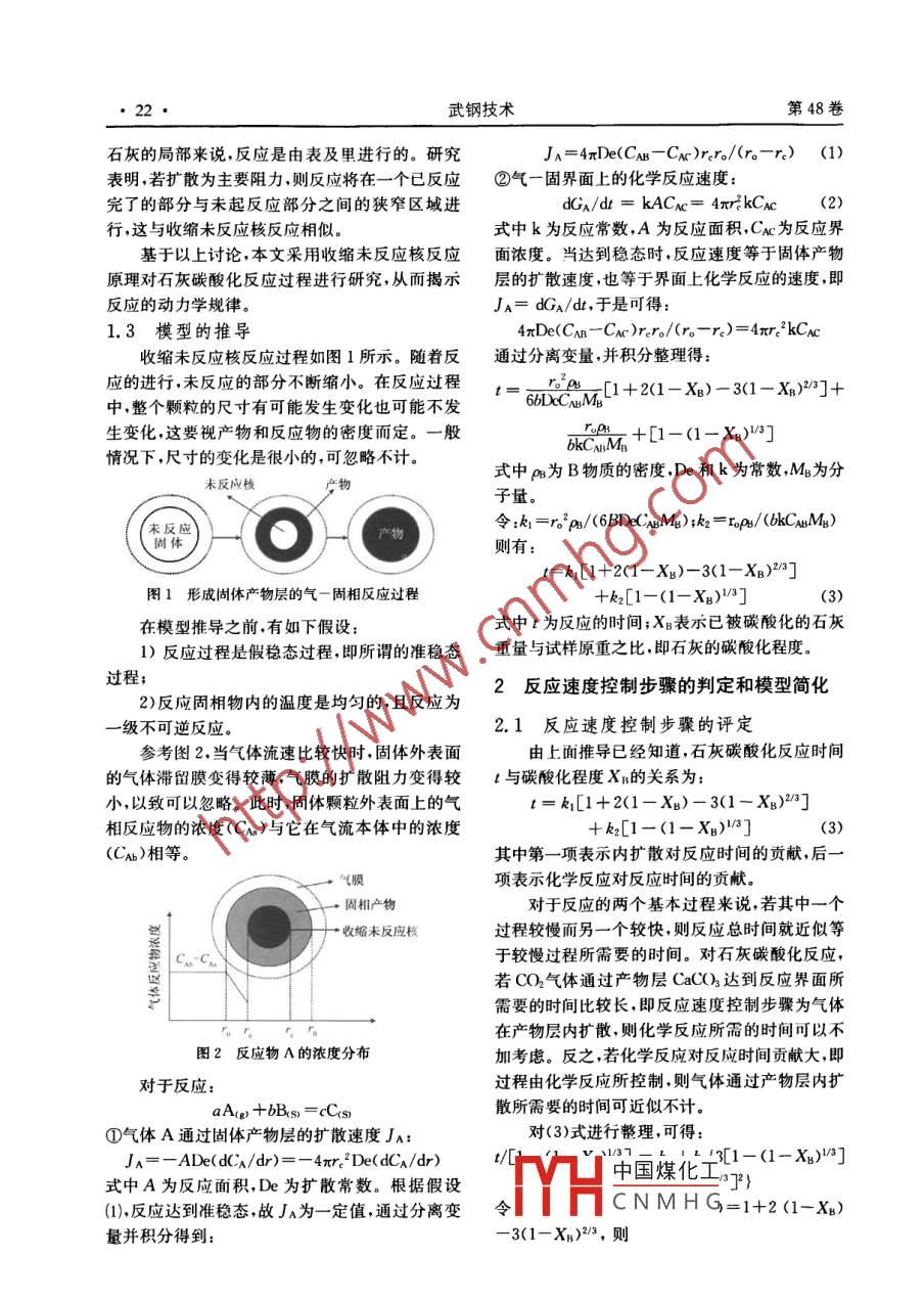 2010年6月武鋼技術(shù)Jun.2010第48卷第3期WISCO TECHNOLOGYVol.48No.3·21·石灰碳酸化動力學(xué)研究曹同友(武鋼研究院湖北武漢430080)摘要:通過實驗和采用未反應(yīng)核模型的數(shù)值計算,對石灰碳酸化反應(yīng)的動力學(xué)進行研究。結(jié)果表明,Ch氣體的傳輸是反應(yīng)速度的限制環(huán)節(jié);石灰碳酸化反應(yīng)的活化能為83.15k/mol關(guān)鍵詞:石灰;碳酸化;動力學(xué);活化能中圖分類號:TF702+.5文獻標識碼:B文章編號:1008-4371(2010)030021-03Dynamic study on lime carbonationCAO Tong-you( Research and Development Center of wIsco, Wuhan 430080, China)Abstract: Through lab experiments and mathematical calculation of non-reaction nuclermodel, dynamic study on lime carbonation has been carried out. The result reveals thatCO2 transfer is the limiting element of lime carbonation reaction and its activation energyis about 83. 15 kJ/moL.Key words: lime; carbonation; dynamics; activation energy活性石灰具有體積密度小(1.5~1.7g/對石灰碳酸化反應(yīng)動力學(xué)研究鮮有報道。本cm3)、氣孔率高(50%)、比表面大(1.5~2.0文通過實驗室實驗和采用未反應(yīng)核模型的數(shù)值計cm2/g)化學(xué)純度高(v(CaO)在90%以上)殘算,對石灰碳酸化反應(yīng)的動力學(xué)機理進行了初步余gCO2)低(2%~3%)活性度高(310mL以的分析和研究。上)等特性。在煉鋼生產(chǎn)中使用活性石灰具有諸1模型的建立如可以使吹煉時間縮短、脫磷脫硫率提高、爐襯壽命提高和減少石灰消耗等優(yōu)點;在鐵水預(yù)處理和1.1實驗裝置鋼水二次精煉中,活性石灰亦得到了廣泛的應(yīng)實驗裝置主要有管式爐、熱天平和氣源(包括用——這些都為冶煉優(yōu)質(zhì)鋼奠定了很好的基CO2和N2)等組成。管式爐發(fā)熱體為SiC棒,爐礎(chǔ)1。另一方面,活性石灰暴露在空氣中,易吸管為高鋁質(zhì)陶瓷管,恒溫實驗段高度為50mm收大氣中的水分而潮解?;钚栽礁?時間越長,吸溫度偏差士2℃。通入爐內(nèi)的氣體(C(2和N2)通水越多。吸收了水分的活性石灰,一方面因活性過干燥系統(tǒng)脫去水分后經(jīng)匯流瓶由爐底流入管式低而降低其在煉鋼工序中作為熔劑和造渣劑的爐作用,另一方面其吸收的水分很容易在冶煉過程1.2模型的判別中被鋼水吸收,造成鋼中增氫從而惡化其機械性對氣一固反應(yīng),一般情況下其動力學(xué)模型可能。為減少石灰吸潮,對石灰進行碳酸化處理在分為如下4類:無孔顆粒與氣相反應(yīng),無固相產(chǎn)物其表面形成一層碳酸鈣薄膜來阻止石灰與水分進形成;無孔顆粒與氣相反應(yīng),有固相產(chǎn)物形成;有行反應(yīng),是一個可供選擇的方法。通過對石灰進孔顆粒與氣相反應(yīng),無固相產(chǎn)物形成;有孔顆粒與行碳酸化處理,其抗壓強度提高了1倍之多;在碳氣相反應(yīng),有固相產(chǎn)物形成。對于石灰的碳酸化酸化程度達到8%以上時就能有效提高其抗潮反應(yīng)中國煤化工有新固相產(chǎn)物解性3。CaCCCNMHG但對于反應(yīng)作者簡介:曹同友(1966-)男教授級高工武鋼技術(shù)第48卷石灰的局部來說,反應(yīng)是由表及里進行的。研究JA=4rDe(CAB-CASr ro/(ro-re)(1)表明,若擴散為主要阻力則反應(yīng)將在一個已反應(yīng)②氣一固界面上的化學(xué)反應(yīng)速度:完了的部分與未起反應(yīng)部分之間的狹窄區(qū)域進dGA/dt= kACAc= 4xr? kCAc(2)行,這與收縮未反應(yīng)核反應(yīng)相似。式中k為反應(yīng)常數(shù),A為反應(yīng)面積,CAC為反應(yīng)界基于以上討論,本文采用收縮未反應(yīng)核反應(yīng)面濃度。當達到穩(wěn)態(tài)時,反應(yīng)速度等于固體產(chǎn)物原理對石灰碳酸化反應(yīng)過程進行研究,從而揭示層的擴散速度,也等于界面上化學(xué)反應(yīng)的速度,即反應(yīng)的動力學(xué)規(guī)律。JA= dGA/dt,于是可得:1.3模型的推導(dǎo)4De(CAB-CAC) ro/(ro-rs=4rr kCac收縮未反應(yīng)核反應(yīng)過程如圖1所示。隨著反通過分離變量,并積分整理得應(yīng)的進行,未反應(yīng)的部分不斷縮小。在反應(yīng)過程中,整個顆粒的尺寸有可能發(fā)生變化也可能不發(fā)t= b6dkeCMAI1+21-X)=3(1-x)2+生變化,這要視產(chǎn)物和反應(yīng)物的密度而定。一般nx+[1-(1-XB)/3]情況下,尺寸的變化是很小的,可忽略不計。式中為B物質(zhì)的密度De和k為常數(shù),M4為分未反應(yīng)核產(chǎn)物子量令:k1=3Am/(6 BEcalM);k2=工e/(bCM)產(chǎn)物則有:k1[1+2(1-XB)-3(1-XB)23]圖1形成固體產(chǎn)物層的氣一固相反應(yīng)過程+k2[1-(1-XB)13](3)在模型推導(dǎo)之前,有如下假設(shè):式中t為反應(yīng)的時間;XB表示已被碳酸化的石灰1)反應(yīng)過程是假穩(wěn)態(tài)過程,即所謂的準穩(wěn)態(tài)重量與試樣原重之比,即石灰的碳酸化程度。過程;2反應(yīng)速度控制步驟的判定和模型簡化2)反應(yīng)固相物內(nèi)的溫度是均勻的,且反應(yīng)為級不可逆反應(yīng)。2.1反應(yīng)速度控制步驟的評定參考圖2,當氣體流速比較快時,固體外表面由上面推導(dǎo)已經(jīng)知道,石灰碳酸化反應(yīng)時間的氣體滯留膜變得較薄,氣膜的擴散阻力變得較t與碳酸化程度XB的關(guān)系為小,以致可以忽略。此時固體顆粒外表面上的氣t=k[1+2(1-XB)-3(1-XB)2/3]相反應(yīng)物的濃度(CA)與它在氣流本體中的濃度+k2[1-(1-XB)13](3)(CAb)相等其中第一項表示內(nèi)擴散對反應(yīng)時間的貢獻,后一項表示化學(xué)反應(yīng)對反應(yīng)時間的貢獻對于反應(yīng)的兩個基本過