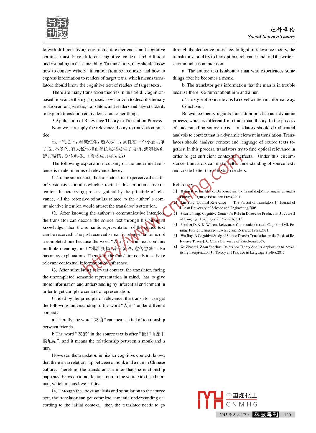 社科學(xué)論Social Science TheoryA Study on Translation ProcessBased on Relevance Theory吳競(Harbin University of Commerce, Haerbin, Heilongjiang 150028)Abstract Relevance theory belongs to the field of pragmatics. Translation is a kind of communicative activity in nature. Inthe frame of relevance theory, translation is the process of cognition and inference. This paper focuses on the study of trans-lation process on the basis of relevance theory in order to improve the practice of translation.Key words relevance theory; inference; optimal relevance中圖分類號(hào):H315.9文獻(xiàn)標(biāo)識(shí)碼:ADOI:10.16400/j.cnki.kjdkx.2015.08.069Introductiontexts. According to relevance theory, context of source texts isTranslation is a kind of transcultural and translingual activ-very important if translators want to interpret source texts exactly.ity of communication essentially. Based on relevance theory,Translators need to find optimal relevance of context by analysistranslation can be seen as an ostensive-inferential process. Trans-of context in order to get cognitive effects of source texts. Contextlators should know the intention of communicators and expecta-in relevance theory refers to cognitive context in which com-The quality of target texts relies on convergence of relevant ele-cessful communication relies on assumptions that speakers wantments between source texts and target texts.to convey and that hearers select from cognitive context. Transla-1 Introduction of Relevance Theorytion is an inferential process which includes communicative in-Sperber & Wilson first introduced relevance theory in Rele-tention from communicators' ostensiveness. Relevance theoryvance: Communication and Cognition in 2001. This theory rese-proposes lingual communication is mutual manifestness fromarches inferential process of information communication, espe-cognition to inference.cially discourse interpretation principle in exploring lingual com-The second step is to find relevance, which depends on themunication.information that translators possess and source texts offer. As we1.1 Ostensiveness and Inferenceknow, the degree of relevance is related to inferential efforts andRelevance theory takes lingual ccognitive effects. Everyone has a potential context in their brainsive-inferential cognitive activity, a process in which communi- where lots of information is stored. Translators should try to ma-cators recognize cognitive context again and do mutual manifes-tch intention from writers of source texts with expectation of re-tness. Ostensiveness from writers of source texts can offer someaders of target textsrelevant information and cognitive context that translators can in-Optimal relevance in translation process is a dynamic con-fer. Translators can find optimal relevance and infer communicat-cept. Translators should find the assumptions that writers of sou-ive intention from cognitive context of writer' s ostensive stimu- rce texts convey to readers of source texts. In this process, trans-lation. In different cognitive contexts, the understanding of thelators should infer from the source texts. At the same time, trans-same source text is different. Because different translators have lators should know the cognitive context of readers from targetdifferent cognitive contexts and structures, implicit conclusionstexts, that is, whether contextual assumption that writers of sou-can reach from the discourse interpretation.rce texts want to convey exists in the potential context of readers1.2 Optimal Relevanceof target texts. Context formed in source texts cannot be changed,According to relevance theory, successful communicationand meanings in that context is fixed in source texts. Therefore,needs two conditions: one is mutual manifestness from two-sidetranslators cannot add new understanding to meanings in sourcecommunicators, the other is optimal cognitive mode- relevance.texts randomly. In translation, writers of source texts have differ-Relevance is a relative concept, which depends on cognitive ef-fect and degree of inference. Here is a formula: degree of rele-rce texts is unequal to that from target texts. Moreover, informa-vance= cognitive effect/ inferential efforts.tion from target texts is based on the understanding of readers2 Translation Process on the Basis of Relevance Theorywhen they read target texts. In translation, writers of source texts,Translation is seen as a communicative activity in terms of translators and中國煤化Ieractive with eachrelevance theory. In translation, the first step is to interpret sourceother, formingMYHCNMHGance theory, peop-144 科教導(dǎo)刊 2015年8月(下)社科學(xué)論:Social Science Theoryle with different living environment, experiences and cognitive through the deductive inference. In light of relevance theory, theabilities must have different cognitive context and different translator should try to find optimal relevance and find the writer'understanding to the same thing. To translators, they should know s communication intention.how to convey writers' intention from source texts and how to .express information to readers of target texts, which means trans- things after he becomes a monk.lators should know the cognitive text of readers of target texts.b. The translator gets information that the man is in troubleThere are many translation theories in this field. Cognition- because there is a rumor about him and a nun.based relevance theory proposes new horizon to describe ternaryc.The style of source text is la novel written in informal way.relation among writers, translators and readers and new standardsConclusionto explore translation equivalence and other things.Relevance theory regards translation practice as a dynamic3 Application of Relevance Theory in Translation Processprocess, which is different from traditional theory. In the processNow we can apply the relevance theory to translation prac- of understanding source texts,