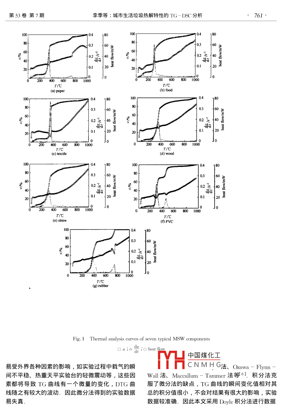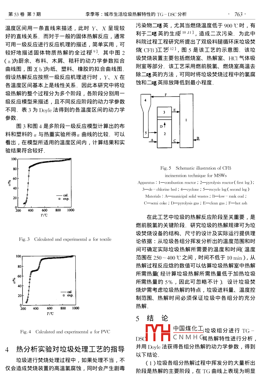 第53卷第7期化工報(bào)Vol 53 No72002年7月Chemical Industry and Engineering China)July 2002CCCCCCC二研究簡報(bào)8城市生活垃圾熱解特性的TG-DSC分析李季張錚楊學(xué)民姚建中林偉剛中國科學(xué)院過程工程研究所多相反應(yīng)開放研究實(shí)驗(yàn)室,北京100080)關(guān)鍵詞城市生活垃圾熱重分析差示掃描量熱分析熱解特性動力學(xué)參數(shù)中圖分類號Ⅹ705文獻(xiàn)標(biāo)識碼文章編號0438-1157(2002)07-0759-0TG-DSC STUDY ON PYROLYSIS CHARACTERISTICSOF MUNICIPAL SOLID WASTESLI Ji, ZHANG Zheng, YANG Xuemin, YAO Jianzhong and Lin WeigangMulti-phase Reaction Laboratory, Institute of Process Engineering, Chinese Academy of Sciences, Beijing 100080, ChinaAbstract Seven typical componentssolid wastes( MSWs )paper, food, textiletraw plastic and rubber were chosen as the thermogravimetric analysis samples in this paper to study thepyrolysis characteristics. By the thermogravimetry and differential scanning calorimetry( Tg-DSC analysispyrolysis characteristics of Msws components and pyrolysis endothermal enthalpy were obtained. The kineticof pyrolysis were determined with the doyle method and a multi-stage first order pyrolysis modelsed. The simulated results by this model showed good agreement with the tg experimental data. THpyrolysis characteristics provide significant parameters to a new concept of circulating fluidized bed incineratorwhich can simultaneously restrain the high-temperature HCl corrosion and emission of dioxinsKeywords MSWs, thermogravimetry differential scanning calorimetry pyrolysis characteristics, kineticrameters圾揮發(fā)分含量高,熱解過程對整個(gè)垃圾焚燒過程有重要影響,國內(nèi)外學(xué)者也對不同城市垃圾的熱解特城市生活垃圾旳焚燒處理可實(shí)現(xiàn)垃圾的減量性做了相關(guān)研究-5.由于城市生活垃圾的組分多化、無害化和資源化,目前國外正大力普及這項(xiàng)技且復(fù)雜,熱解特性差別較大,因此本文重點(diǎn)針對術(shù),以獲取其中的能量用于供熱或發(fā)電.2000年種典型的可燃垃圾組分進(jìn)行了TG-DSC分析,目日本垃圾發(fā)電裝機(jī)容量已達(dá)到2000MW,并計(jì)劃的在于研究城市生活垃圾的熱解特性,獲得垃圾熱在2010年達(dá)到4000MW,2002年前在每個(gè)百萬人解的反應(yīng)動力學(xué)參數(shù)口以上的大中型城市建2~3座現(xiàn)代化垃圾發(fā)電廠裝機(jī)容量不低于30MW.目前我國也積極進(jìn)行垃圾1熱分析方法焚燒技術(shù)和焚燒設(shè)備的研究和研制.北京市朝陽區(qū)1.1實(shí)驗(yàn)儀器日處理量為1300t生活垃圾的綠色環(huán)保電站即將開中國煤化工IRAM公司的LAB工,預(yù)計(jì)并網(wǎng)后年發(fā)電量可達(dá)1.36×108kWh.SYSCNMHG行熱重-差熱(TG垃圾焚燒可分為熱解和燃燒兩個(gè)階段,由于垃DTA)和熱重左式刊描量烈TG-DSC分析2001-04-16收到初稿,2001-12-20收到修改稿Received date: 2001-04-16聯(lián)系人:林偉剛.第一作者:李季,男,28歲,博士Corresponding author: LIN Weigang, E- mail: wolin( home760化工學(xué)2002年7月12實(shí)驗(yàn)物料氣體.溫度超過250℃后,開始大量析出揮發(fā)分城市生活垃圾中的可燃組分主要可分為紙、廚主要是各類飽和烴和不飽和烴以及CO和CO,等氣余、纖維、木竹、塑料、橡膠類.本文針對這幾類體,此時(shí)的TG曲線有一個(gè)明顯的失重階段.揮發(fā)垃圾選取了紙、廚余、布料、木屑、秸稈、塑料、分在400℃左右基本析出完全,殘余的半焦在此溫橡膠這7種典型的垃圾組分進(jìn)行熱分析實(shí)驗(yàn).表1度下也開始分解,產(chǎn)生部分焦油和氣體,紙、塑料給出了各種垃圾組分的工業(yè)分析數(shù)據(jù)和橡膠的熱解過程則明顯不同:在250~450℃溫Table 1 Proximate analysis of experimental度區(qū)間揮發(fā)分大量析出;溫度繼續(xù)升高,組分中較samples( dry basis , %穩(wěn)定的聚合物開始裂解,經(jīng)歷了另一個(gè)明顯的失重ComponentsAsIFixed carbo階段.DSC曲線則顯示了各組分在整個(gè)熱解過程12.702.94中的吸、放熱過程,可以看出,布料、木屑等只有0.04個(gè)吸熱峰,紙、塑料等有兩個(gè)失重階段的組分相應(yīng)地有兩個(gè)吸熱峰.而DSC曲線吸熱峰的位置和wood0.2712.28straw82,45DTG曲線中峰的位置相吻合,表明垃圾組分在大83.7312.77量析出揮發(fā)分和聚合物裂解的過程要吸收部分32.92熱量熱解過程中揮發(fā)分的大量析出階段是整個(gè)熱解1.3實(shí)驗(yàn)條件過程中的一個(gè)重要階段.對于本實(shí)驗(yàn)中的組分,此選取的垃圾組分在N2氣氛下進(jìn)行了TG階段是熱解過程中活化能E最高的階段,并且此( thermogravimetry)和DC( differential scanning階段的失重量都較大,廚余、布料、木屑、秸稈、calorimetry)分析.反應(yīng)容器為№lO3坩堝;載氣為紙、塑料橡膠此段的失重量分別占總失重量的純度99.99%的N2,其流量為35 mf min1;升51%、74%、68%、60%、66%、64%、68%溫速率(g)為10Kmin-1;試樣主要為粉未狀表2給出了城市生活垃圾典型組分熱解的特征(0.28-0.45mm),其中紙和布料為薄片狀最大參數(shù).在g=10Kmin-的條件下(根據(jù)g的不同直徑不超過1mm);試樣的質(zhì)量為9.5-11.0mg,熱解特征參數(shù)會有所變化7),熱解起始溫度秸稈保證反應(yīng)過程中試樣的溫度均勻61;試樣在實(shí)驗(yàn)最低,紙最高,分別為236℃和304℃;揮發(fā)分析前放入105℃的恒溫爐中干燥1h出的持續(xù)時(shí)間廚余最短,橡膠最長,分別為3min2垃圾熱解特性和11min.而揮發(fā)分全部析出的溫度基本在400℃之內(nèi).同時(shí)表2也給出由D