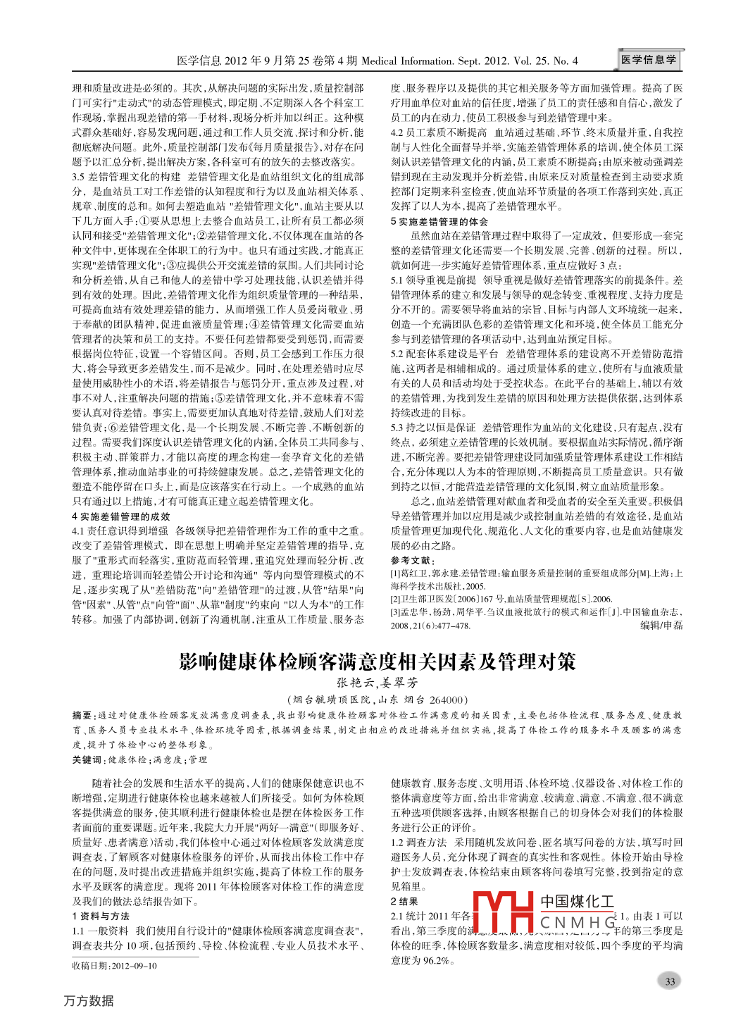 醫(yī)學信息學學信息2012年9月第25卷第4期 Medical Information.sep.2012.Ⅴol.25.No.4醫(yī)學管理血站差錯管理與應用李乃魚,張海林(寶雞市中心血站,陜西寶雞7210060摘要:差錯是一種目標導向行為,在工作中普遍存在。血站差錯管理對獻血者和受血者的安全至關(guān)重要。如何減少或控制血站差錯,是血站管理的重要內(nèi)容,也是血站管理者和研究者應積極探討和解決的問題關(guān)鍵詞:差錯;差錯防范;差錯管理;血站俗話說:"人非圣賢,孰能無過?"差錯是無處不在的,完全杜絕差等;④內(nèi)審、外審、常態(tài)審核以及管理評審中發(fā)現(xiàn)的不合格;⑤設(shè)備錯幾乎是不可能的。目前,在差錯問題上,強調(diào)從差錯中學習、改進。保養(yǎng)、維護不當致使設(shè)備能力不足引起的不合格;⑥供方的產(chǎn)品或這就涉及如何界定差錯并處理等問題服務出現(xiàn)嚴重不合格;⑦嚴重環(huán)境污染及安全事故??傊?血站差錯1差錯的內(nèi)涵及特點的產(chǎn)生貫穿于采供血服務的全過程。只有認真分析,綜合歸納這些美國食品醫(yī)藥管理局(下DA)將差錯定義為:偏離了現(xiàn)行生產(chǎn)管差錯信息,才能有的放矢的去防范和改進。理規(guī)范(Cgmp)、應用標準或現(xiàn)有規(guī)范的事件,可能影響到生物制品3.2人力資源的管理人力資源是差錯管理的重要因素。因為在實施的安全性、純度、效力,或者導致制品違反聯(lián)邦食品、醫(yī)藥、化妝品法差錯管理的過程中,發(fā)現(xiàn)一個問題,最大的阻力,不是技術(shù),不是設(shè)規(guī)或公眾衛(wèi)生服務法規(guī)。備,不是管理的其它基礎(chǔ),而是來自人的因素。血站根據(jù)《血站質(zhì)量具體而言,工作差錯有3個特點:①僅僅發(fā)生在實現(xiàn)工作目標的管理規(guī)范》制定了《崗位工作人員任職要求》,明確規(guī)定了學歷、所需行為中;②偏離了質(zhì)量管理規(guī)范、操作規(guī)程等,影響血液及制品質(zhì)技能或培訓需求、工作經(jīng)驗和職責。就如何提高員工對組織文化、價量,妨礙了目標的實現(xiàn);③應該是可以避免的。值得注意的是,有意值觀、發(fā)展戰(zhàn)略的了解和認同,如何提高知識水平、增強工作能力的錯誤行為或故意違背規(guī)則,不能認為是差錯。改善工作績效、提高工作熱情和合作精神,血站從知識更新、技能補2差錯的處理方法充、思維創(chuàng)新、觀念適應、心理潛能等方面加強培訓,最大限度消除當前,差錯的處理方法主要有2種:差錯防范和差錯管理。它們?nèi)藛T變數(shù),使工作質(zhì)量得到保障。特別是在技術(shù)或質(zhì)量改進培訓中,處理差錯中既有聯(lián)系又有區(qū)別的2種思路。從差錯防范到差錯管為了提高差錯管理的有效性,血站設(shè)計了與工作有關(guān)的模擬活動理是管理實踐經(jīng)驗發(fā)展的產(chǎn)物。采用主動學習或討論學習模式,鼓勵學員出現(xiàn)差錯,讓學員找出差2.1差錯防范其具體表現(xiàn)為:為了使工作差錯降到最低限度,血站錯并提出如何進行差錯的預防與糾正。這樣的培訓既可提高學員的投人人力、物力用于實施和完善差錯防范系統(tǒng)。如標準操作規(guī)程參與程度,増強知識或技能,又能減少類似差錯在實際工作中再次(SOP)、全員培訓、職業(yè)教育、全程質(zhì)量管理和計算機管理系統(tǒng)等。其出現(xiàn)的機率。同時,積極評價員工對本職工作的勝任能力、對差錯的具有很大局限性。主要原因是:①差錯防范不能完全杜絕差錯;②差認識態(tài)度和行為能力。對不能勝任本職工作的人員,暫停其工作,安錯防范有明顯的負作用。差錯防范體系的建立,可能使工作人員過排補充培訓、考核或轉(zhuǎn)崗,使各類人員的勝任能力與其從事的工作多地依賴于差錯防范系統(tǒng)來檢査和糾正差錯,從而導致差錯的發(fā)相適宜。在這里特別要強調(diào)的是,員工的工作態(tài)度由多種因素構(gòu)成,生;③成功的差錯防范系統(tǒng)使得差錯極少發(fā)生,工作人員沒有機會要有的放矢的開展引導、教育,必要時應與薪酬掛鉤。不要沒有問題掌握有效處理差錯的技能;④差錯防范注重于預防,一旦出現(xiàn)差錯或問題少時不培訓,問題出來才培訓,避免忙人無暇培訓、閑人正好即實施一定的懲罰性措施。這將導致一系列不良行為反應,造成個培訓等培訓誤區(qū)本或集體失去從差錯中學習、交流的機會,進而缺乏對差錯資料的33工作流程的設(shè)計面對輸血科技發(fā)展、血液檢測技術(shù)進步、血液分析和利用成分制備多樣化以及街頭自愿無償獻血的開展等復雜和動態(tài)的工2.2差錯管理其更多地重視分析差錯發(fā)生的原因,加強對差錯的公作環(huán)境,血站工作流程設(shè)計需要更加科學。如《血站質(zhì)量管理規(guī)范》開討論和溝通,培養(yǎng)差錯處理能力,事先估計差錯發(fā)生的可能性;當要求血站必須建立和實施血液隔離與放行程序。在國內(nèi)尚無血液批錯發(fā)生時,鼓勵主動采取積極措施,減輕甚至消除差錯可能造成的統(tǒng)一定義的情況下,為落實血液批放行,從血站質(zhì)量管理體系的的后果,而不是強調(diào)防范差錯的發(fā)生。質(zhì)量保證出發(fā),結(jié)合本站實際,采取以完整質(zhì)控下的血液檢測報告差錯防范和差錯管理是2種處理差錯的方法。但在工作中,這2為批,不考慮血液采