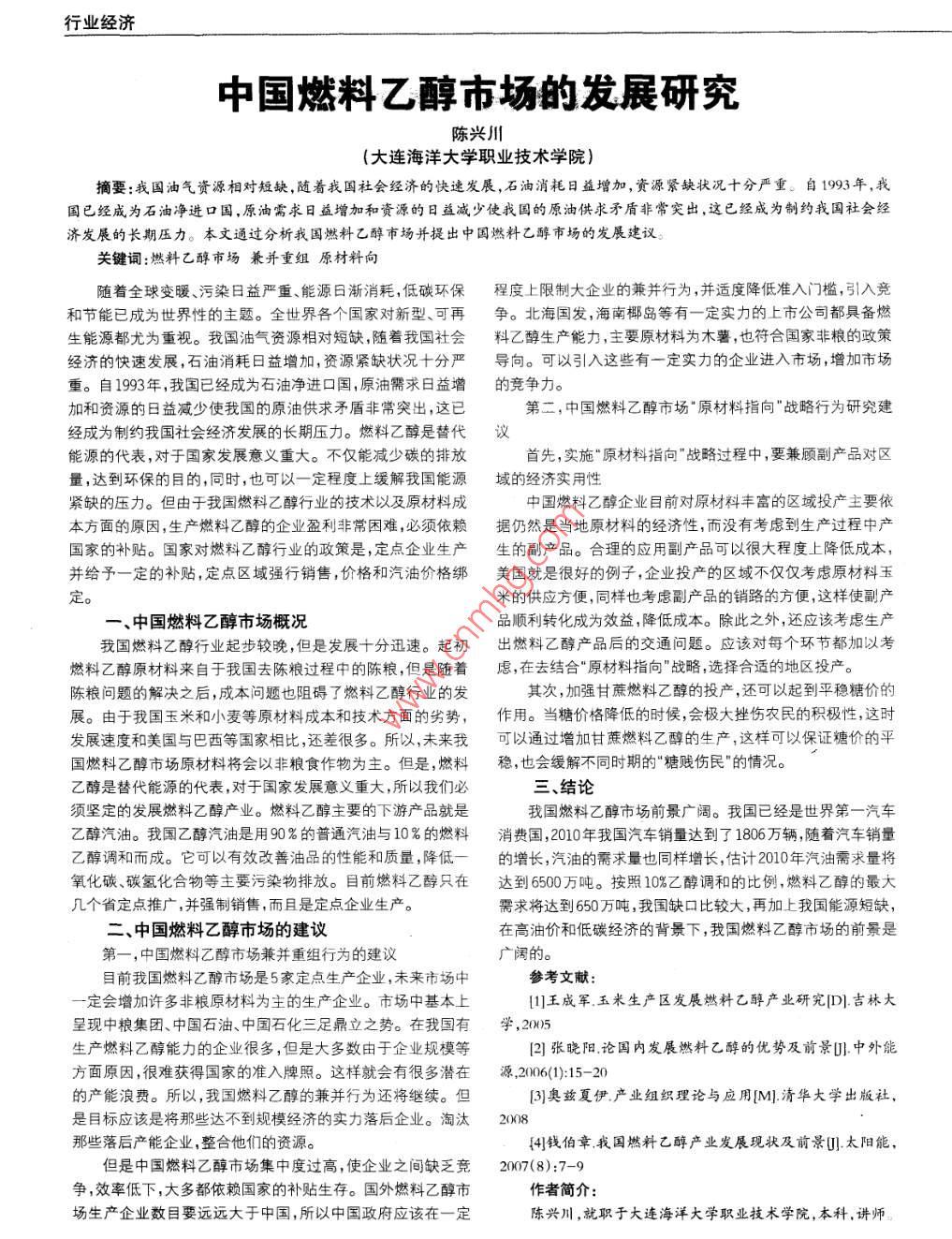 行業(yè)經(jīng)濟(jì)中國(guó)燃料乙醇市場(chǎng)的發(fā)展研究陳興川(大連海洋大學(xué)職業(yè)技術(shù)學(xué)院)摘要:我國(guó)油氣資源相對(duì)短缺,隨著我國(guó)社會(huì)經(jīng)濟(jì)的快速發(fā)展,石油消耗日益增加,資源緊缺狀況十分嚴(yán)重。自1993年,我國(guó)已經(jīng)成為石油凈進(jìn)口國(guó),原油需求日益增加和資源的日益減少使我國(guó)的原油供求矛盾非常突出,這已經(jīng)成為制約我國(guó)社會(huì)經(jīng)濟(jì)發(fā)展的長(zhǎng)期壓力。本文通過(guò)分析我國(guó)燃料乙醇市場(chǎng)并提出中國(guó)燃料乙醇市場(chǎng)的發(fā)展建議關(guān)鍵詞:燃料乙醇市場(chǎng)兼并重組原材料向隨著全球變暖污染日益嚴(yán)重能源日漸消耗低碳環(huán)保程度上限制大企業(yè)的兼并行為,并適度降低準(zhǔn)入門檻,引入競(jìng)和節(jié)能已成為世界性的主題。全世界各個(gè)國(guó)家對(duì)新型、可再爭(zhēng)。北海國(guó)發(fā),海南椰島等有一定實(shí)力的上市公司都具備燃生能源都尤為重視。我國(guó)油氣資源相對(duì)短缺,隨著我國(guó)社會(huì)料乙醇生產(chǎn)能力,主要原材料為木薯,也符合國(guó)家非糧的政策經(jīng)濟(jì)的快速發(fā)展,石油消耗日益增加,資源緊缺狀況十分嚴(yán)導(dǎo)向??梢砸脒@些有一定實(shí)力的企業(yè)進(jìn)入市場(chǎng),增加市場(chǎng)重。自1993年,我國(guó)已經(jīng)成為石油凈進(jìn)口國(guó),原油需求日益增的競(jìng)爭(zhēng)力加和資源的日益減少使我國(guó)的原油供求矛盾非常突出,這已第二,中國(guó)燃料乙醇市場(chǎng)原材料指向戰(zhàn)略行為研究建經(jīng)成為制約我國(guó)社會(huì)經(jīng)濟(jì)發(fā)展的長(zhǎng)期壓力燃料乙醇是替代議能源的代表,對(duì)于國(guó)家發(fā)展意義重大。不僅能減少碳的排放首先,實(shí)施“原材料指向戰(zhàn)略過(guò)程中,要兼顧副產(chǎn)品對(duì)區(qū)量,達(dá)到環(huán)保的目的,同時(shí),也可以一定程度上緩解我國(guó)能源域的經(jīng)濟(jì)實(shí)用性緊缺的壓力。但由于我國(guó)燃料乙醇行業(yè)的技術(shù)以及原材料成中國(guó)燃料乙醇企業(yè)目前對(duì)原材料豐富的區(qū)域投產(chǎn)主要依本方面的原因,生產(chǎn)燃料乙醇的企業(yè)盈利非常困難,必須依賴據(jù)仍然是當(dāng)?shù)卦牧系慕?jīng)濟(jì)性,而沒(méi)有考慮到生產(chǎn)過(guò)程中產(chǎn)國(guó)家的補(bǔ)貼。國(guó)家對(duì)燃料乙醇行業(yè)的政策是,定點(diǎn)企業(yè)生產(chǎn)生的副產(chǎn)品。合理的應(yīng)用副產(chǎn)品可以很大程度上降低成本,并給予一定的補(bǔ)貼,定點(diǎn)區(qū)域強(qiáng)行銷售,價(jià)格和汽油價(jià)格綁美國(guó)就是很好的例子,業(yè)投產(chǎn)的區(qū)域不僅僅考慮原材料玉定。米的供應(yīng)方便,同樣也考慮副產(chǎn)品的銷路的方便,這樣使副產(chǎn)一、中國(guó)燃料乙醇市場(chǎng)概況品順利轉(zhuǎn)化成為效益,降低成本。除此之外,還應(yīng)該考慮生產(chǎn)我國(guó)燃料乙醇行業(yè)起步較晚,但是發(fā)展十分迅速。起初出燃料乙醇產(chǎn)品后的交通問(wèn)題。應(yīng)該對(duì)每個(gè)環(huán)節(jié)都加以考燃料乙醇原材料來(lái)自于我國(guó)去陳糧過(guò)程中的陳糧,但是隨著慮,在去結(jié)合原材料指向戰(zhàn)略,選擇合適的地區(qū)投產(chǎn)。陳糧問(wèn)題的解決之后,成本問(wèn)題也阻礙了燃料乙醇行業(yè)的發(fā)其次,加強(qiáng)甘蔗燃料乙醇的投產(chǎn),還可以起到平穩(wěn)糖價(jià)的展。由于我國(guó)玉米和小麥等原材料成本和技術(shù)方面的劣勢(shì),作用。當(dāng)糖價(jià)格降低的時(shí)候,會(huì)極大挫傷農(nóng)民的積極性,這時(shí)發(fā)展速度和美國(guó)與巴西等國(guó)家相比,還差很多。所以,未來(lái)我可以通過(guò)增加甘蔗燃料乙醇的生產(chǎn),這樣可以保證糖價(jià)的平國(guó)燃料乙醇市場(chǎng)原材料將會(huì)以非糧食作物為主但是,燃料穩(wěn),也會(huì)緩解不同時(shí)期的“糖賤傷民的情況。乙醇是替代能源的代表,對(duì)于國(guó)家發(fā)展意義重大,所以我們必三、結(jié)論須堅(jiān)定的發(fā)展燃料乙醇產(chǎn)業(yè)。燃料乙醇主要的下游產(chǎn)品就是我國(guó)燃料乙醇市場(chǎng)前景廣闊。我國(guó)已經(jīng)是世界第一汽車乙醇汽油。我國(guó)乙醇汽油是用90%的普通汽油與10%的燃料消費(fèi)國(guó),2010年我國(guó)汽車銷量達(dá)到了1806萬(wàn)輛,隨著汽車銷量乙醇調(diào)和而成。它可以有效改善油品的性能和質(zhì)量,降低一的增長(zhǎng),汽油的需求量也同樣增長(zhǎng)估計(jì)2010年汽油需求量將氧化碳、碳?xì)浠衔锏戎饕廴疚锱欧?。目前燃料乙醇只在達(dá)到6500萬(wàn)噸。按照1%乙醇調(diào)和的比例,燃料乙醇的最大幾個(gè)省定點(diǎn)推廣,并強(qiáng)制銷售,而且是定點(diǎn)企業(yè)生產(chǎn)。需求將達(dá)到650萬(wàn)噸,我國(guó)缺口比較大,再加上我國(guó)能源短缺,中國(guó)燃料乙醇市場(chǎng)的建議在高油價(jià)和低碳經(jīng)濟(jì)的背景下,我國(guó)燃料乙醇市場(chǎng)的前景是第一,中國(guó)燃料乙醇市場(chǎng)兼并重組行為的建議廣闊的。目前我國(guó)燃料乙醇市場(chǎng)是5家定點(diǎn)生產(chǎn)企業(yè),未來(lái)市場(chǎn