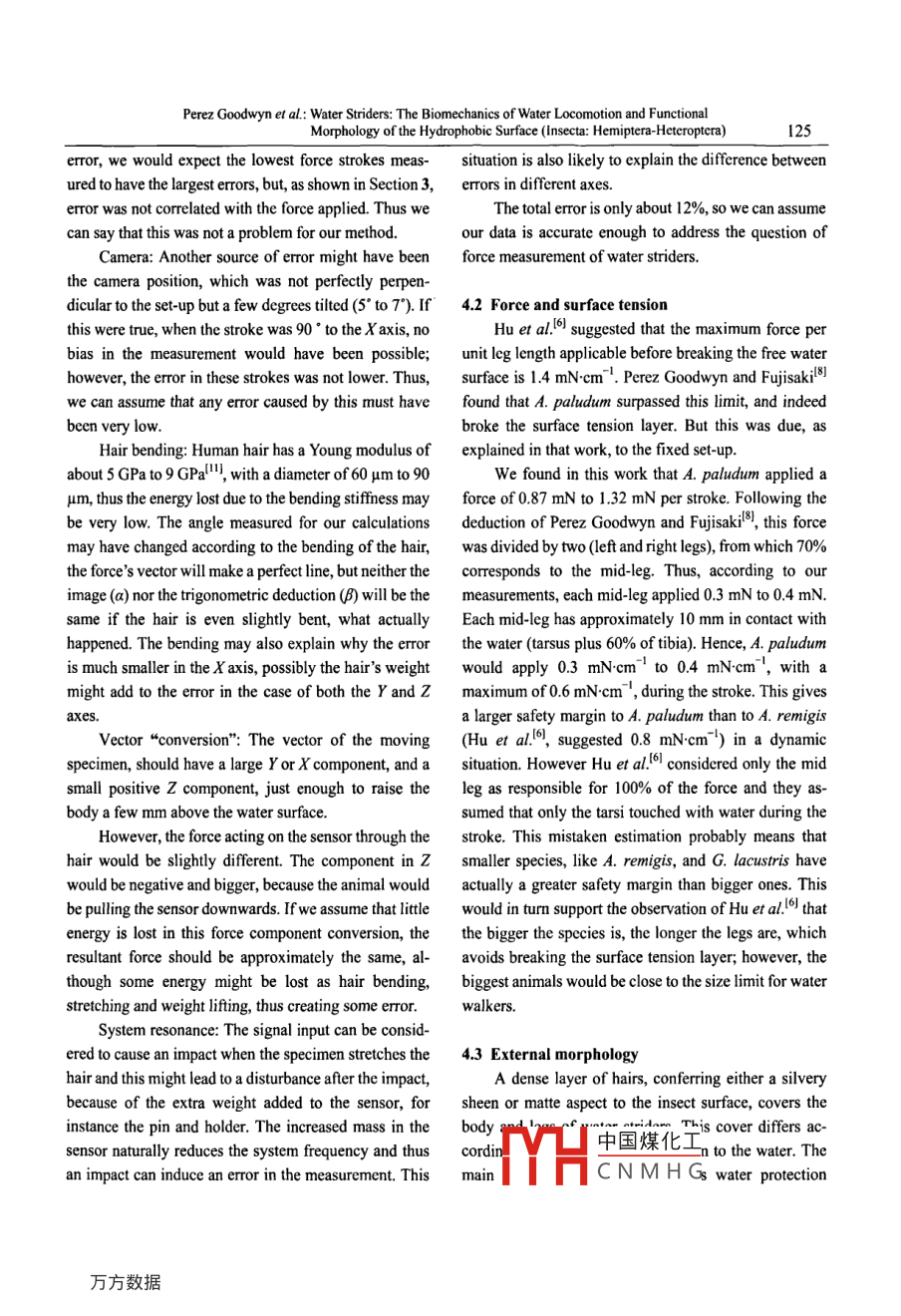 Available online at www.sciencedirect.comScienceDirectJoumal of Bionic Engineering 5 (2008) 121-126Water Striders: The Biomechanics of Water Locomotion and FunctionalMorphology of the Hydrophobic Surface (Insecta: Hemiptera-Heteroptera)P. J. Perez Goodwyn', Jin-tong Wang', Zhou-ji Wang, Ai-hong Ji, Zhen-dong Dai', K. Fujisaki?1. Institute for Bio-Inspired Structure and Surface Engineering (IBSS), Nanjing University ofAeronautics and Astronautics,Nanjing 210019, P. R. China2. Laboratory of Insect Ecology, Graduate School of Agriculure, Kyoto University, Kyoto 606-8502, JapanAbstractWater striders are insects living on the water surface, over which they can move very quickly and rarely get wetted. Wemeasured the force of free walking in water stiders, using a hair atached to their backs and a 3D strain gauge. The error wascalculated by comparing force and data derived from geometry and was estimated as 13%. Females on average were stronger(1.32 mN) than males (0.87 mN), however, the ratio of force to weight was not significantly dfferent. Compared with otherlighter species, Aquarius paludum seems stronger, but the ratio of force to weight is actually lower. A. paludum applies about0.3 mN.cm~' to 0.4 mN-cm~' with its mid-legs, thus avoiding penetrating the surface tension layer while propelling itself rapidlyover the water surface. We also investigated the extemal morphology with SEM. The body is covered by efectively two layersof macro and micro-hairs, which renders them hydrophobic. The setae are long (40 μm 60 um) and stif, being responsible forwaterprofing, and the microtrichia are much smaller (<10 um), slender, and flexible, holding a bubble over the body whensubmerged.Keywords: force, surface tension, aquatic insect, morphology, microtrichia, setaeCopyright 。2008, jili University. Published by Science Press and Elsevier Limited. All rights reserved.against the surface waves. Denny'+ pointed out that very1 Introductionsmall insects could not produce waves. Suter et al!5)The insects of the order Hemiptera-Heteroptera,resolved this paradox by showing that in water spidersalso called“bugs" or“true bugs", are small (few milli-the resistance-producing mechanism during the legmeter long) to very big (about 120 mm) animals, whichthrust is the drag. Hu et al,"ol demonstrated this in waterlive virtually in all environments, including water. Thestriders (Aquarius remigis) by analysing the vortices.Gerridae family is one of the largest semiaquatic heter-produced in water by the legs. Bush and HulI suggested'opteran families living in almost all aquatic environ-that curvature forces (i.e. surface tension) would also bements. They are present in big lakes and rivers and smallimportant at least during the rowing gate.ponds as tiny as a tree hole. They are also present in theThe stroke force of water striders was estimated bysea, both at the coast and in the open ocean, being theAndersen21 and later by Hu et al."l. Both of these indi-only insect able to develop the whole life cycle in such arect estimations were based upon the mass and the ac-biotope. These insects have hydrofuge hairs all overceleration of the animal. Perez Goodwyn and Fujisakil8]their body, including their legs". The mid- andmeasured the forces produced by seven different specieshind-legs are the means of propulsion, while the forelegsof water striders directly, but they used a fixed-tetheredare raptorial and short".setup, consisting of a one-dimensional sensor attachedAndersen!2] and Damhofer-Demar')l stated thatdirectlv tp the hack of the animals This prevented themwater striders propel themselves by pushing their legsfrom中國煤化工cing the animals toTHCNMHGCorresponding author; P. J. Perez GoodwynE-mail: pablogoodwyn@yahoo.com.ar122Joumal of Bionic Engineering (2008) Vol.5 No.2push the water back and downwards, increasing the dragz3Dand thus the measured force.∠e Aorce_xsensorWe used a complementary approach involvingin72morphological and biomechanical considerations tofaddress the roles of surface design and force exerting onwater. In this work, our goal was to measure directly and1,accurately the force exerted by a free-swimming water為sstrider during the stroke on water, using a 3D forcesensor.2 Material and method2.1 Force measurementsWater surface-. .. Specimen I VecsoranWe used A. paludum, taken from the Kyoto Uni-Fig.1 Set-up used for the force measurement experiments,versity Insect Ecology Laboratory culture. Five malesshowing the forces' axes and angles considered (see explana-tion in text).(0.03 g 0.032 g) and four females (0.05 g 0.056 g) (allmacropterous) were used for the tests. The experiments1.6were carried out in the IBSS at Nanjing University of.2 tForwardLeftAeronautics and Astronautics. The laboratory tempera-0.8 tture was 22 °C to 24。C, and R.H. was 40%.囝A(yù) 60 mm long human hair was attached to thepronotum of the insect using melted beeswax. This was.0 EXaligned with the body axis, and directed posteriorly. The0.4 t甲o(hù)ther end of the hair was glued to a 0.9 mm diameter-0.8 tsteel pin, which was attached to a custom strain gaugeload cell 3D sensor designed at the IBSS (technical de-.180.36 0.540.72tails in Ref. [9]). This force sensor was placed upsideFig.2 Typical force sensor data output, for x, Y and z axesdown approximately 25 mm above the water surface in ashowing three different situations. The first stroke was directed180 mm x 220 mm aquarium in which the water striderright from the sensor, thus the component in X is negative; thesecond is 90" to the X axis (along Y axis), thus the component incould swim. This set-up gave the animal freedom tomove naturally. We defined a 3D Cartesian coordinateis directed to the lef, thus the component in X is positive. Insetsshow diagrammatic high-speed video frames of the corTe-system as shown in Fig. 1. A high-speed video camerasponding strokes.(Mikrotron MC1311, Germany, at 100 fps) was installedalmost perpendicularly (5° to 7" deviat