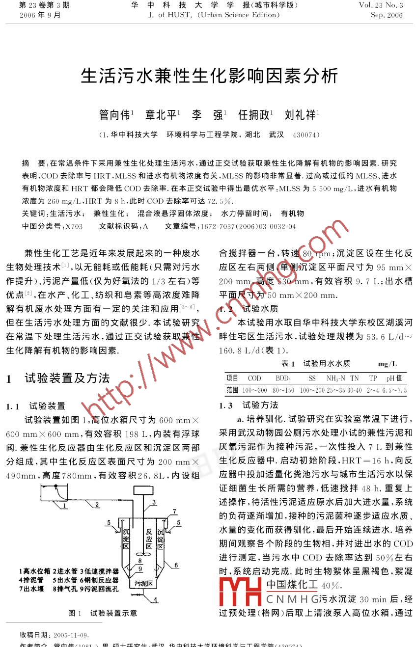 第23卷第3期華中科技大學(xué)學(xué)報(bào)(城市科學(xué)版)Vol. 23 No.32006年9月J. of HUST. (Urban Science Edition)Sep. 2006 .生活污水兼性生化影響因素分析管向偉’章北平1李強(qiáng)’任擁政劉禮祥'(1.華中科技大學(xué)環(huán)境科學(xué)與工程學(xué)院, 湖北武漢430074)摘要:在常溫條件下采用兼性生化處理生活污水,通過(guò)正交試驗(yàn)獲取兼性生化降解有機(jī)物的影響因素.研究表明,COD去除率與HRT,MLSS和進(jìn)水有機(jī)物濃度有關(guān),MLSS的影響非常顯著.過(guò)高或過(guò)低的MLSS、進(jìn)水有機(jī)物濃度和HRT都會(huì)降低COD去除率.在本正交試驗(yàn)中得出最優(yōu)水平:MLSS為5500mg/L,進(jìn)水有機(jī)物濃度為260 mg/L.HRT為8 h,此時(shí)COD去除率可達(dá)72. 5%.關(guān)鍵詞:生活污水;兼性生化; 混合液懸浮固體濃度;水力停留時(shí)間, 有機(jī)物中圖分類號(hào):X703文獻(xiàn)標(biāo)識(shí)碼:A文章編號(hào):1672-7037 (2006 )03- 0032-04兼性生化工藝是近年來(lái)發(fā)展起來(lái)的一種廢水合攪拌器一臺(tái),轉(zhuǎn)速80 rpm;沉淀區(qū)設(shè)在生化反生物處理技術(shù)1,以無(wú)能耗或低能耗(只需對(duì)污水應(yīng)區(qū)左右兩側(cè),單側(cè)沉淀區(qū)平面尺寸為95 mmX作提升)、污泥產(chǎn)量低(僅為好氧法的1/3左右)等200 mm,高度530 mm,有效容積9. 7 L;出水槽優(yōu)點(diǎn)[2],在水產(chǎn)、化工、紡織和皂素等高濃度難降平面尺寸為50mmX200mm.解有機(jī)廢水處理方面有一定的關(guān)注和應(yīng)用[3~0],1.2試驗(yàn)水質(zhì)但在生活污水處理方面的文獻(xiàn)很少.本試驗(yàn)研究本試驗(yàn)用水取自華中科技大學(xué)東校區(qū)湖溪河在常溫下處理生活污水,通過(guò)正交試驗(yàn)獲取兼性畔住宅區(qū)生活污水,試驗(yàn)處理規(guī)模為53.6 L/d~生化降解有機(jī)物的影響因素.160.8 L/d(表1).表1試驗(yàn)用水水質(zhì)1試驗(yàn)裝置及方法項(xiàng)目CODB0D:NH-N TN TP pH值范圍100~300 80~150 100~200 25~3530-40 2~4 6. 5~7.51.1試驗(yàn)裝置1.3試驗(yàn)方法試驗(yàn)裝置如圖1,高位水箱尺寸為600mmXa.培養(yǎng)馴化.試驗(yàn)研究在實(shí)驗(yàn)室常溫下進(jìn)行,600 mmX 600 mm,有效容積198 L,內(nèi)裝有浮球采用武漢動(dòng)物園公廁污水處理小試的兼性污泥和閥.兼性生化反應(yīng)器由生化反應(yīng)區(qū)和沉淀區(qū)兩部厭氧污泥作為接種污泥,一次性投入7 L到兼性分組成,其中生化反應(yīng)區(qū)表面尺寸為200 mm x生化反應(yīng)器中.啟動(dòng)初始階段,HRT=16 h,向反490mm,高度780mm,有效容積26.8L,內(nèi)設(shè)組應(yīng)器中投加適量化糞池污水與城市生活污水以保:證細(xì)菌生長(zhǎng)所需的營(yíng)養(yǎng),低速攪拌48h.重復(fù)上述操作,待活性污泥適應(yīng)原水后加大進(jìn)水量,系統(tǒng)1\2的負(fù)荷逐漸增加,接種的污泥菌種逐步適應(yīng)水質(zhì)、5反水量的變化而獲得馴化,最后開(kāi)始連續(xù)進(jìn)水.培養(yǎng)設(shè)|期間觀察各個(gè)階段的生物相,并對(duì)進(jìn)出水的COD.區(qū)進(jìn)行測(cè)定,當(dāng)污水中COD去除率達(dá)到50%左右1高水位箱2進(jìn)水管3低速攪拌器9時(shí),系統(tǒng)啟動(dòng)完成.此時(shí)生物絮體呈黑褐色,絮凝4排泥管5出水管 6鋼制反應(yīng)器污泥區(qū)中國(guó)煤化工40%.7出水堰8排氣孔 9污泥回流孔4YHCNMHG污水沉淀30min后,經(jīng)圖1試驗(yàn)裝置示意過(guò)預(yù)處理(格網(wǎng))后取上清液泵入高位水箱,通過(guò)收稿日期: 2005-11-09.作者簡(jiǎn)介:管向偉(1981-).男.碩士研究生;武漢.華中科技大學(xué)環(huán)境科學(xué)與工程學(xué)院(430074).基金項(xiàng)目:國(guó)家“十五”863課題基金資助項(xiàng)目(2003AA601110).第3期管向偉等:生活污水兼性生化影響因素分析●33●計(jì)量設(shè)備投入兼性生化反應(yīng)器中.利用兼性微生表4方差分析物的攝取、代謝與利用,高效去除污水中的COD,方差來(lái)源偏差平方和自由度 均方F比顯著性BOD;及ss,其出水經(jīng)過(guò)后續(xù)處理達(dá)標(biāo)后排放.由HRT/h330. 309 .165. 155 2. 870相關(guān)的研究叮得知,在常溫下,溫度對(duì)兼性生化反MLSS/mg●L-' 683. 709341. 8545. 940應(yīng)的影響較小根據(jù)單因素試驗(yàn)結(jié)果,確定試驗(yàn)以CODx/mg●L-1 132. 596.66. 2981. 152 *115. 096 .反應(yīng)區(qū)的水力停留時(shí)間(HRT)、混合液懸浮固體總和1 261.71濃度(MLSS)和進(jìn)水有機(jī)物濃度(COD,)為因素,進(jìn)行正交試驗(yàn)(表2).試驗(yàn)過(guò)程中,HRT通過(guò)進(jìn).水流量來(lái)控制,進(jìn)水有機(jī)物濃度可以通過(guò)投加適84020量葡萄糖或稀釋的方法來(lái)調(diào)配,MLSS通過(guò)定量gA, A, A,B,B,B, CC2C排泥來(lái)控制.試驗(yàn)?zāi)康闹饕窃诔叵驴疾旆磻?yīng)圖2效應(yīng) 曲線器的進(jìn)水有機(jī)物濃度、HRT及污泥濃度對(duì)有機(jī)物極差分析可知,本試驗(yàn)中極差Re> Rx> Rc處理效果的影響.當(dāng)反應(yīng)器運(yùn)行穩(wěn)定后,開(kāi)始記錄> Ro,則各因素對(duì)去除率影響作用為B>A>C>實(shí)驗(yàn)數(shù)據(jù),試驗(yàn)期間每天測(cè)定進(jìn)出水的指標(biāo).D,即MLSS的影響最大,試驗(yàn)誤差影響最小,進(jìn)表2因素水平水有機(jī)物濃度次之.由圖2可知最佳水平搭配為因素A.B.Cz,即HRT=8 h, MLSS= 5 500 mg/L,HRTMLSSCOD.r水平/H/mg●L-1COD,r= 180 mg/L.ABC進(jìn)行方差分析得知,因Fo.10=3. 110,Fo.os=水平184 00010