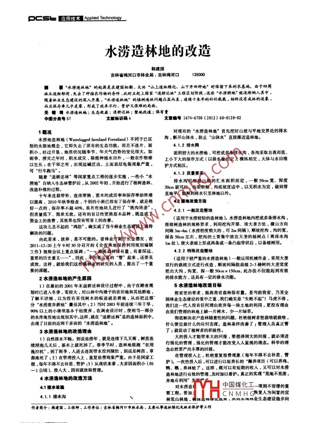 應(yīng)用技術(shù) APplied Technology水澇造林地的改造韓建國吉林省梅河口市林業(yè)局,吉林梅河口135000“水澇造林地”的起源是在建國初期,大興“山上造林綠化、山下開田種地”時保留下來的農(nóng)基地。由于四周林木逐漸郁閉,失去了種植農(nóng)作物的條件,此時正趕上國家“還耕還林”工程區(qū)劃階段,這些“水澇耕地”就逐漸納入其中隨著林業(yè)生態(tài)建設(shè)的深入開展,“水澇造林地”的植樹造林問題凸顯而至,連續(xù)十來年的補補栽栽,始終沒有成林的跡象而且保存率幾乎是零,形成了放棄不行、管護又很難的局面關(guān)口水澇造林地;生態(tài)效益;選耕還林;整地改造;保有量中分類號S7文獻標(biāo)識碼A文章號1674-6708(2012)60-0120021況對現(xiàn)有的“水澇造林地”首先挖好山坡與平地交界處的排水水澇地造林地( Waterlogged farmland Forestland)不同于已區(qū)溝,斷開山體水,防止“山體水”直接灌進造林地劃的水濕地概念,它即失去了原有的生態(tài)功能。而且不連片、面4.1.2排水網(wǎng)積小,經(jīng)過開墾,地質(zhì)狀況隨季節(jié)、年天氣趨勢的變化很大。如面積較大的水澇地,可挖成多條排水溝,各溝采取自高而低、雨季、撈災(zāi)之年時,積水成災(zāi),除能種植水田外,一般農(nóng)作物難上小下大的排序方式(以排水量而定),橫縱相交,大體與水田維以生長;在干畢之年,出現(xiàn)鹽堿泛出、土面表層龜裂現(xiàn)象嚴(yán)重,護方式相反??伞靶熊嚺荞R隨著“退耕還林”等國家重點工程的逐步實施,一些小“水4.1.3質(zhì)量要求澇地”自納入生態(tài)林管護后,從2002年初,開始進行了植樹造林、排水溝可根據(jù)山坡的匯水面積而定,一般50m寬、深度改造補植的過程30cm就可以,溝渠順暢,溝底坡度適中,以無積水為宜,做到幫十年來連栽帶補、連改帶換,苗木的成活率和保存率始終難直地平,能順利將水引至林地以外以提高,2010年秋季檢查,個別的小班已沒有了保存率,就是稍42地改量方法好一點的,保存率不超40%,雖有些地塊兒進行了“挑溝培壟但質(zhì)量低下、簡單無效。還有的盲日性更換苗木品種,既造成了4.2.1一般改造整地資金上的浪費,其效果也沒有明顯上的改善。(適用于水澇較輕的造林地)水澇造林地內(nèi)挖成多條排水溝這塊兒丟不起的“雞肋”,確實成了當(dāng)今林業(yè)生態(tài)建設(shè)上亟待按植樹造林的規(guī)格要求,利用挖溝開渠、培大壟方法,橫山方向解決的問題。間隔3m4m(水澇程度稍大的,可2m間隔),順坡挖溝,溝的寬、由此看來,放棄,是不可能的。省林業(yè)廳副廳長金德友,在深各50cm左右,挖溝的土要集中放在大壟的植樹點(離排水溝2011-12-20上午9時30分召開的《全省林地保護利用規(guī)劃編制lm處),使大壟面上形成兩條或一條凸起帶狀后,以備植樹用。工作》視頻會議上重點強調(diào):“…提高森林保有量,有著深遠4.2.2特殊改造整地重要的歷史意義……”,因此,不但要認(rèn)真的“管”起來,還要見(適用于較嚴(yán)重的水澇造林地)一般運用機械作業(yè),采用大壟成效。這樣,就給我們這些搞林業(yè)的研究的人員,提出了一個重雙行的裁植方式進行改造,順坡間隔能栽植2~3趟樹的大壟寬度要的課題。挖出大溝,溝寬、深一般50cmx150cm,此辦法不但能起到有效2水澇造林地的產(chǎn)生原因的排水能力,還具有一定的滲水功能。1)在最初的2001年末退耕還林設(shè)計過程中,由于在踏查規(guī)5水澇造林地改造目標(biāo)劃時已進入冬季,雪較大,對山林中溝塘子的農(nóng)田地和其他耕地,按省里的要求,提高我省森林保有量。是當(dāng)前我省、乃至全了解不詳細(xì),以為沒有采伐樹木的痕跡就是耕地,從而把這部”國林業(yè)生態(tài)建設(shè)的重中之重我們確實是“失敗不起”!馬虎不得,分“水澇廢棄耕地”囊括其中;2)當(dāng)時200年前連續(xù)三年干旱,我們這一代人沒有任何理由放棄每一塊土地的利用,更沒有理由9%以上的小塘壩基本干枯廢棄,在調(diào)查設(shè)計時,使相當(dāng)一部分在我們管理的林地上缺一片樹木、少一片綠草。的水庫淹沒地也規(guī)劃其中。這樣就在“退耕還林”總的造林面積中徹底解決農(nóng)戶造林隨意性的問題。杜絕植樹者想栽啥就栽哈出現(xiàn)了日前的近兩千多畝的“水澇造林地”。什么便宜栽什么的應(yīng)付態(tài)度。造林條件改善了;管理人員真正管3水澇造林地的改造理由了;就促動了植樹者的積極性1)自然排水不暢。別說是澇年,就是連續(xù)下幾天雨,樹苗連大的投入才能帶來大的冋報,要想得到大的回報,就必須進續(xù)浸泡幾天后,基本上就死掉了。春季早時,造林地能跑“農(nóng)用行強化的管理,強化的管理才能改變?nèi)巳酥匾暤睦砟???茖W(xué)的理拖拉機”,到了雨季,人進去連泥帶水沒到腿肚,別說是樹苗,草念必然要產(chǎn)出豐厚的回報都淹死了;2)在管理投入上,重復(fù)浪費現(xiàn)象嚴(yán)重。由于是國家工在管理投人上,杜絕重復(fù)浪費現(xiàn)象(每年不得不去補苗、管程,每年不得不去補苗、管護;3)從現(xiàn)狀來看,大多因面積小(0護)一次性投入后,可以進行以短養(yǎng)長的“圈養(yǎng)項目(可以養(yǎng)雞1公頃)、投人大,因而就放縱管理鴨、鵝,養(yǎng)林蛙y。這樣,既可以有短期的收入,又可以對水澇造林地進行有效的管理,及時加以看護。真正的實現(xiàn)“荒地不