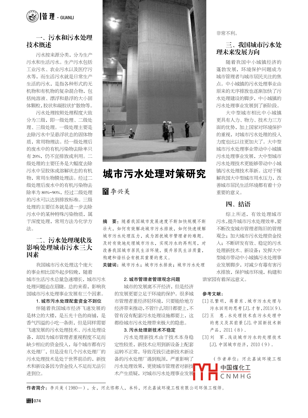 |管理. GUANU非常不利。一、污水和污水處理技術(shù)概述三、我國城市污水處.理未來發(fā)展向污水按來源分類,分為生產(chǎn)污水和生活污水。生產(chǎn)污水包括隨著我國中小城鎮(zhèn)經(jīng)濟的工業(yè)污水、農(nóng)業(yè)污水以及醫(yī)療污蓬勃發(fā)展,環(huán)境保護問題成為水等,而生活污水就是日常生產(chǎn)城市管理者與城市居民關(guān)注的焦生活的污水,是指各種形式的無點。中小城鎮(zhèn)的污水處理事業(yè)由機物和有機物的復雜混合物,包原來的無序排放也逐漸加快了污括純?nèi)芤?、漂浮和懸浮的大小固水處理建設(shè)的腳步,中小城鎮(zhèn)的體顆粒,膠狀和凝膠狀擴散物等。污水處理事業(yè)發(fā)展到了新階段。污水處理按照處理程度大致大中型城市相比中小城鎮(zhèn)分為三級,即- -級處理、二級處更具有人力、物力、技術(shù)力三方理、三級處理。- -級處理主要是面的優(yōu)勢,加上國家對環(huán)境保護去除污水中呈懸浮狀態(tài)的固體物的重視,對城市污水處理的投入質(zhì),常用物理法。經(jīng)一-級處理后力度也比以往更加大了。大中型的廢水中的有機污染物去除率只城市污水處理事業(yè)帶動中小城鎮(zhèn)有20%,仍不宜排放或利用。二污水處理事業(yè)發(fā)展,大中型城市級處理的主要任務(wù)是大幅度去除污水處理技術(shù)更能夠帶動中小城污水中呈膠體或溶解狀態(tài)的有機城市污水處理對策研究鎮(zhèn)污水處理技術(shù)革新。這對于緩物,常用生物膜處理法。經(jīng)過二解我國大中型城市用水壓力,改級處理后廢水中的有機污染物去善城市居民生活環(huán)境都有著十分除率為80%-90%,經(jīng)過二級處理李興美重要的意義。的污水可以達到排放標準。三級四、結(jié)語處理的主要任務(wù)就是進一一步 去除污水中的某種特殊污染物質(zhì),屬綜.上所述,有效處理城市于深度處理,常用方法為化學方滴要:隨著我國城市發(fā)展速度不斷加快規(guī)模不斷污水,提升城市污水處理效率,要壯大,如何有效解決城市污水排放,如何快速緩解不斷改變城市管理者陳舊的管理城市污水處理壓力,成為困擾城市管理者的難題。觀念;加大城市污水處理資金投二二、污水處理現(xiàn)狀及及時有效地處理城市污水,實現(xiàn)污水的再利用,對人;不斷研發(fā)有效、穩(wěn)定的污水影響處理城市污水三大改善我國城市居民生活環(huán)境,提升居民生活質(zhì)量,處理新技術(shù)、新設(shè)備;發(fā)揮大中因素構(gòu)建和諧社會有極其重要的意義。型城市帶動中小城鎮(zhèn)污水處理事我國城市污水處理這個龐大關(guān)鍵詞:城市污水;城市污水排放;城市污水處理業(yè)發(fā)展腳步,對減少有毒有害污的事業(yè)相比國外起步較晚,隨著水排放,保護城市環(huán)境,構(gòu)建和城市生活污水總量急速增長,城市污水2.城市管理者管理觀念問題諧家園有著深遠意義。處理問題迫在眉睫??偟膩砜矗绊懳页鞘械陌l(fā)展離不開經(jīng)濟,但是經(jīng)濟國城市污水處理事業(yè)發(fā)展有三個因素。的發(fā)展更要立足于環(huán)境的保護。很多城參考文獻:1.城市污水處理配套資金不到位市管理者重經(jīng)濟輕環(huán)境,只要能給地方[1]孔繁明, 蔣景東.城市污水處理與伴隨著我國城市經(jīng)濟飛速發(fā)展的經(jīng)濟帶來推動,不管什么項目都要上,不污水回用的思考[J].才智,2011(9).是林立的大樓,是五光十色的商鋪,是管 有沒有配套污水處理設(shè)施都要上,這[2]王 惠. 水處理技術(shù)在污水處理中香氣四溢的小吃一-條街, 但是同樣需要都給城市污水處理帶來極大的隱患。的意義及其前景[J].中國新技術(shù)新飛速發(fā)展的污水處理技術(shù)、污水處理設(shè)3.污水處理新技術(shù)不穩(wěn)定產(chǎn)品,2011 (8).備,卻因為城市管理者重視程度不足而污水處理新技術(shù)由于技術(shù)本身穩(wěn)[3]劉 軍. 淺談城市污水的處理技術(shù)缺少相應(yīng)的資金投人,每個城市都有污定性較差 ,新技術(shù)應(yīng)用到新設(shè)備上配套[J].中國城市經(jīng)濟,2010(9).水處理廠,但是沒有幾個污水處理廠的運轉(zhuǎn)不正常 ,導致花錢弓|進新技術(shù)新設(shè)污水處理技術(shù)是處于世界前沿的,新技備 的污水處理廠遇到瓶頸,嚴重影響^了(作者單位:河北嘉誠環(huán)境工程術(shù)和新設(shè)備因為資金投人不足而無法引污水處理效果,更使城市管理者對新技中國煤化工進到位。術(shù)產(chǎn)生質(zhì)疑,對城市污水處理事業(yè)發(fā)展MYHCNM HG作者簡介:李興美(1980-) ,女,河北邯鄲人,本科,河北嘉誠環(huán)境工程有限公司環(huán)保工程師。圈|074