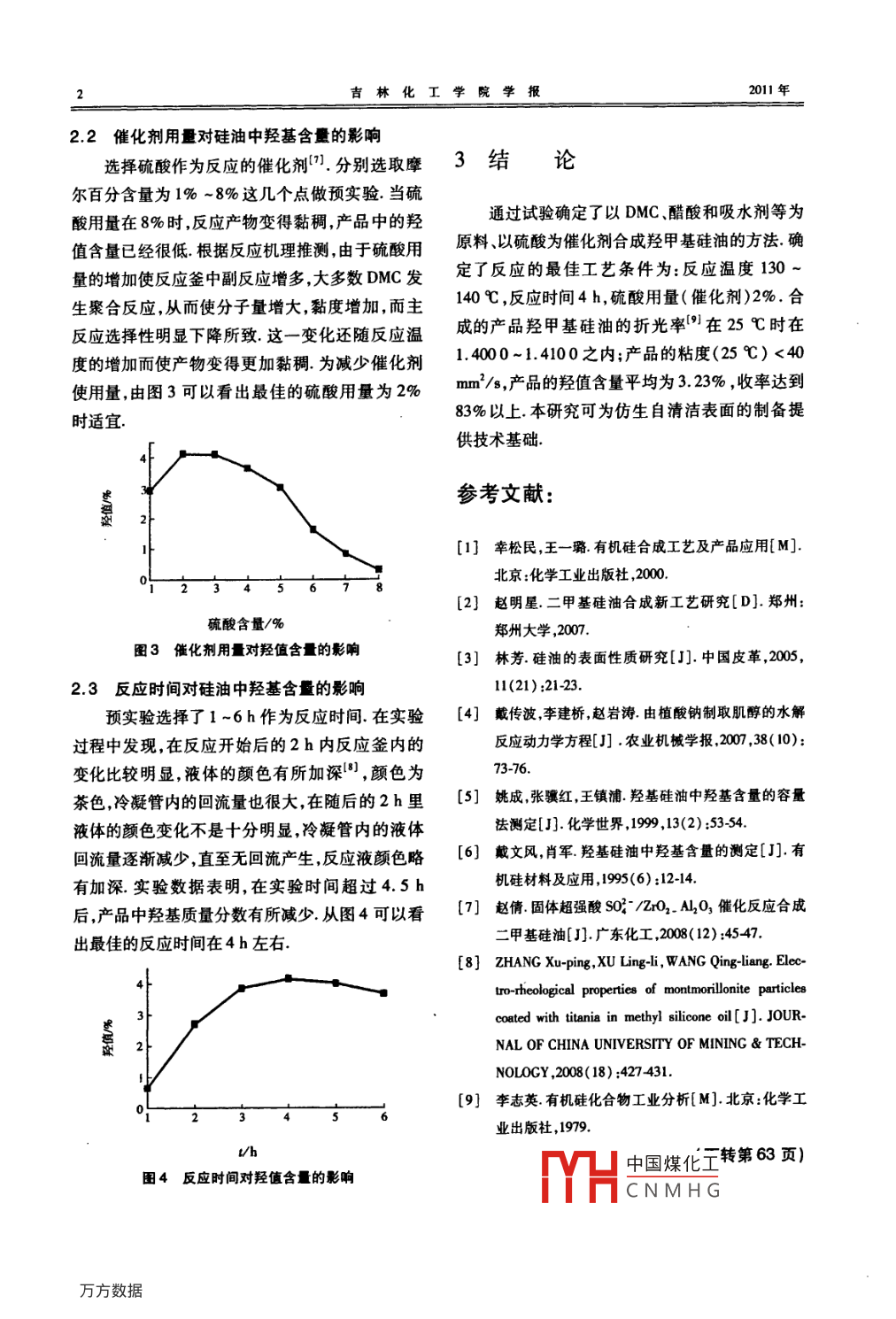 .第28卷第7期吉林化工學(xué)院學(xué)報(bào)Vol.28 No.72011年7月JOURNAL OF JLIN INSITTUTE OF CHEMICAL TECHNOLOCYJul. 2011文章編號(hào):1007-2853(2011)07 0001 02羥甲基硅油的合成研究戴傳波',李建橋”,王華',陶軍’(1.吉林化工學(xué)院化工與材料I程學(xué)院,吉林吉林132022;2.吉林大學(xué)地面機(jī)械仿生技術(shù)教育部重點(diǎn)實(shí)驗(yàn)室.吉林長(zhǎng)春130022;3.吉林石化公司乙烯廠動(dòng)力裝置車間,吉林吉林132022)摘要:以二甲基環(huán)硅氧烷( DMC)和乙酸為原料,以濃硫酸為催化劑,通過(guò)單因素試驗(yàn)法合成了羥甲基硅油.實(shí)驗(yàn)考察了反應(yīng)時(shí)間、反應(yīng)溫度和催化劑用量等因素對(duì)產(chǎn)品質(zhì)量的影響.實(shí)驗(yàn)結(jié)果表明:該I藝的最佳反應(yīng)條件為:反應(yīng)溫度130 ~ 140 C ,反應(yīng)時(shí)間4 h,硫酸用最(催化劑)為2%.關(guān)鍵詞:羥甲基硅油;DMC;單 因素試驗(yàn)法中圖分類號(hào): TQ317.9文獻(xiàn)標(biāo)志碼: A .近年來(lái),我國(guó)的有機(jī)硅行業(yè)發(fā)展迅猛.羥甲基原料一+加鹽水洗一 分園一+加堿水洗一 +硅油是有機(jī)硅中非常重要的一種下游產(chǎn)品"。羥分園一產(chǎn)品甲基硅油具有非常優(yōu)異的熱穩(wěn)定性、耐寒性、電氣圖1實(shí)驗(yàn)流程簡(jiǎn)圈特性、耐水性、耐化學(xué)藥品性等特點(diǎn),還具普通礦物油和合成油所沒(méi)有的脫模性、疏水性、消泡性等特性.羥甲基硅油用途廣泛[23),從電子工程到運(yùn)2結(jié)果與討論輸機(jī)械、化學(xué)、辦公機(jī)械、化妝品、纖維、造紙食品、醫(yī)療等領(lǐng)域均得到了廣泛應(yīng)用.2.1反 應(yīng)溫度對(duì)硅油中羥基含量的影響在預(yù)實(shí)驗(yàn)中選取了70 ~ 143 C的不同溫度進(jìn)1實(shí)驗(yàn)部分行試驗(yàn),通過(guò)試驗(yàn)數(shù)據(jù)表明小于110C時(shí)生產(chǎn)出來(lái)的硅油羥基含量[S6)很低,遠(yuǎn)遠(yuǎn)低于羥基質(zhì)量分1.1主要原料和試劑數(shù)W(- -0H)≥3%這一指標(biāo).分析其原因,認(rèn)為二甲基環(huán)硅氧烷DMC,山東東岳集團(tuán);一級(jí).溫度偏低時(shí),反應(yīng)中硅氧鏈的斷開(kāi)受到影響,影響品乙酸,天津市大茂化學(xué)試劑廠;氯化鈉分析純,后續(xù)反應(yīng),因此,試驗(yàn)中選用了較高的溫度.在試哈爾濱市永豐化工廠;碳酸鈉分析純,天津市大茂驗(yàn)溫度大于130C時(shí)獲得的產(chǎn)品,羥基質(zhì)量分?jǐn)?shù)化學(xué)試劑廠;碳酸氫鈉化學(xué)純,天津市大茂化學(xué)試有較大的提高.試驗(yàn)發(fā)現(xiàn)143 ~ 145 C為混合反應(yīng)劑廠;濃硫酸,吉林省威龍化學(xué)試劑廠.液的共佛點(diǎn),在這個(gè)溫度下生產(chǎn)的硅油其羥基質(zhì)量分?jǐn)?shù)略低.從圖2可以看出最佳反應(yīng)溫度為1.2實(shí)驗(yàn)方法采用單因素試驗(yàn)法,將DMC與乙酸、吸水劑130 ~ 140 C.按一定比例加人反應(yīng)器中1),攪勻后加入濃硫酸,升溫,反應(yīng)一-定時(shí)間后,將反應(yīng)液冷卻并靜置1 h.反應(yīng)器中的物料倒人水洗釜中,加人氯化鈉2|水溶液,攪拌1 h后靜置1 h,放出鹽水,將剩余液體倒人堿洗釜中,加入碳酸鈉水溶液,攪拌升溫至70809010011012013014060 ~80 C后開(kāi)始計(jì)時(shí),3h后停止攪拌,并靜置3 h反應(yīng)溫度/C后放料,得上層產(chǎn)品.實(shí)驗(yàn)流程,如圖1所示.中國(guó)煤化工影響收稿日期:2011-04-12CNMH G1.H作者簡(jiǎn)介:戴傳波( 1972-) ,男,吉林長(zhǎng)春人,吉林化工學(xué)院教授,博士,主要從事化學(xué)工程與工藝方面的研究.2吉林化工學(xué)院學(xué)報(bào)2011年2.2催化劑用量對(duì)硅油中羥基含量 的影響選擇硫酸作為反應(yīng)的催化劑”.分別選取摩3結(jié)論爾百分含量為1% ~8%這幾個(gè)點(diǎn)做預(yù)實(shí)驗(yàn).當(dāng)硫酸用量在8%時(shí),反應(yīng)產(chǎn)物變得黏稠,產(chǎn)品中的羥通過(guò)試驗(yàn)確定了以DMC、醋酸和吸水劑等為值含量已經(jīng)很低.根據(jù)反應(yīng)機(jī)理推測(cè),由于硫酸用原料、以硫酸為催化劑合成羥甲基硅油的方法.確量的增加使反應(yīng)釜中副反應(yīng)增多,大多數(shù)DMC發(fā)定了反應(yīng)的最佳工藝條件為:反應(yīng)溫度130~生聚合反應(yīng),從而使分子量增大,黏度增加,而主140 C,反應(yīng)時(shí)間4 h,硫酸用量(催化劑)2%.合反應(yīng)選擇性明顯下降所致.這一變化還隨反應(yīng)溫成的產(chǎn)品羥甲基硅油的折光率[91在25C時(shí)在度的增加而使產(chǎn)物變得更加黏稠為減少催化劑1.400~1.4100之內(nèi);產(chǎn)品的粘度(25 C) <40使用量,由圖3可以看出最佳的硫酸用量為2%mm'/s,產(chǎn)品的羥值含量平均為3. 23% ,收率達(dá)到時(shí)適宜.83%以上.本研究可為仿生自清潔表面的制備提供技術(shù)基礎(chǔ).參考文獻(xiàn):[1]幸松民,王一路. 有機(jī)硅合成工藝及產(chǎn)品應(yīng)用[M].° 23↓5658北京:化學(xué)工業(yè)出版社,2000.[2] 趙明星. 二甲基硅油合成新工藝研究[D].鄭州:硫酸含量/%鄭州大學(xué),2007.圖3催化劑用 對(duì)羥值含的影響[3]林芳硅油的表面性質(zhì)研究[J].中國(guó)皮革,2005,2.3反應(yīng) 時(shí)間對(duì)硅油中羥基含量的影響11(21):21-23.預(yù)實(shí)驗(yàn)選擇了1~6h作為反應(yīng)時(shí)間.在實(shí)驗(yàn)[4]戴傳波,李建橋,趙巖濤 由植酸鈉制取肌醇的水解過(guò)程中發(fā)現(xiàn),在反應(yīng)開(kāi)始后的2h內(nèi)反應(yī