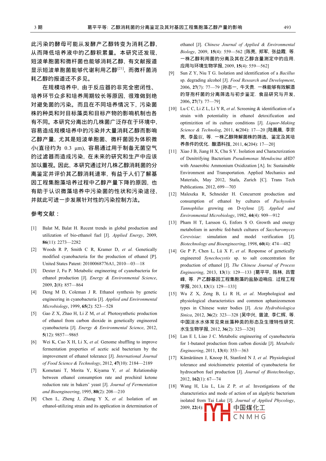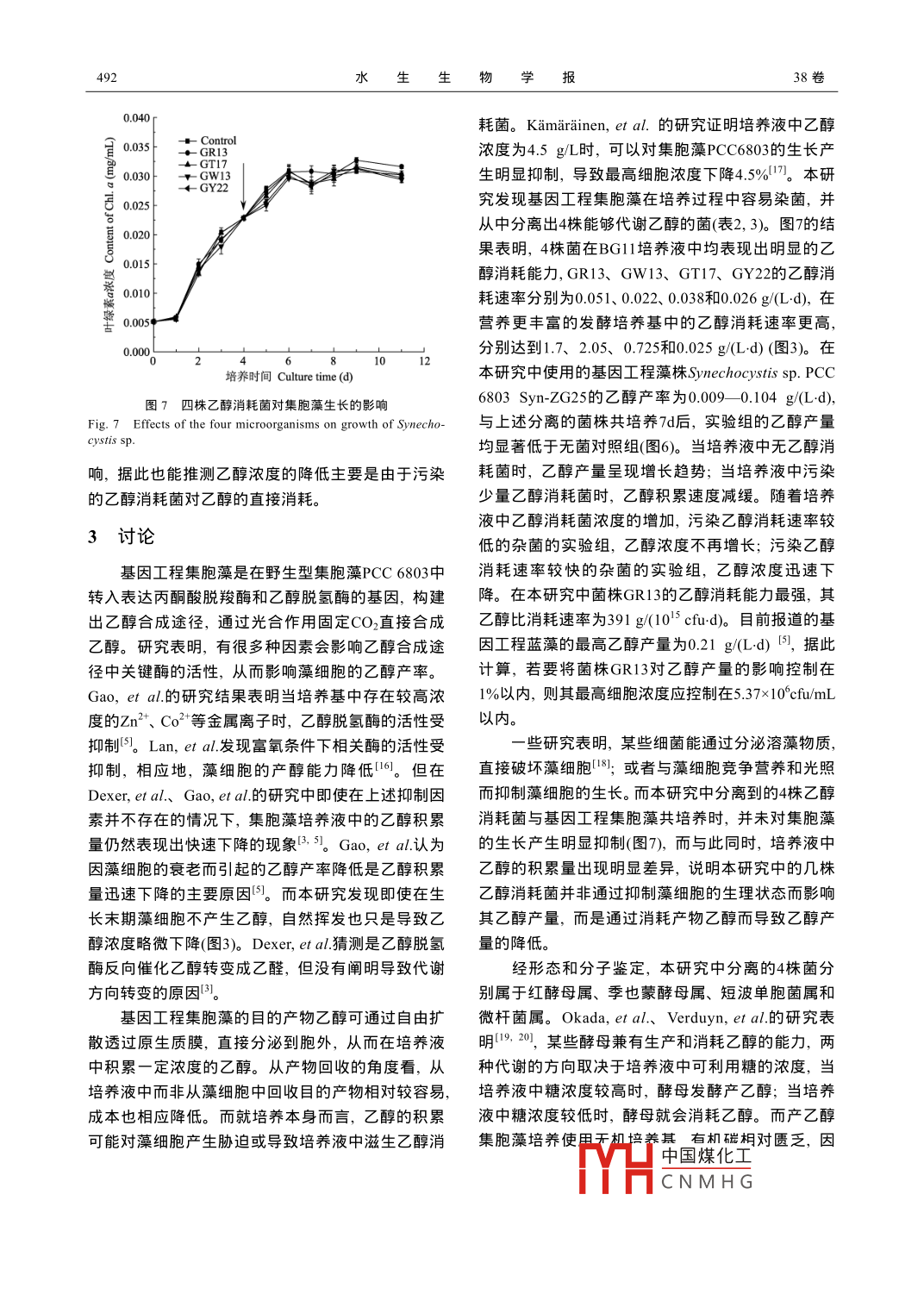 第38卷第3期水生生物學(xué)報Vol. 38. No. 32014年5月ACTA HYDROBIOLOGICA SINICAMay,2014doi:10.7541/2014.69乙醇消耗菌的分離鑒定及其對基因工程集胞藻乙醇產(chǎn)量的影響葛平平·2陳林1張維董慶喆劉天中呂雪峰(1.中國科學(xué)院青島生物能源與過程研究所,生物燃料重點實驗室,青島266101;2.中國科學(xué)院大學(xué),北京100049)摘要:為研究產(chǎn)乙醇基因工程集胞藻培養(yǎng)液中的乙醇消耗菌污染情況及其對乙醇產(chǎn)量的影響,從污染的培養(yǎng)液中分離岀4株乙醇消耗菌,通過16SrNA、26 SrNA序列分析對分離岀的菌株進(jìn)行鑒定,并研究其乙醇消耗能力及對基因工程集胞藻乙醇產(chǎn)量的影響。結(jié)果表明,分離岀的4株菌分別為紅酵母( Rhodotorulap)、季也蒙酵母( Meyerozyma guilliermondii)、短波單胞菌( Brevundimonas sp.)、微桿菌( Microbacterium sp.)。其中乙醇消耗能力最強的是紅酵母,乙醇比消耗速率達(dá)到391g(10-3cfud);其次為季也蒙酵母,乙醇比消耗速率為80.1g(10 cfu.d);短波單胞菌和微桿菌的乙醇比消耗速率遠(yuǎn)低于紅酵母和季也蒙酵母。將分離出的菌株與產(chǎn)乙醇集胞藻共培養(yǎng)πd后,污染紅酵母、季也蒙酵母、短波單胞菌、微杄菌的實驗組乙醇產(chǎn)量分別下降了53.8%、23.6%、40.7%、27.3%。4株菌對基因工程集胞藻的生長無明顯影響,均通過直接消耗乙醇而降低集胞藻的乙醇產(chǎn)量。關(guān)鍵詞:乙醇消耗菌;微生物污染;生物乙醇;基因工程集胞藻中圖分類號:Q949,22文獻(xiàn)標(biāo)識碼:A文章編號:1000-3207(2014)03-0487-08生物乙醇是重要的生物液體燃料之一,可作為巴氏醋桿菌、門多薩假單胞菌等都可代謝乙醇61,汽油替代品或可再生交通燃料添加劑。應(yīng)用基因其中巴氏醋桿菌的乙醇消耗速率達(dá)到2.3mL/d。而工程藍(lán)藻直接利用太陽能和CO2一步法生物合成乙在管囊酵母2、釀酒酵母叫中,乙醇的合成代謝和醇具有獨特的優(yōu)勢,因此成為各界關(guān)注的熱點2分解代謝同時存在。如果污染了這些微生物,也可目前,用于生產(chǎn)乙醇的基因工程藍(lán)藻主要有聚球藻能嚴(yán)重影響乙醇產(chǎn)量。目前,關(guān)于微生物污染對基( Synechococcus sp.PCC7942)和集胞藻(Sme-因工程集胞藻乙醇產(chǎn)量的影響還未有報道。chocystis sp.PCC6803)3等,最高乙醇產(chǎn)量達(dá)到本研究從污染的產(chǎn)乙醇基因工程集胞藻的培養(yǎng)5.5g冮,顯示出太陽能生物轉(zhuǎn)化直接合成乙醇的液中分離出4株乙醇消耗菌,評價各菌的乙醇消耗巨大潛力。然而,有研究表明基因工程集胞藻的乙能力以及對基因工程集胞藻的生長和乙醇產(chǎn)量的影醇產(chǎn)量很不穩(wěn)定,在培養(yǎng)后期培養(yǎng)液中的乙醇濃度響,并采用形態(tài)觀察和基因序列分析手段鑒定污染急劇下降5,因此研究確定影響乙醇產(chǎn)量穩(wěn)定性菌的種類,以期能為藍(lán)藻乙醇的培養(yǎng)工藝及污染控的因素對生產(chǎn)工藝的建立有重要意義。制提供理論參考。在我們的前期工作中發(fā)現(xiàn),基因工程集胞藻在培養(yǎng)過程中易發(fā)生食藻生物和微生物污染,尤其是1材料與方法在放大培養(yǎng)階段這種污染尤為嚴(yán)重。食藻生物會吞1.1藻種及培養(yǎng)方法食藻細(xì)胞,使生物量迅速下降,從而降低乙醇產(chǎn)量。產(chǎn)乙醇基因工程集胞藻 Synechocystis sp.PCC自然界中存在著多種能利用乙醇的微生物,例如醋6803Syn-zG25,由中國科學(xué)院青島生物能源與過酸菌、面包酵母、嗜有機甲基桿菌、枯草芽孢桿菌、程研究所構(gòu)建。集胞藻在250mL三角搖瓶(裝液收稿日期:2013-04-10;修訂日期:2013-12基金項目:國家高技術(shù)發(fā)展計劃(863)(2012AA052103)資助作者簡介:葛平平(1988),女,河北保定人;碩士研究生;主要從事生物化工TYH中國煤化工通信作者:陳林,Te:0532-80662737;E-mail:chenlin(@qibebt.ac.cnCNMHG488水生生物學(xué)報38卷量100mL)或直徑30mm的氣泡柱式光反應(yīng)器(裝液提取的基因組DNA為模板,用高保真aq酶進(jìn)行量200mL)中培養(yǎng),通入含5%CO2的空氣混合氣,PCR擴增。反應(yīng)條件為:95℃5min;94℃30s,55℃通氣速率(102)Lh,光強100μmol(m2s),培養(yǎng)溫1min,72℃lmin,34個循環(huán);72℃10min。PCR產(chǎn)物度(302)℃。培養(yǎng)基為BGlⅠ培養(yǎng)基,其中含用0.8%瓊脂糖凝膠電泳進(jìn)行檢驗。目的基因片段克20mg/L壯觀霉素( Spectinomycin, Sigma)4隆:將PCR產(chǎn)物用DNA純化試劑盒( Cycle-Pure Kit1.2乙醇消耗菌的分離純化美國 Omega公司)進(jìn)行純化,產(chǎn)物與pMDl8-TⅤec-培養(yǎng)基(1)初篩培養(yǎng)基:牛肉膏3gL,蛋白胨tor連接后轉(zhuǎn)化到E. coli dh5α感受態(tài)細(xì)胞中,涂布10g,NaCl5gL,乙醇2g/L,壯觀霉素20mg,到Amp抗性平板上培養(yǎng)9-16h挑取3個單克隆瓊脂15g/;(2)復(fù)篩培養(yǎng)基: BGll培養(yǎng)基中添加擴繁后送上海桑尼生物科技有限公司測序,將測2g/L的乙醇,20mg/L的壯觀霉素,15g/L的瓊脂;序結(jié)果與 Gen bank中已有序列進(jìn)行比對和同源性(3)純化培養(yǎng)基:牛肉膏3gL,蛋白胨10g/L,NaC1分析5g冮,乙醇2gL,瓊脂15g/L(4)發(fā)酵培養(yǎng)基:牛1.4乙醇消耗菌的生長及乙醇消耗速率測定肉膏3gL,蛋白胨10gL,NaCl5gL,乙醇23g乙醇消耗菌生長曲線的測定挑取純化后的單壯觀霉素20mg/L菌落接種于發(fā)酵培養(yǎng)基中培養(yǎng)24h,取適量培養(yǎng)液乙醇消耗菌的分離及純化(1)初篩:集胞藻在在6600nm下測定其吸光度(A6o),然后稀釋至A6o=氣