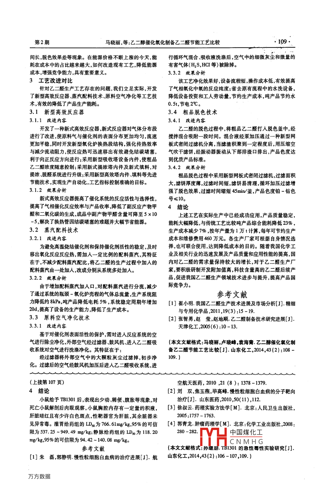 山東化工108·SHANDONG CHEMICAL INDUSTRY2014年第43卷乙二醇催化氧化制備乙二醛節(jié)能工藝比較馬曉麗,盧曉峰,袁海青(金沂蒙集團(tuán)有限公司,山東臨沂276700摘要:乙二醛是一種用途十分廣泛的有機(jī)化學(xué)中間體市場上銷售的產(chǎn)品多是濃度為30-40%的乙二醛水溶液在紡織印染、建材、皮革、醫(yī)藥農(nóng)藥、國防涂料、輕工、粘合劑和環(huán)保等方面具有廣泛的應(yīng)用,國內(nèi)現(xiàn)有生產(chǎn)裝置多采用乙二醇催化氧化工藝,對于乙二醇氧化工藝降低生產(chǎn)能耗具有重大意義。關(guān)鍵詞:催化氧化;乙二醛;工藝;節(jié)能中圖分類號:TQ224.14文獻(xiàn)標(biāo)識碼:A文章編號:1008-021x(2014)02-0108-02MEG Preparation Catalytic Oxidation of Glyoxal and Energy Saving TechnologyMA Xiao-li, LU Xiao-feng, YUAN Hai- gingJinyimeng Group Co, Ltd, Linyi 276700, China)Abstract: Glyoxal is a very versatile organic chemical intermediates, the product that sells on the market is moreconcentration of 30 %-40% glyoxal aqueous solution. In textile printing and dyeing, construction materials, leathermedicine, pesticide, defense, coating, light industry, adhesives and environmental protection, it has a wide range ofapplications, Domestic existing production unit with MEG catalytic oxidation process, the oxidation process is of greatsignificance to reduce production energy consumptionKey words catalytic oxidation; glyoxal; technology, energy sawing乙二醛又名草酸醛,是分子結(jié)構(gòu)最簡單的脂肪族二元程短過程簡單不足之處是產(chǎn)品質(zhì)量較差含有一定量的甲醛。作為一種基本化工原料,乙二醛廣泛應(yīng)用于紡織的抗縮醛、醇和酸等雜志,需要經(jīng)過進(jìn)一步的純化處理,才能滿足醫(yī)抗皺整理劑造紙、石油、冶金炸藥和建筑等工業(yè)上。由于藥等行業(yè)的質(zhì)量要求。乙二醛能選擇吸收任意濃度的二氧化硫所以它在水處理、1.2乙醛硝酸氧化法洗滌、衛(wèi)生和化妝品工業(yè)上都有廣泛的應(yīng)用。由乙二醛合成乙醛硝酸氧化法是將40%硝酸和40%乙醛溶液按照的乙醛酸產(chǎn)品,可進(jìn)一步合成香蘭素等重要產(chǎn)品。乙二醛是定比例加人到氧化反應(yīng)釜內(nèi),在不同的催化劑作用下以亞當(dāng)前多種行業(yè)的急需產(chǎn)品加強(qiáng)工藝管理、開發(fā)節(jié)能技術(shù)、提硝酸鈉為引發(fā)劑控制反應(yīng)溫度在38-40℃,反應(yīng)10h,常壓高產(chǎn)品質(zhì)量對促進(jìn)國內(nèi)乙二醛行業(yè)發(fā)展有十分重要的現(xiàn)實(shí)加熱回收乙醛再通過反萃取或四級混合澄清萃取除去乙意義。醛、硝酸、草酸等最后經(jīng)過減壓濃縮得到40%的乙二醛水1生產(chǎn)方法溶液,以乙醛計(jì)的收率約為32%~40%。該方法的優(yōu)點(diǎn)是我國乙二醛的研究工作始于20世紀(jì)70年代中期,近年能耗低、產(chǎn)品中不含甲醛、產(chǎn)品質(zhì)量高能滿足醫(yī)藥及日用化來發(fā)展較快預(yù)計(jì)到2015年我國乙二醛總生產(chǎn)能力將超過工等行業(yè)的要求。缺點(diǎn)是副反應(yīng)多最主要的副反應(yīng)是部分30萬va,在世界乙二醛生產(chǎn)中占據(jù)重要地位。目前,乙二乙醛被氧化成醋酸,還有少量目的物乙二醛被進(jìn)一步氧化成醛的生產(chǎn)方法較多有乙炔氧化法、乙烯氧化法、草酸還原水乙醛酸和草酸,進(jìn)一步純化處理比較困難,另外設(shè)備腐蝕嚴(yán)解法、乙二醇?xì)庀嘌趸耙胰┫跛嵫趸ǖ?。其中工業(yè)生重,三廢較多。產(chǎn)方法主要有乙二醇?xì)庀嘌趸耙胰┫跛嵫趸▋煞N。2乙二醇?xì)庀嘌趸に囍写嬖诘膯栴}1.1乙二醇?xì)庀嘌趸ㄎ覈F(xiàn)階段乙二醛生產(chǎn)廠家主要采用乙二醇催化氧化乙二醇?xì)庀嘌趸ㄊ且叶┑膫鹘y(tǒng)生產(chǎn)方法是目前我工藝該工藝存在綜合能耗高、產(chǎn)品質(zhì)量差氧化反應(yīng)轉(zhuǎn)化率國的乙二醛廠家普遍采用該方法進(jìn)行生產(chǎn)。乙二醇預(yù)熱氣低等缺點(diǎn)。各大廠家通過強(qiáng)化管理優(yōu)化控制系統(tǒng)杜絕跑、化后,與循環(huán)氣混合進(jìn)入催化反應(yīng)器,在650-60℃下反冒、滴、漏等現(xiàn)象,物料消耗無明顯變化。在工藝生產(chǎn)過程中應(yīng),產(chǎn)物以水激冷,形成乙二醛水溶液,再經(jīng)過脫色、真空吸氧化工序存在系統(tǒng)阻力高循環(huán)風(fēng)機(jī)負(fù)荷大等因素導(dǎo)致用電濾等后續(xù)處理過程得到乙二醛產(chǎn)品。乙二醇的單程轉(zhuǎn)化率量大,進(jìn)而影響原料進(jìn)入系統(tǒng)的總量降低了整套設(shè)備的年為80%-85%。以尾氣循環(huán)量來調(diào)節(jié)含氧量,產(chǎn)品含乙二生產(chǎn)能力;在凈中國煤化工能、水資源消耗醛濃度一般為30%-40%該方法原料乙二醇易得、工藝流過高現(xiàn)象增加CNMH盡使產(chǎn)品過濾時(shí)收稿日期:2013-12-0作者簡介:馬曉麗(1973—),女,工程師從事有機(jī)化工產(chǎn)品的研究開發(fā)工作。第2期馬曉麗,等:乙二醇催化氧化制備乙二醛節(jié)能工藝比較I09間長脫色效果差等現(xiàn)象。在能源價(jià)格不斷上漲的今天,能行循環(huán)氣混合吸收液洗滌后空氣中的細(xì)微灰塵和微量的耗在成本中的占比越來越大,如何改造現(xiàn)有工藝,降低能源有害氣體(H2S,HCI等)被除掉。成本,增強(qiáng)競爭能力,具有重要意義。33.2效果分析3工藝改進(jìn)對比該工藝凈化效果好,設(shè)備流程短操作成本低,有效提高針對乙