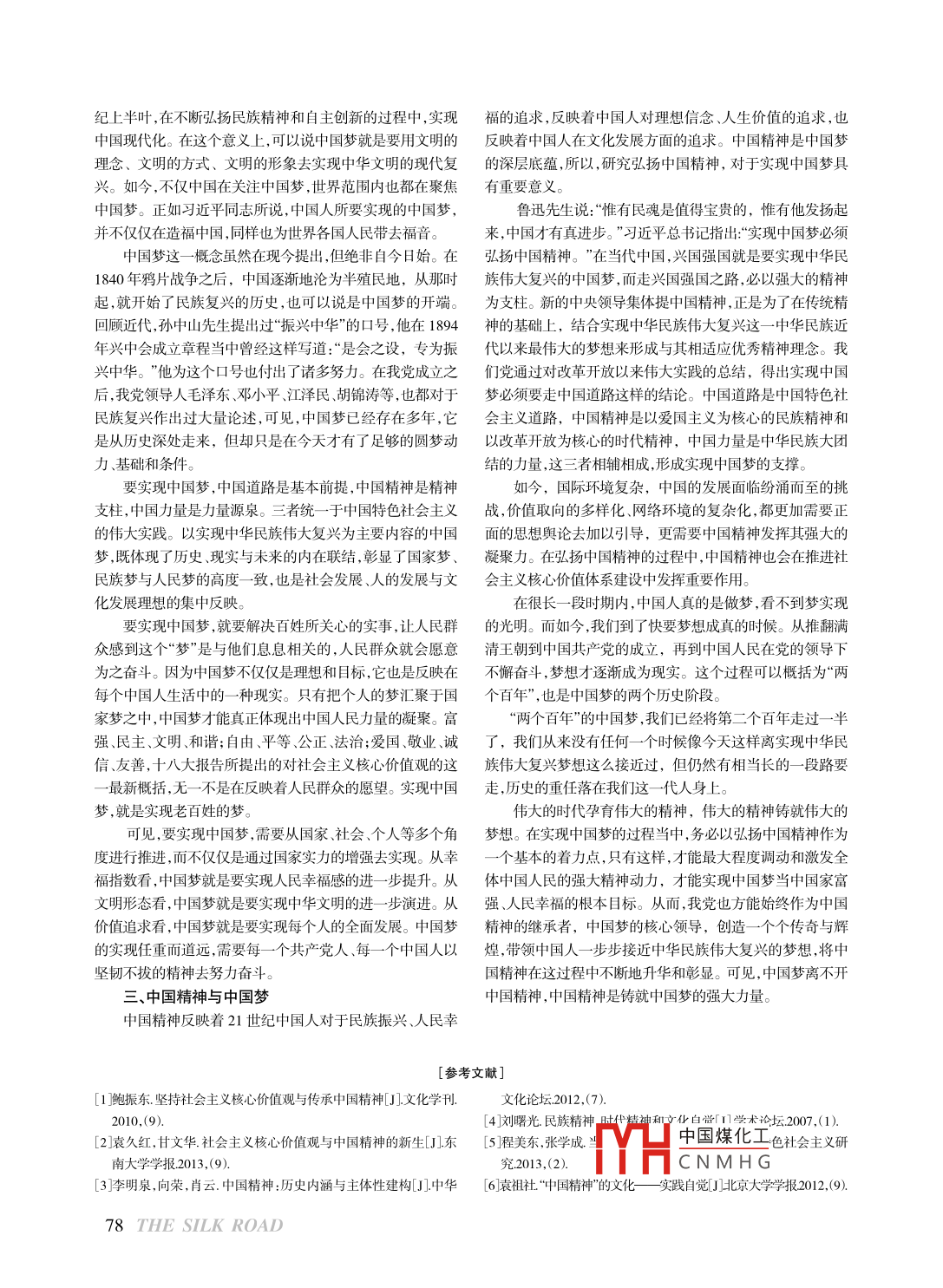 2016年第10期綢路總第323期THE SILK ROAD理論與實踐S中國精神鑄就中國夢徐亮(甘肅交通職業(yè)技術學院,甘肅蘭州730070)[摘要]中國精神是中華民族的心理特征、文化傳統(tǒng)、思想情感的綜合反映和共同的價值理念。中國精神的歷史內涵是天人合一的宇宙精神仁者愛人的道德精神、自強不息的奮斗精神、萬眾一心的團結精神和開創(chuàng)博納的創(chuàng)新精神,是實現(xiàn)中華民族偉大復興的強大動力。而實現(xiàn)中華民族偉大復興,正是中華民族近代以來最偉大的夢想,這個夢想凝聚了幾代中國人的夙愿,也正是我們所說的“中國夢”。中國夢的實現(xiàn)離不開弘揚中國精神,中國精神也必然是鑄就中國夢的不竭動力。[關鍵詞]中國精神;中國夢;民族復興[中圖分類號]D643[文獻標識碼]A[文章編號]005-3115(2016)10-0077-02中國精神是中華民族在長期的求生存、圖發(fā)展、謀振興辯證唯物的眼光去分析傳統(tǒng)的中國精神文化,為其注人新的的過程中形成的共同的民族品格、民族意識、民族心理、民時代內涵。所以,在傳統(tǒng)的中華民族精神文化上形成突破,達族情懷的總和,是沉淀在每個中國人血脈中的強大力量,是到與現(xiàn)階段中國實際相適應的精神文化,是一個重要問題。支撐中華民族百折不撓、勇往直前的不朽靈魂,是實現(xiàn)中華中央領導集體提中國精神正是為了解決這一問題。我民族偉大復興、建設中國特色社會主義的不竭動力,是建設國一直將實現(xiàn)中華民族偉大復興,作為中華民族近代以來社會主義核心價值體系的豐厚精神資源。而實現(xiàn)中華民族最偉大的夢想。偉大的夢想,需要有偉大的精神做攴撐。以偉大復興,也正是習總書記所提出的中國夢所指,中國精神習近平同志為總書記的新一屆中央領導集體提出了弘揚中與中國夢之間,必然存在著緊密的聯(lián)系國精神,發(fā)揮中國力量,以實現(xiàn)“中國夢”,這一號召體現(xiàn)出了中國精神所指時代要求和人民群眾的愿望,極大地凝聚了中國人民的共人不能沒有精神,同樣的,國家也不能沒有精神。良好識,指導并鼓舞我們同心同德,激發(fā)凝聚起偉大的中國精的精神理念,反映著人類發(fā)展的光輝,是人類走進現(xiàn)代文明神,共同投入到建設中國特色社會主義的事業(yè)中去的標志。我國有崇尚精神的優(yōu)秀傳統(tǒng),對理想道德、人生境筆者認為,要弘揚發(fā)展中國精神,有以下五個實現(xiàn)途界都表現(xiàn)出獨到的理解和非凡的重視,這些在中華民族徑:第一,以教育為本,發(fā)揮教育在弘揚中國精神中的重要5000多年歷史進程中凝練的優(yōu)秀傳統(tǒng),也正是中華民族的作用,將弘揚和發(fā)展中國精神納入國民教育的全過程;第精神標識之一。二,繼續(xù)深入學習馬克思主義及中國特色社會主義理論體我國向來強調需具備中國精神,中國精神是指以愛國系貫徹教育的始終,提高國民發(fā)展中國精神的自覺性;第三,主義為核心的民族精神和以改革創(chuàng)新為核心的時代精神。堅持奏響主旋律,善于傳播正能量,在日常生活中營造弘揚民族精神和時代精神,是我們社會主義核心價值體系的精中國精神的氛圍,實現(xiàn)民族復興的精神引領;第四,既要仰髓,也是緊密相連的、一個民族賴以生存發(fā)展的精神支撐。望星空,也要腳踏實地,各族人民心往一處想、勁往一處使在中國精神中,涵蓋了許多內容,如中華民族團結統(tǒng)使中國精神成為維系中華民族生存與發(fā)展的紐帶;第五,激愛好和平、勤勞勇敢、自強不息的偉大民族精神,又如打勵全國各族人民積極投身到社會主義現(xiàn)代化建設當中去破陳規(guī)、大膽探索、敢于創(chuàng)造的偉大時代精神,它們無一不提前全民族的精氣神,使中國精神在達到增強綜合國力這在體現(xiàn)著中華民族光輝燦爛、享譽世界的中華文明。這些傳目標的同時,也成為提升綜合國力的精神支撐統(tǒng)文化是中華民族的精神家園,也是中國特色社會主義發(fā)二、中國夢所指展的沃土。毋庸置疑,傳統(tǒng)精神是寶貴的,但是在時代面前,2012年11月29日上午,習近平總書記率新一屆中央這些民族精神受到了一系列挑戰(zhàn)。恩格斯指出:“每一個時領導集體來到中國國家博物館參觀“復興之路”基本陳列代的理論思維,從而我們時代的理論思維,都是一種歷史的時,第一次提出了實現(xiàn)中華民族偉大復興的中國夢??倳洰a(chǎn)物,它在不同的時代具有完全不同的形式,同時具有完全在十二屆全國人大一次會議上的講話上,再一次系統(tǒng)地闡不同的內容?!绷暯酵局赋?對存在合理內核、又具有舊述了這個思想,在中國煤化工亞洲博鰲論時代要素的內容,要取其精華、去其糟粕。對明顯不符合當壇等講話中又進CNMHG今時代要求的內容,要加以揚棄。這就要求我們要善于采取中國夢,是中國人的現(xiàn)代化追求,就是我們要在21世THE SILK ROAD 77紀上半葉,在不斷弘揚民族精神和自主創(chuàng)新的過程中,實現(xiàn)福的追求,反映著中國人對理想信念、人生價值的追求,也中國現(xiàn)代化。在這個意義上,可以說中國夢就是要用文明的反映著中國人在文化發(fā)展方面的追求。中國精神是中國夢理念、文明的方式、文明的形象去實現(xiàn)中華文明的現(xiàn)代復的深層底蘊,所以,研究弘揚中國精神,對于實現(xiàn)中國夢具興。如今,不僅