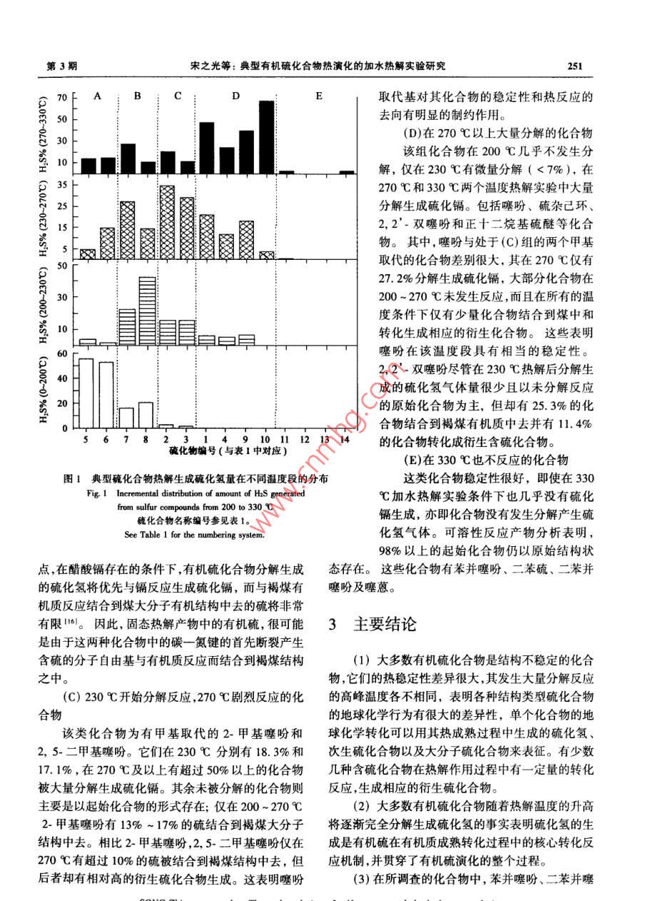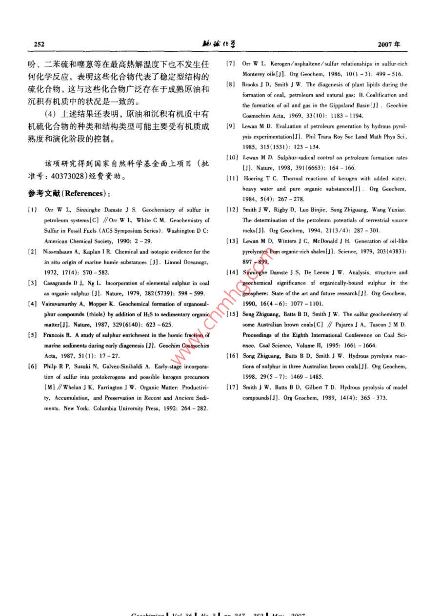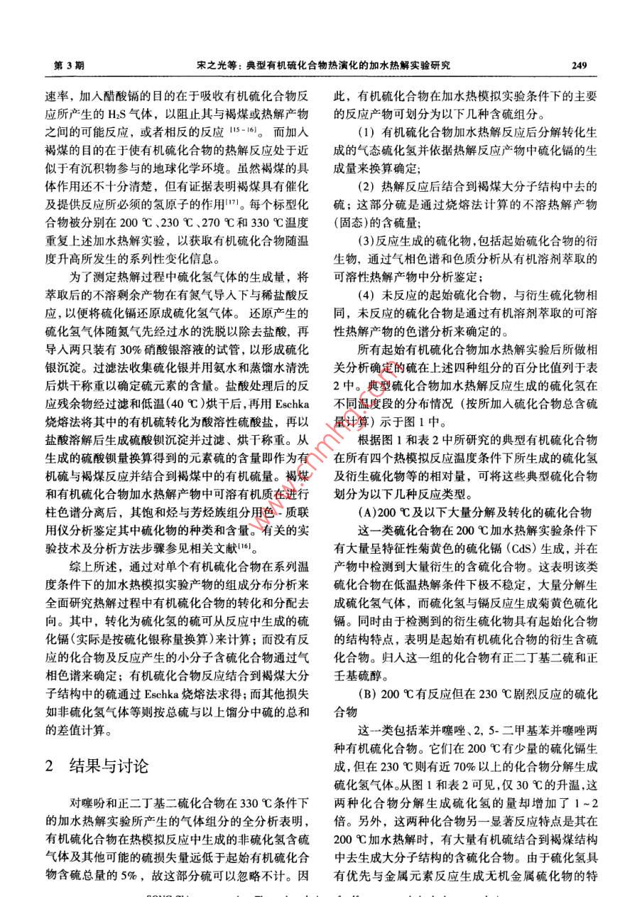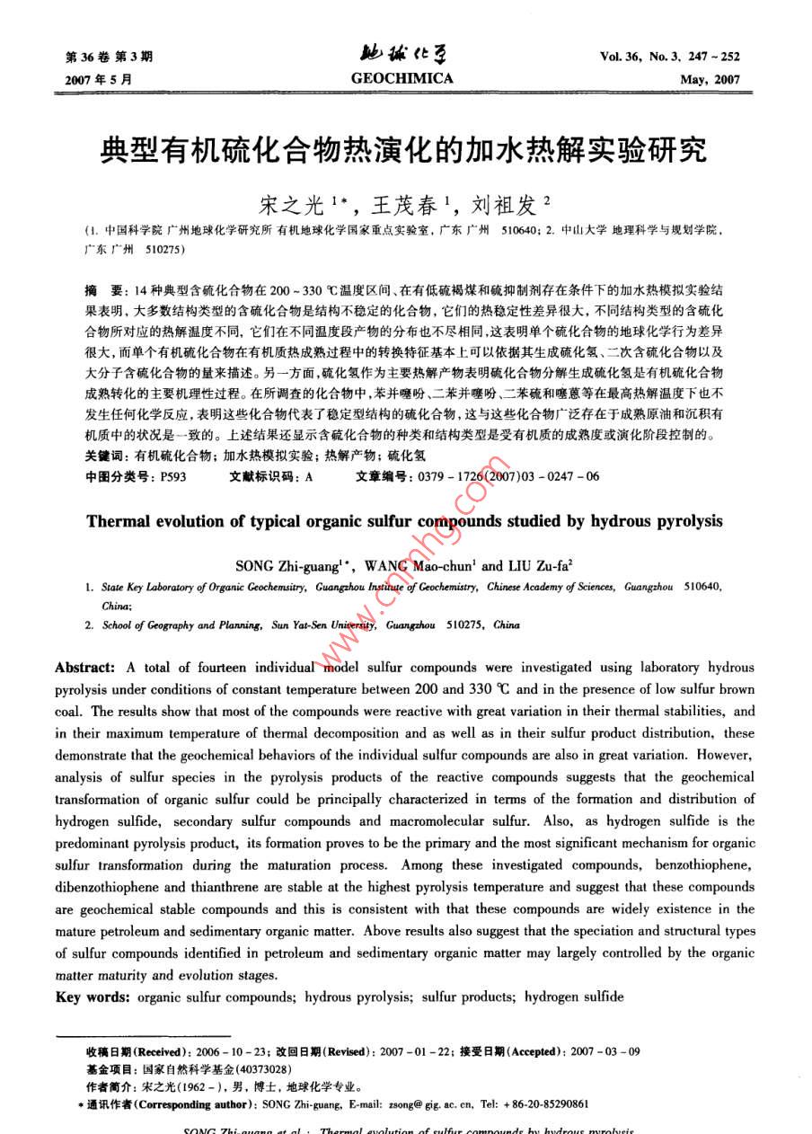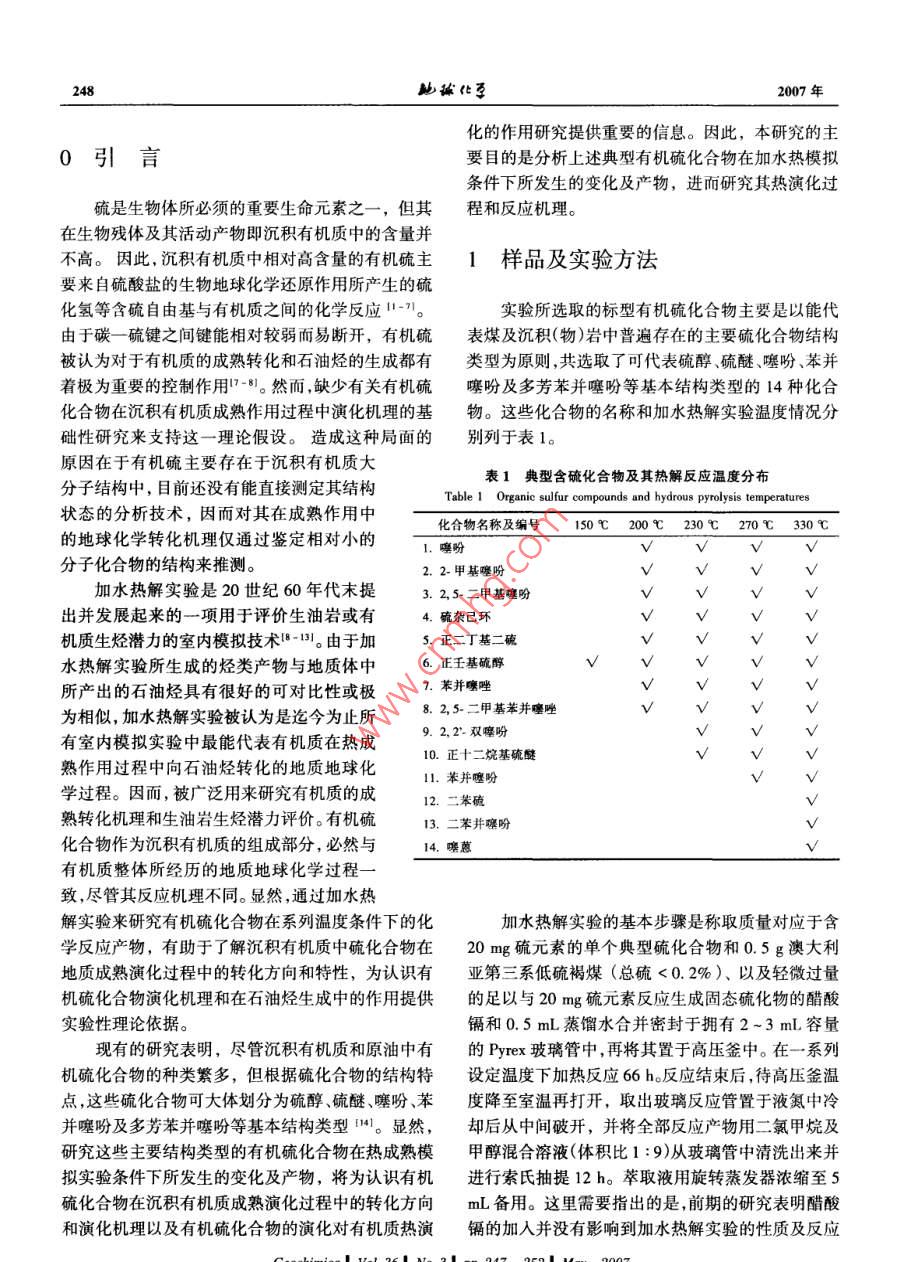第36卷第3期鮑琳化孕Vol. 36, No.3, 247 ~ 2522007年5月GEOCHIMICAMay, 2007典型有機(jī)硫化合物熱演化的加水熱解實(shí)驗(yàn)研究宋之光'",王茂春',劉祖發(fā)2(I.中國(guó)科學(xué)院廣州地球化學(xué)研究所有機(jī)地球化學(xué)國(guó)家重點(diǎn)實(shí)驗(yàn)室,廣東廣州510640; 2.中山大學(xué)地理科學(xué)與規(guī)劃學(xué)院,廣東廣州510275)摘要:14種典型含硫化合物在200~330C溫度區(qū)間、在有低硫褐煤和硫抑制劑存在條件下的加水熱模擬實(shí)驗(yàn)結(jié)果表明,大多數(shù)結(jié)構(gòu)類型的含硫化合物是結(jié)構(gòu)不穩(wěn)定的化合物,它們的熱穩(wěn)定性差異很大,不同結(jié)構(gòu)類型的含硫化合物所對(duì)應(yīng)的熱解溫度不同,它們?cè)诓煌瑴囟榷萎a(chǎn)物的分布也不盡相同,這表明單個(gè)硫化合物的地球化學(xué)行為差異很大,而單個(gè)有機(jī)硫化合物在有機(jī)質(zhì)熱成熟過(guò)程中的轉(zhuǎn)換特征基本上可以依據(jù)其生成硫化氫、二次含硫化合物以及大分子含硫化合物的量來(lái)描述。另一方面,硫化氫作為主要熱解產(chǎn)物表明硫化合物分解生成硫化氫是有機(jī)硫化合物成熟轉(zhuǎn)化的主要機(jī)理性過(guò)程。在所調(diào)查的化合物中,苯并噻吩、二苯并噻吩、二苯硫和噻蔥等在最高熱解溫度下也不發(fā)生任何化學(xué)反應(yīng),表明這些化合物代表了穩(wěn)定型結(jié)構(gòu)的硫化合物,這與這些化合物廣泛存在于成熟原油和沉積有機(jī)質(zhì)中的狀況是一致的。 上述結(jié)果還顯示含硫化合物的種類和結(jié)構(gòu)類型是受有機(jī)質(zhì)的成熟度或演化階段控制的。關(guān)鍵詞:有機(jī)硫化合物;加水熱模擬實(shí)驗(yàn);熱解產(chǎn)物;硫化氫中團(tuán)分類號(hào): P593文獻(xiàn)標(biāo)識(shí)碼: A文章編號(hào): 0379 - 1726(2007)03 - 0247 -06Thermal evolution of typical organic sulfur compounds studied by hydrous pyrolysisSONG Zhi-guang'", WANG Mao-chun' and LIU Zu-fa21. Stale Key Laboratory of Organic Ceochemsiry, Guanghou Institute of Geochemistry, Chinese Academy of Sciences, Guangzhou 510640,。School of Geography and Planning, Sun Ya-Sen Unirersity, Guangzhou 510275, ChinaAbstract: A total of fourteen individual model sulfur compounds were investigated using laboratory hydrouspyrolysis under conditions of constant temperature between 200 and 330 C and in the presence of low sulfur browncoal. The results show that most of the compounds were reactive with great variation in their thermal stabilities, andin their maximum temperature of thermal decomposition and as well as in their sulfur product distribution, thesedemonstrate that the geochemical behaviors of the individual sulfur compounds are also in great variation. However,analysis of sulfur species in the pyrolysis products of the reactive compounds suggests that the geochemicaltransformation of organic sulfur could be principally characterized in terms of the formation and distribution ofhydrogen sulfide, secondary sulfur compounds and macromolecular sulfur. Also, as hydrogen sulfide is thepredominant pyrolysis product, its formation proves to be the primary and the most significant mechanism for organicsulfur transformation during the maturation process. Among these investigated compounds, benzothiophene,dibenzothiophene and thianthrene are stable at the highest pyrolysis temperature and suggest that these compoundsare geochemical stable compounds and this is consistent with that these compounds are widely existence in themature petroleum and sedimentary organic matter. Above results also suggest that the speciation and structural typesof sulfur compounds identified in petroleum and sedimentary organic matter may largely controlled by the organicmatter maturity and evolution stages.Key words: organic sulfur compounds; hydrous pyrolysis; sulfur products; hydrogen sulfide收稿日期(Received): 2006 - 10- 23;改回日期(Rerised): 2007 -01 - 22;接受日期(Accepted); 2007 -03 -09基金項(xiàng)目:國(guó)家自然科學(xué)基金(40373028)作者簡(jiǎn)介:宋之光(1962-).男,博士,地球化學(xué)專業(yè)。*通訊作者(Corresponding author): SONG Zhi- guang, E-mail: zsong@ gig. ac. cn, Tel: + 86-20-85290861248地球化李2007年化的作用研究提供重要的信息。因此,本研究的主0引言要目的是分析上述典型有機(jī)硫化合物在加水熱模擬條件下所發(fā)生的變化及產(chǎn)物,進(jìn)而研究其熱演化過(guò)硫是生物體所必須的重要生命元素之- -,但其程和反應(yīng)機(jī)理。在生物殘?bào)w及其活動(dòng)產(chǎn)物即沉積有機(jī)質(zhì)中的含量并不高。因此,沉積有機(jī)質(zhì)中相對(duì)高含量的有機(jī)硫主1樣品及實(shí)驗(yàn)方法要來(lái)自硫酸鹽的生物地球化學(xué)還原作用所產(chǎn)生的硫化氫等含硫自由基與有機(jī)質(zhì)之間的化學(xué)反應(yīng)11-71。實(shí)驗(yàn)所選取的標(biāo)型有機(jī)硫化合物主要是以能代由于碳一硫鍵之間鍵能相對(duì)較弱而易斷開,有機(jī)硫表煤及沉積(物)巖中普遍存在的主要硫化合物結(jié)構(gòu)被認(rèn)為對(duì)于有機(jī)質(zhì)的成熟轉(zhuǎn)化和石油烴的生成都有類型為原則,共選取了可代表硫醇硫醚、噻吩、苯并著極為重要的控制作用17-81。然而,缺少有關(guān)有機(jī)硫噻吩及多芳苯并噻吩等基本結(jié)構(gòu)類型的14種化合化合物在沉積有機(jī)質(zhì)成熟作用過(guò)程中演化機(jī)理的基物。這些化合物的名稱和加水熱解實(shí)驗(yàn)溫度情況分礎(chǔ)性研究來(lái)支持這-理論假設(shè)。造