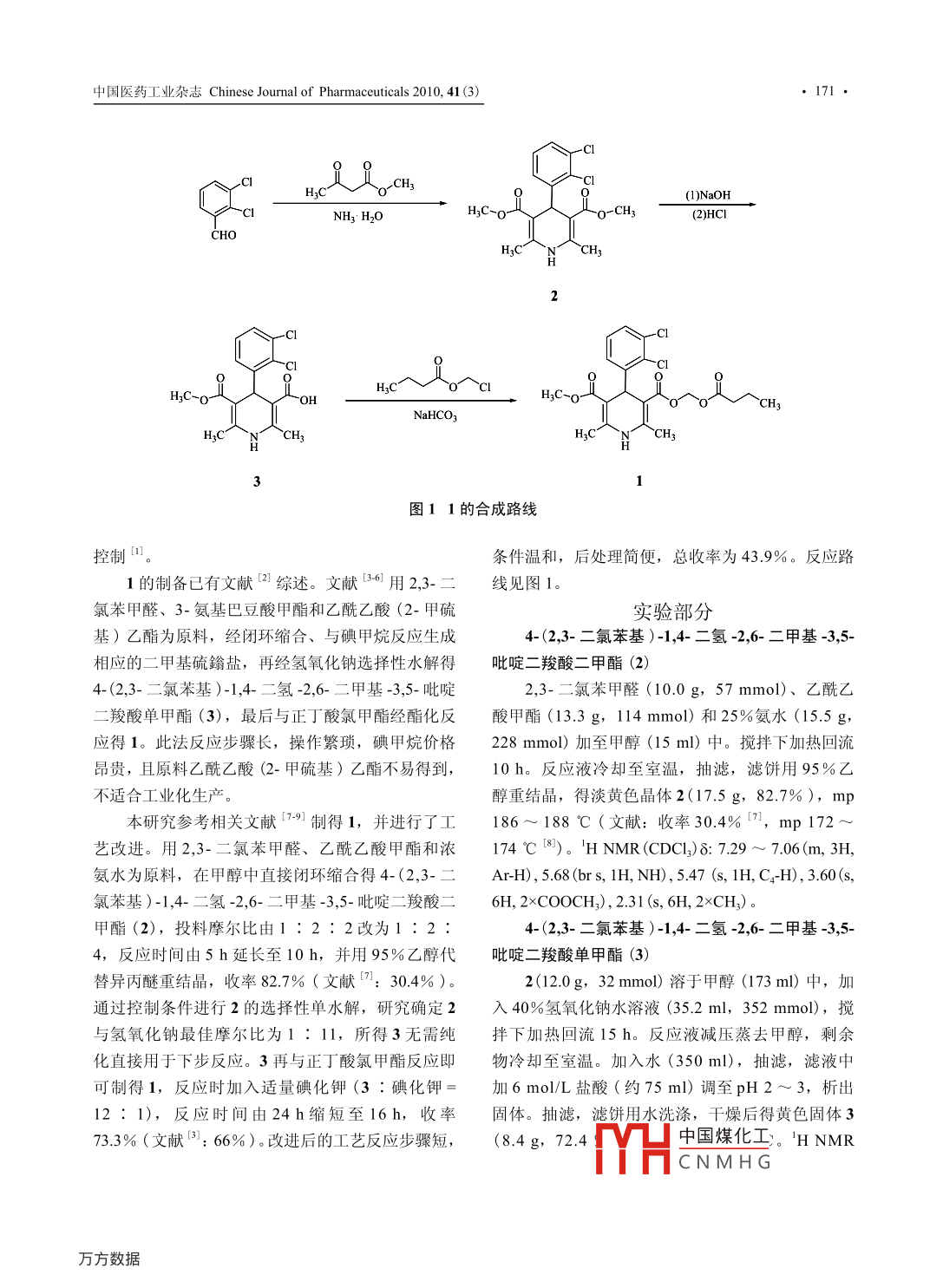 中國醫(yī)藥工業(yè)雜志Chinese Joumal of Pharmaceuticals 2010, 41 (3)氯維地平的合成曹秀芝,陳國華*,張明亮,王麗(中國藥科大學(xué)藥物化學(xué)教研室,江蘇南京210009)摘要: 2,3-二氯苯甲醛、乙酰乙酸甲酯和濃氨水經(jīng)閉環(huán)縮合、選擇性水解得4-(2,3-二氯苯基)-1,4-二氫-2,6-二甲基-3,5-吡啶二羧酸單甲酯,再與正丁酸氯甲酯反應(yīng)制得抗高血壓藥氯維地平,總收率約44%。關(guān)鍵詞:氯維地平;抗高血壓藥;鈣通道拮抗劑:合成中圖分類號: R972*.4 .文獻(xiàn)標(biāo)志碼: A文章編號: 1001-8255 (2010) 03-0170-03Synthesis of Clevidipine ButyrateCAO Xiuzhi, CHEN Guohua*, ZHANG Mingliang, WANG Li(Dept. of Medicinal Chemistry, China Pharmaceutical University, Nanjing 210009)ABSTRACT: Clevidipine butyrate was synthesized from 2,3-dichlorobenzaldehyde, methyl acetoacetate andammonia by cyclocondensation and selective hydrolysis to give 4- (2,3-dichlorophenyI)-1,4-dihydro-2,6-dimethyl-3,5-pyridinedicarboxylic acid monomethyl ester, which was subjected to reaction with chloromethyl butyrate with an overallyield of about 44%.Key Words: clevidipine butyrate; antihypertensive agent; calium channel antagonist; synthesis氯維地平(clevidipine butyrate,1), 化學(xué)名.吡啶二羧酸甲基(1-氧代丁氧基)甲酯,是英國為4-(2,3-二氯苯基)-1,4-二氫-2,6-二甲基-3,5-AstraZeneca公司研制的新型靜脈注射用二氫吡啶類鈣通道拮抗劑,可選擇性抑制動脈血管平滑肌收稿日期: 2009-04-23; 修回日期: 2010-01-04作者簡介:曹秀芝(1983-), 女,碩士研究生,專業(yè)方向:藥物合細(xì),胞外的鈣離子內(nèi)流。本品于2008年8月經(jīng)美國FDA批準(zhǔn)上市,商品名Cleviprex,主要用于住院通信聯(lián)系人:陳國華(1963-), 男,副研究員,從事新藥的研發(fā)。患者的血壓控制,包括急進(jìn)性高血壓的治療,以及Tel: 025-83241246E-mail: cgh63@ 163.com心臟手術(shù)、經(jīng)皮冠狀動脈介入治療等手術(shù)后的血壓參考文獻(xiàn):[6] Dunn JP, Ackerman NA, Tomolonis AJ. Analgetic and1] Nunn PA, Greengrass PM, Newgreen DT, et al. The bindingantinflammatory 7-aroylbenzofuran-ylacetic acids and7-aroylbenzothiophene 5-ylacetic acids [J]. J Med Chem,profle of the novel muscarinic receptor antagonist the fivecloned human muscarinic receptors expressed in CHO cells1986, 29(11): 2326-2329.[J]. Br.J Pharmacol, 1996, 117: 130.[7] Nystrom RF, Brown WG. Reduction organic compounds by2] Newgreen DT, Anderson DW, Carter AJ. Darifenacin:lithium aluminum hydride. II . Carboxylic acids [J].J Ama novel bladder-selective muscarinic antagonist for theChem Soc, 1947, 69(10): 2548-2549.treatment of urge incontinence [J].J Urol, 1996, 155: 156.[8] Cross PE, Mackenzie AR. Pyrrolidine derivatives: EP,[3] 劉長歡,俞雄,袁哲東. 氫溴酸達(dá)非那新的合成[].中0388054 [P]. 1990-09-19. (CA 1991, 114: 247125)國醫(yī)藥工業(yè)雜志, 2007, 38(12): 825-827.9] 林蓉,鄧啟華,周謐,等.氫溴酸達(dá)非那新的合成研究[4] 鄭靜,方霞.5-乙酰基-2,3- 二氫苯并呋喃的合成[].[J].化學(xué)世界, 2009, 2: 100-103. (CA 2003, 139: 292143)精細(xì)化工中間體, 2007, 37(4): 34-35. .[10] Dunn PJ, Matthews JG, Newbury TJ, et al. Stable hydrate[5] Alabaster RJ, Cotrell IF. The synthesis of 5-substitutedof a musca中國煤化工6930188 [P].2,3-dihydrobenzofunars [J]. Synthesis, 1988, 27: 950-952.2005-08-16:MHCNMH G中國醫(yī)藥工業(yè)雜志Chinese Journal of Pharmaceuticals 2010, 41 (3)Cl員icIgC-(1)NaOH大~cNH3 H2O-CH(2)HClCHOHqC N CH32-CH2C-o~0HHzC是~。H;C-oL9CH3NaHCO3HC^ N~CH3HzC N CH3圖11的合成路線控制”。條件溫和,后處理簡便,總收率為43.9%。反應(yīng)路1的制備已有文獻(xiàn)[2]綜述。文獻(xiàn)[3-6]用2,3-二線見圖1。氯苯甲醛、3-氨基巴豆酸甲酯和乙酰乙酸(2- 甲硫?qū)嶒灢糠只?乙酯為原料,經(jīng)閉環(huán)縮合、與碘甲烷反應(yīng)生成4-(2,3-二氯苯基)-1,4-二氫-2,6-二甲基-3,5- .相應(yīng)的二甲基硫鑰鹽,再經(jīng)氫氧化鈉選擇性水解得吡啶二羧酸二甲酯(2)4-(2,3-二氯苯基)-1,4-二氫-2,6-二甲基-3,5-吡啶2,3-二:氯苯甲醛(10.0g, 57 mmol)、乙酰乙.二羧酸單甲酯(3),最后與正丁酸氯甲酯經(jīng)酯化反酸甲酯(13.3 g,114 mmol)和25%氨水(15.5 g,應(yīng)得1。此法反應(yīng)步驟長,操作繁瑣,碘甲烷價格228 mmol)加至甲醇(15 ml)中。攪拌下加熱回流昂貴,且原料乙酰乙酸(2-甲硫基)乙酯不易得到,10h。 反應(yīng)液冷卻至室溫,抽濾,濾餅用95%乙不適合工業(yè)化生產(chǎn)。醇重結(jié)晶,得淡黃色晶體2(17.5 g, 82.7% ),mp本研究參考相關(guān)文獻(xiàn)(7-91 制得1,并進(jìn)行了工186~ 188 °C (文獻(xiàn):收率30.4% [7), mp 172 ~藝改進(jìn)。用2,3-二氯苯甲醛、乙酰乙酸甲酯和濃174 C [8)。'H NMR (CDCl3)δ: 7.29 ~ 7.06 (m, 3H,氨水為原料,在甲醇中直接閉環(huán)縮合得4-(2,3-二Ar-H), 5.68 (br s, 1H, NH), 5.47 (s, 1H, C-H), 3.60(s,氯苯基)-1,4-二氫-2,6-二甲基-3,5-吡啶二羧酸二6H, 2xCOOCH;), 2.31 (s, 6H, 2xCH)。甲酯(2),投料摩爾比由1:2:2改為1:2:4-(2,3-二氯苯基)-1,4-二氫-2,6-二甲基-3,5-4,反應(yīng)時間由5 h延長至10h,并用95%乙醇代吡啶二羧酸單甲酯(3)替異丙醚重結(jié)晶,收率82.7% ( 文獻(xiàn)7: 30.4% )。2(12.0g,32 mmol)溶于甲醇(173ml1) 中,加通過控制條件進(jìn)行2的選擇性單水解,研究確定2入40%氫氧化鈉水溶液35.2 ml, 352 mmol),攪與氫氧化鈉最佳摩爾比為1 : 11, 所得3無需純拌下加熱回流15 h。反應(yīng)液減壓蒸去甲醇,剩余化直接用于下步反應(yīng)。3再與正丁酸氯甲酯反應(yīng)即物冷卻至室溫。加入水(350 ml),抽濾,濾液中可制得1,反應(yīng)時加入適量碘化鉀(3 :碘化鉀=加6 mol/L鹽酸(約75 ml)調(diào)至pH 
