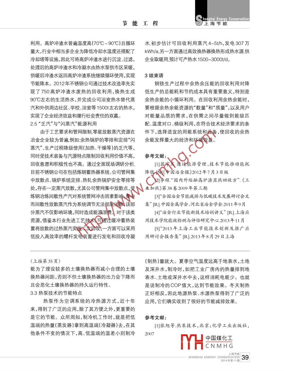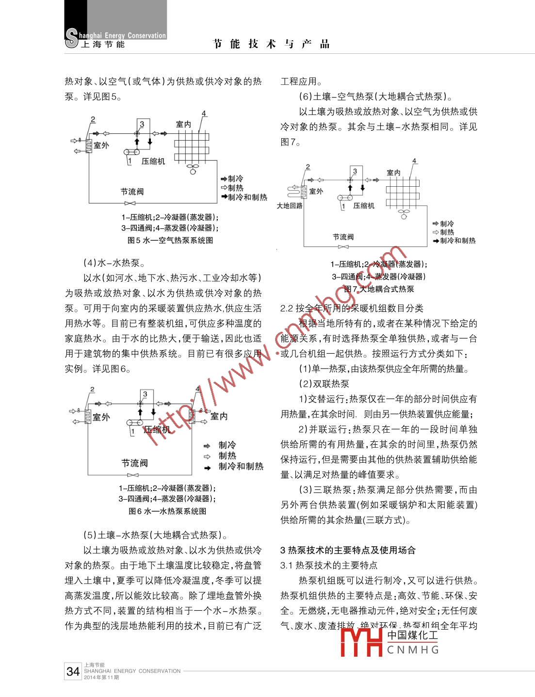 hanshai EnergyConservation上海節(jié)能節(jié)能技術(shù)與產(chǎn)品熱泵技術(shù).上海理工大學(xué)環(huán)境學(xué)院戴睿王麗慧同濟(jì)大學(xué)機(jī)械與能源工程學(xué)院吳喜平摘要:熱泵技術(shù)是近年來(lái)全世界倍受關(guān)注的新能源技術(shù)。熱泵是一種能從自然界的空氣、水或土壤中獲取低品位熱能,經(jīng)過(guò)電力做功,提供可被人們所用的高品位熱能的裝置。該文從介紹熱泵的定義入手,將熱泵系統(tǒng)進(jìn)行分類并分析其主要特點(diǎn)及應(yīng)用場(chǎng)合,進(jìn)而分析熱泵系統(tǒng)的經(jīng)濟(jì)效益以及環(huán)保效益。關(guān)鍵詞:熱泵系統(tǒng);經(jīng)濟(jì)分析;節(jié)能Heat Pump SystemDai rui, Wang li hui, Wu xi pingAbstract: In recent years, heat pump technology, as a new energy technology, hasattracted more attention in the world wide. The heat pump is a device that transferringlow-grade energy into high-grade energy through electric power.This paper introduces thedefinition of heat pump, its classification and application. At last, analyses its economicbenefits and environmental benefits.Keywords: heat pump system; economic analysis;energysaving1熱泵的定義值。例如制冷機(jī)就是利用制冷劑液-→汽相變來(lái)達(dá)1.1制冷機(jī)到制冷的目的;而冰蓄冷空調(diào)技術(shù)是利用水的液- >(1)物質(zhì)相變和特點(diǎn)固相變來(lái)達(dá)到最大限度蓄冷的目的。在大自然界中,物質(zhì)通常有三種狀態(tài),從一種(2)活塞壓縮制冷的基本原理狀態(tài)變化到另一種狀態(tài)我們稱之為物質(zhì)的相變?;钊麎嚎s制冷的基本原理是利用制冷劑如氟相變的形式有四種:固←→液;液←→汽;利昂或者氨的相變,即由汽態(tài)變成液態(tài)而放熱;液固←→汽;固←→固。相變過(guò)程是等溫或近似等態(tài)變成汽態(tài)而吸熱的原理來(lái)達(dá)到制冷目的。溫過(guò)程。相變過(guò)程中伴有能量的吸收或釋放,這部圖1所示是活塞壓縮式制冷機(jī)的基本組成主分能量稱為相變潛熱。相變潛熱一般較大, 以水為要 四大件,即壓縮機(jī)1,冷凝器2,節(jié)流閥3和蒸發(fā)例器4。汽態(tài)的制冷劑在壓縮機(jī)內(nèi)被壓縮,溫度升固→液溶解熱:90 kcalkg (1atm,0C)高,壓力加大。被壓縮的汽態(tài)制冷劑接著流向冷凝液→氣汽化熱:539 kcal/kg ( 1atm,0°C) .器,在冷凝器內(nèi)制冷劑被冷卻水冷卻,在-定壓力相變過(guò)程是一伴隨有較大能量吸收或釋放的下在冷凝器內(nèi)變成液態(tài)。經(jīng)過(guò)節(jié)流閥,制冷劑壓力等溫或近似等溫過(guò)程,因此它有著廣泛的應(yīng)用價(jià)降低。此后,制冷劑迅速汽化,在蒸發(fā)器內(nèi)吸收冷[基金項(xiàng)目]國(guó)家自然科學(xué)基金50908147、51 108263。[作者簡(jiǎn)介]戴睿,1990年8月生,上海理工大學(xué)環(huán)境學(xué)院在讀研究生,攻讀供熱供中國(guó)煤化工YHCNMH G|32 | SHANGHAI ENERGY CONSERVATION2014年第11期hanshai Energy Consevation節(jié)能技術(shù)與產(chǎn)品上海節(jié)能可以分成很多類型。2.1按熱源和熱匯(熱分配系統(tǒng))分類(1)空氣-空氣熱泵。冷卻水出←' 冷凍水出-冷凍水進(jìn)以一側(cè)的空氣(或廢氣)為吸熱或放熱對(duì)象、以另一側(cè)的空氣(或氣體)為供熱或供冷對(duì)象的熱泵。以空氣作為熱源或冷熱源時(shí)使用很方便。考1.壓縮機(jī); 2.冷凝器; 3.節(jié)流閥: 4.蒸發(fā)器慮當(dāng)室外氣溫較低時(shí)室外側(cè)熱交換器的除霜,多采圖1壓縮制冷機(jī)的工作原理用輔助熱源,以提高冬季供熱性能。空氣- .空氣熱凍水大量的熱量,冷凍水溫度降低,從而達(dá)到制冷泵式空調(diào)器,冬天供熱,夏天制冷,詳見(jiàn)圖3。目的。制冷劑在蒸發(fā)器內(nèi)吸收大量熱量后,全部汽化。汽態(tài)的制冷劑再進(jìn)入壓縮機(jī),這樣周而復(fù)始的室外室內(nèi)循環(huán)不斷產(chǎn)生冷量。↑+1.2熱泵與制冷機(jī)的關(guān)系1壓縮機(jī)中制冷制冷機(jī)在工作時(shí),實(shí)際上同時(shí)產(chǎn)生熱量(冷凝8中制熱器)和冷量(蒸發(fā)器),冬季能有效利用其熱量,夏天→制冷和制熱節(jié)流閥能有效利用其冷量的裝置稱為熱泵。如圖2所示,-D如果用-只四通換向閥來(lái)控制改變制冷劑在裝置1-壓縮機(jī);2- -冷凝器(蒸發(fā)器);中的流向,就可以達(dá)到夏季對(duì)室內(nèi)制冷、冬季對(duì)室3-四通閥;4-蒸發(fā)器(冷凝器)圖3空氣-空氣熱泵系統(tǒng)圖內(nèi)供熱的目的。(2)空氣-水熱泵。以空氣(或氣體)為吸熱或放熱對(duì)象、以水為供熱或供冷對(duì)象的熱泵。目前空氣-水熱泵式冷熱水機(jī)組是如今辦公大樓集中式空調(diào)系統(tǒng)使用較多的冷熱源兼用型一體化設(shè)備,其單機(jī)容量范圍為四通縮|換向閥| 換向閥20~1000kW。詳見(jiàn)圖4。.om- 5om3節(jié)流裝置夏季制冷循環(huán)冬季熱泵循環(huán)圖2熱泵裝置8<熱泵的供熱系數(shù)恒大于1,他優(yōu)于其他供暖咖制冷裝置(如電加熱器等)之處就在于消耗同樣多的機(jī)5制熱械功對(duì)室內(nèi)供暖可比用其他方法得到更多的熱量,即除了由機(jī)械功所轉(zhuǎn)換的熱量外還包括制冷劑在1-壓縮機(jī);2-冷凝器(蒸發(fā)器);蒸發(fā)器中吸收的熱量。圖4空氣- -水熱泵 系統(tǒng)圖2熱泵的分類(3)水-空氣熱泵。按照不同的工作原理、驅(qū)動(dòng)形式、用途等,熱泵以水(如河水。地下水、廢熱水等)為吸熱或放中
