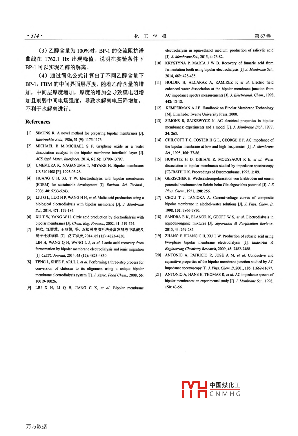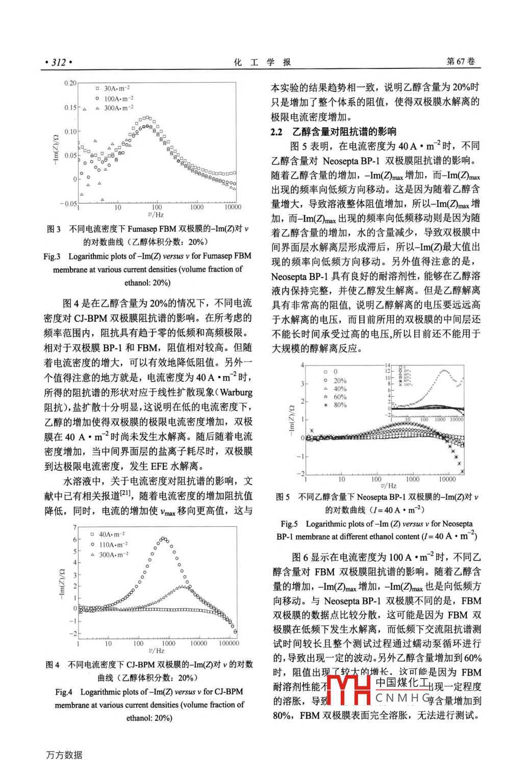 第67卷第1期化工學(xué)報(bào)VoL 67 No. 12016年1月CIESc JournalJanuary 2016研究論文222222:水-乙醇體系對(duì)雙極膜中間界面層的影響劉小菏,李秋花,葛亮,徐銅文(中國(guó)科學(xué)技術(shù)大學(xué)化學(xué)與材料科學(xué)學(xué)院,安徽合肥230026)摘要:選取 Neosepta BP-1, Fumasep FBM, CJ-BPM三種商業(yè)標(biāo)準(zhǔn)雙極膜作為研究對(duì)象,以水乙醇為研究體系,通過(guò)改變不同乙醇含量,測(cè)定雙極膜的交流阻抗譜,并且對(duì)雙極膜的耐溶劑性能進(jìn)行評(píng)價(jià),結(jié)果表明BP-1具有良好的耐溶劑性,FBM, CJ-BPM耐溶劑性相對(duì)較弱;水解離現(xiàn)象發(fā)生在LiC1水-乙醇混合溶液中,隨著乙醇含量的増加,雙極膜的阻值增加,而水解離程度降低。這種現(xiàn)象可以解釋為醇解離能力要遠(yuǎn)遠(yuǎn)小于水解離能力,因此乙醇的存在使得中間界面層區(qū)域的水濃度降低,進(jìn)而降低了水解離程度;通過(guò)簡(jiǎn)化算法計(jì)算出了不同乙醇含量FBM的中間界面層厚度,更直觀(guān)地看出乙醇對(duì)雙極膜水解離性能的影響。關(guān)鍵詞:水-乙醇體系;膜;離子交換;電化學(xué);交流阻抗譜DoI:10.11949/issn.0438-1157.20151004中圖分類(lèi)號(hào):TQ028.8文獻(xiàn)標(biāo)志碼:A文章編號(hào):0438-1157(2016)01-03090Influence of aqua-ethanol medium on properties of intermediate layer ofa bipolar membraneLIU Xiaohe, LI Qiuhua, GE Liang, XU Tongwen(School of chemistry and Materials Science, University of Science and Technology of China, Hefei 230026, Anhui, ChinaAbstract: A bipolar membrane(BPm) was composed of a cation and an anion ion-exchange layer joined togetherin series. The water dissociation in BPM was then considered as an electric field-enhanced(eFe) phenomenonand its magnitude depended critically on the structure and composition of the bipolar intermediate layer. Bychanging the different content of ethanol, three commercial bipolar membranes Neosepta BP-1, Fumasep FBMand CJ-BPM were tested by AC impedance spectra and their bipolar membrane solvent resistance were evaluatedsimultaneously. It was confirmed that BP-I had good solvent resistance and FBM and CJ-BPM solvent resistanceswere relatively weak. The experimental results showed that the water dissociation phenomenon occurred in theLiCi water-ethanol mixed solutions, and the local effective value of the bpm resistance increased with an increasein the content of ethanol, while the water dissociation became less obvious This phenomenon could be explaineddue to the fact that the dissociative ability of alcohol was weaker than that of water. Thus, the existence of ethanoldecreased the concentration of water in the intermediate layer of a bipolar membrane and caused the decrease inthe water dissociation effect By simplifying the algorithm to calculate the intermediate layer thickness of the BP-1and FBM membranes it was more intuitive to know the influence of ethanol content on the water dissociationKey words: water-ethanol system; membrane; ion exchange; electrochemistry; AC impedance spectra2015-06-29收到初稿,2015-08-27收到修改稿Received dat中國(guó)煤化工聯(lián)系人:徐銅文。第一作者:劉小菏(1989),女,碩士CNMHGuStc.edu.基金項(xiàng)目:國(guó)家自然科學(xué)基金項(xiàng)目(21206155)aLaI Science Foundationof China(212061553l0化工學(xué)報(bào)引言1實(shí)驗(yàn)材料和方法雙極膜是一種新型的離子交換復(fù)合膜,由陰離1.1材料子交換層、陽(yáng)離子交換層以及介于這兩膜層之間的實(shí)驗(yàn)中所用的雙極膜分別是 Neosepta BP-1中間界面層復(fù)合而成。雙極膜的中間界面層,也就( Tokuyama Soda Inc, Japan), Fumasep FBM(FuMA是雙極膜兩膜層間的過(guò)渡區(qū)域,它可以是兩膜層界 Tech gmbH, Germany), CJ-BPM(合肥科佳高分子面處陰、陽(yáng)離子交換層的一部分,然而,更多情況材料科技有限公司),它們的性質(zhì)列于表1中。實(shí)驗(yàn)下為了改善雙極膜的性能,在兩膜層間加入一介質(zhì)所用的試劑均為分析純,實(shí)驗(yàn)用水為去離子水。層,該介質(zhì)層具有催化水解離、吸水貯水和粘接兩膜層的作用3?;陔p極膜的電滲析具有低能耗、表1雙極膜性能參數(shù)Table 1 Properties of bipolar membranes過(guò)程簡(jiǎn)單、環(huán)境友好、便于與其他技術(shù)集成等突出優(yōu)點(diǎn),在污染控制、資源回收以及化工生產(chǎn)過(guò)程(特BPMAEMCEM Intermediate Thicknesslayer layer catalyst layer /um drop別是有機(jī)酸的生產(chǎn))中具有廣闊的和潛在的應(yīng)用,已BP1 amination PSF CM!Fe成為電滲析工業(yè)中新的增長(zhǎng)點(diǎn)40FBMBPPO SPEEK180目前關(guān)于雙極膜水解離性能的表征主要通過(guò)J-BPMSPPO測(cè)定IV曲線(xiàn),但ⅠV曲線(xiàn)只能反映一部分信息;O Data are collected from product brochure provided by the company作為輔助手段,交流阻抗譜能夠給出在膜結(jié)構(gòu)和功②0.5mol·LLiC,500A·m能特性方面的額外信息13文獻(xiàn)已報(bào)道了一些雙12測(cè)試方法極膜阻抗譜的研究, Simons等提出了一個(gè)非常簡(jiǎn)實(shí)驗(yàn)中所用的電化學(xué)交流阻抗譜測(cè)試裝置如單的模型,整個(gè)雙極膜的阻抗由膜本體的阻抗和雙圖1所示,電解液和電極液均采用05mol·L1極界面處的阻抗組成,但該模型只考慮了鹽離子,LiC1,雙極膜的有效面積為7cm2,在測(cè)試之前,雙極不能應(yīng)用到EFE( electric field enhanced)水解離的膜浸泡在相應(yīng)的電解液中2h,使得電解液與雙極膜情況。 chilcott等提出了一個(gè)更為精細(xì)的理論模之間達(dá)到平衡狀態(tài)。在反向偏壓