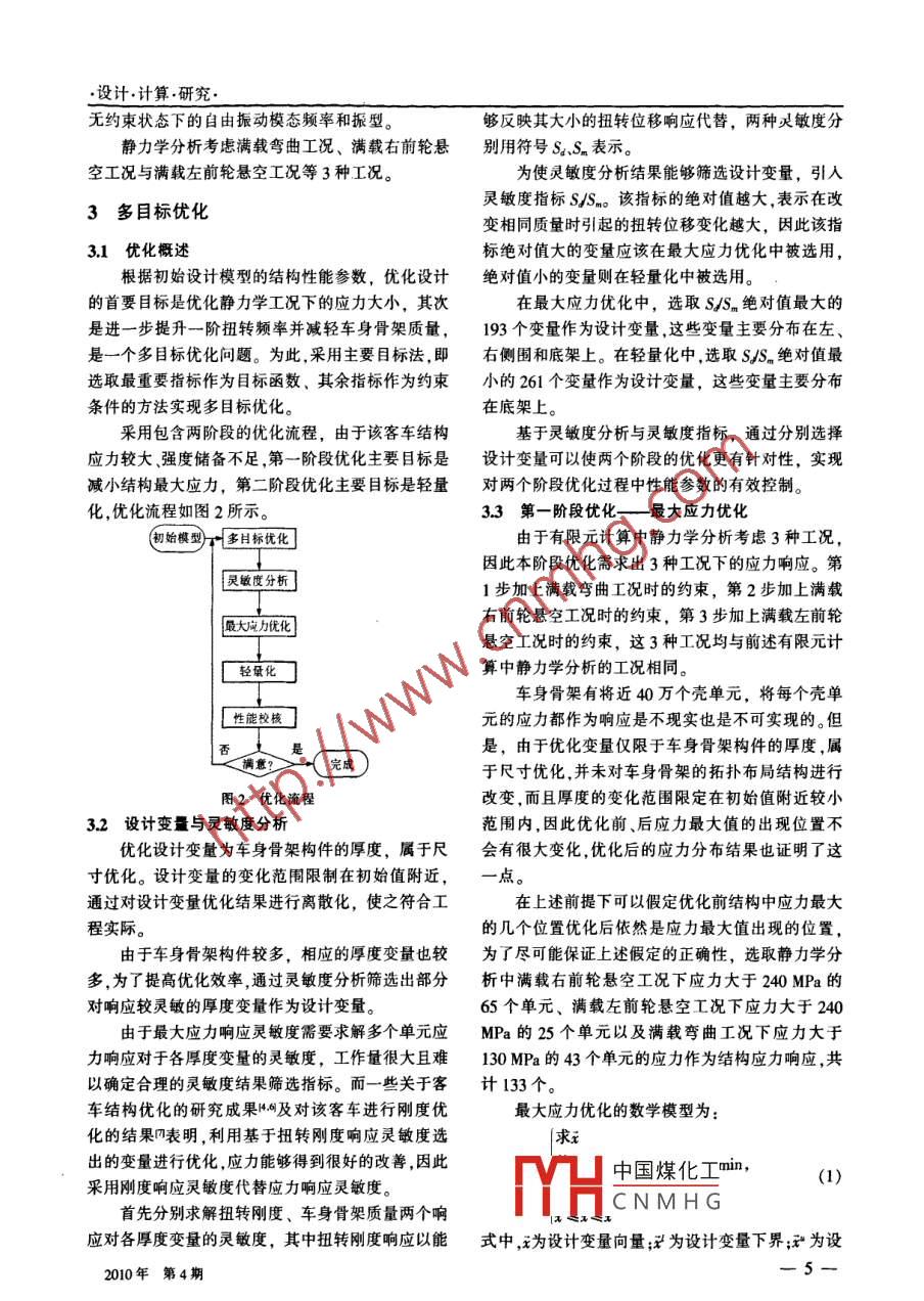 .設(shè)計.計算.研究.基于應(yīng)力優(yōu)化的大客車結(jié)構(gòu)多目標(biāo)優(yōu)化*丁煒琦蘇瑞意桂良進范子杰(清華大學(xué)汽車安全與節(jié)能國家重點實驗室)[摘要]對某全承載式大客車進行了結(jié)構(gòu)有限元分析.研究了該客車結(jié)構(gòu)強度、振動模態(tài)頻率.質(zhì)量等多個性能目標(biāo)的優(yōu)化設(shè)計問題。分析結(jié)果表明,該客車初始設(shè)計模型的剛度滿足設(shè)計要求但應(yīng)力較大強度儲備不足,因此采用優(yōu)化結(jié)構(gòu)最大應(yīng)力的方法進行優(yōu)化。經(jīng)過兩個階段的優(yōu)化設(shè)計,顯著降低了結(jié)構(gòu)最大應(yīng)力,提高了一階扭轉(zhuǎn)頻率,減輕了車身骨架質(zhì)量,客車結(jié)構(gòu)設(shè)計更為合理。主題詞:客車全承載式 有限元結(jié)構(gòu)優(yōu)化中圖分類號:U462.2文獻標(biāo)識碼:A 文章編號: 1000 -3703(2010)04- 000-04Multi- -objective Optimization on Bus Structure based onOptimized StressDing Weiqi, Su Ruiyi, Gui Liangjin, Fan Zijie(State Key Laboraiory of Automotive Safety and Energy Conseratin, Tsinghua University)[Abstract ]Structural FE analysis on an integral bus is perforned, in which optimal design of multiple performanceobjectives of structural strength, vibration modal frequency and mass is researched. The result of finite element analysisshows that the siffness of the initial design model of the bus meets design requirements, but the stress is very high andthe strength reserve is relatively poor, therefore, the optimization method which optimizes the maximum stress of structureis adopted. After the optimal design of two stages, the maximum stuctural stress is significantly reduced, the first -ordertorsional frequency is improved, the weight of body frame is reduced, and the structural design of the bus is morereasonable.Key words: Bus, Integral, Finite element, Structural optimization璃和內(nèi)飾的影響。車身骨架薄壁管件用殼單元模擬,1前言并用CWELD單元模擬焊接。懸架系統(tǒng)中,空氣彈簧本文首先利用MSC.Nastran有限元求解器得到用Bush單元模擬,車橋橫向穩(wěn)定桿和推力桿用梁了某全承載式大客車的結(jié)構(gòu)性能參數(shù),發(fā)現(xiàn)其結(jié)構(gòu)單元模擬,輪胎用Spring單元模擬,懸架與車身的剛度滿足設(shè)計要求但應(yīng)力較大、強度儲備不足,振動連接用RBE2模擬。最后得到如圖1所示的整車車模態(tài)頻率與車身骨架質(zhì)量可進一步優(yōu)化, 因此有必身骨架結(jié)構(gòu)有限元模型,其中包含376 008個單元要對其結(jié)構(gòu)進行優(yōu)化設(shè)計。為此,采用優(yōu)化結(jié)構(gòu)最和24893個焊點。大應(yīng)力的方法,基于MSC.Nastran優(yōu)化程序研究該客車的結(jié)構(gòu)多目標(biāo)優(yōu)化問題。2有限元分析2.1有限元模型該大客車車身形式為全承載式,車身骨架是由異型管和型鋼焊接而成的空間薄壁桿系結(jié)構(gòu)。該客車采用空氣彈簧懸架系統(tǒng),其中前懸架為獨立懸架,圖1車身骨架有限元模型后懸架為非獨立懸架。2中國煤化工建立車身骨架的有限元模型時不考慮蒙皮、玻MHC NMH G,計算車身骨架在●國家863計劃項目(2007AA042133)資助。汽車技術(shù)●設(shè)計.計算.研究●無約束狀態(tài)下的自由振動模態(tài)頻率和振型。夠反映其大小的扭轉(zhuǎn)位移響應(yīng)代替,兩種靈敏度分靜力學(xué)分析考慮滿載彎曲工況、滿載右前輪懸別用符號S.、Sm表示??展r與滿載左前輪懸空工況等3種工況。為使靈敏度分析結(jié)果能夠篩選設(shè)計變量,引入靈敏度指標(biāo)S/Sm。該指標(biāo)的絕對值越大,表示在改3多目標(biāo)優(yōu)化變相同質(zhì)量時引起的扭轉(zhuǎn)位移變化越大,因此該指3.1優(yōu)化概述標(biāo)絕對值大的變量應(yīng)該在最大應(yīng)力優(yōu)化中被選用,根據(jù)初始設(shè)計模型的結(jié)構(gòu)性能參數(shù),優(yōu)化設(shè)計絕對值小的變量則在輕量化中被選用。的首要目標(biāo)是優(yōu)化靜力學(xué)工況下的應(yīng)力大小,其次在最大應(yīng)力優(yōu)化中,選取S/Sm絕對值最大的.是進一步提升一階扭轉(zhuǎn)頻率并減輕車身骨架質(zhì)量,193個變量作為設(shè)計變量,這些變量主要分布在左、是一個多目標(biāo)優(yōu)化問題。為此,采用主要目標(biāo)法,即右側(cè)圍和底架上。在輕量化中,選取SJS.絕對值最選取最重要指標(biāo)作為目標(biāo)函數(shù)、其余指標(biāo)作為約束小的261個變量作為設(shè)計變量,這些變量主要分布條件的方法實現(xiàn)多目標(biāo)優(yōu)化。在底架上。采用包含兩階段的優(yōu)化流程,由于該客車結(jié)構(gòu)基于靈敏度分析與靈敏度指標(biāo),通過分別選擇應(yīng)力較大、強度儲備不足,第一階段優(yōu)化主要目標(biāo)是設(shè)計變量可以使兩個階段的優(yōu)化更有針對性,實現(xiàn)減小結(jié)構(gòu)最大應(yīng)力,第二階段優(yōu)化主要目標(biāo)是輕量對兩個階段優(yōu)化過程中性能參數(shù)的有效控制?;?優(yōu)化流程如圖2所示。3.3 第一階段優(yōu)化- 最大應(yīng)力優(yōu)化初始模型多日標(biāo)優(yōu)化]由于有限元計算中靜力學(xué)分析考慮3種工況,因此本階段優(yōu)化需求出3種工況下的應(yīng)力響應(yīng)。第靈敏度分析]1步加上滿載彎曲工況時的約束,第2步加上滿載右前輪懸空工況時的約束,第3步加上滿載左前輪最大宛力優(yōu)化懸空工況時的約束,這3種工況均