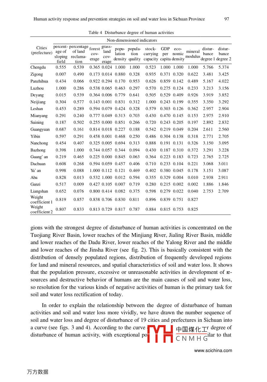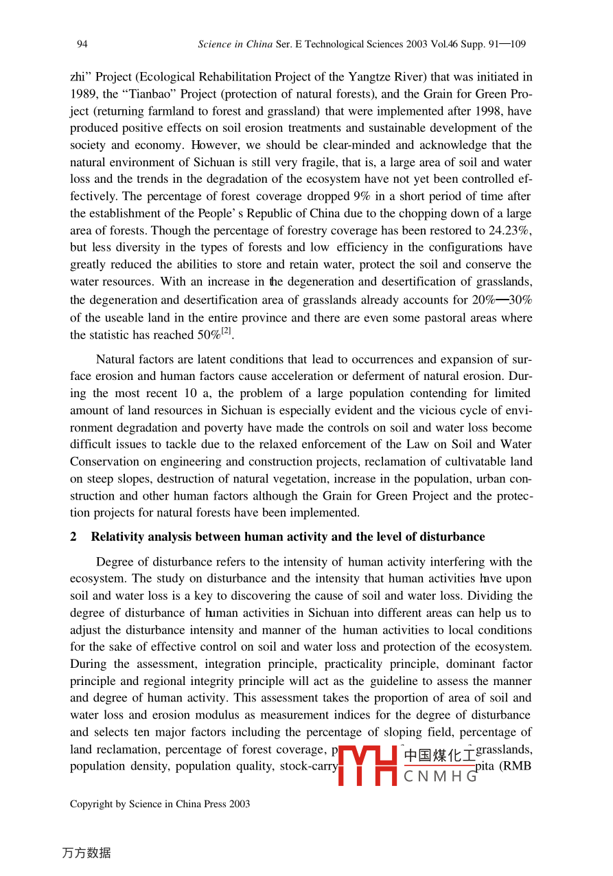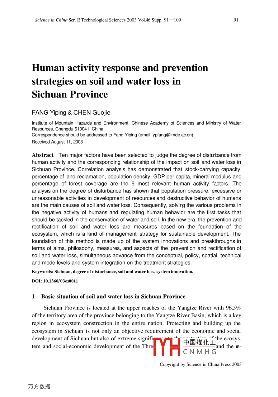 Science in China Ser. E Technological Sciences 2003 Vol.46 Supp.91-10991Human activity response and preventionstrategies on soil and water loss inSichuan ProvinceFANG Yiping & CHEN GuojeInstitute of Mountain Hazards and Environment, Chinese Academy of Sciences and Ministry of WaterResources, Chengdu 610041, ChinaCorrespondence should be addressed to Fang Yiping (email: ypfang@imde.ac.cn)Received August 11, 2003Abstract Ten major factors have been selected to judge the degree of disturbance fromhuman activity and the corresponding relationship of the impact on soil and water loss inSichuan Province. Correlation analysis has demonstrated that stock-carrying apacity,percentage of land reclamation, population density, GDP per capita, mineral modulus andpercentage of forest coverage are the 6 most relevant human activity factors. Theanalysis on the degree of disturbance has shown that population pressure, excessive orunreasonable activities in development of resources and destructive behavior of humansare the main causes of soil and water loss. Consequently, solving the various problems inthe negative activity of humans and regulating human behavior are the first tasks thatshould be tackled in the conservation of water and soil. In the new era, the prevention andrectification of soil and water loss are measures based on the foundation of theecosystem, which is a kind of management strategy for sustainable development. Thefoundation of this method is made up of the system innovations and breakthroughs interms of aims, philosophy, measures, and aspects of the prevention and rectification ofsoil and water loss, simultaneous advance from the conceptual, policy, spatial, technicaland mode levels and system integration on the treatment strategies.Keywords: Sichuan, degree of disturbance, soil and water loss, system innovation.DOI: 10.1360/03ez00111 Basic situation of soil and water loss in Sichuan ProvinceSichuan Province is located at the upper reaches of the Yangtze River with 96.5%of the territory area of the province belonging to the Y angtze River Basin, which is a keyregion in ecosystem construction in the entire nation. Protecting and building up theecosystem in Sichuan is not only an objective requirement of the economic and socialdevelopment of Sichuan but also of extreme signifi中國煤化土he ecosystem and social-economic development of the Threand the 1e-TYHCNMH GCopyright by Science in China Press 200392Science in China Ser. E Technological Sciences 2003 Vol.46 Supp. 91-109gions of the middle and lower reaches of the Yangtze River.According to the measurements and calculations from the data of the second soilsurvey, the area of soil and water loss in the entire province has reached 199800 km*,which accounts for 40.87% of the territory area. The total annual amount of soil erosionis 950 million tons and the average soil loss is 4754 t/km2 1.21 (see table1).Table 1 Situation of soil erosion in Sichuan"CitiesArea ofArea of soil Percentage of soilMean erosionAmount of soil(prefecture) territory/km2 erosion/10* hm2 erosion area (%) modulus/t 1 km2 ! al erosion/10*tChengdu12105.0234.7128.6769432410Zigong4373.0127.4862.8462481717Panzhihua7437.5436.5349.111710625Luzhou12231.4080.8766.124937Deyang5860.4520.6935.3064291330Neijiang"13347.2291.2968.4084427707Leshan'19754.03113.8657.6459526777Mianyang20263.69101.6650.1765336642Suining5323.2536.6768.8998313605Guangyuan16313.8797.1259.5341474027Yibin13297.9281.9661.6354204442Nanchong12479.3180.3464.3873175879Bazhong2500.9877.2562.8058084487Guang' an6339.5640.812986Dachuan16579.10104.126047Ya' ar15097.0258. 1438.5142122449Aba83279.14258.1731.0025476575Ganzi152307.26440.0228.89308113557Liangshan60193.99232.3538.601912a) Ziyang City included in Neijiang. b) Meishan City included in Leshan.To different types of erosion, surface erosion accounts for a large amount and ex-tensive area in water erosion and usually occurs on cultivated hillsides, barren mountainsand slopes as well as sparse and young woodlands. This type of erosion is the main typewithin Sichuan. Approximately, 70% of the cultivated land in the region of the upperreaches of the Jialing River is found on cultivated hillsides and the degree of slope isusually between 20° and 30° with a small portion with 40° slopes. Intense soil and waterloss and damage to the soil fertility occur when it rains or there is a thunderstorm, whichhas become a major source of river sediment. The sloping field at the lower reaches ofthe Jinsha River accounts for 50%一90% of the total amount of the cultivated lands, andthe cultivated lands with a degree of slope of more than 25° account for more than 1/3 ofthe total. As for increase in gully erosion, according to a preliminary representative 1e-gional survey, the annual amount of soil loss on sloping field is as high as 9.36X 107thm2, which, when converted to the surface erosion modulus, is as high as 9000- -36000t(km-. a), and the loss along the Jialing Riv中國煤化工especiallyintense. The spatial characteristics of the erosion mi:MYHCNMHGCopyright by Science in China Press 2003Human activity response and prevention strategies on soil and water loss in Sichuan Province)3置]1000 -2000giset]2001-3000]3001-4000]4001-5000]5001- 6000Yangize]6001-7000]7001-80008001-900015500009001- 10000Fig. 1. Spatial distribution of soil erosion modulus in Sichuan.The combined erosion that is created under the combined effects of gravity and hy-dropower is another type of widespread erosion, which is usually manifest in debris flowand landslide. There are over 3000 debris flow ditches at the upper reaches of the JialingRiver with a 13854 km- area of distribution of debris flows and landslides that accountfor approximately 56% of the total area. The debris flow on the two banks of the trunkof the Jinsha River is also extremely concentrated. Not only is there a large amount ofsuspended sediment pouring into the Jinsha River each year, but there is also a largeamount of coarse